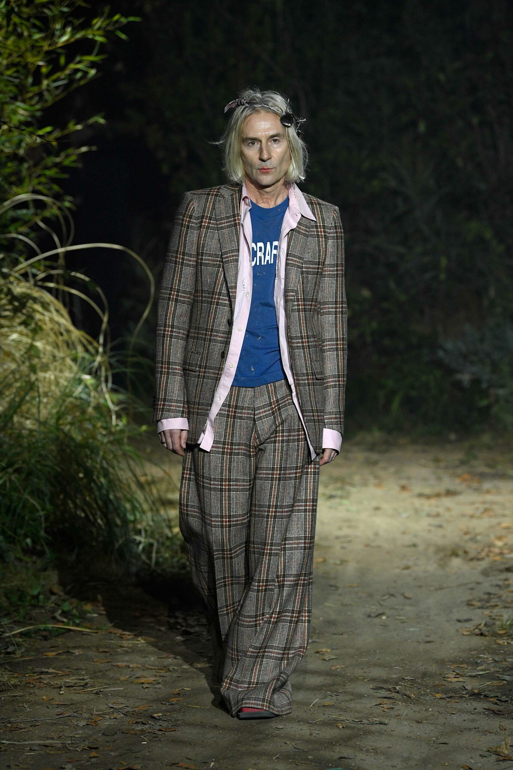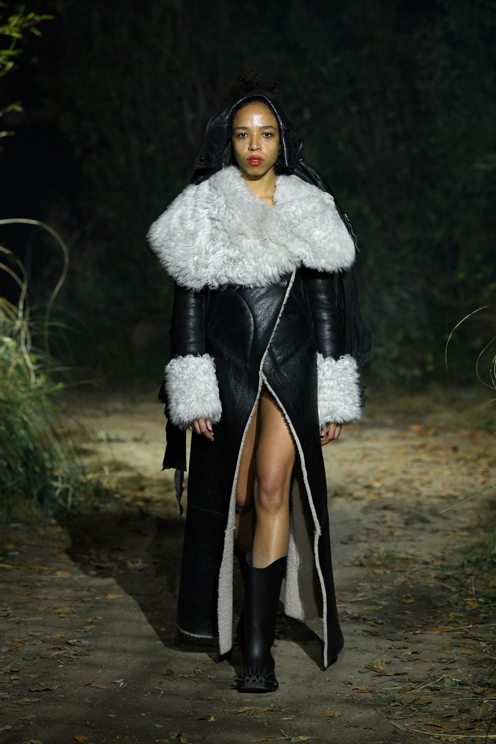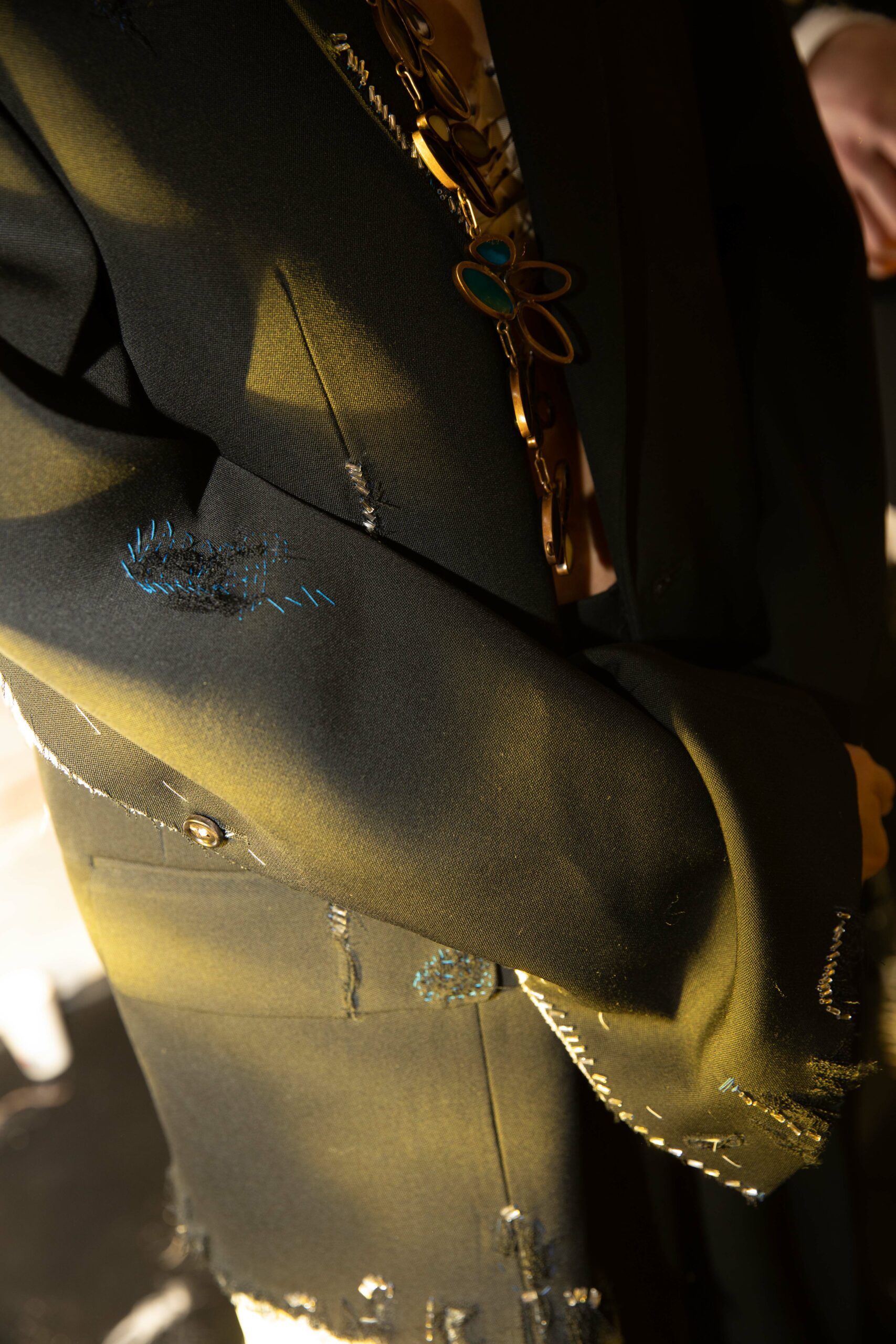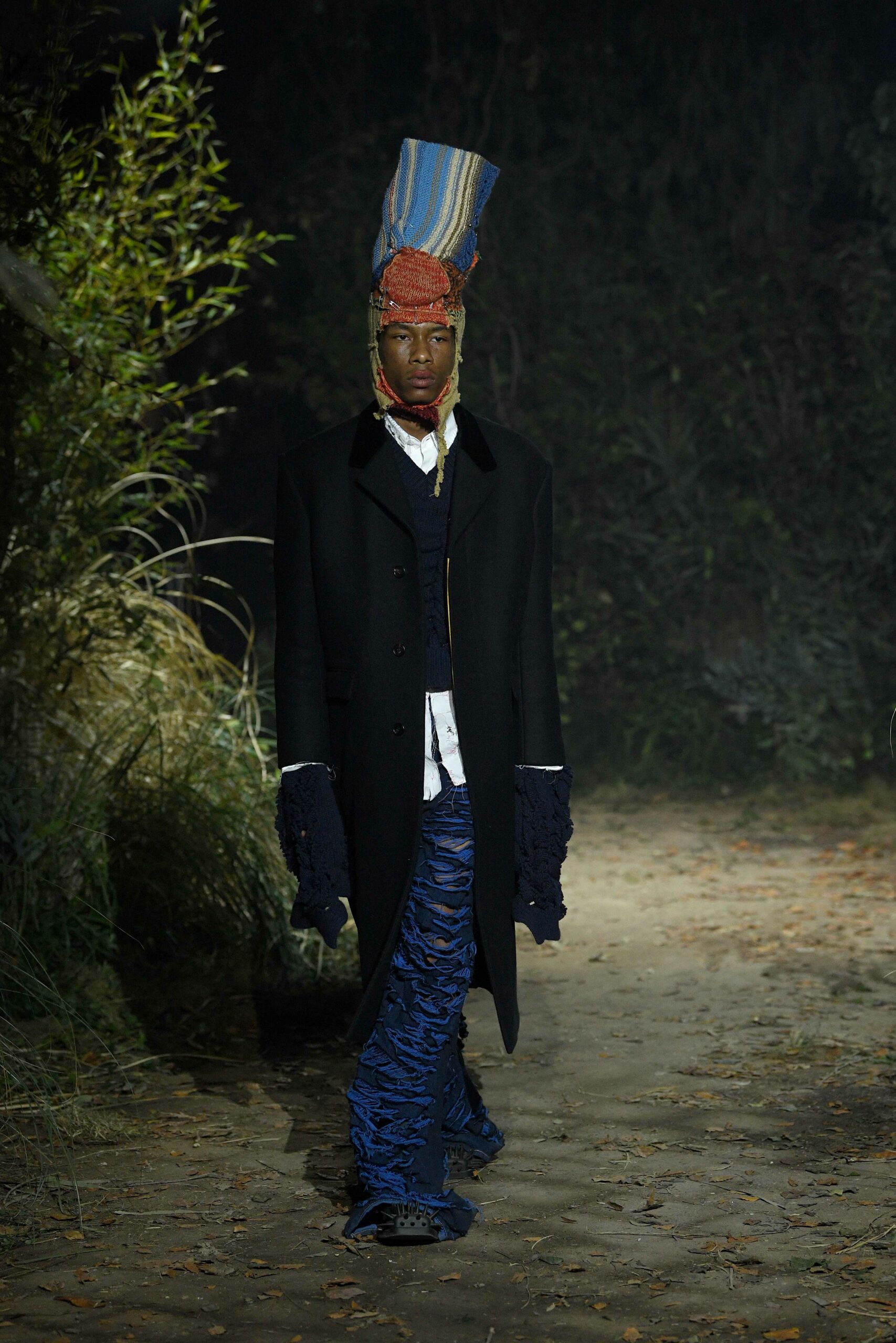Big coats, big crombies, big jackets. Shrunken jackets. Shredded dresses, shredded shirts, shredded trousers. Mended jumpers, outsized jumpers, jumpers with sleeves dangling to the floor. Trousers falling off. Sartorial suits are completely handmade by Attolini, capturing the emotion of tradition in the touch of the hand, defying mechanical reproduction. Like spectrograms, the words of Dan Colen and Lexie Smith bring a secret code within mending. Mending and stitching everywhere, making old things new, keeping them together with a gesture of affection. Spiky pumps, spiky boots, spiky bags.