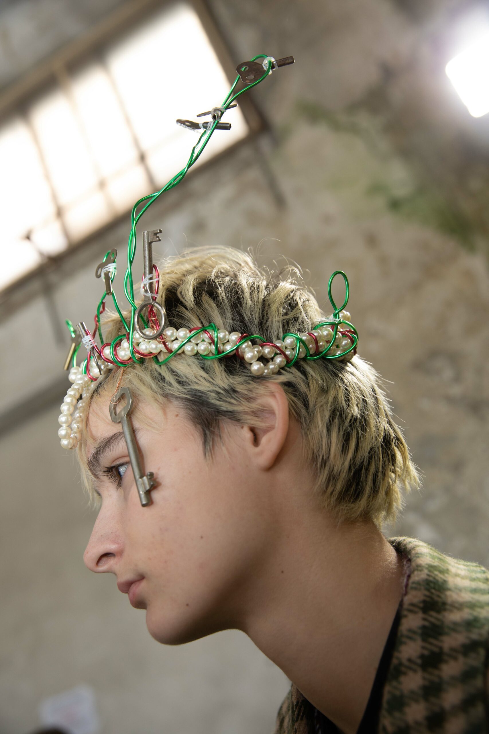 Objects woven into the hair and assembled into jewelry.