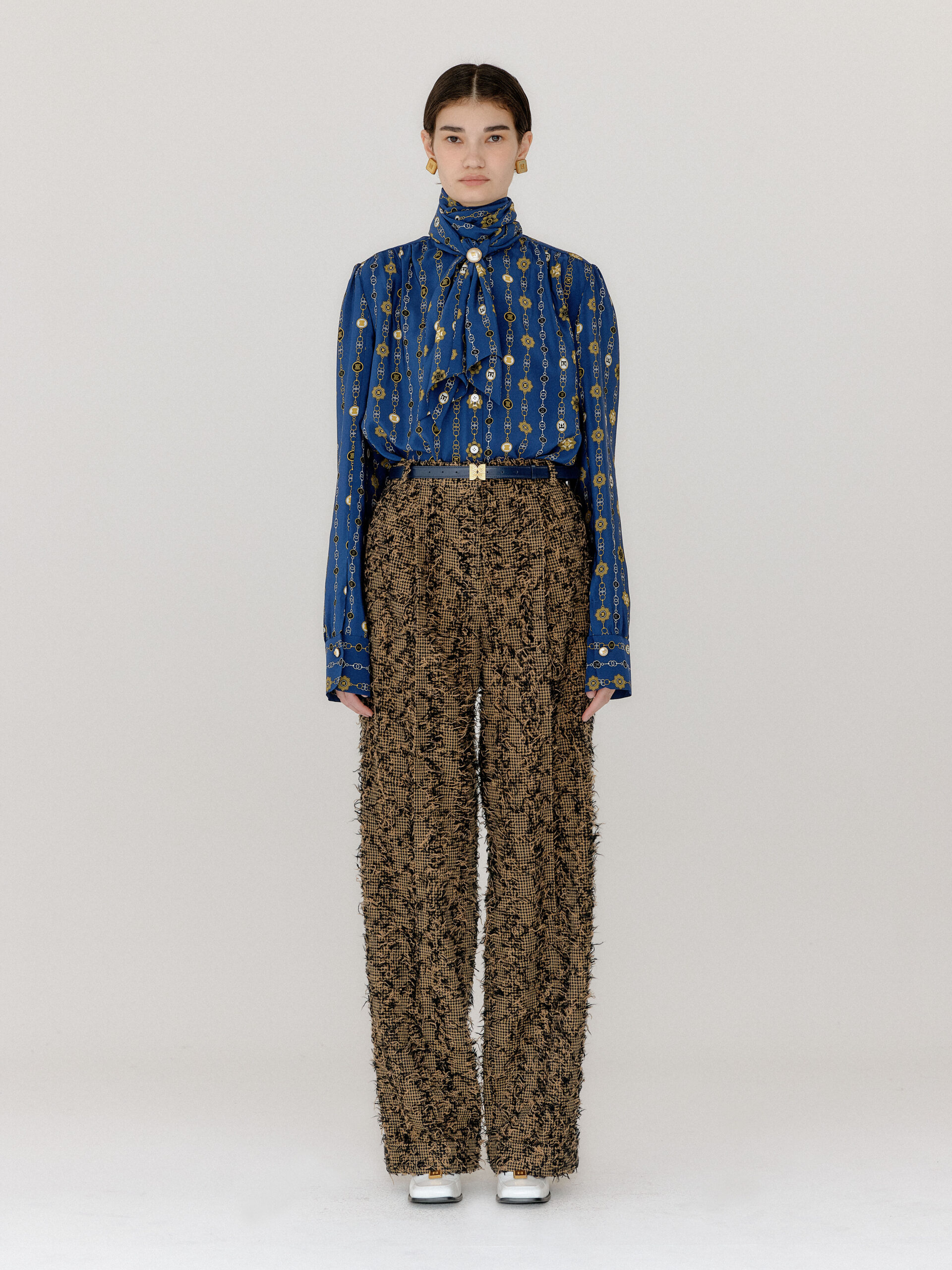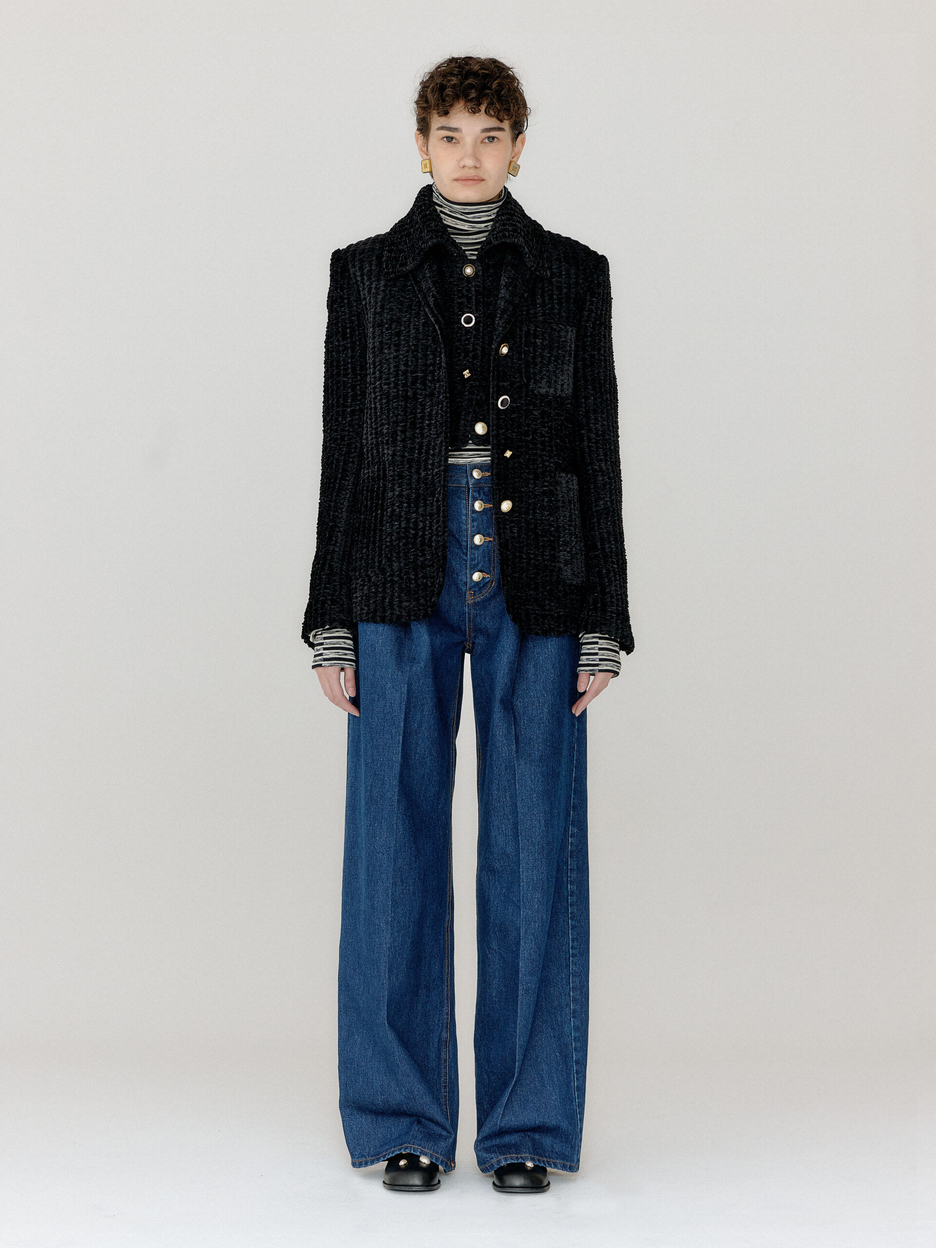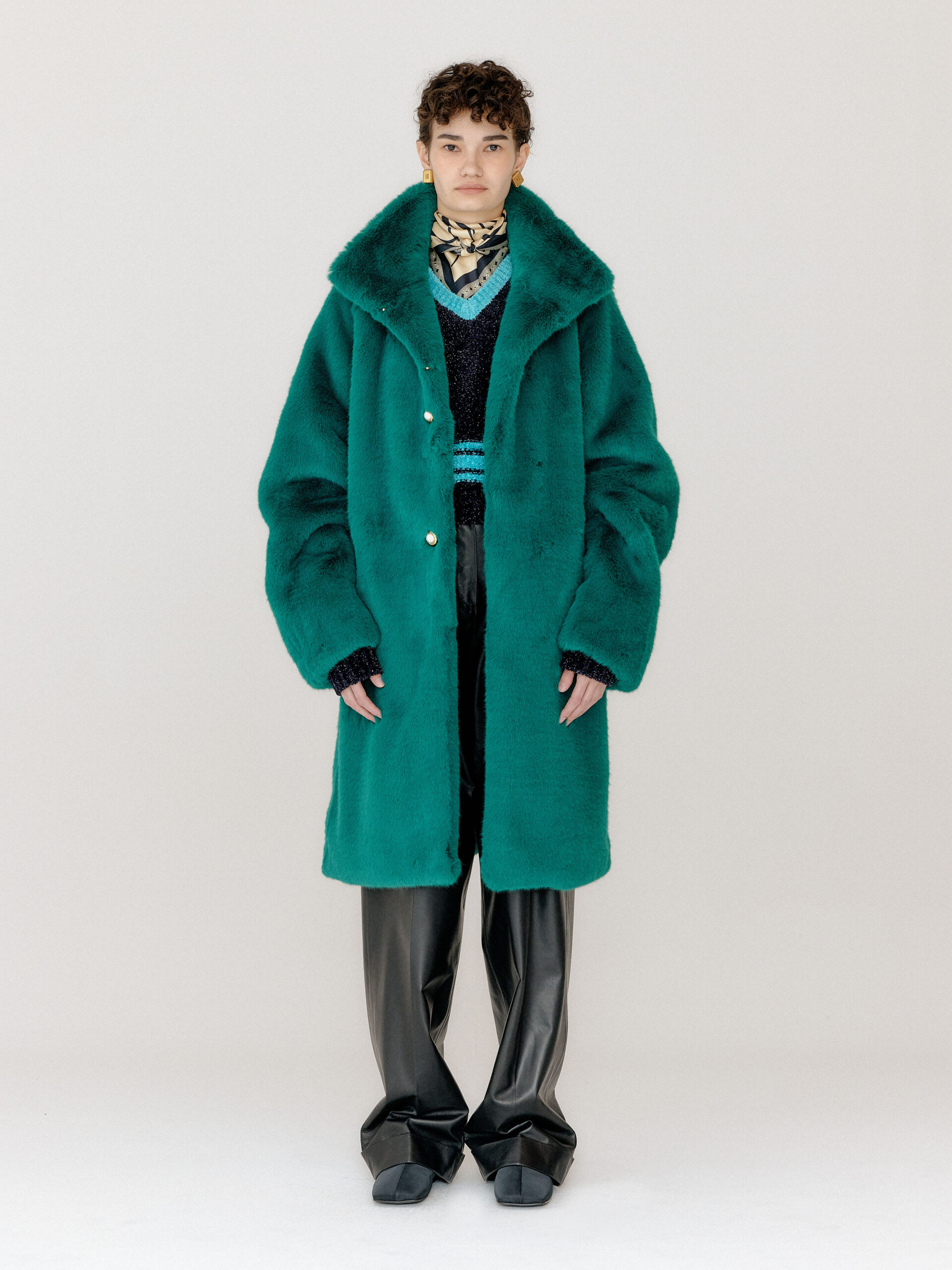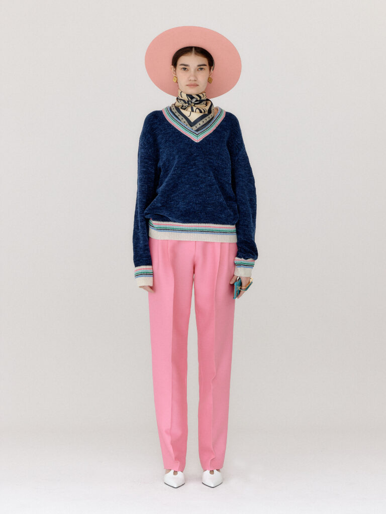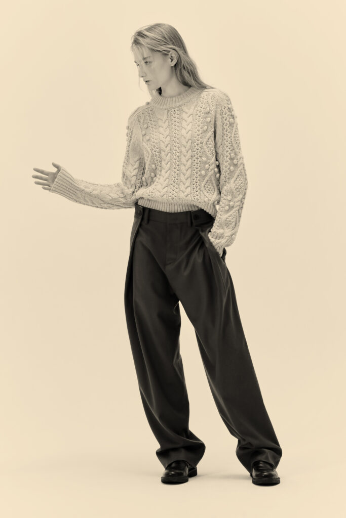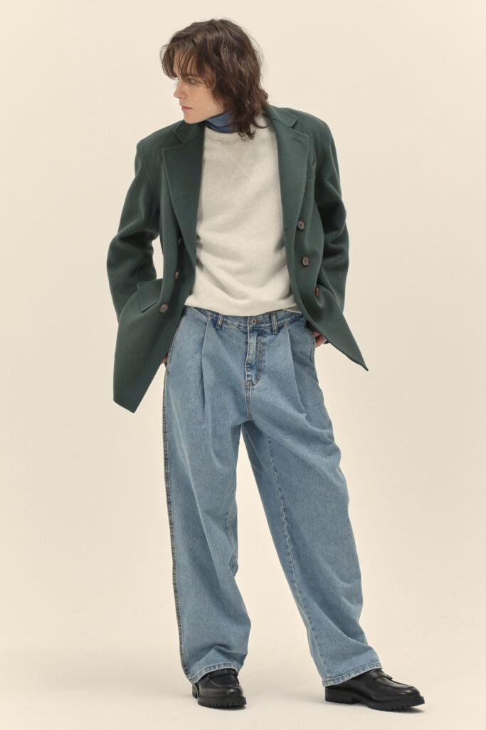 For 2022 Fall and Winter EENK presents V for Vintage, a collection of powerful elegance and majestic glam inspired by the legendary styles from 80’s VOGUE magazine. This collection of statement shapes and colors takes signature EENK style a notch up with even bolder black and white contrasting, chunky, hairy knitwear, denim on denim and heritage jacquard patterns. Over-the-top silhouettes, jewel buttons and illusionary colors meet the power of menswear in three piece set-ups and military outerwear. On top of that, catch a glimmer of disco charm in EENK’s powerhouse.