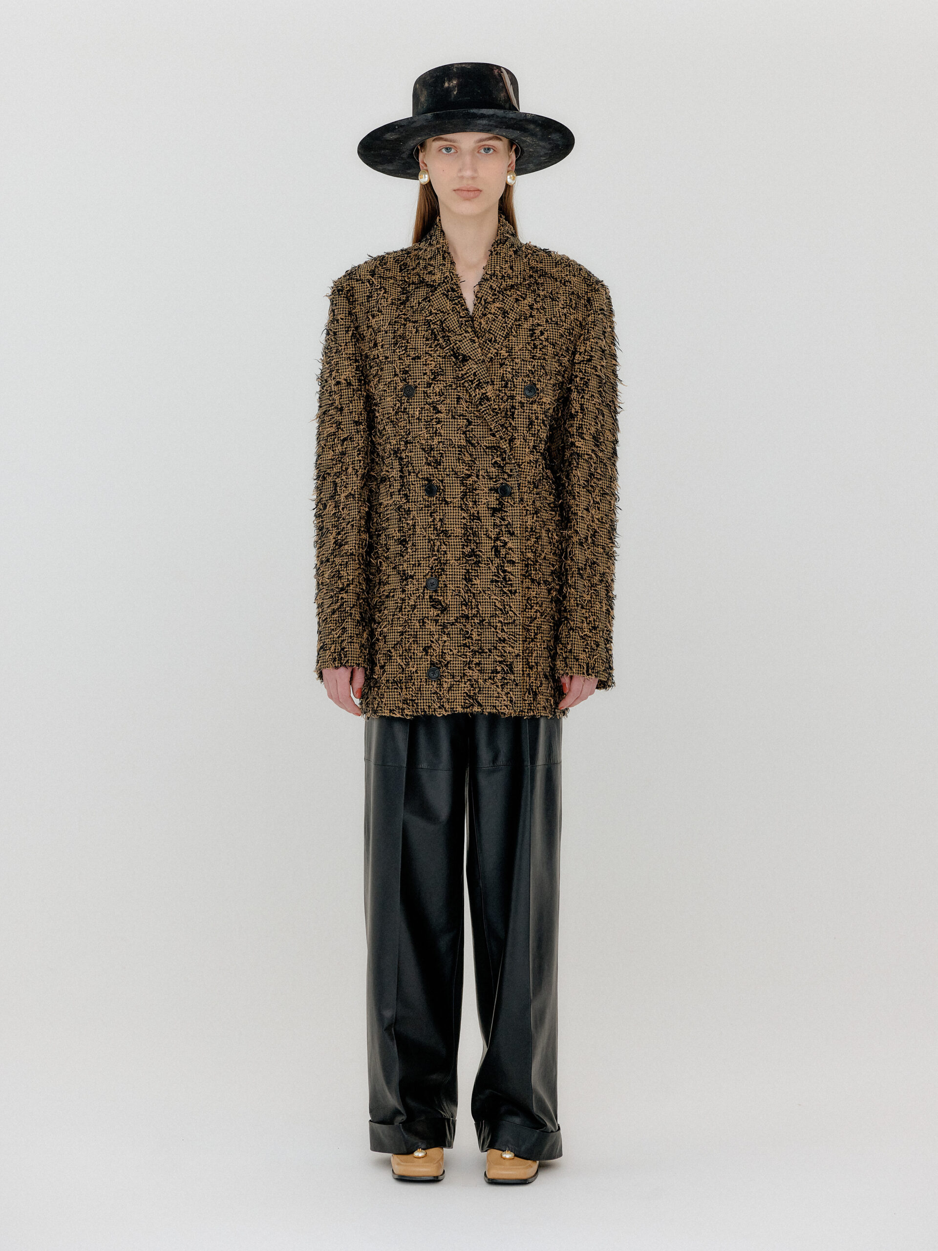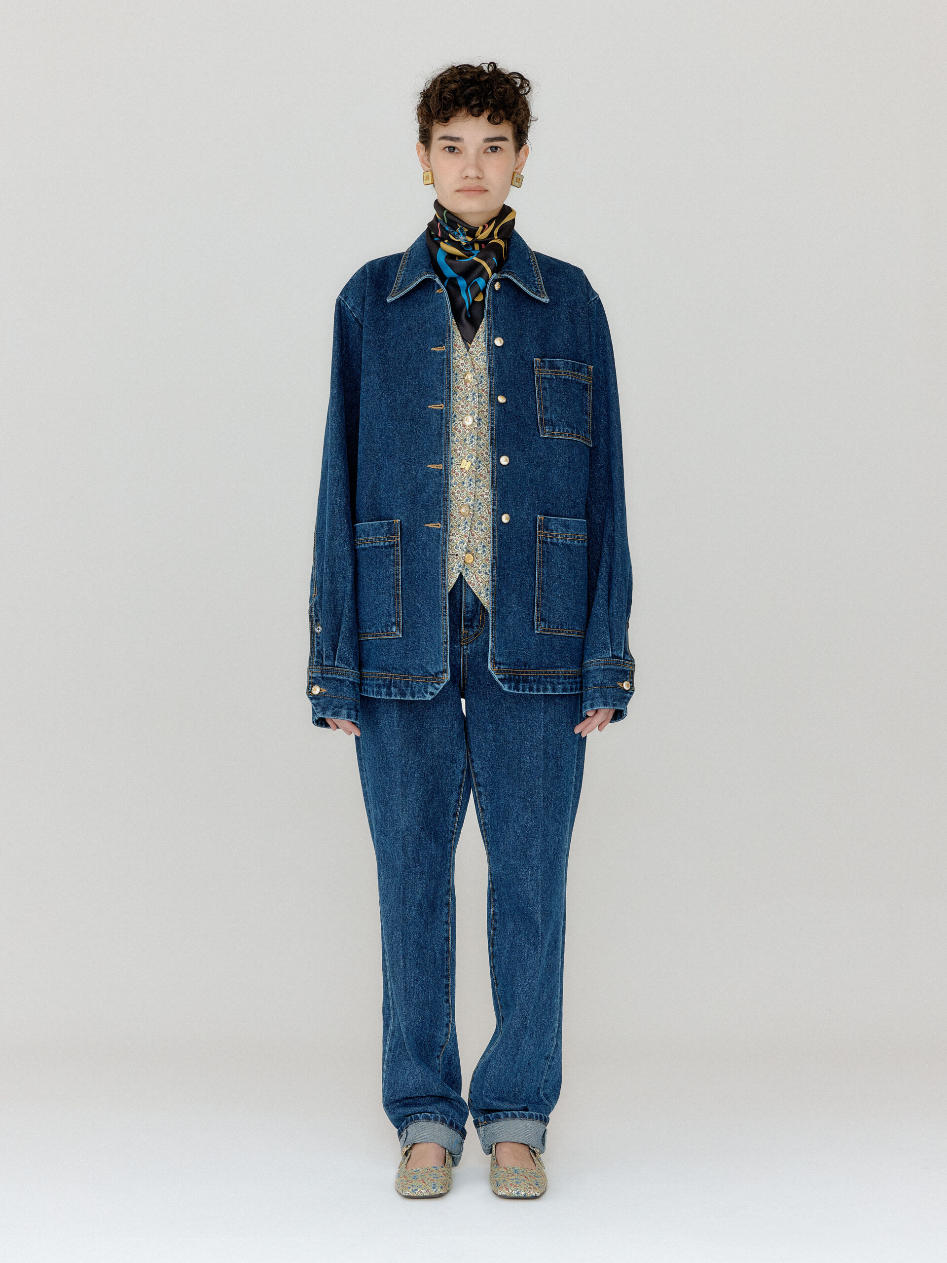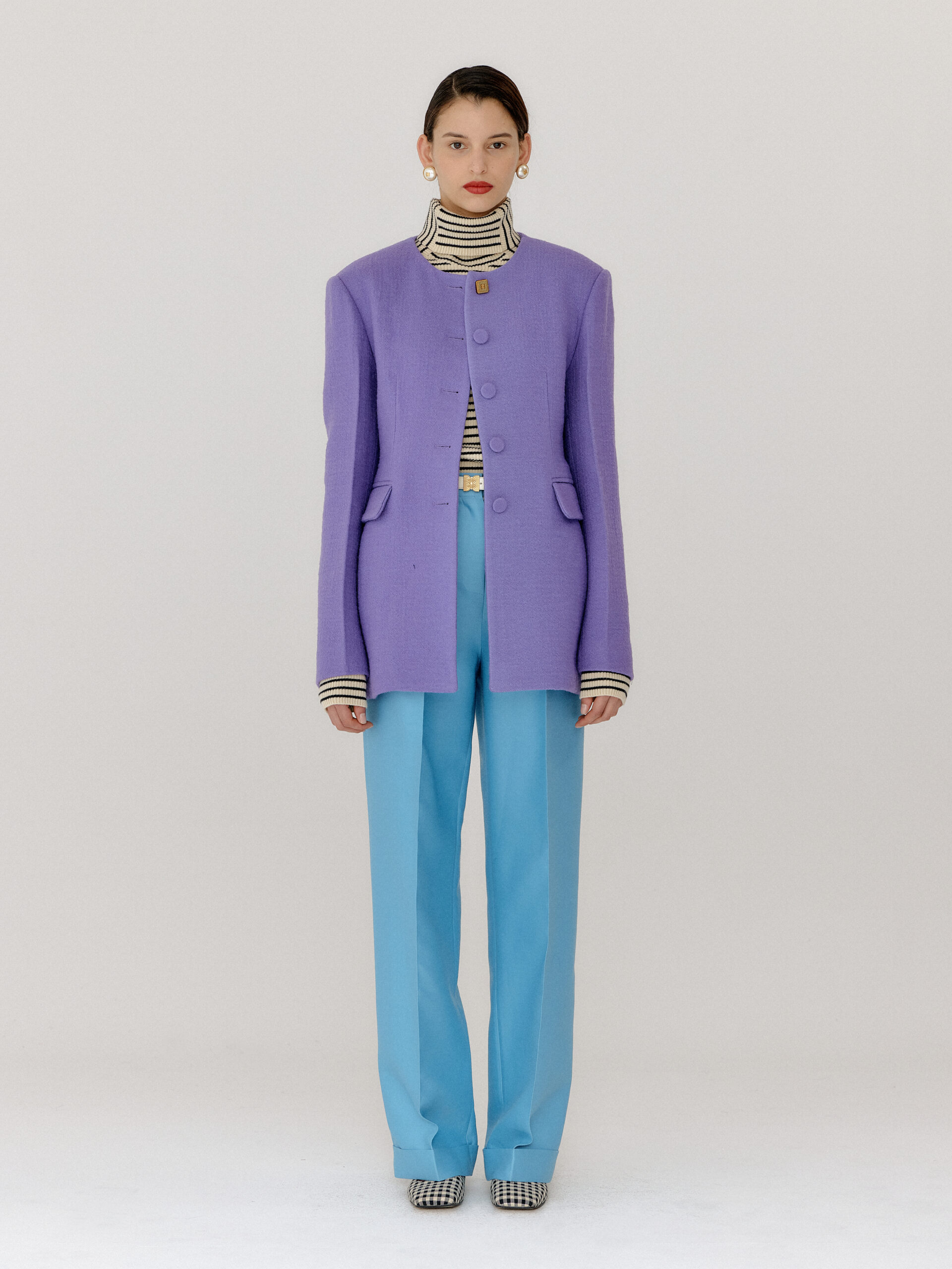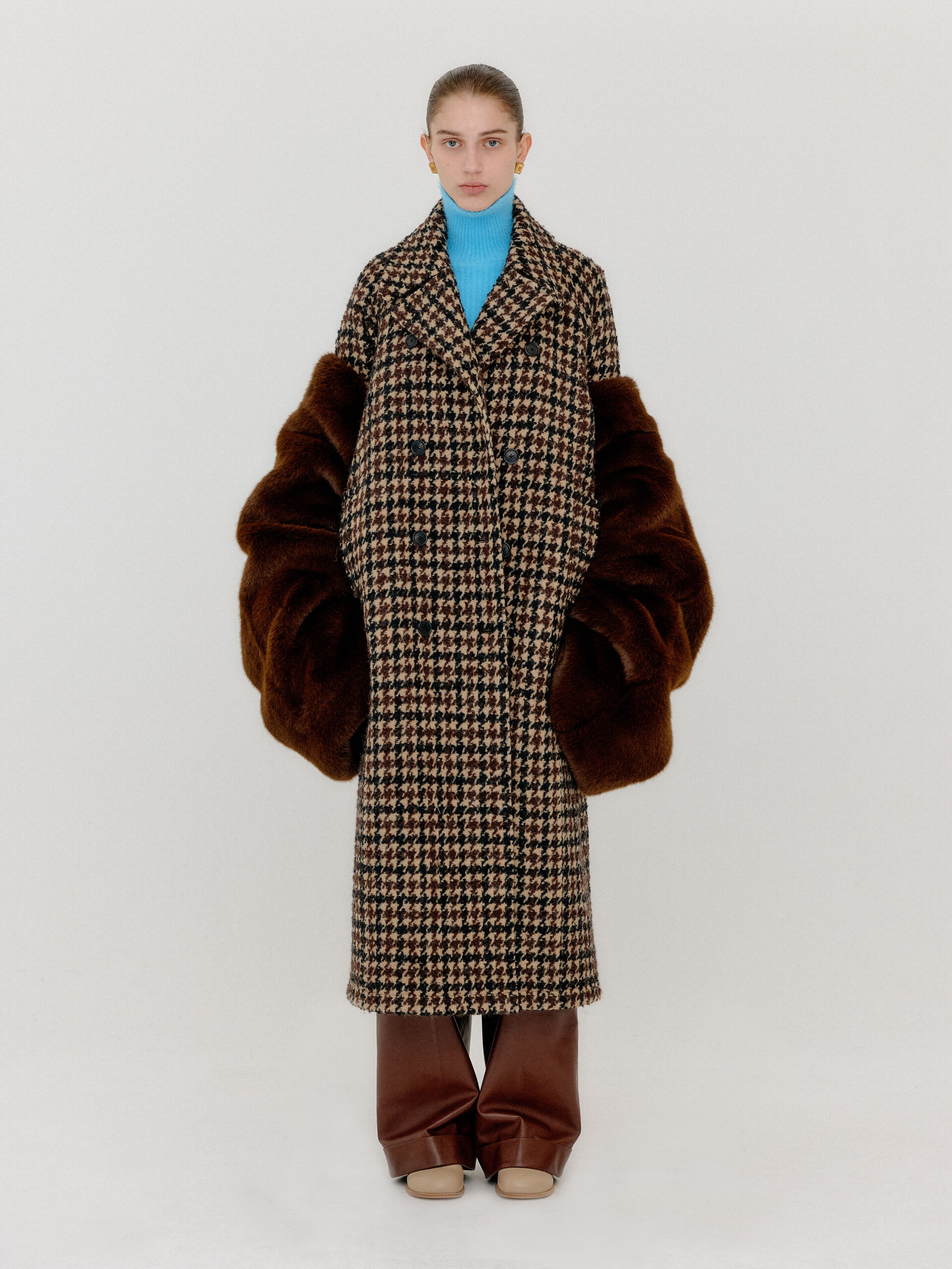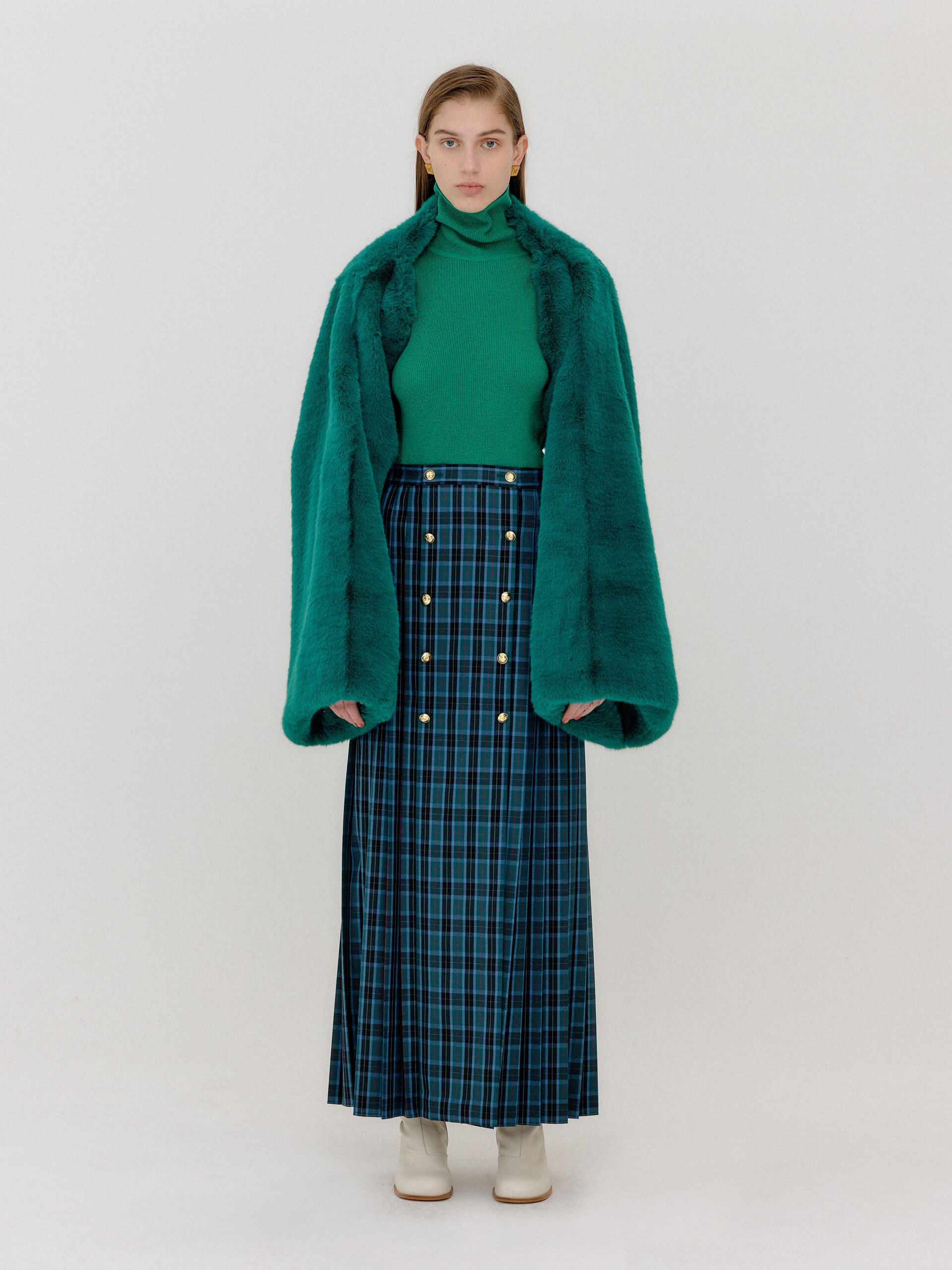 For 2022 Fall and Winter EENK presents V for Vintage, a collection of powerful elegance and majestic glam inspired by the legendary styles from 80’s VOGUE magazine. This collection of statement shapes and colors takes signature EENK style a notch up with even bolder black and white contrasting, chunky, hairy knitwear, denim on denim and heritage jacquard patterns. Over-the-top silhouettes, jewel buttons and illusionary colors meet the power of menswear in three piece set-ups and military outerwear. On top of that, catch a glimmer of disco charm in EENK’s powerhouse.