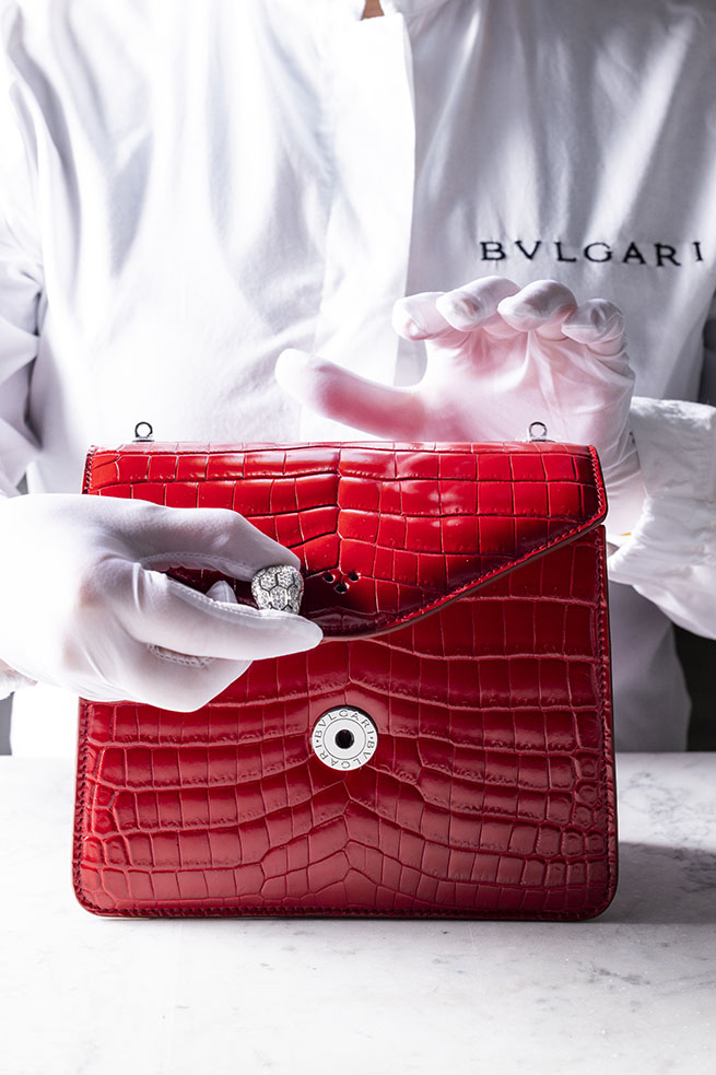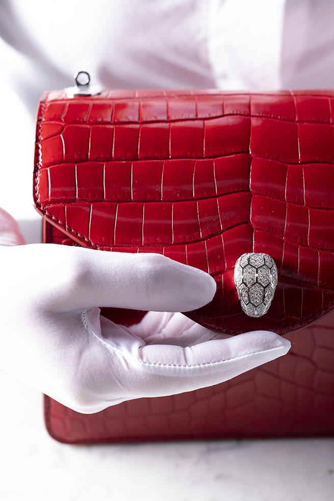 Ces magnifiques gemmes ont été choisies par Bvlgari pour sublimer le regard magnétique du serpent sur ces sacs-bijoux uniques : les iconiques fermoirs à tête de serpent sont sertis de deux yeux respectivement en émeraudes et en rubis taille poire totalisant 2,62 carats et 3,51 carats, encadrés par un éblouissant pavage de diamants qui confère à la pierre son extraordinaire couleur. Témoignage audacieux de la maîtrise sans pareil de Bvlgari dans le domaine de la joaillerie transformable, les précieuses têtes de serpents en or blanc 18 carats peuvent se détacher et être portées en pendentifs ou en broches. Détachées, elles dévoilent de plus petites fermetures entièrement en diamants.