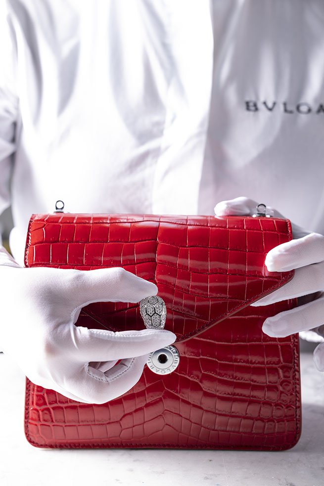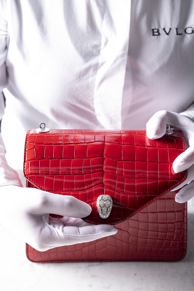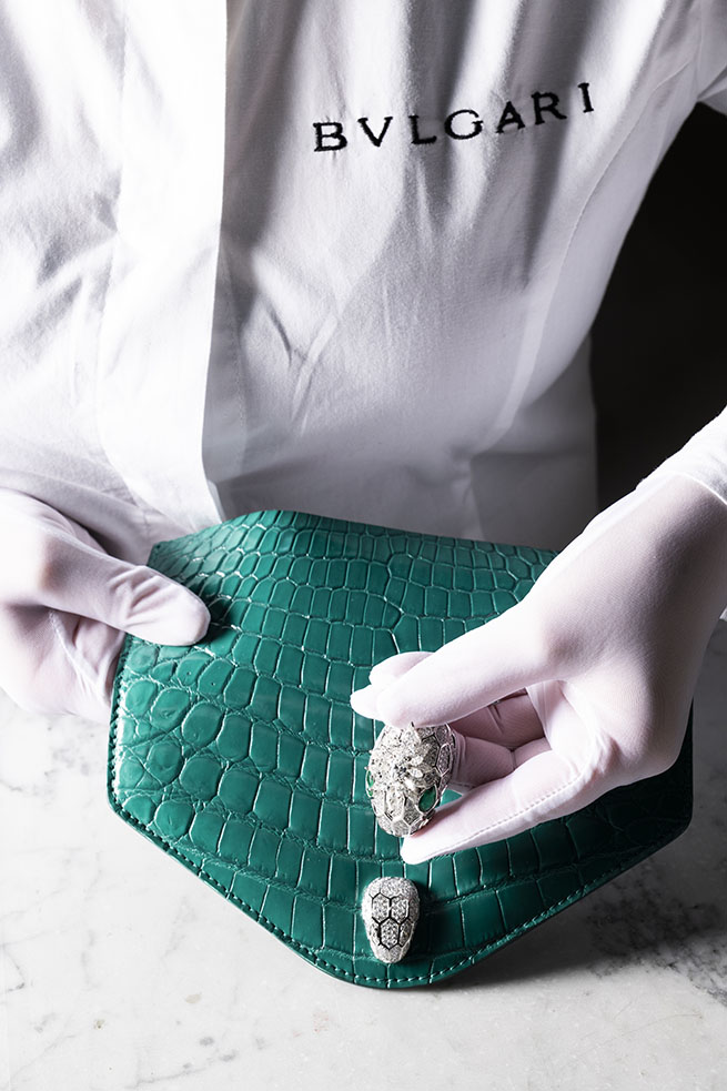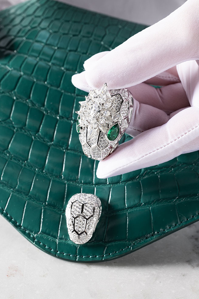 Façonnés telles des pièces de Haute Joaillerie dans leurs moindres détails, de l’approvisionnement à la fabrication jusqu’à leur design. Le sac Magnifica Serpenti Forever sublime l’émeraude, symbole de sagesse et de vérité qui rappelle les nuances verdoyantes des arbres, les lacs fascinants et les jardins enchantés. Un cadeau de la nature qui nous inspire poésie, plénitude et printemps éternel. Si chaque émeraude a un caractère, une âme et une histoire extraordinaire à raconter, Bvlgari sélectionne les plus exceptionnelles, soit moins de 1 % d’entre elles. On raconte que ces émeraudes possèdent la « flamme verte » de la pureté.