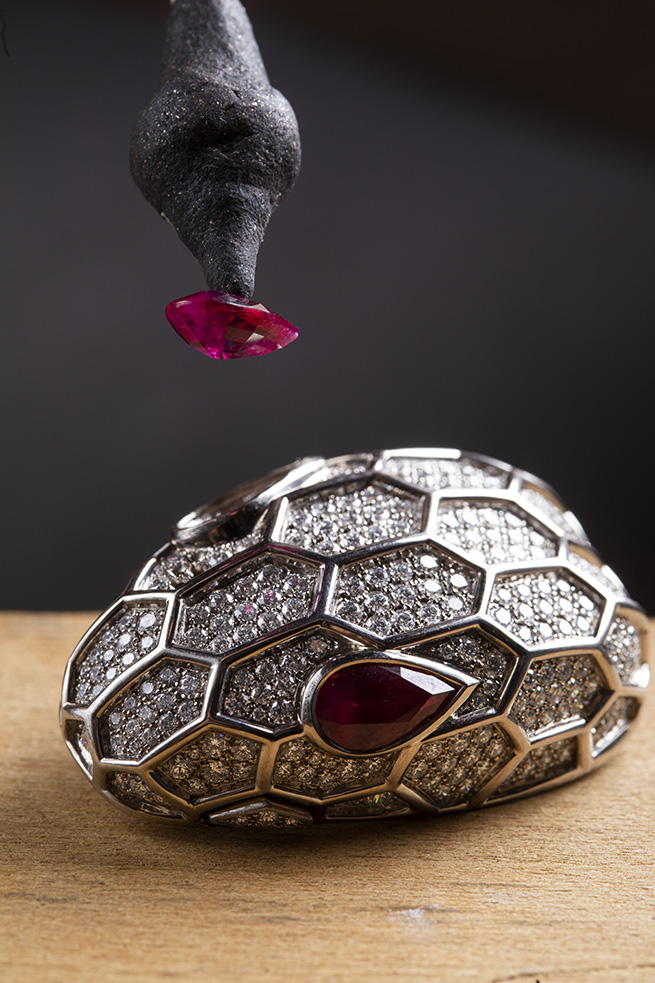 Le sac Magnifica Serpenti Forever célèbre également le majestueux rubis, roi des gemmes. Avec ses nuances rouge royal, symbole éternel de désir et de passion, ce cadeau unique de la nature se veut être le gardien d’une flamme créative et de rêves extatiques. Cœur battant des bijoux colorés de Bvlgari, les rubis sont le témoin de récits intemporels d’un amour ardent et d’une énergie passionnée. Une fois de plus, Bvlgari ne sélectionne que les plus exceptionnels Rubis.
