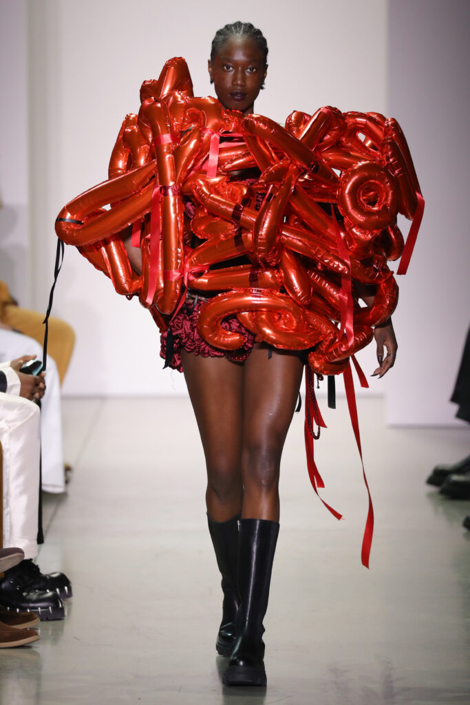 This runway collection, Mohammed’s second officially on the CFDA New York Fashion Week calendar, features 16 looks as a response to the jewelry’s spikes and thorns in turn with rips, ties and drapes. The hand-sewn garments balance the jewelry in melodic chaos, representing a battle; external and internal. Look 11 “Even My White Flags Got Spikes” consists of a spiked white mohair dress, lending material dimension to the tensions between our soft and aggressive impulses. Look 1 “Between Two Americas” is worn by Theresa Hayes, is a dress made from two American flags that makes a statement about the political positions of Black people in the country from its inception. Look 12 “Everlast” featured a halter top constructed from vintage boxing gloves shaped into a bra and paired with a colorblocked rainbow skirt stitched from vintage Everlast t-shirts and screenprinted with Mohammed’s own drawing of Vietnam war abstentionist, Muhammad Ali. Three standout looks (Looks 6, 15 and 16) took a sculptural form, consisting of spike shaped balloons in metallic hues, a metaphor for one’s external armor. A crowd favorite, Look 8 is a pink denim set of jeans and jacket, riveted with original KHIRY spike network hardware and draped in tonal rose quartz beads, and finished with an original drawing of an Afrofuturist femme fighter going back in time to slay a Confederate soldier.