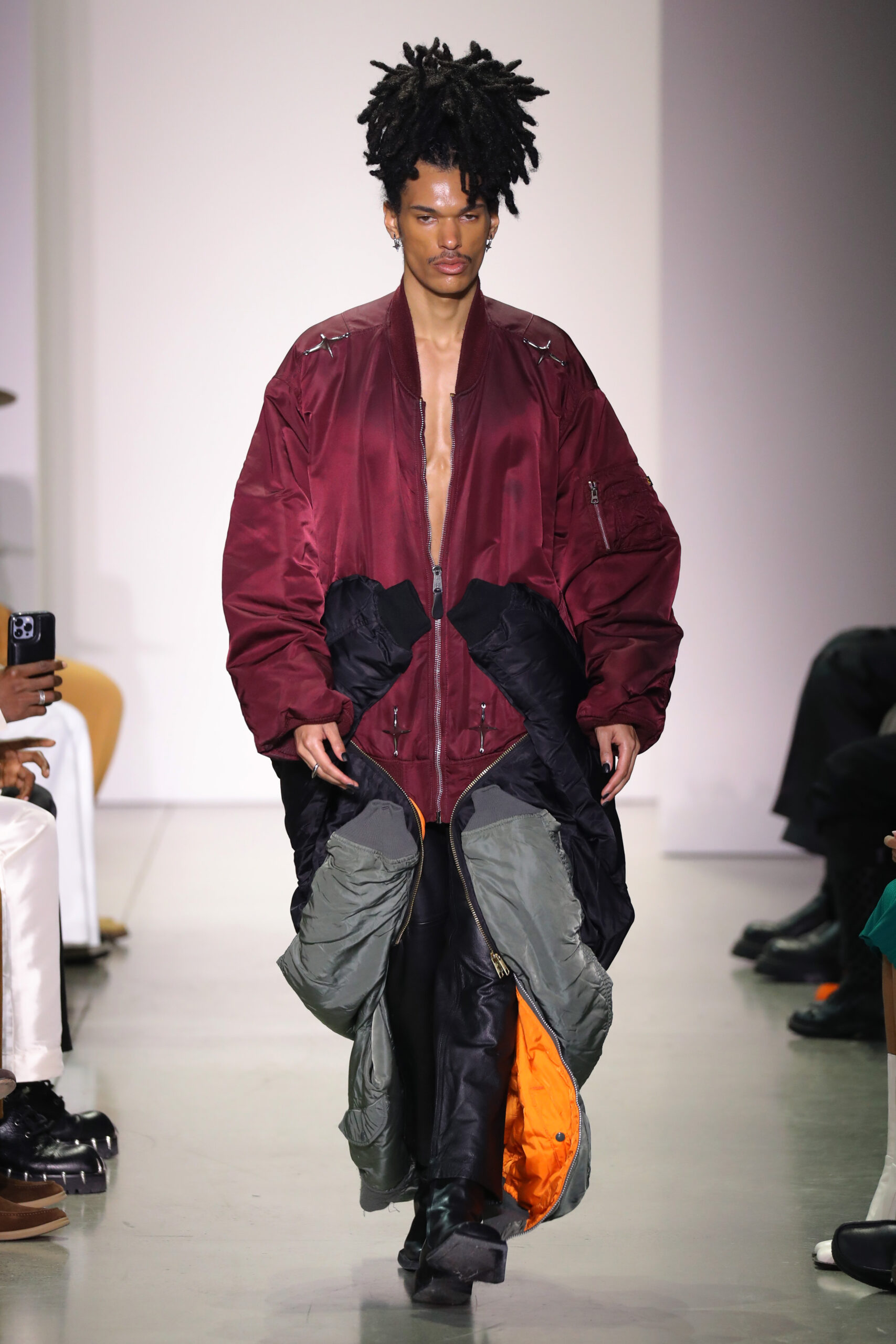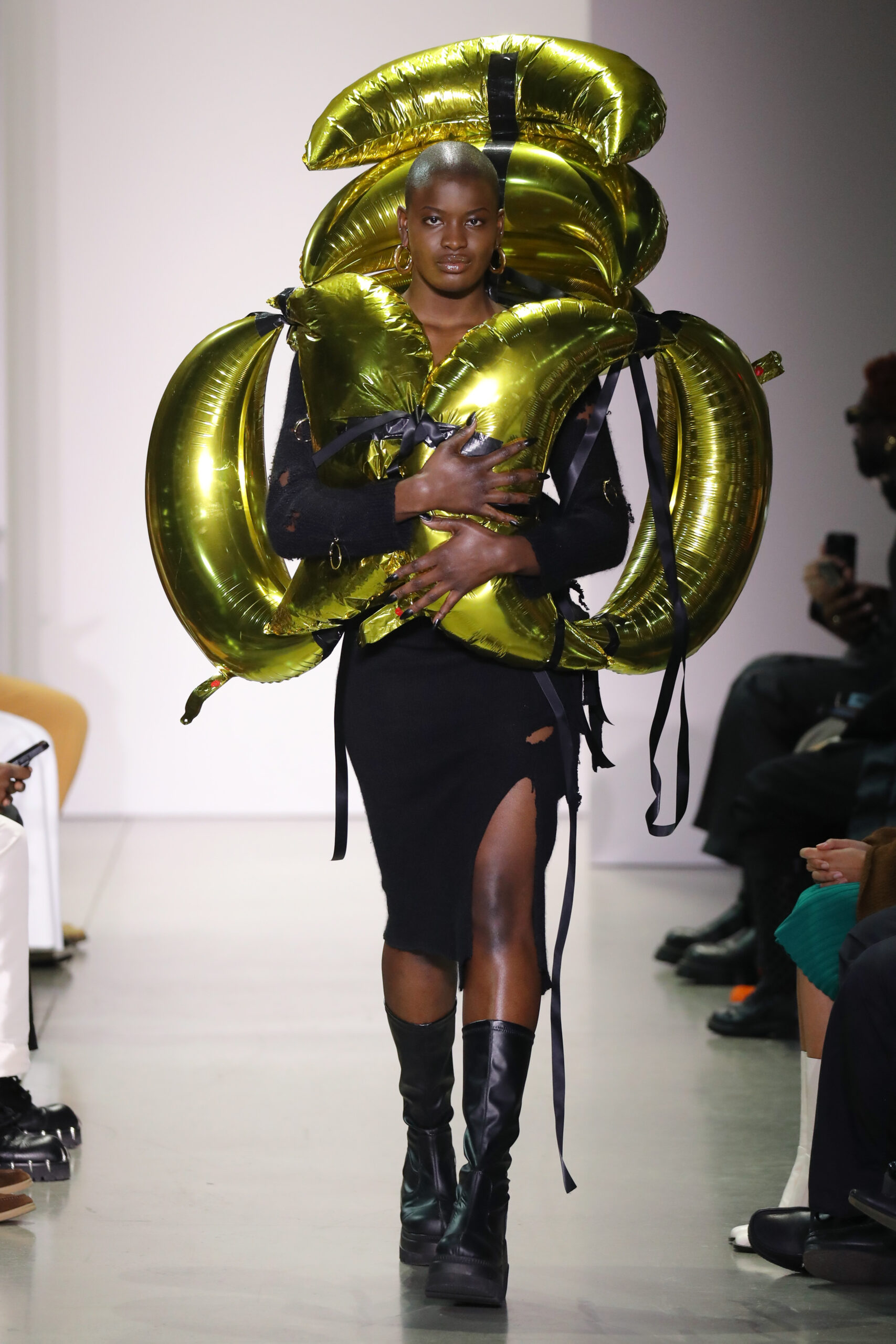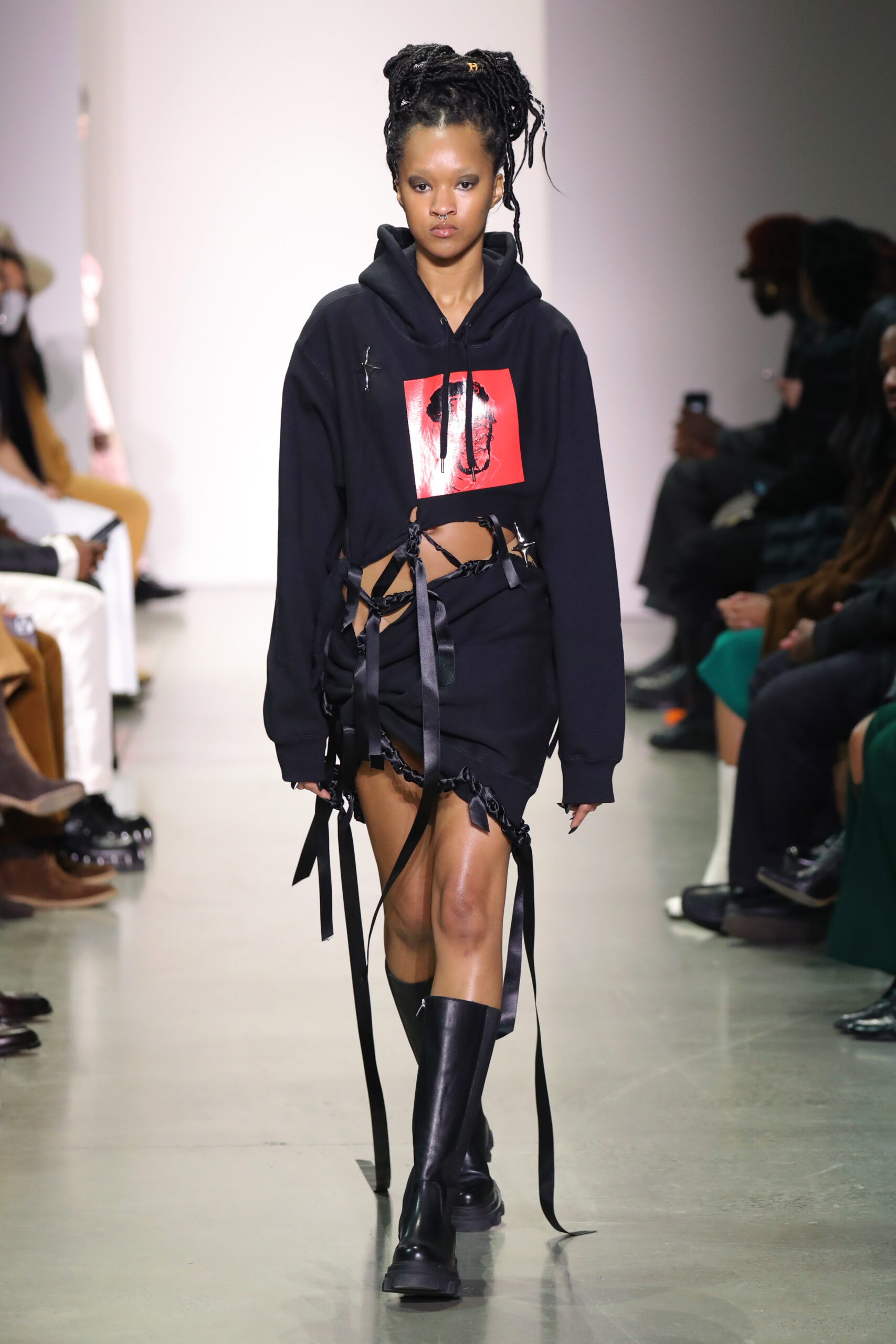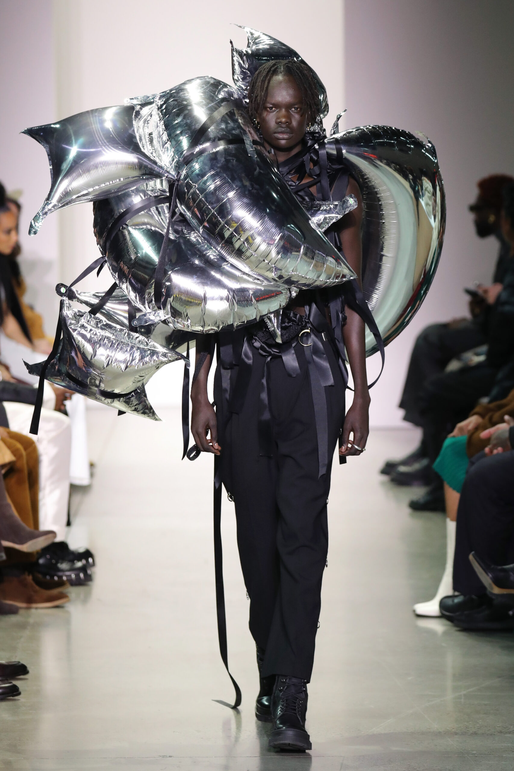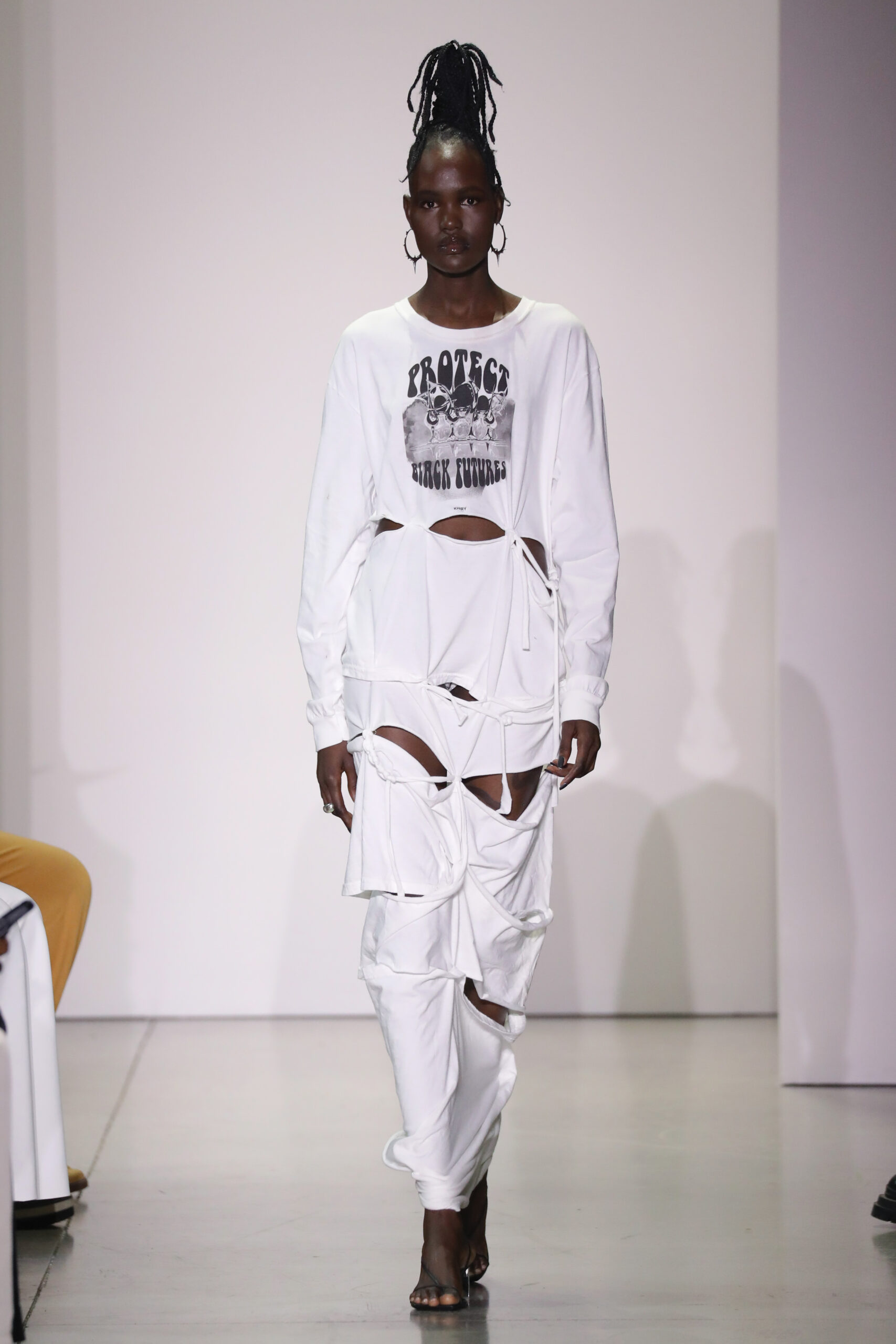 This runway collection, Mohammed’s second officially on the CFDA New York Fashion Week calendar, features 16 looks as a response to the jewelry’s spikes and thorns in turn with rips, ties and drapes. The hand-sewn garments balance the jewelry in melodic chaos, representing a battle; external and internal. Look 11 “Even My White Flags Got Spikes” consists of a spiked white mohair dress, lending material dimension to the tensions between our soft and aggressive impulses. Look 1 “Between Two Americas” is worn by Theresa Hayes, is a dress made from two American flags that makes a statement about the political positions of Black people in the country from its inception. Look 12 “Everlast” featured a halter top constructed from vintage boxing gloves shaped into a bra and paired with a colorblocked rainbow skirt stitched from vintage Everlast t-shirts and screenprinted with Mohammed’s own drawing of Vietnam war abstentionist, Muhammad Ali. Three standout looks (Looks 6, 15 and 16) took a sculptural form, consisting of spike shaped balloons in metallic hues, a metaphor for one’s external armor. A crowd favorite, Look 8 is a pink denim set of jeans and jacket, riveted with original KHIRY spike network hardware and draped in tonal rose quartz beads, and finished with an original drawing of an Afrofuturist femme fighter going back in time to slay a Confederate soldier.