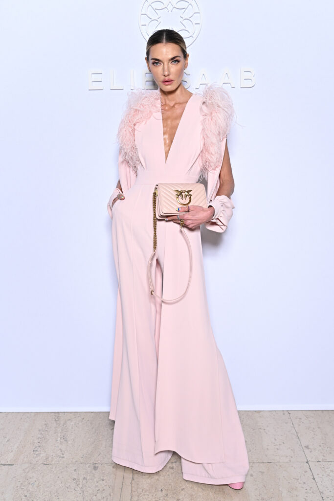 Alina Baikova portait une combinaison rose à plumes de la collection ELIE SAAB Prêt-A-Porter Automne/Hiver 2021-2022.