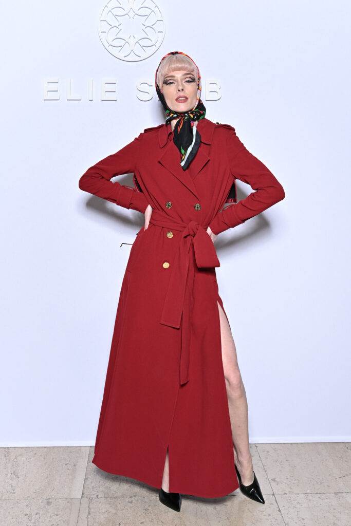 Coco Rocha portait un trench rouge avec un foulard imprimé de la collection ELIE SAAB Prêt-A-Porter Pre Fall 2022.