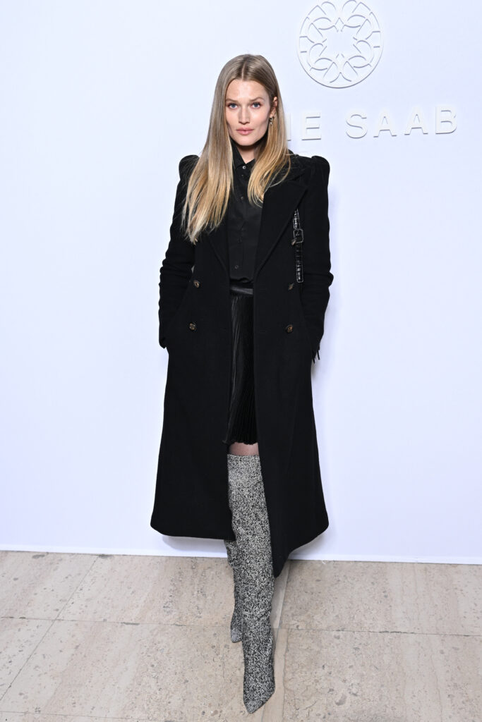 Toni Garrn portait un long manteau noir avec une jupe plissée en satin noir et une chemise en mousseline des collections ELIE SAAB Prêt-A-Porter.