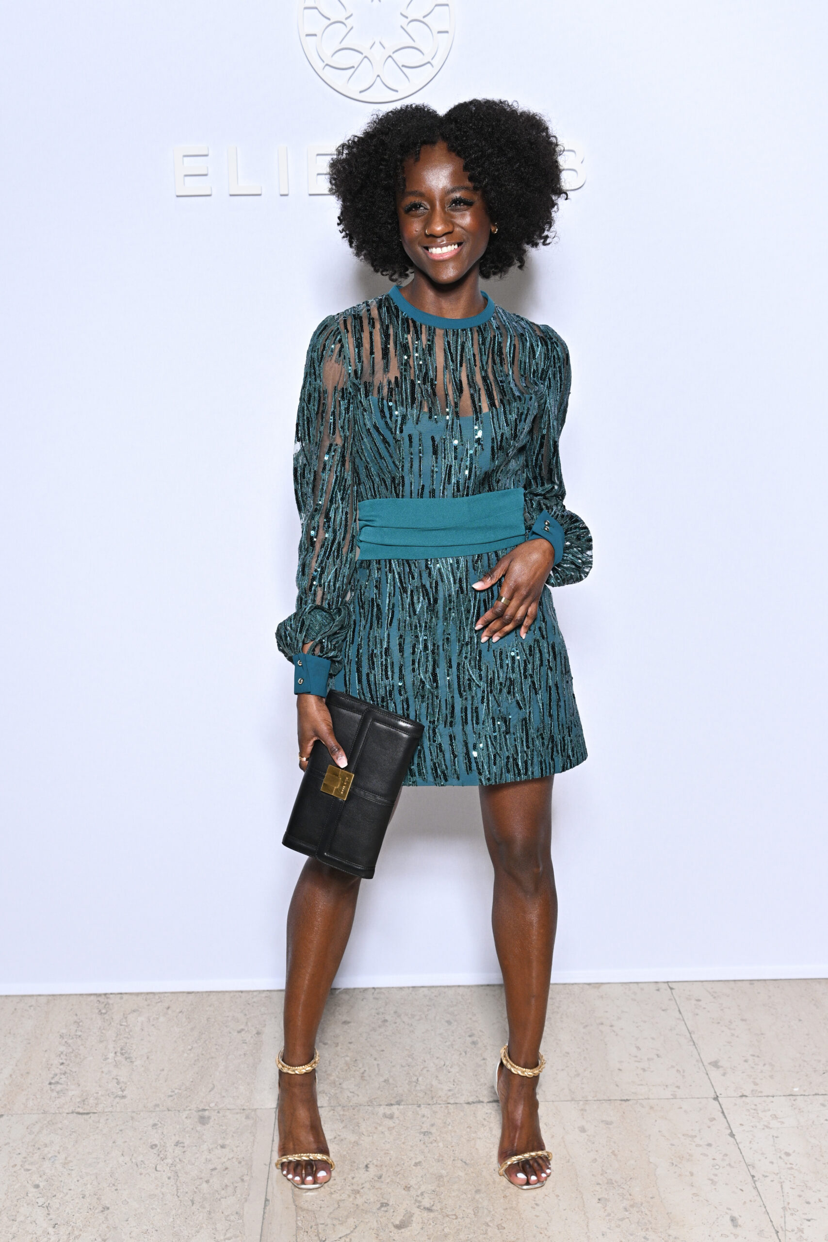 Assa Sylla portait une robe verte courte et brodée de la collection ELIE SAAB Prêt-A-Porter Pre Fall 2022