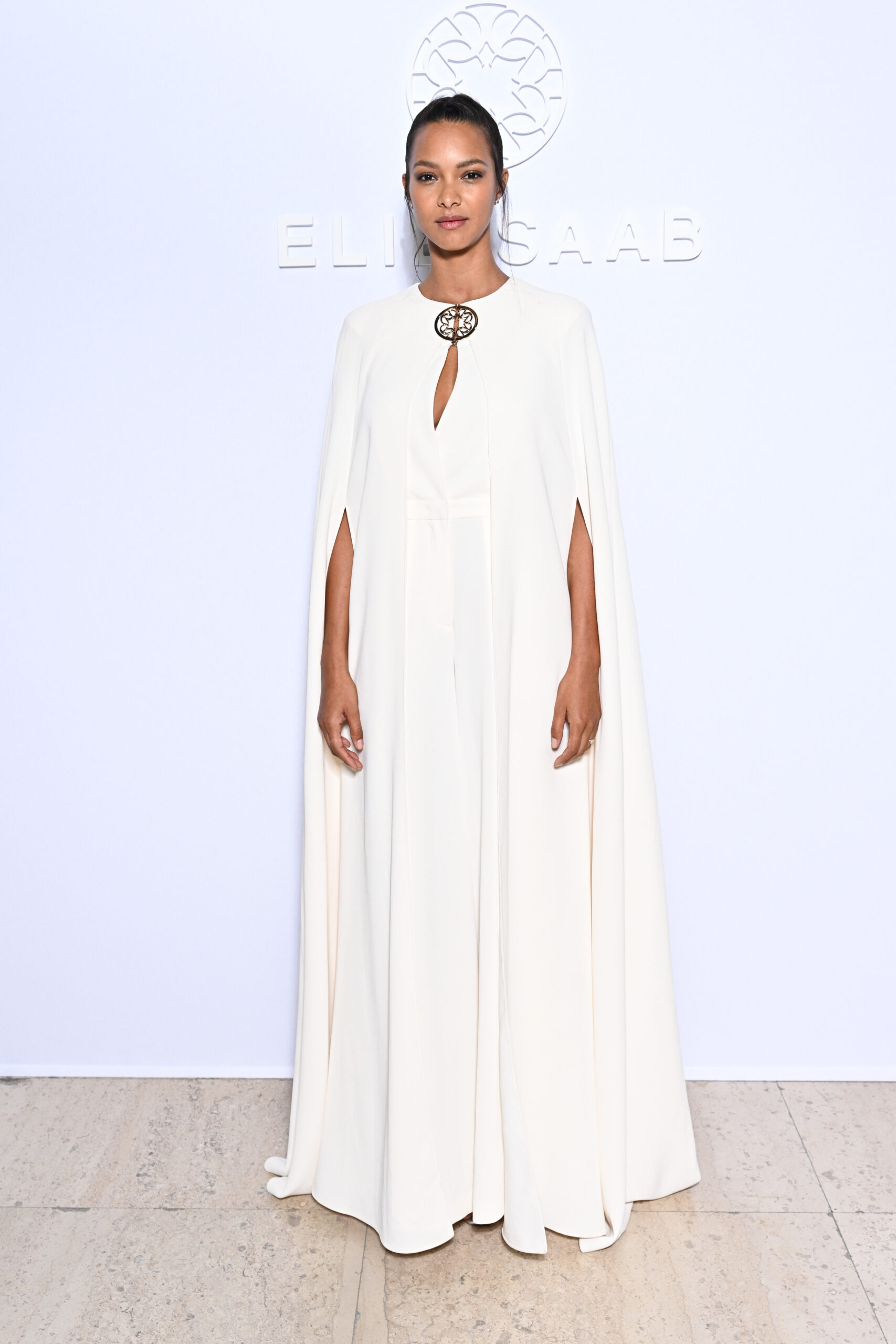 Lais Ribeiro portait une combinaison blanche de la collection ELIE SAAB Prêt-A-Porter Pre Fall 2021.