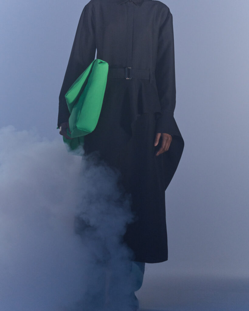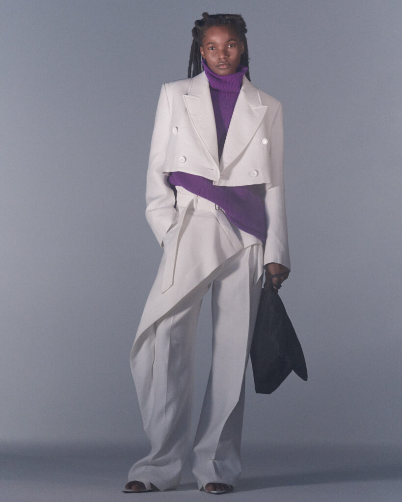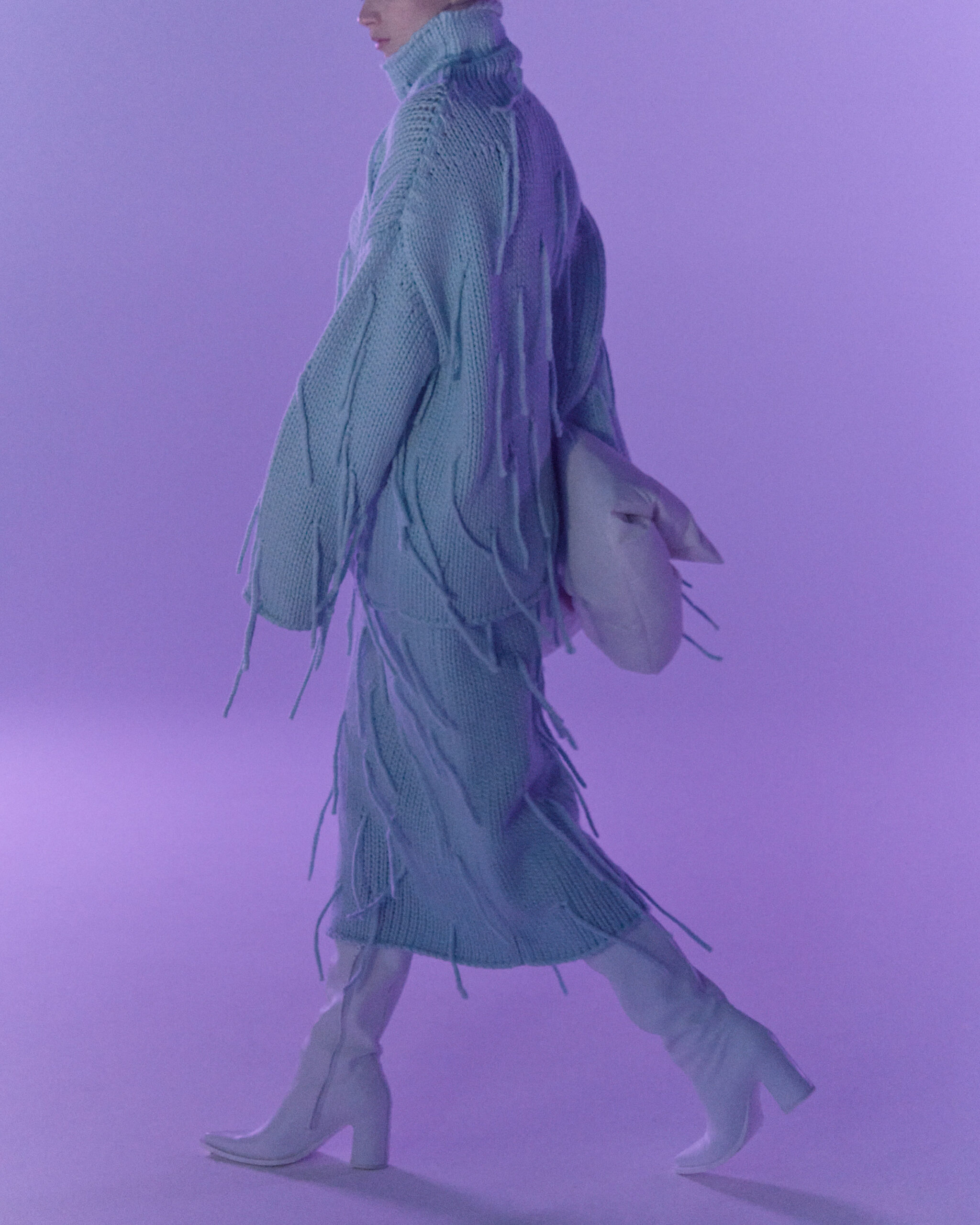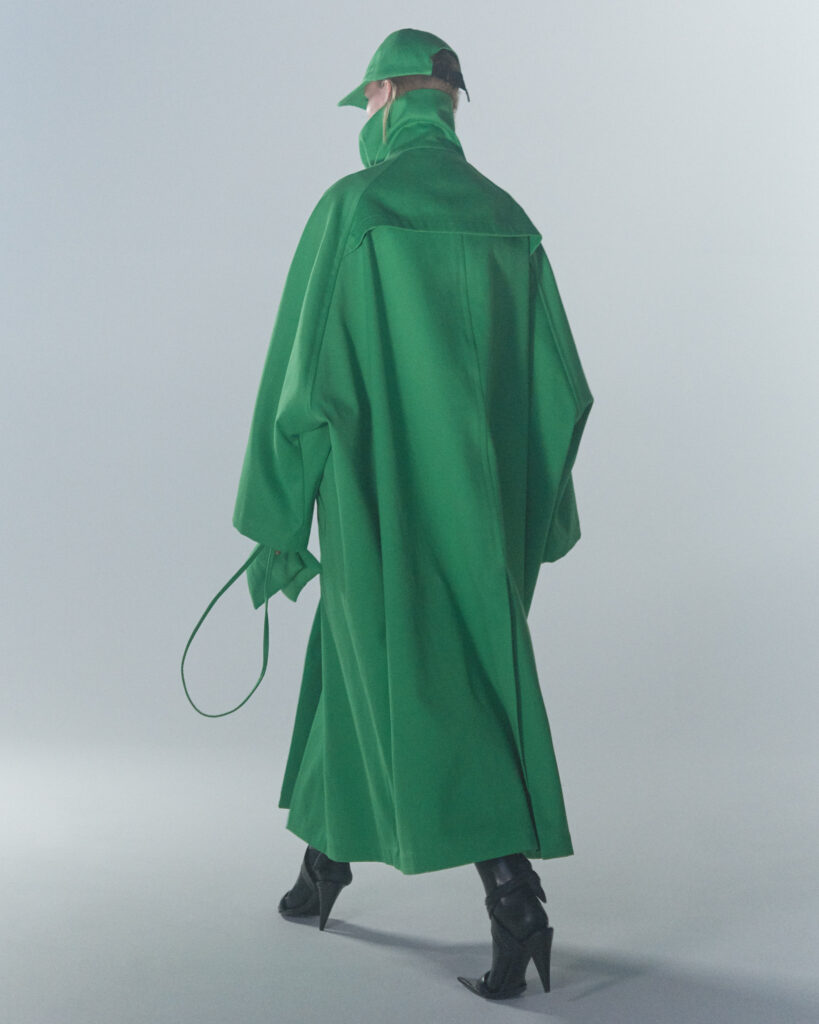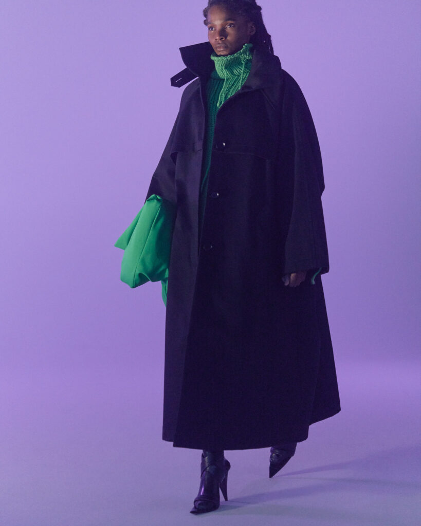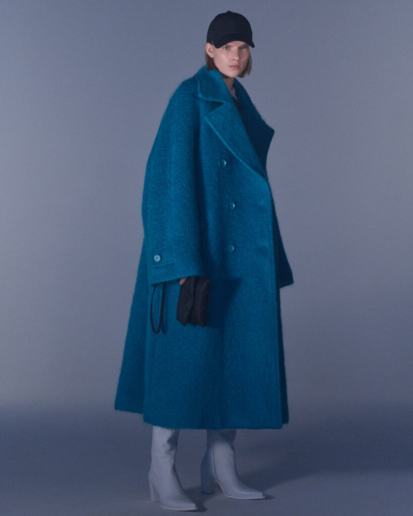 Fall Winter 2022 collection is all about embracing warmth. The feeling of resilience and serenity in a dormant state. The collection explores duality of fragility and strength. There is always beauty in vulnerability. A variation of uplifting colors surrounds the collection, soothing tones of lilac, turquoise, and light blue. Rich colors but always in the same mood of blue, teal, sage and strong accents of neon yellow and vivid spring green. Knitwear remains an integral focus. Various weights and shapes, from hand knits to intarsia knits to checked jacquards. Full look silhouettes in big chunky knits. Meticulous crotchet handwork, striking color blocked intarsia, grizzly textured boiled wool. Playful big fringes and wools with textured bouclé effect. Key takeaway is a luxurious 15 ply cashmere sweater, covetable and inexplicably soft, almost like wearing a cloud. Cocoon sleeves and oversized shapes give a sense of warmth comfort, shelter and mystery. This season’s outerwear is a constant pairing of contrast and proportions. Drawing on the visions of contemporary painter Marlene Dumas and symbolist Belgian painter Fernand Khnopff. Dumas’s infamous portraits, reflects an intimate but estranging atmosphere. Khnopff’s work of ethereal creatures rich in mystery and reverie remains an open source of interpretation for this season’s prints and textures.