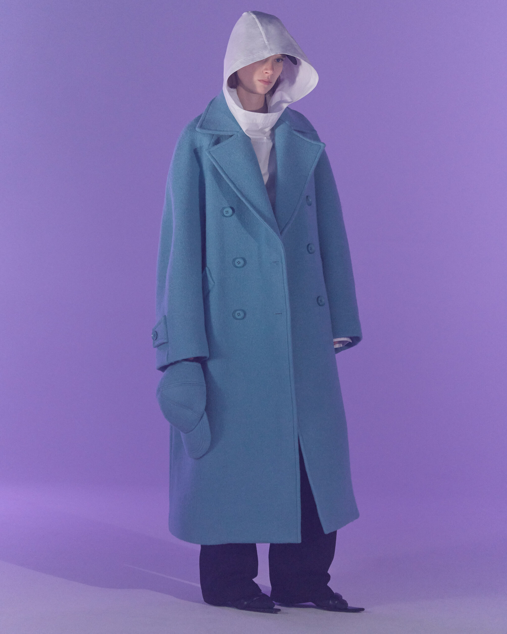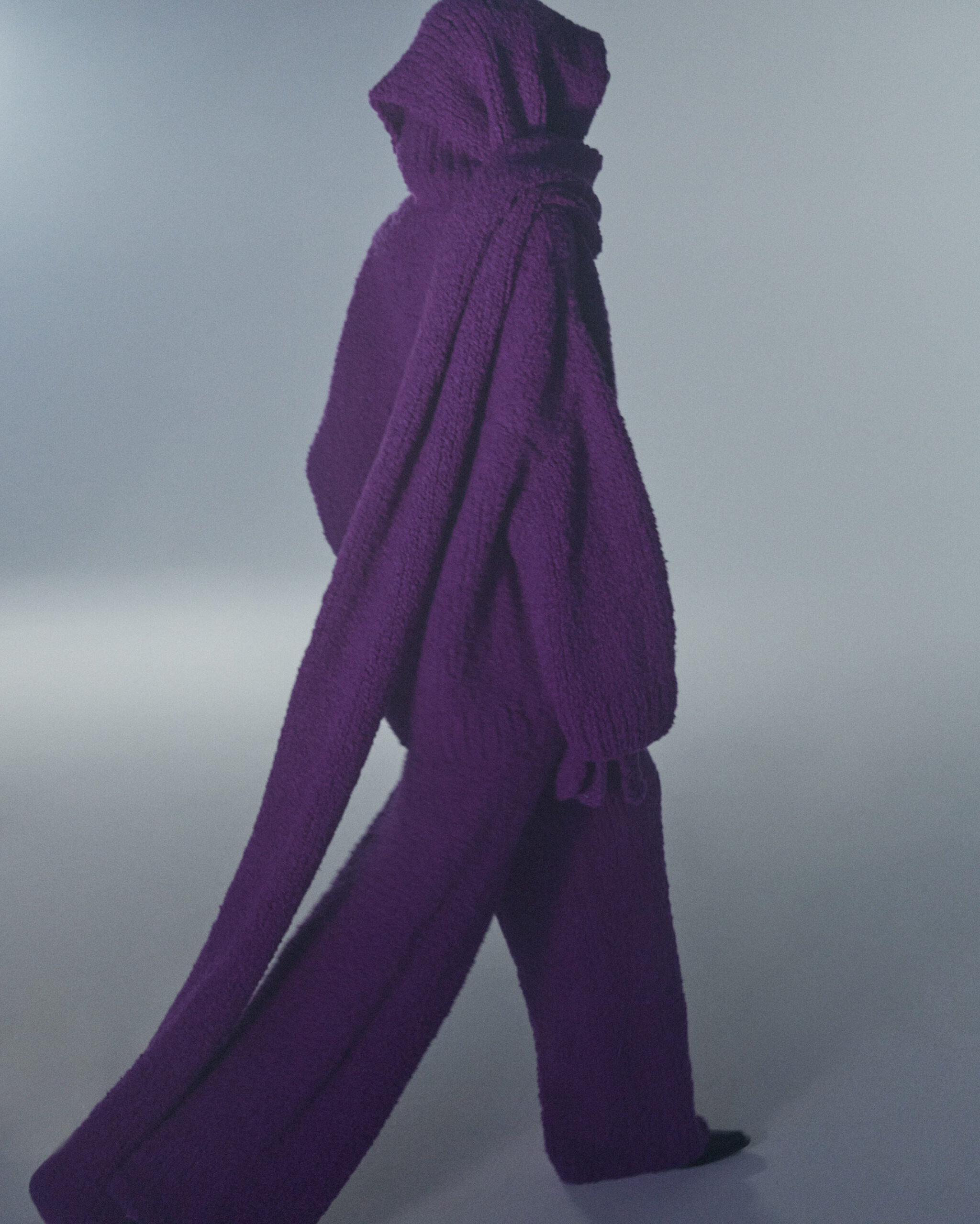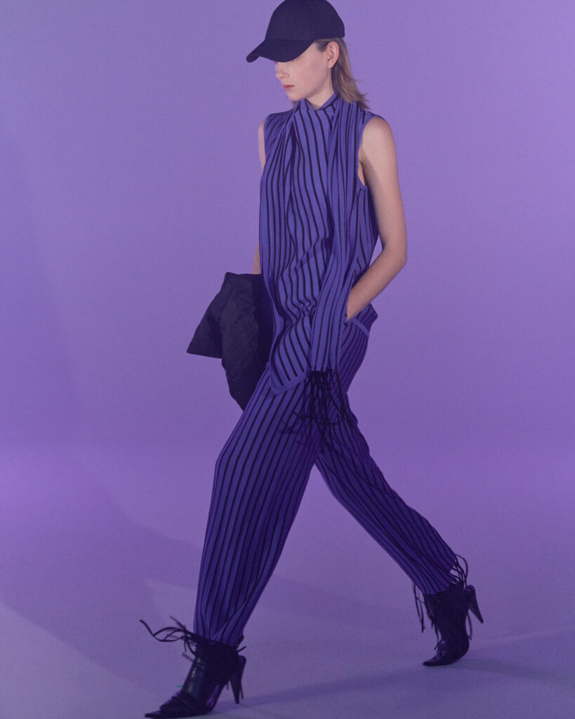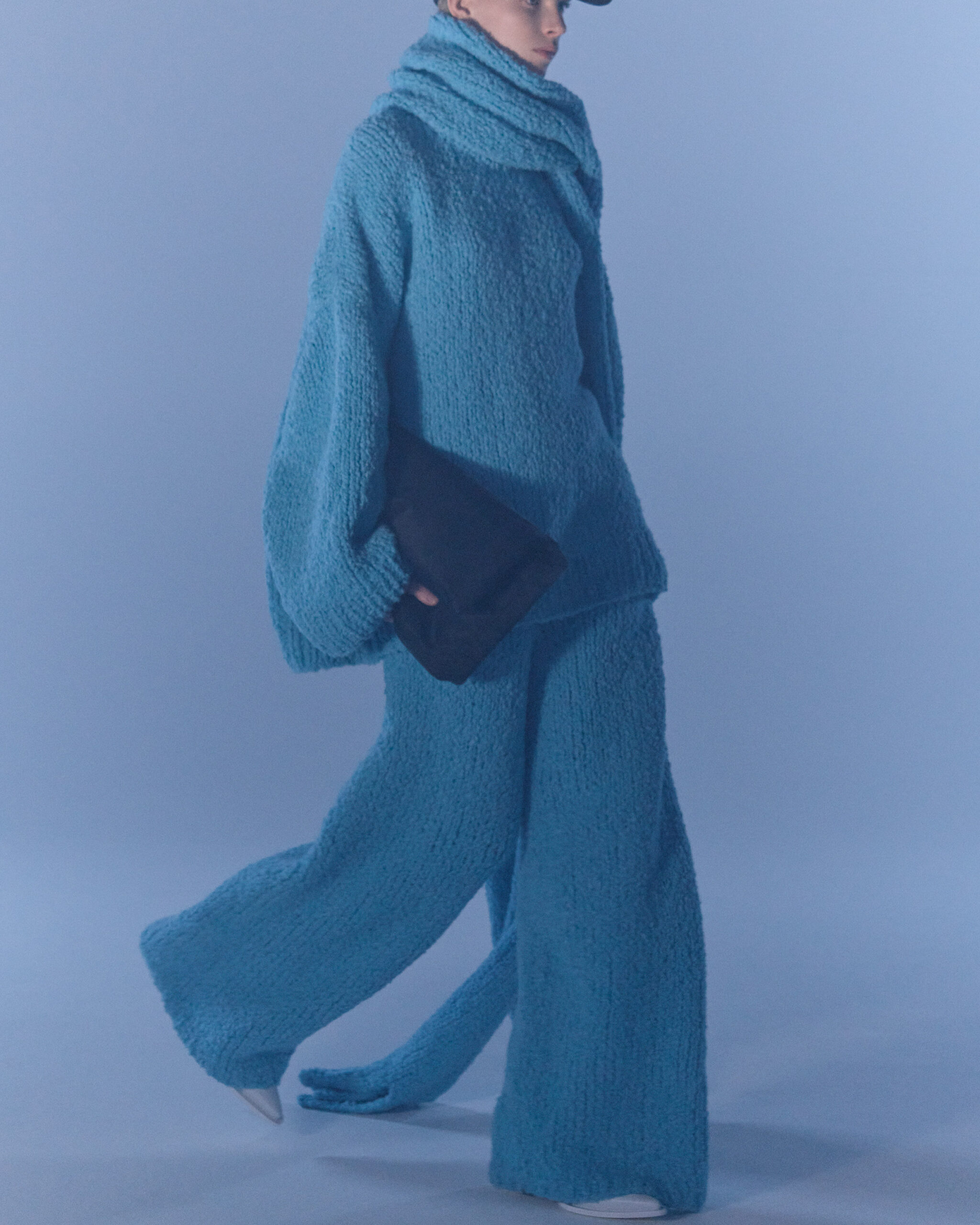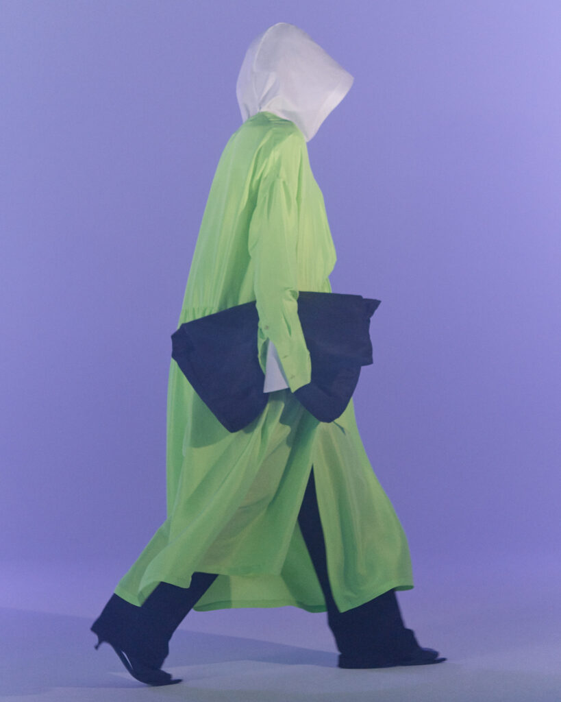 Fall Winter 2022 collection is all about embracing warmth. The feeling of resilience and serenity in a dormant state. The collection explores duality of fragility and strength. There is always beauty in vulnerability. A variation of uplifting colors surrounds the collection, soothing tones of lilac, turquoise, and light blue. Rich colors but always in the same mood of blue, teal, sage and strong accents of neon yellow and vivid spring green. Knitwear remains an integral focus. Various weights and shapes, from hand knits to intarsia knits to checked jacquards. Full look silhouettes in big chunky knits. Meticulous crotchet handwork, striking color blocked intarsia, grizzly textured boiled wool. Playful big fringes and wools with textured bouclé effect. Key takeaway is a luxurious 15 ply cashmere sweater, covetable and inexplicably soft, almost like wearing a cloud. Cocoon sleeves and oversized shapes give a sense of warmth comfort, shelter and mystery. This season’s outerwear is a constant pairing of contrast and proportions. Drawing on the visions of contemporary painter Marlene Dumas and symbolist Belgian painter Fernand Khnopff. Dumas’s infamous portraits, reflects an intimate but estranging atmosphere. Khnopff’s work of ethereal creatures rich in mystery and reverie remains an open source of interpretation for this season’s prints and textures.