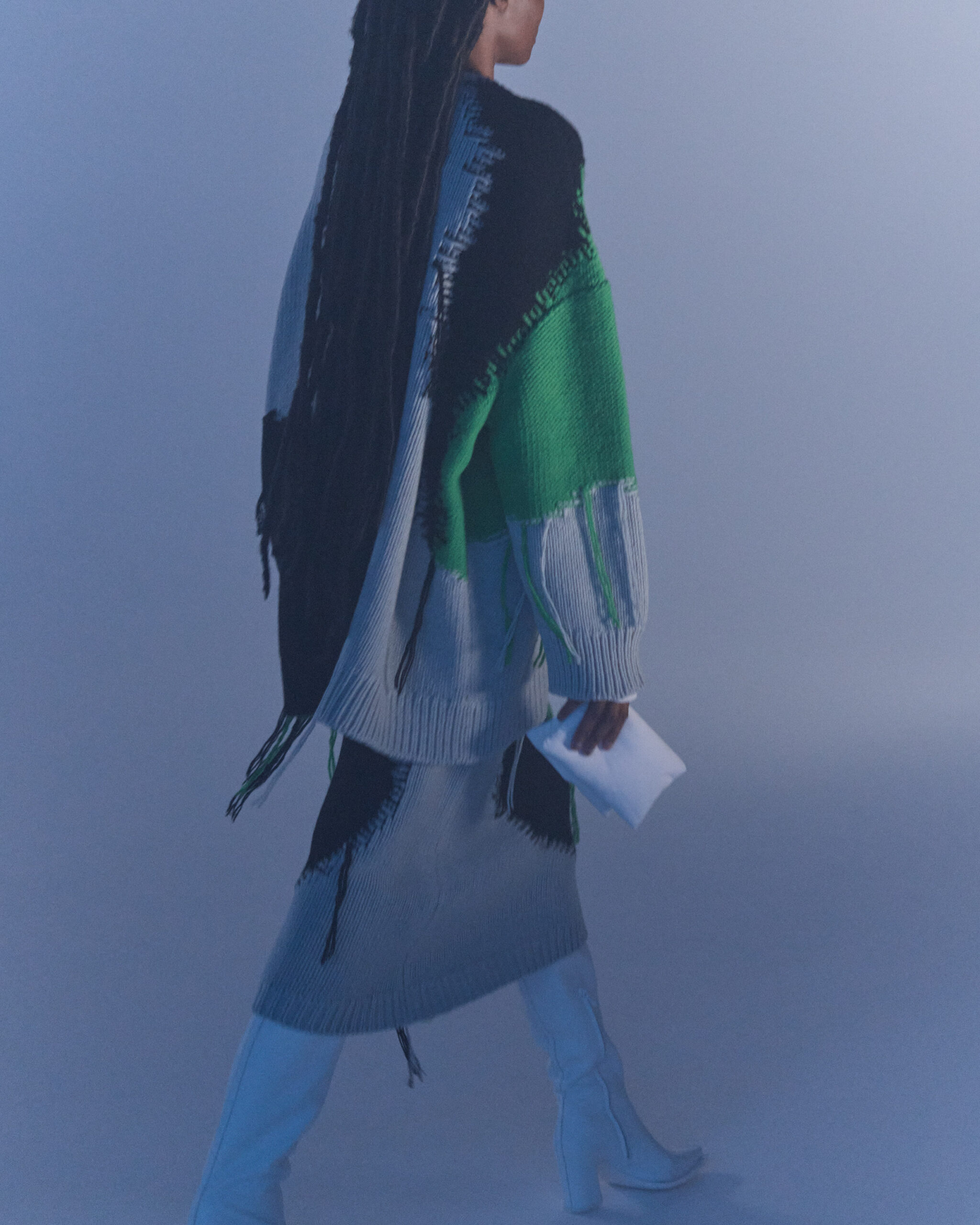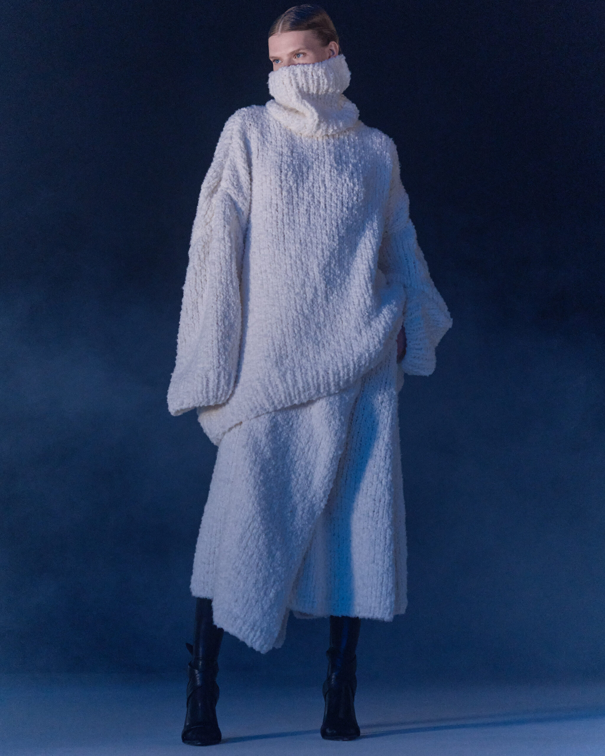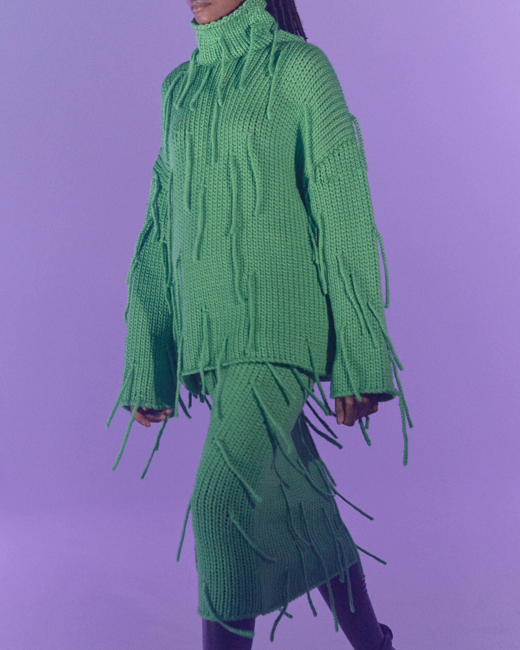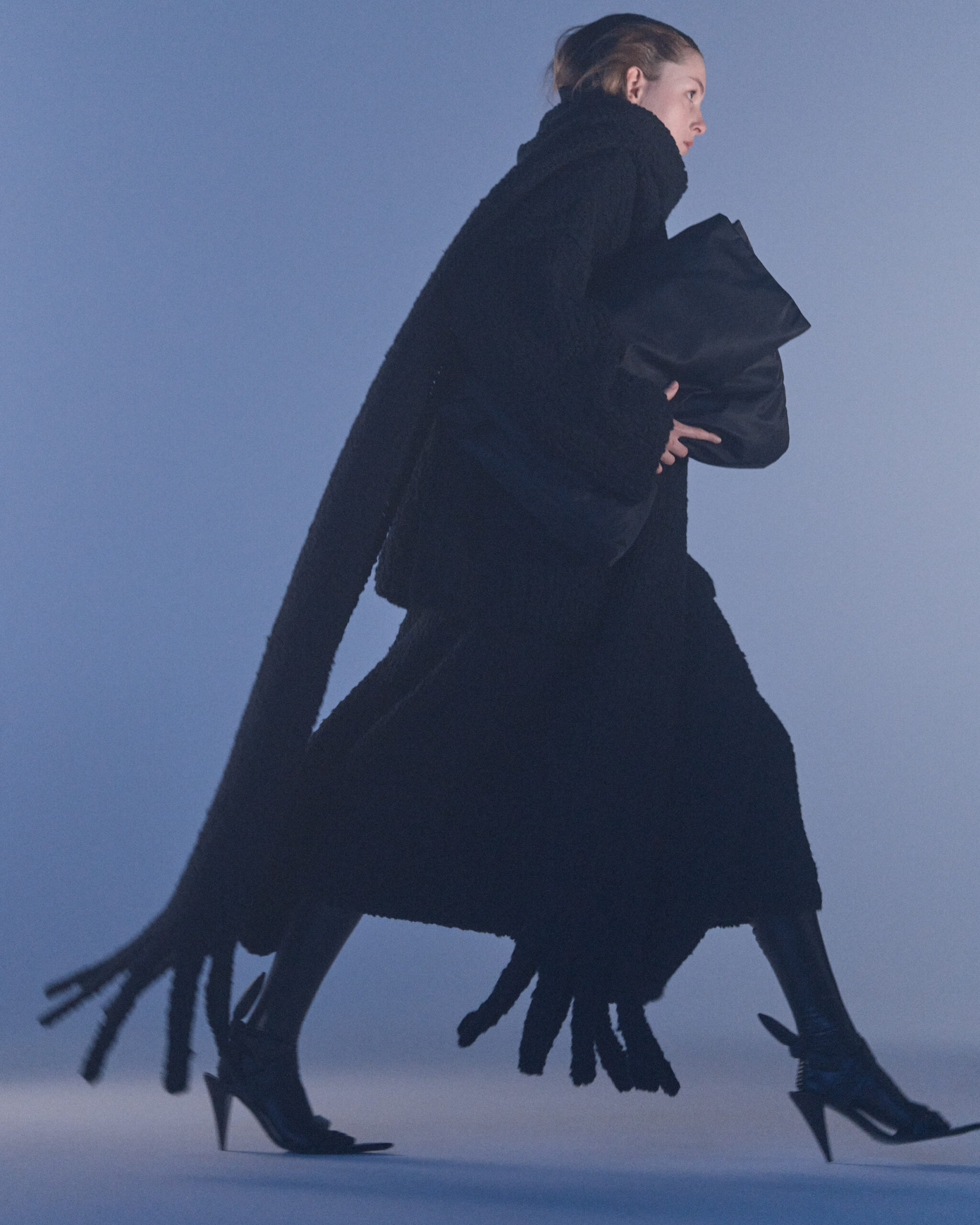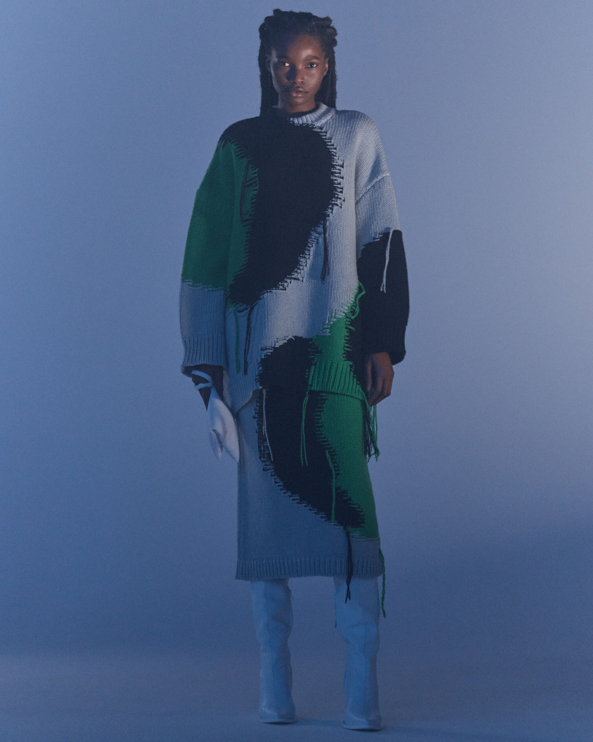 Fall Winter 2022 collection is all about embracing warmth. The feeling of resilience and serenity in a dormant state. The collection explores duality of fragility and strength. There is always beauty in vulnerability. A variation of uplifting colors surrounds the collection, soothing tones of lilac, turquoise, and light blue. Rich colors but always in the same mood of blue, teal, sage and strong accents of neon yellow and vivid spring green. Knitwear remains an integral focus. Various weights and shapes, from hand knits to intarsia knits to checked jacquards. Full look silhouettes in big chunky knits. Meticulous crotchet handwork, striking color blocked intarsia, grizzly textured boiled wool. Playful big fringes and wools with textured bouclé effect. Key takeaway is a luxurious 15 ply cashmere sweater, covetable and inexplicably soft, almost like wearing a cloud. Cocoon sleeves and oversized shapes give a sense of warmth comfort, shelter and mystery. This season’s outerwear is a constant pairing of contrast and proportions. Drawing on the visions of contemporary painter Marlene Dumas and symbolist Belgian painter Fernand Khnopff. Dumas’s infamous portraits, reflects an intimate but estranging atmosphere. Khnopff’s work of ethereal creatures rich in mystery and reverie remains an open source of interpretation for this season’s prints and textures.