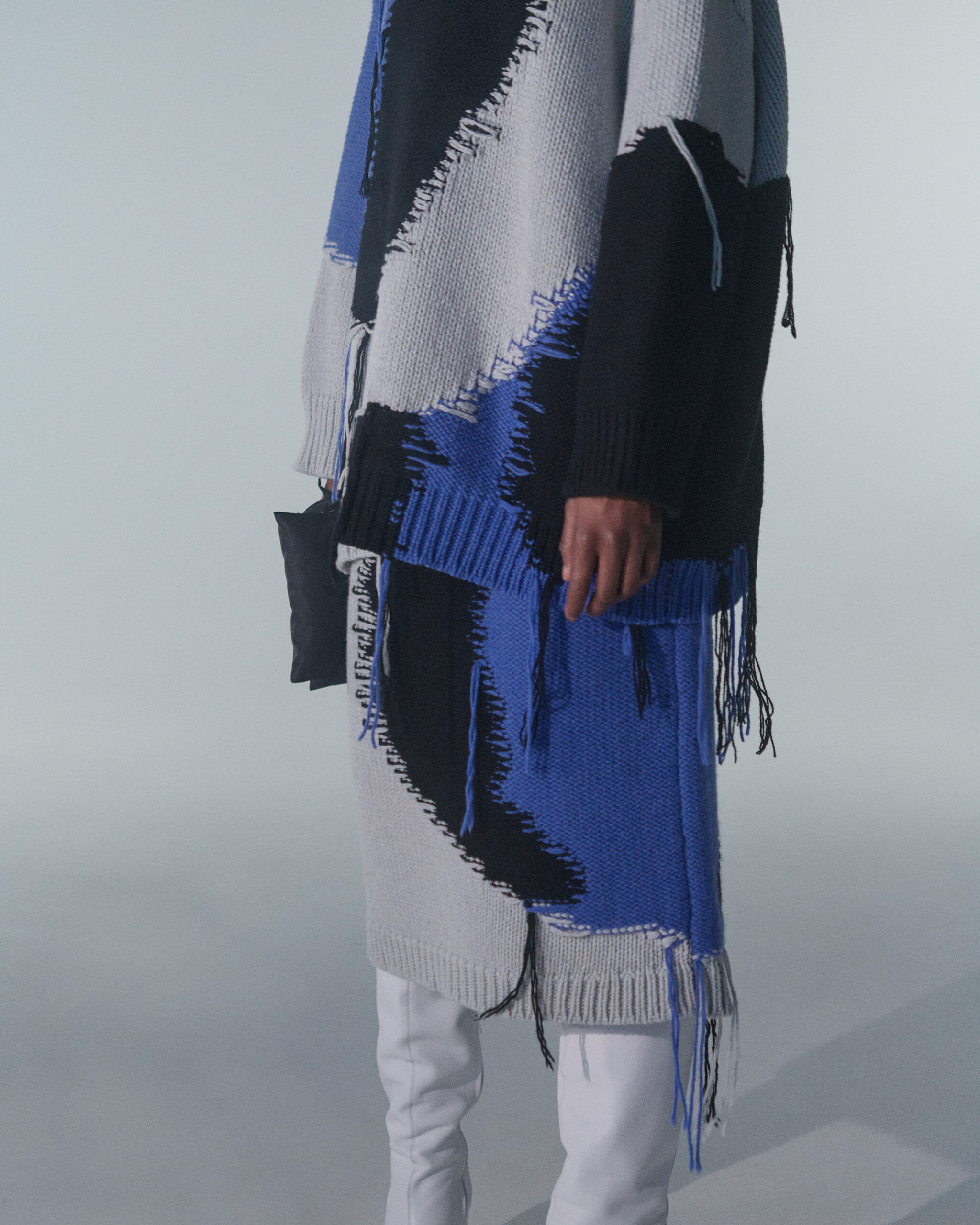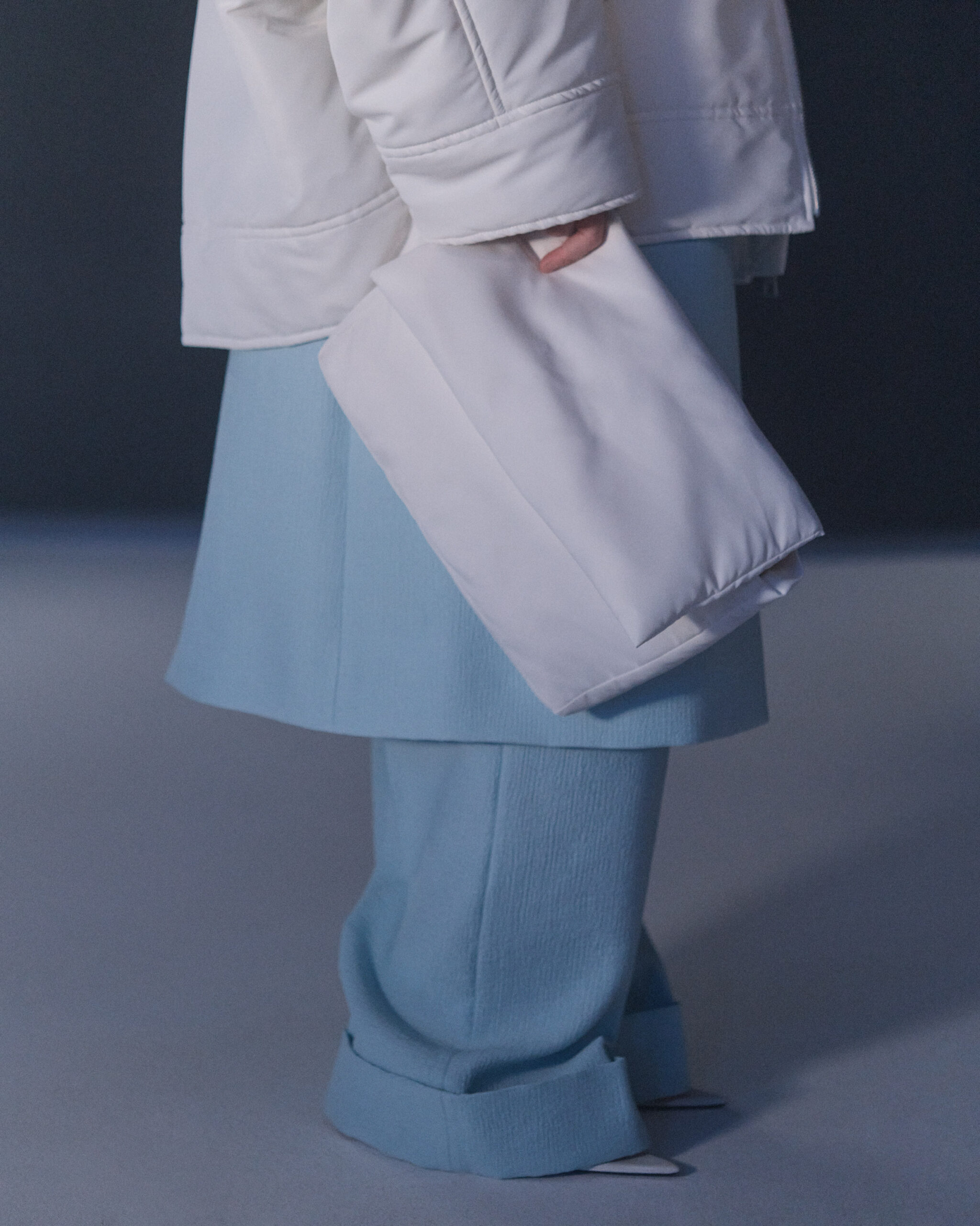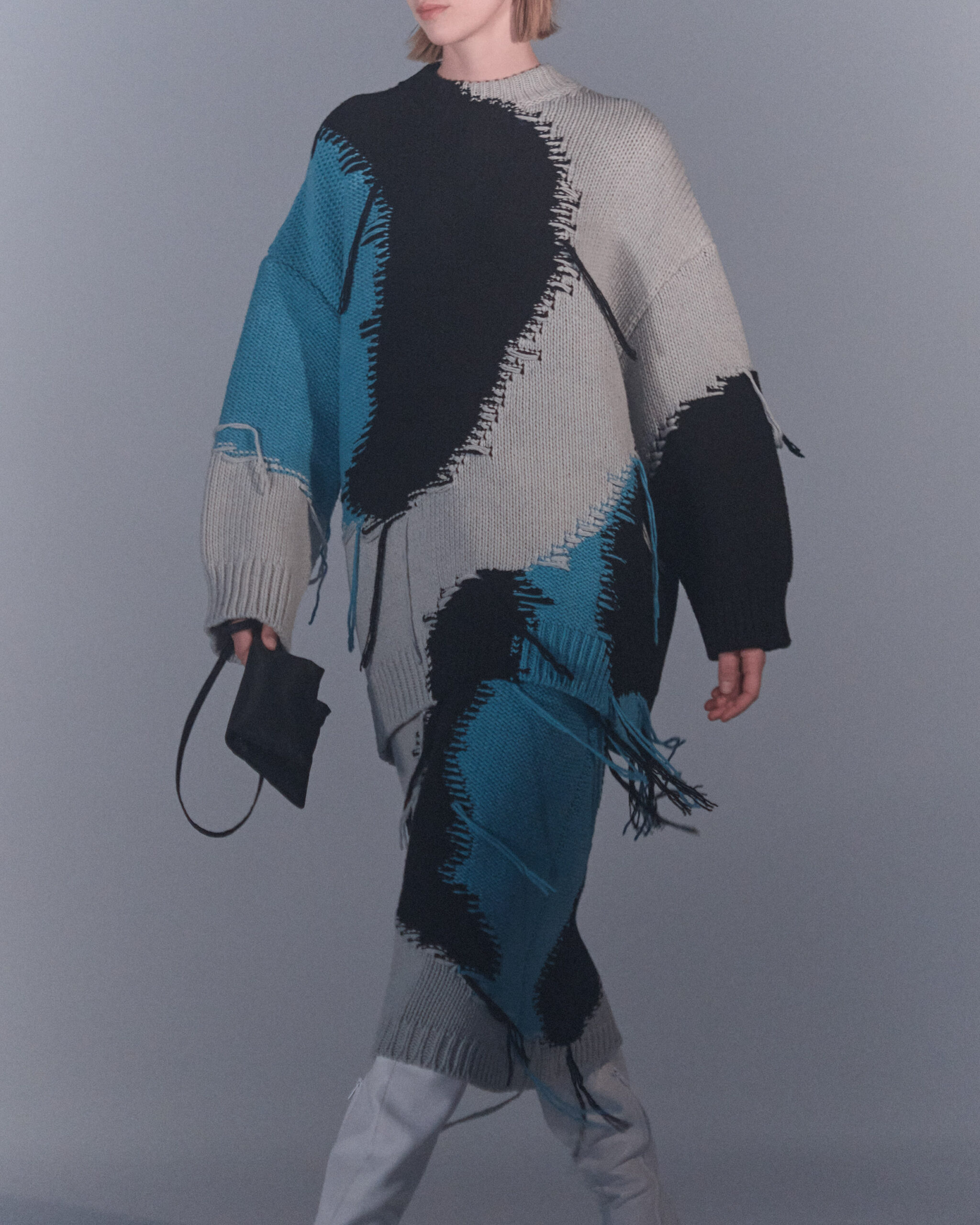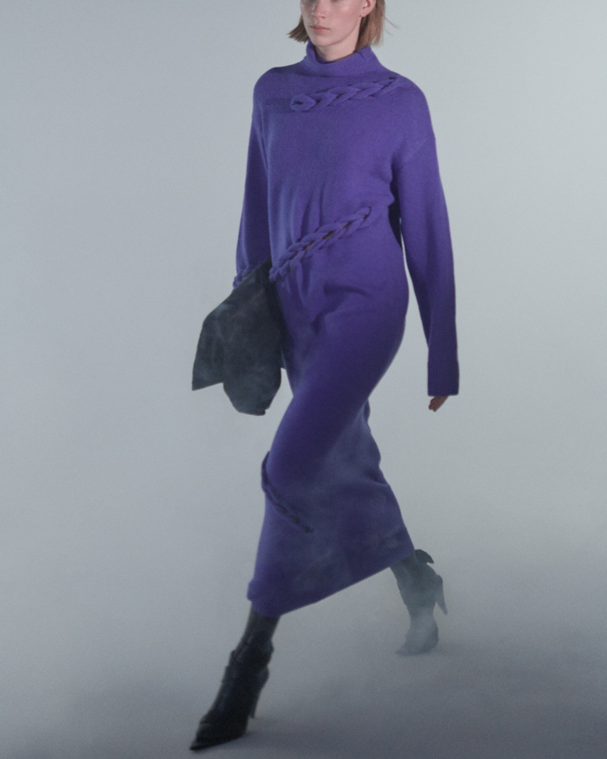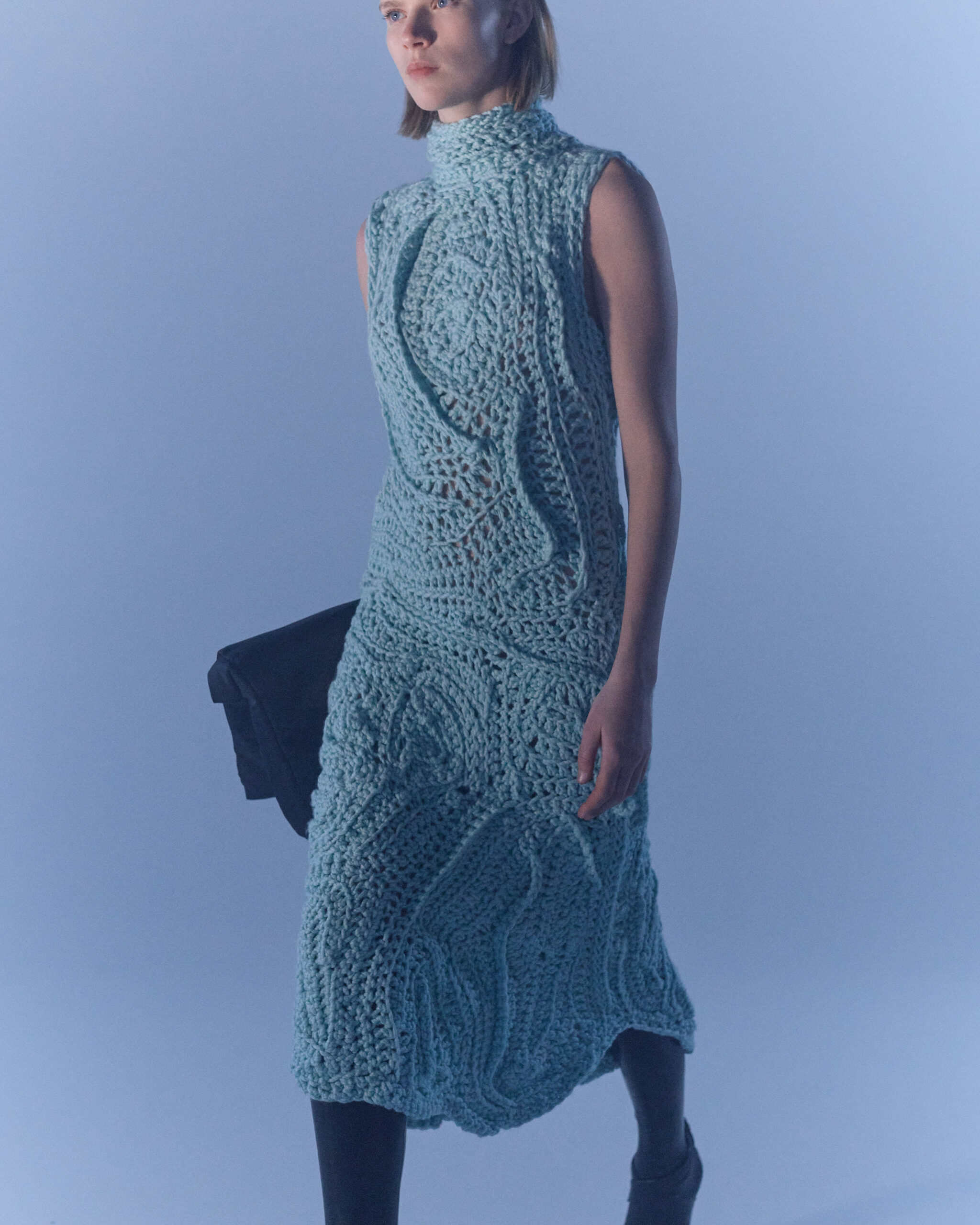 Fall Winter 2022 collection is all about embracing warmth. The feeling of resilience and serenity in a dormant state. The collection explores duality of fragility and strength. There is always beauty in vulnerability. A variation of uplifting colors surrounds the collection, soothing tones of lilac, turquoise, and light blue. Rich colors but always in the same mood of blue, teal, sage and strong accents of neon yellow and vivid spring green. Knitwear remains an integral focus. Various weights and shapes, from hand knits to intarsia knits to checked jacquards. Full look silhouettes in big chunky knits. Meticulous crotchet handwork, striking color blocked intarsia, grizzly textured boiled wool. Playful big fringes and wools with textured bouclé effect. Key takeaway is a luxurious 15 ply cashmere sweater, covetable and inexplicably soft, almost like wearing a cloud. Cocoon sleeves and oversized shapes give a sense of warmth comfort, shelter and mystery. This season’s outerwear is a constant pairing of contrast and proportions. Drawing on the visions of contemporary painter Marlene Dumas and symbolist Belgian painter Fernand Khnopff. Dumas’s infamous portraits, reflects an intimate but estranging atmosphere. Khnopff’s work of ethereal creatures rich in mystery and reverie remains an open source of interpretation for this season’s prints and textures.