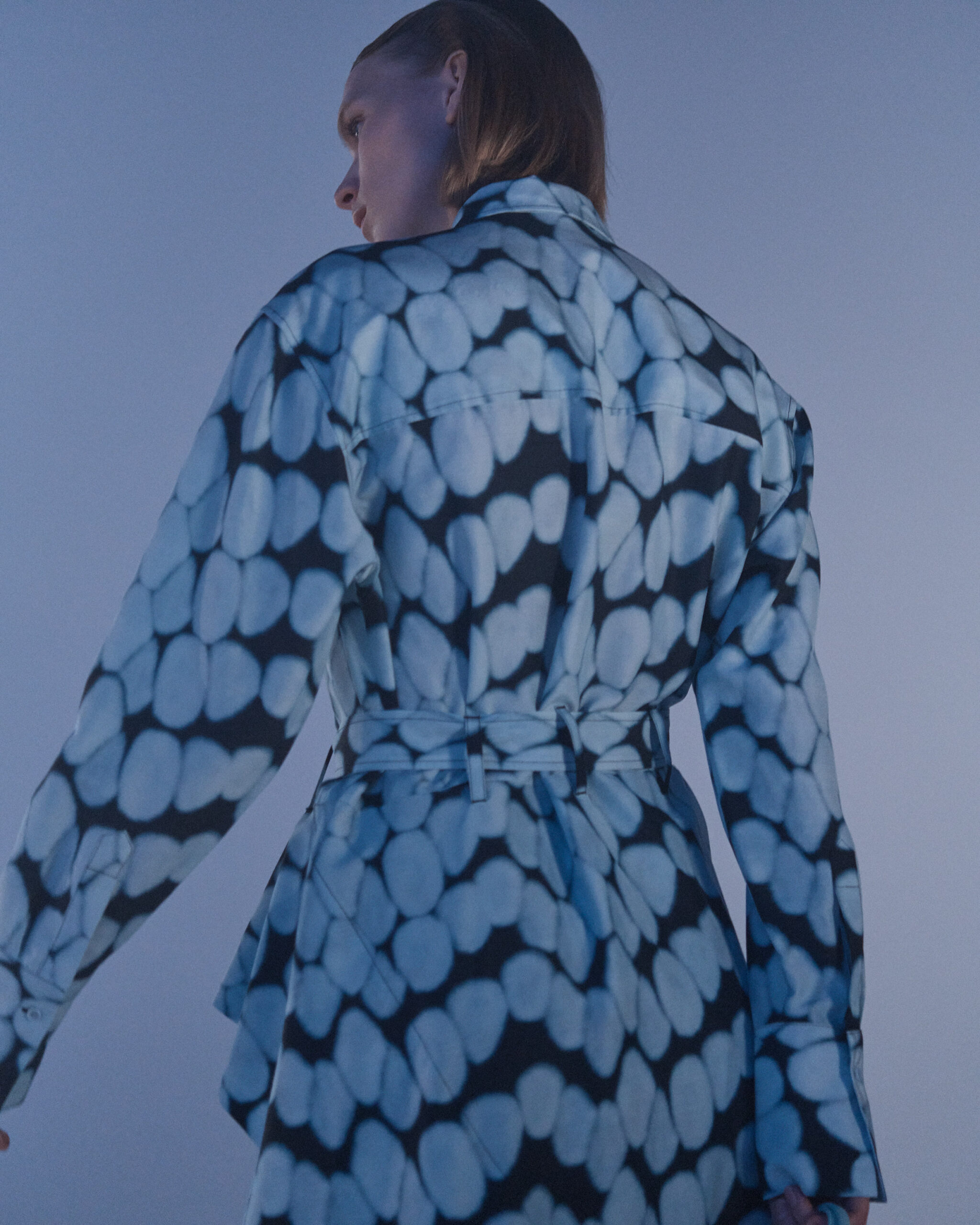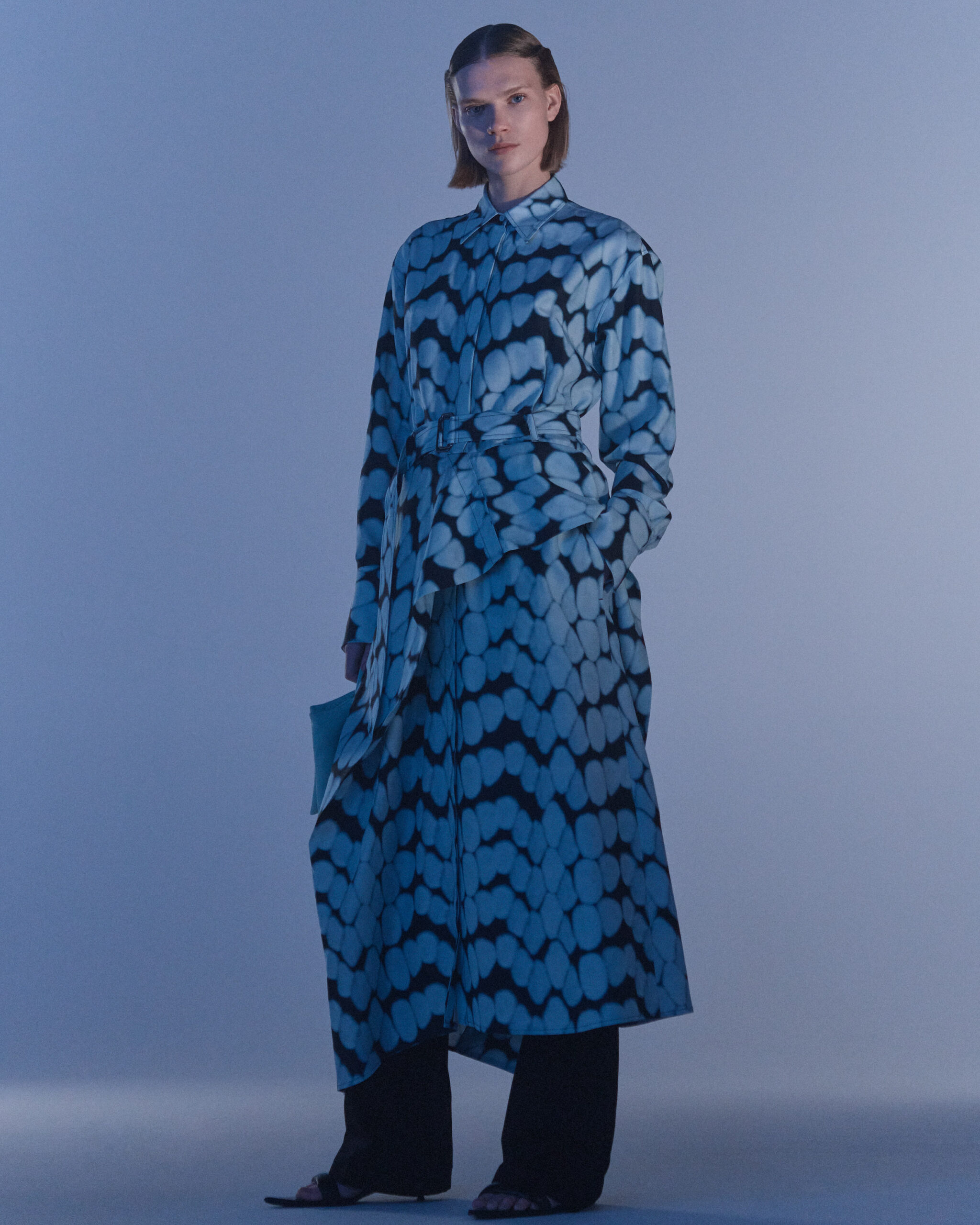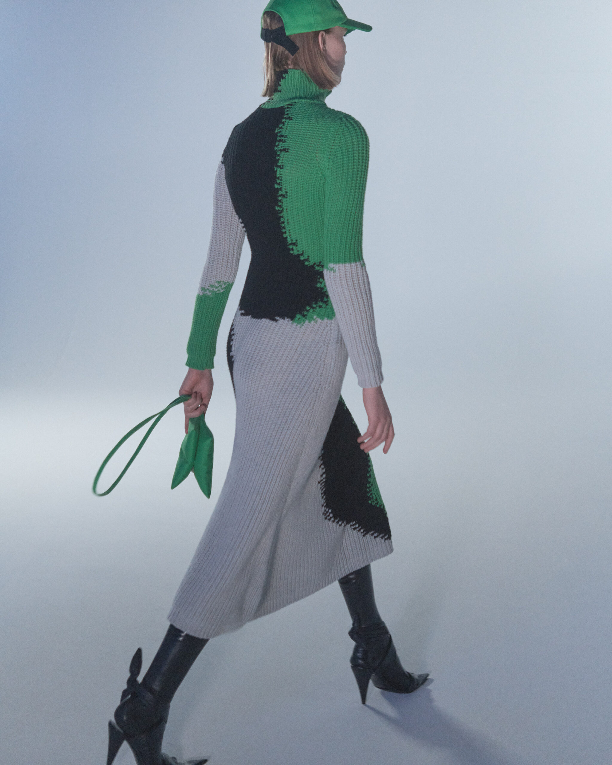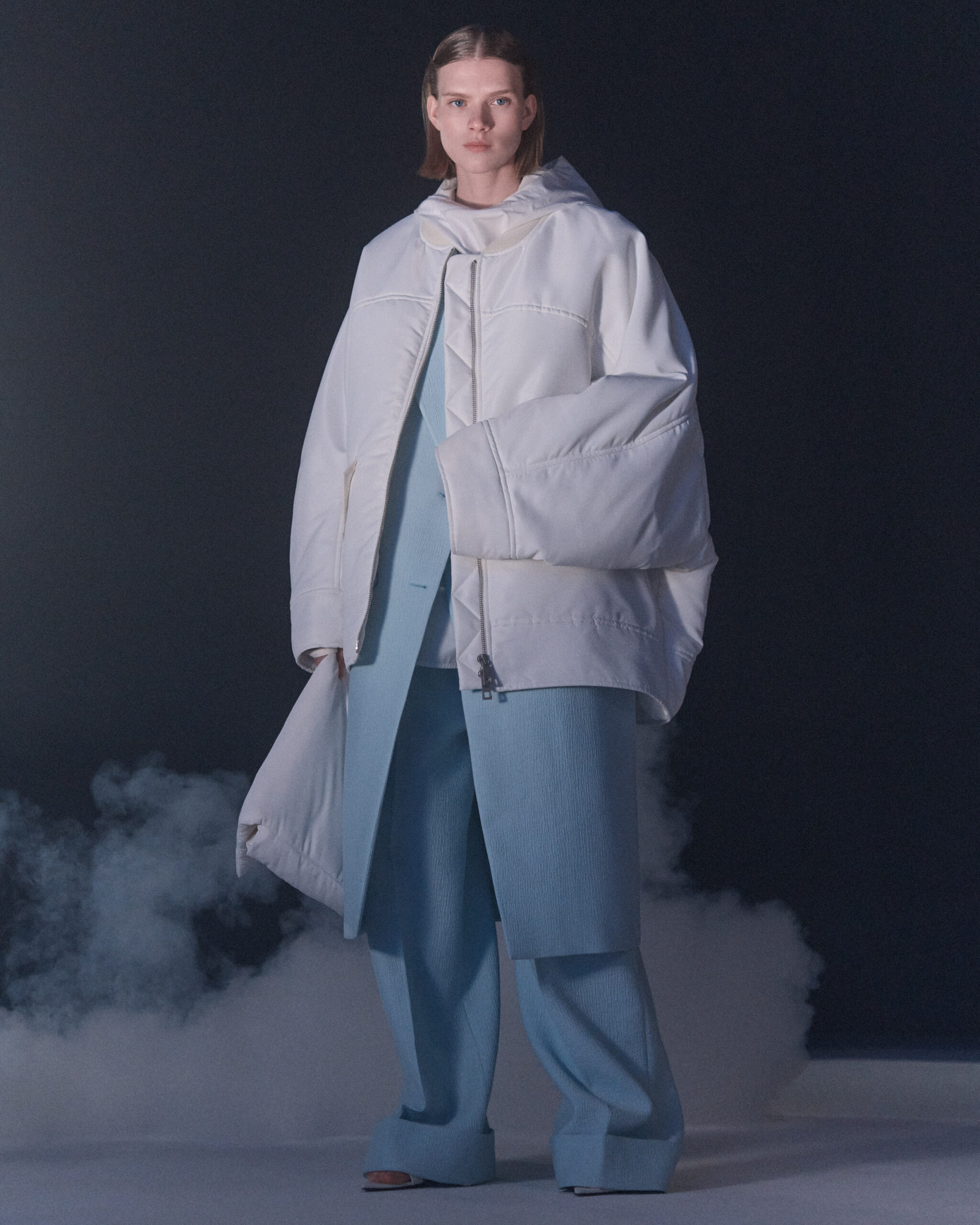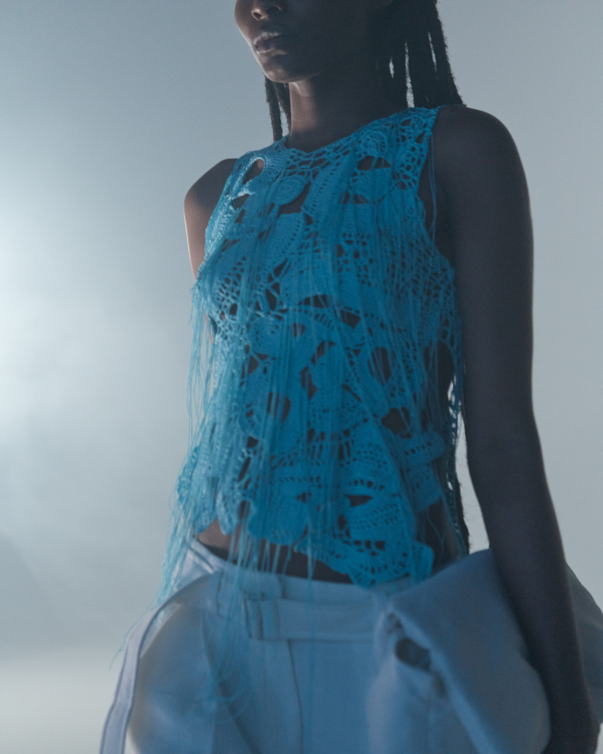 Fall Winter 2022 collection is all about embracing warmth. The feeling of resilience and serenity in a dormant state. The collection explores duality of fragility and strength. There is always beauty in vulnerability. A variation of uplifting colors surrounds the collection, soothing tones of lilac, turquoise, and light blue. Rich colors but always in the same mood of blue, teal, sage and strong accents of neon yellow and vivid spring green. Knitwear remains an integral focus. Various weights and shapes, from hand knits to intarsia knits to checked jacquards. Full look silhouettes in big chunky knits. Meticulous crotchet handwork, striking color blocked intarsia, grizzly textured boiled wool. Playful big fringes and wools with textured bouclé effect. Key takeaway is a luxurious 15 ply cashmere sweater, covetable and inexplicably soft, almost like wearing a cloud. Cocoon sleeves and oversized shapes give a sense of warmth comfort, shelter and mystery. This season’s outerwear is a constant pairing of contrast and proportions. Drawing on the visions of contemporary painter Marlene Dumas and symbolist Belgian painter Fernand Khnopff. Dumas’s infamous portraits, reflects an intimate but estranging atmosphere. Khnopff’s work of ethereal creatures rich in mystery and reverie remains an open source of interpretation for this season’s prints and textures.