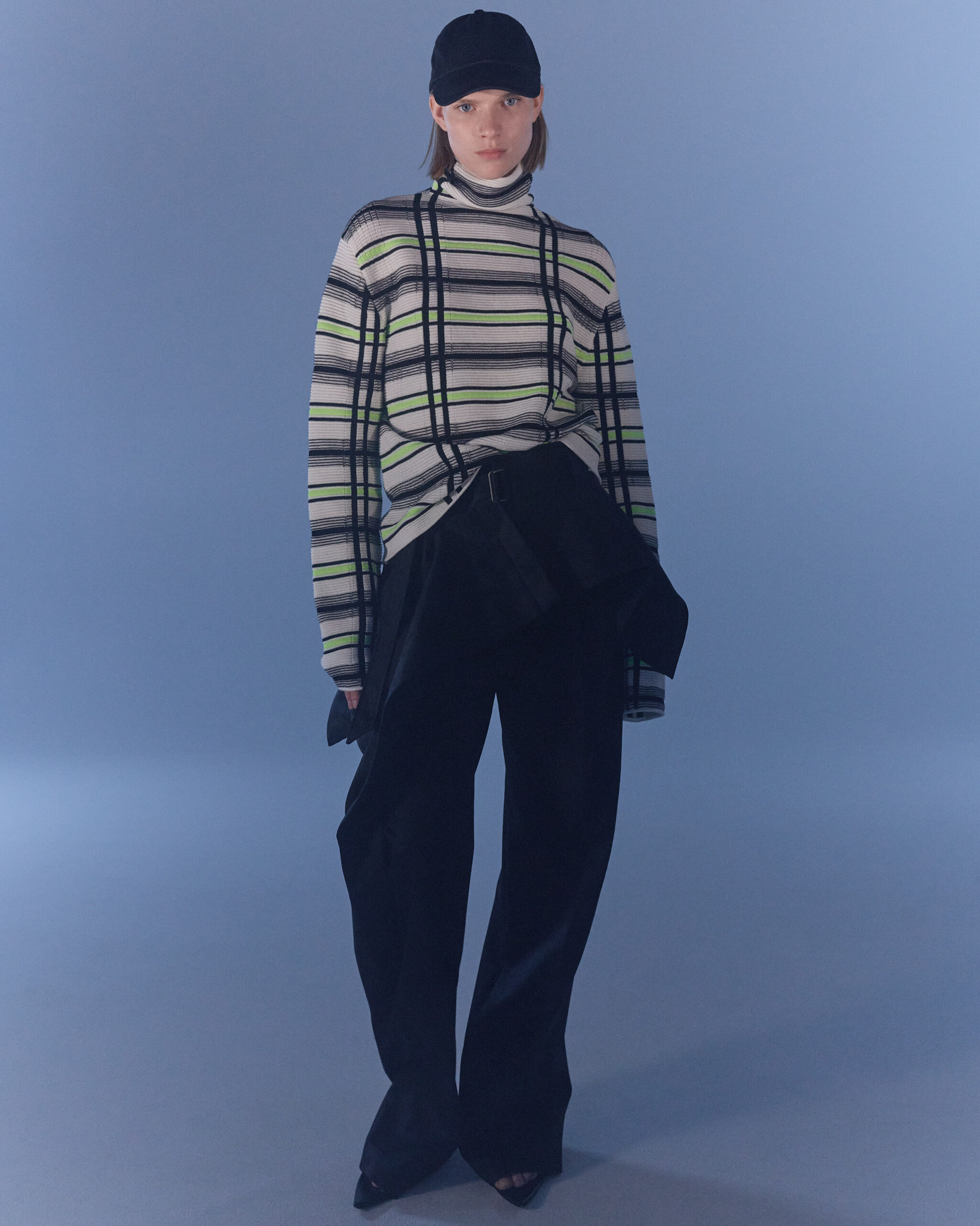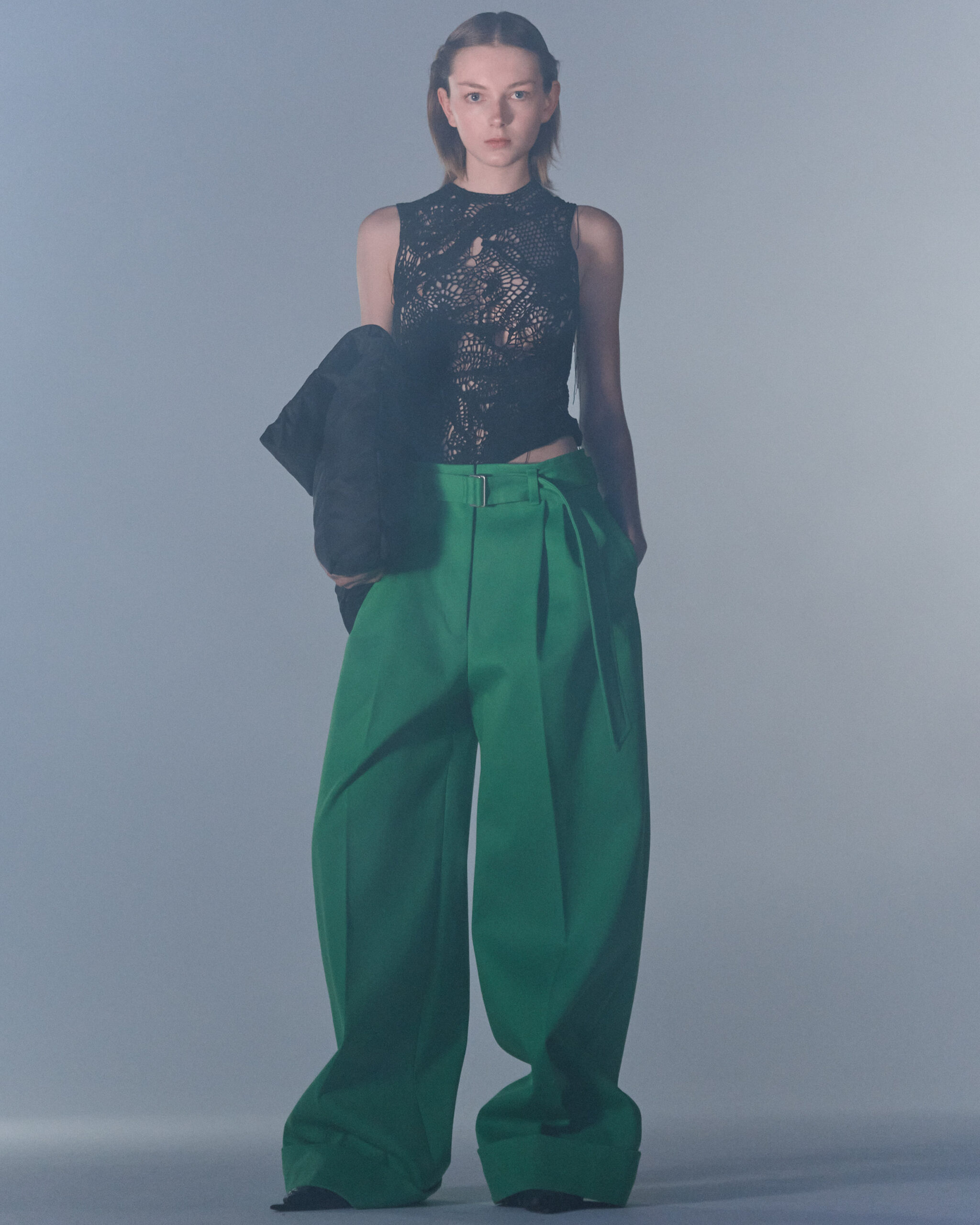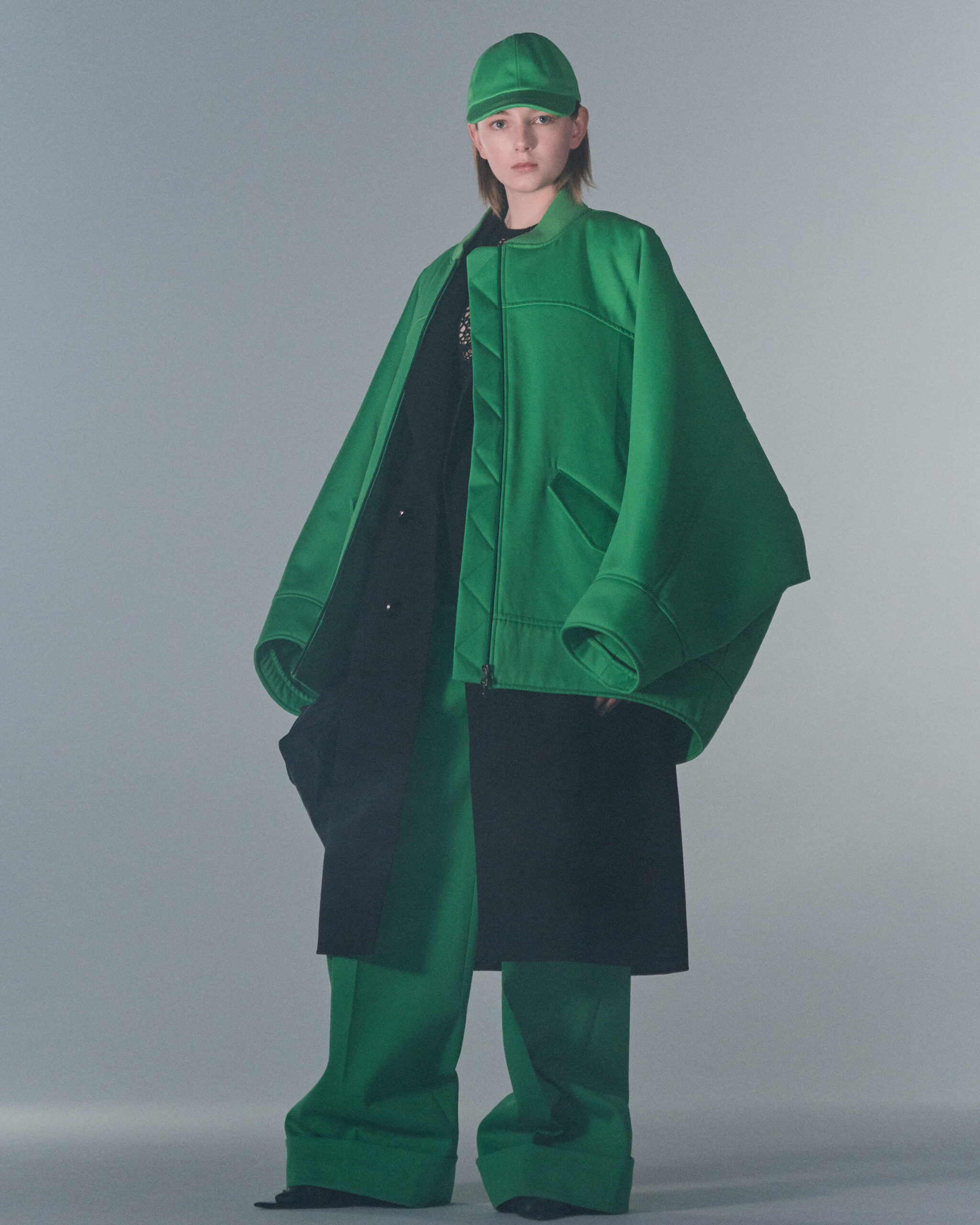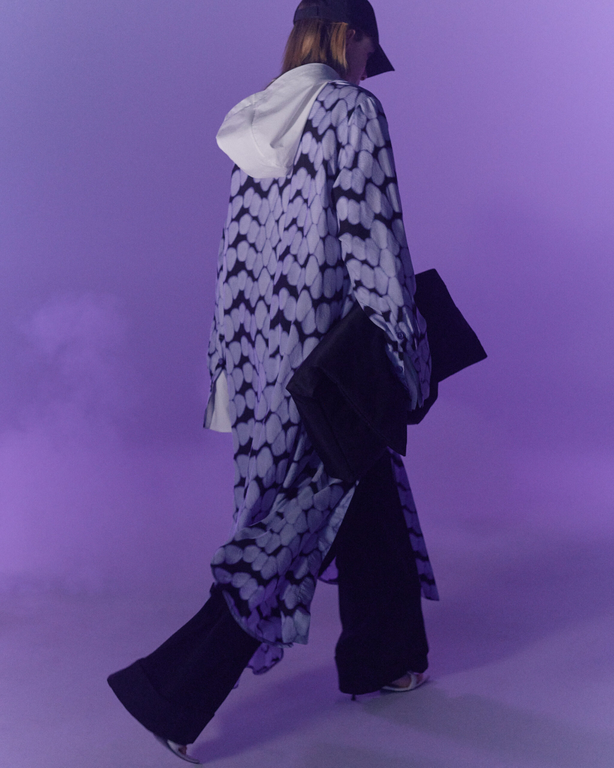 Fall Winter 2022 collection is all about embracing warmth. The feeling of resilience and serenity in a dormant state. The collection explores duality of fragility and strength. There is always beauty in vulnerability. A variation of uplifting colors surrounds the collection, soothing tones of lilac, turquoise, and light blue. Rich colors but always in the same mood of blue, teal, sage and strong accents of neon yellow and vivid spring green. Knitwear remains an integral focus. Various weights and shapes, from hand knits to intarsia knits to checked jacquards. Full look silhouettes in big chunky knits. Meticulous crotchet handwork, striking color blocked intarsia, grizzly textured boiled wool. Playful big fringes and wools with textured bouclé effect. Key takeaway is a luxurious 15 ply cashmere sweater, covetable and inexplicably soft, almost like wearing a cloud. Cocoon sleeves and oversized shapes give a sense of warmth comfort, shelter and mystery. This season’s outerwear is a constant pairing of contrast and proportions. Drawing on the visions of contemporary painter Marlene Dumas and symbolist Belgian painter Fernand Khnopff. Dumas’s infamous portraits, reflects an intimate but estranging atmosphere. Khnopff’s work of ethereal creatures rich in mystery and reverie remains an open source of interpretation for this season’s prints and textures.