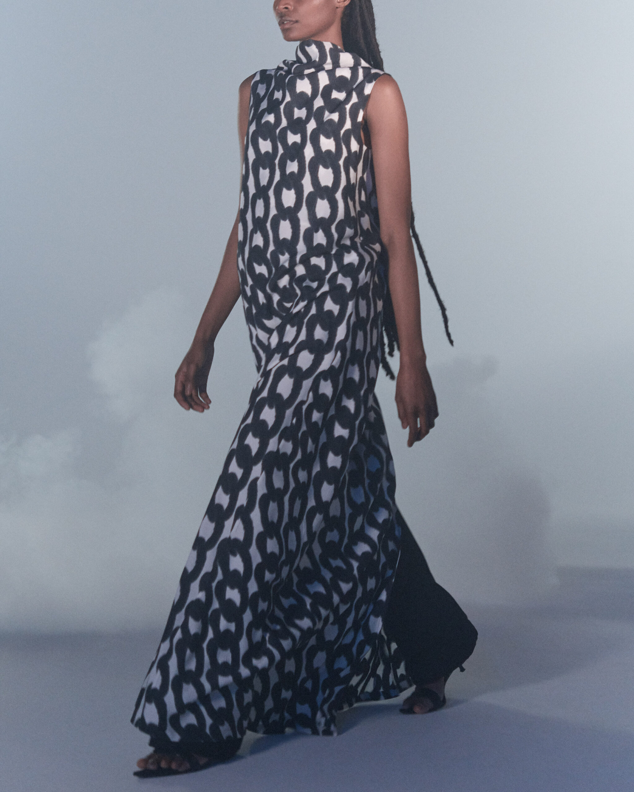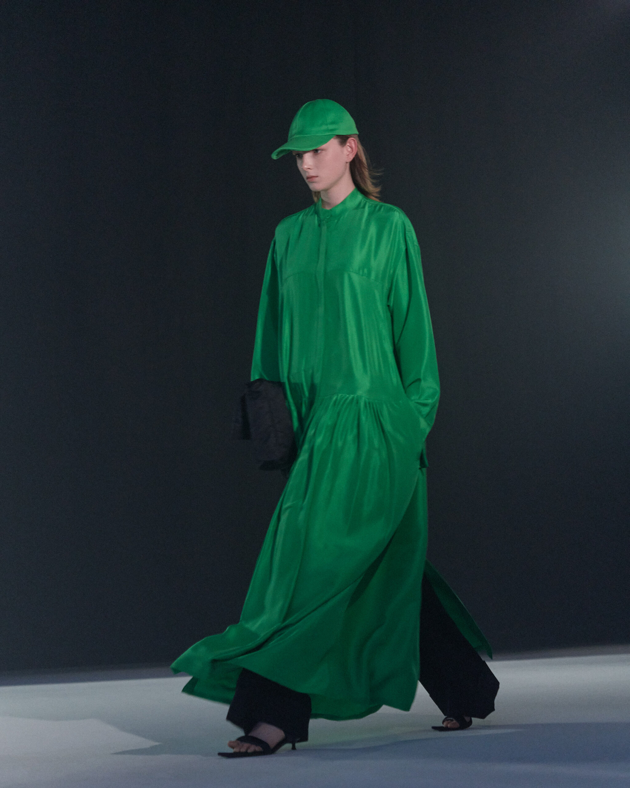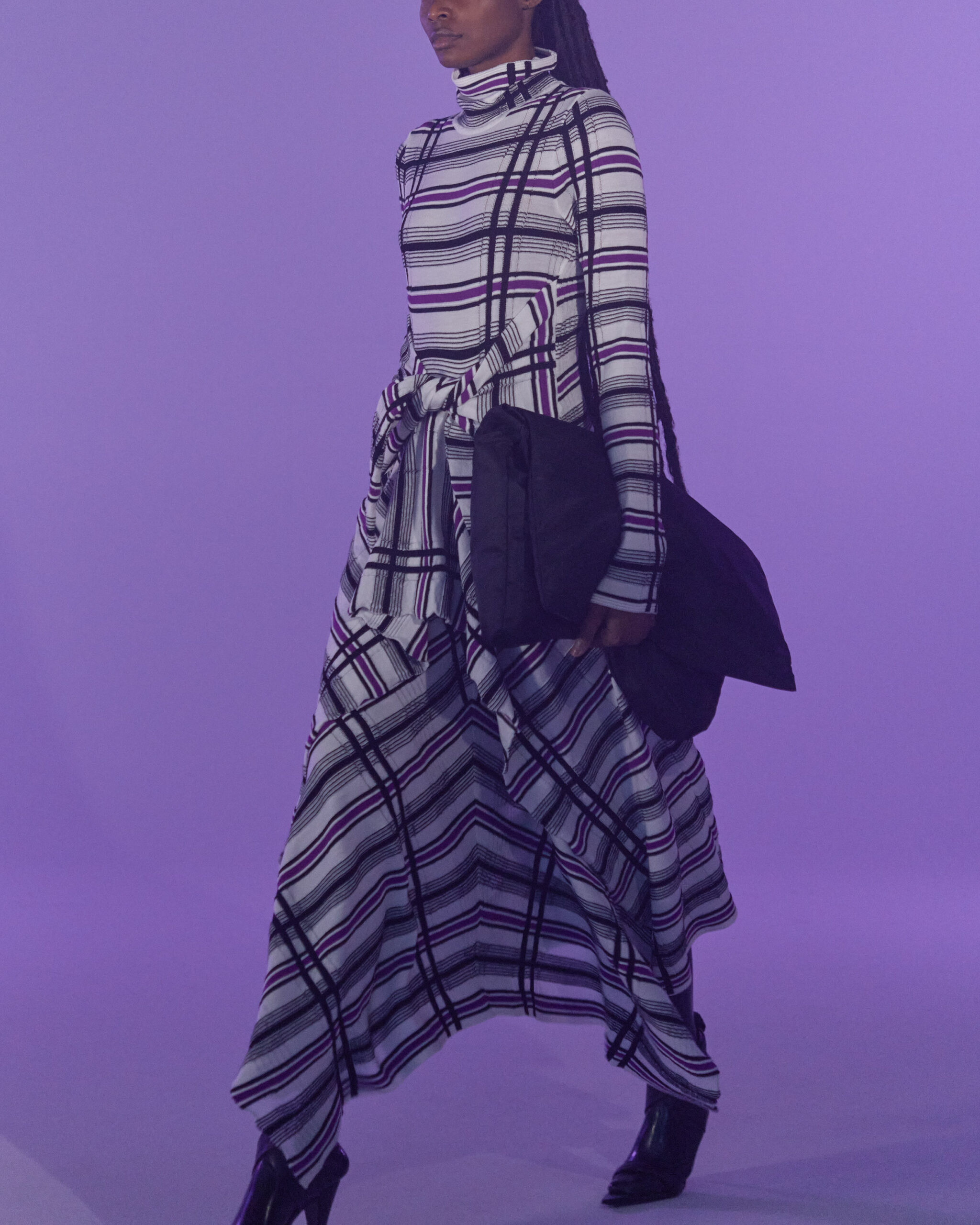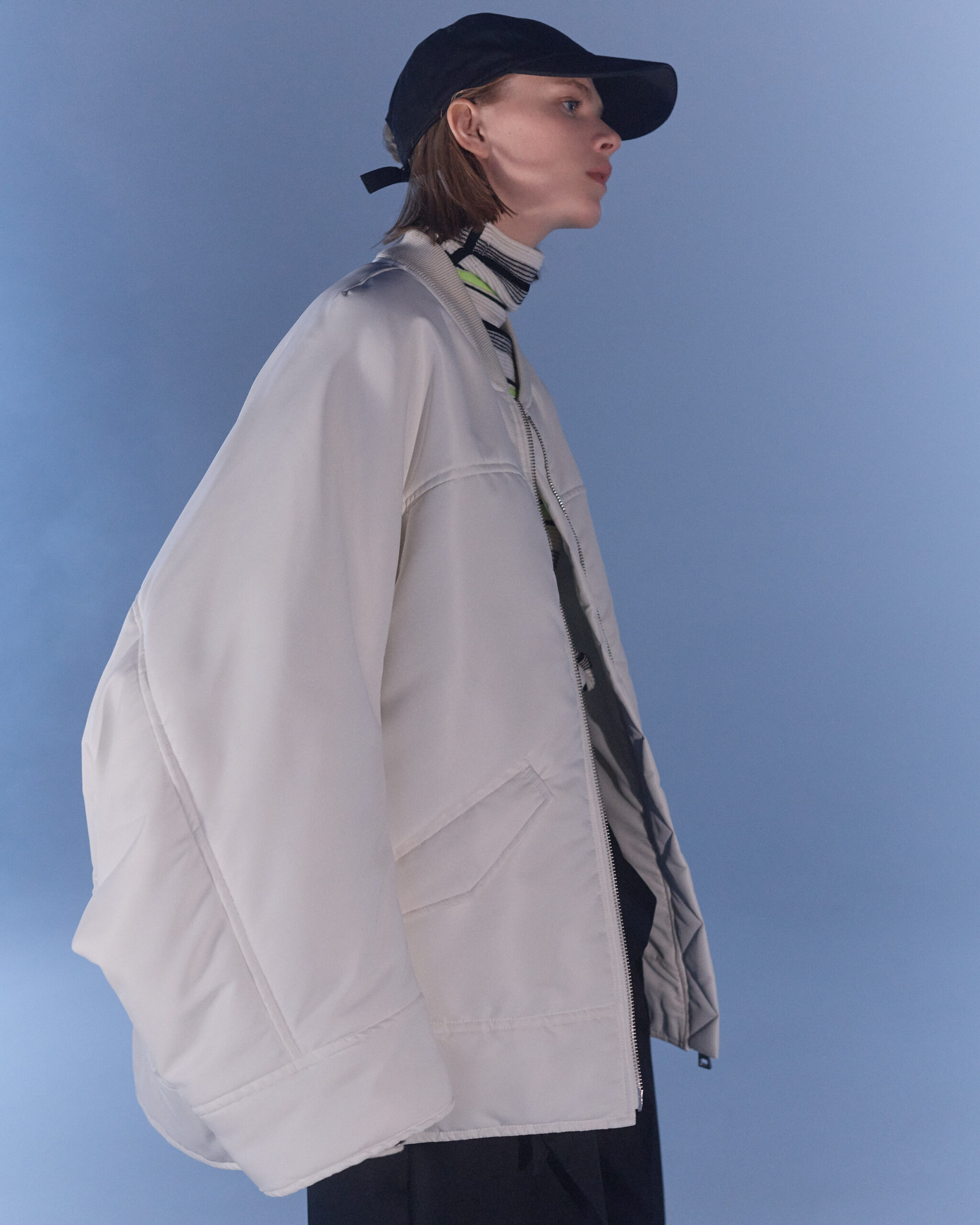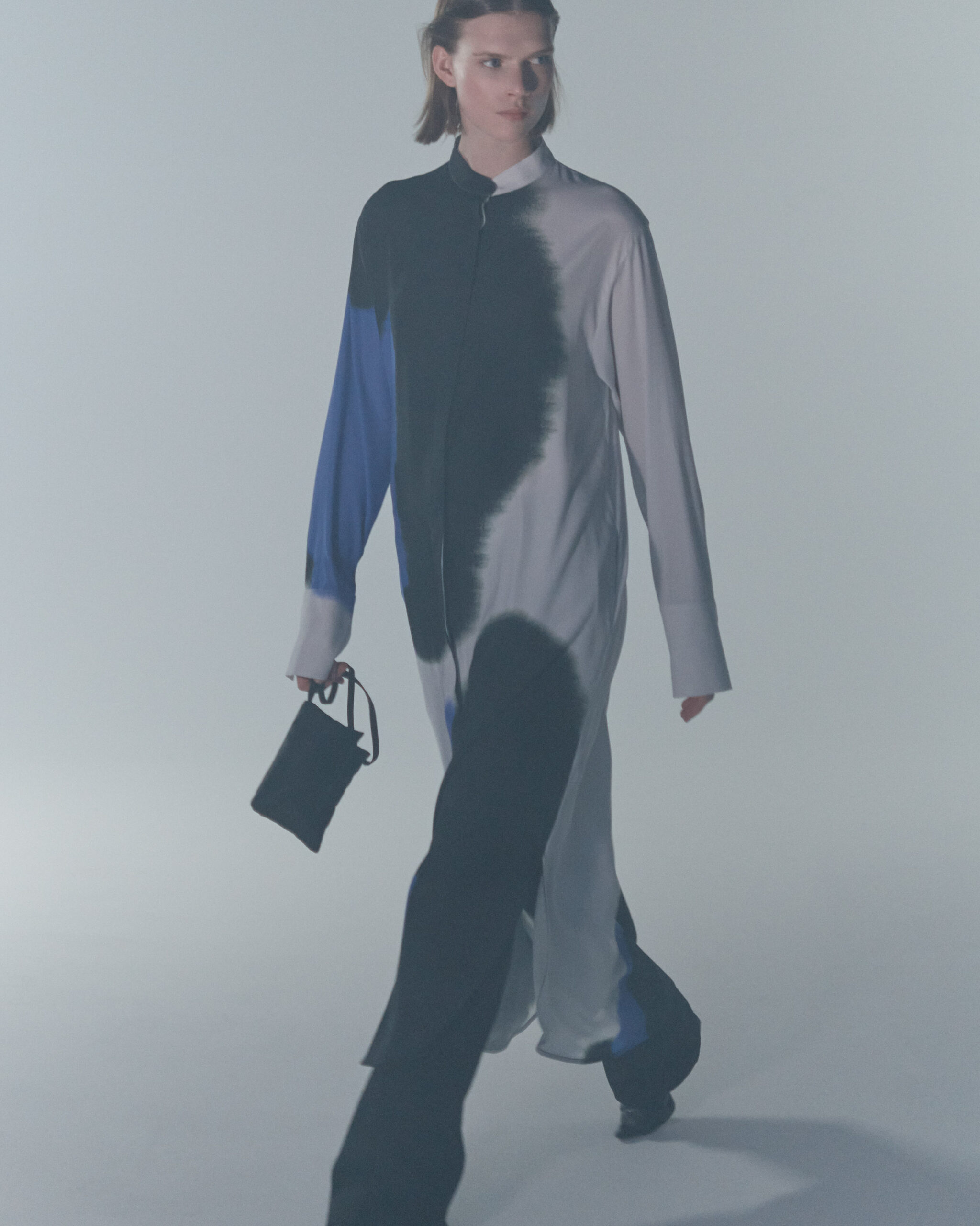 Fall Winter 2022 collection is all about embracing warmth. The feeling of resilience and serenity in a dormant state. The collection explores duality of fragility and strength. There is always beauty in vulnerability. A variation of uplifting colors surrounds the collection, soothing tones of lilac, turquoise, and light blue. Rich colors but always in the same mood of blue, teal, sage and strong accents of neon yellow and vivid spring green. Knitwear remains an integral focus. Various weights and shapes, from hand knits to intarsia knits to checked jacquards. Full look silhouettes in big chunky knits. Meticulous crotchet handwork, striking color blocked intarsia, grizzly textured boiled wool. Playful big fringes and wools with textured bouclé effect. Key takeaway is a luxurious 15 ply cashmere sweater, covetable and inexplicably soft, almost like wearing a cloud. Cocoon sleeves and oversized shapes give a sense of warmth comfort, shelter and mystery. This season’s outerwear is a constant pairing of contrast and proportions. Drawing on the visions of contemporary painter Marlene Dumas and symbolist Belgian painter Fernand Khnopff. Dumas’s infamous portraits, reflects an intimate but estranging atmosphere. Khnopff’s work of ethereal creatures rich in mystery and reverie remains an open source of interpretation for this season’s prints and textures.