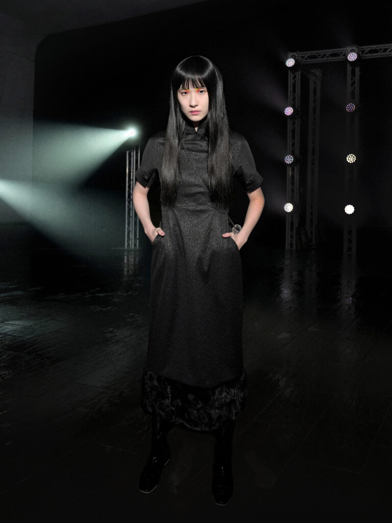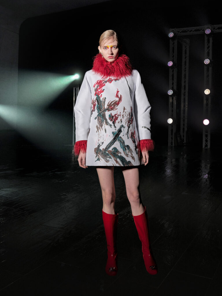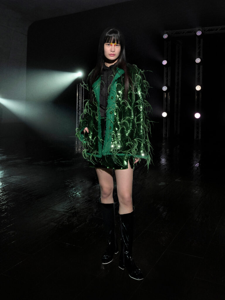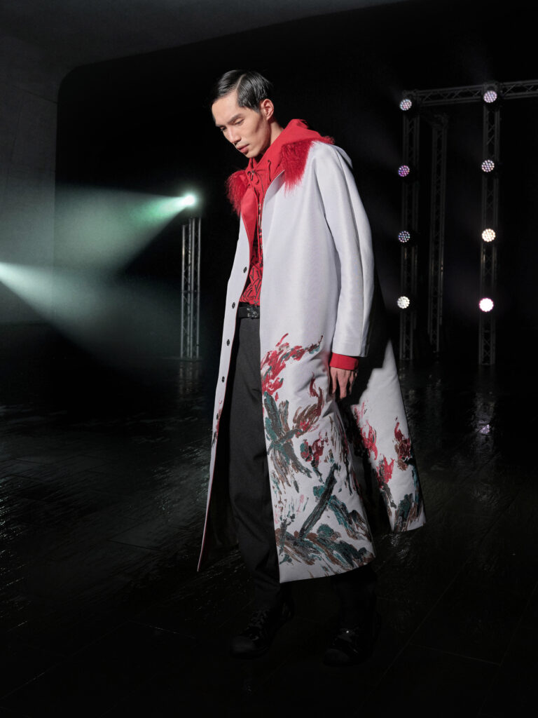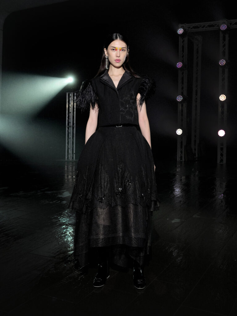 Que ce soit le passé ou la lumière, les deux sont conçus de manière abstraite dans nos esprits, mais ils sont ressentis profondément dans nos cœurs. Cette idée-là, nous la transposons de manière poétique dans les vêtements. Nous nous basons sur cet esprit d’esthétique orientale harmonieuse qui allie opposition et persévération pour exprimer concrètement des contours soignés, élancés, tout autant abondants que magnifiques, et ce, tout d’abord avec des hauts à col côtelé moulants et d’allure sportive selon la tendance de ces dernières années, accompagnés de pantalons longs et amples fuselés à franges. C’est par cet accord entre le décontracté et le gracieux que cette collection commence. Ensuite viennent des manteaux à capuche en jacquard à fil métallique ornés de motifs uniques de la maison, ainsi que des robes en ligne-H, constituant la torche qui s’enflamme au cœur de l’obscurité. Puis, avec des blousons rembourrés à losanges cousus avec du fil métallique, avec des blousons et des jupes courtes en cuir luisant et des hauts en tissu d’organza transparent ornés de motifs, une apparence fugitive et transitoire est par là même invoquée, symbolisant la lumière et le feu. Enfin, le noir et le blanc, en tant que couleurs principales, sont abondamment utilisés sur différents tissus, tels que de la mousseline sur laquelle des motifs de feux d’artifice sont spécialement imprimés en relief, du jacquard à fil métallique, de la mousseline et de la dentelle, auxquels s’ajoutent des paillettes en relief et des plumes, afin d’exprimer le tournoiement de la lumière dans la nuit noire. Au niveau de l’arrangement des couleurs, nous pouvons voir une abondance de rouges flamboyants, des robes fuselées à franges, de longs manteaux rouges brodés avec du rembourrage, des vestes à col montant brodées avec du satin rouge. Des enroulements de couleurs fluo délicates sont abondamment utilisés dans les longues jupes parapluie noires et blanches en mousseline, dans les longues jupes en tulle de soie brodée et dans les vestes en laine. Des vestes en laine de couleur violette claire, des manteaux roses en tricot avec motifs, des blousons et des jupes en cuir marron avec paillettes et manches en organza de couleur pêche font aussi jaillir une infinie vitalité saturée d’éclat. Enfin arrive un noir sans limite orné de paillettes de couleur verte paon, reflétant les rayons éclatants qui traversent l’obscurité. Les motifs utilisés dans cette collection prennent comme éléments d’inspiration la lumière du feu dans ses tous premiers instants, la fumée de poudre à canon, les étincelles de feu et les halos fluo, représentant ainsi d’une part leur propre splendeur et d’autre part ce qui est à l’origine même de cette splendeur, car les deux existent dans la même temporalité et ont la même importance.