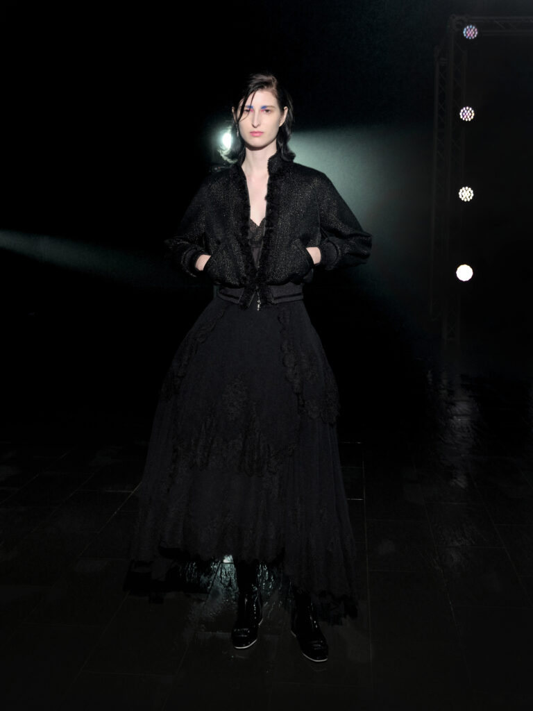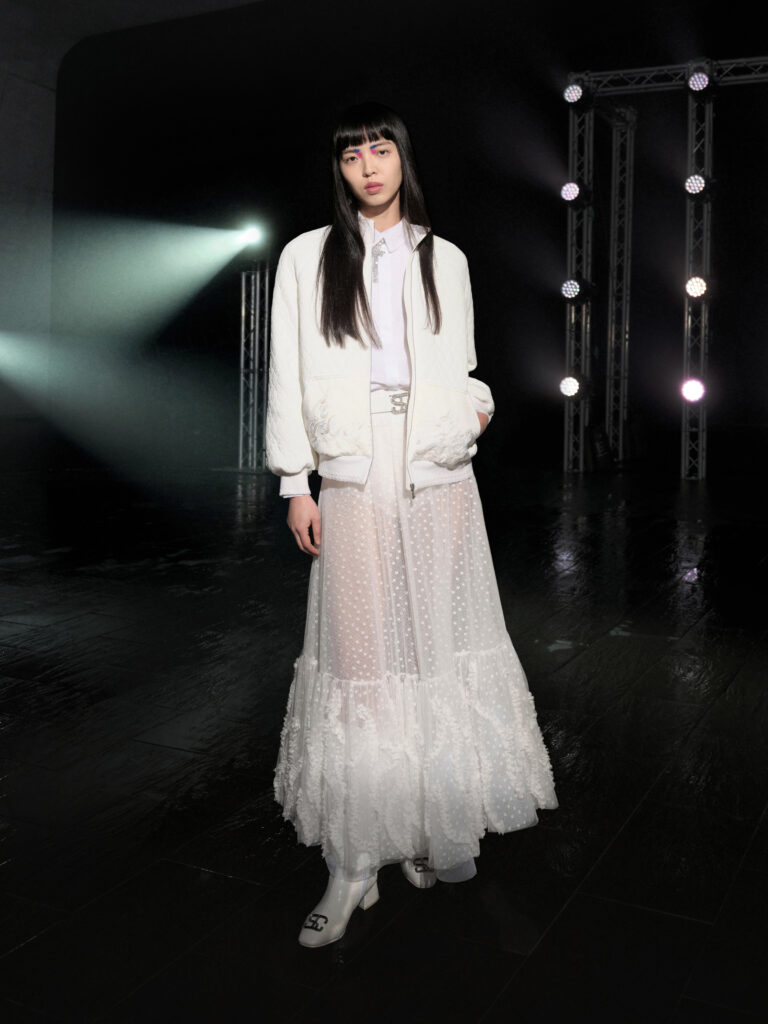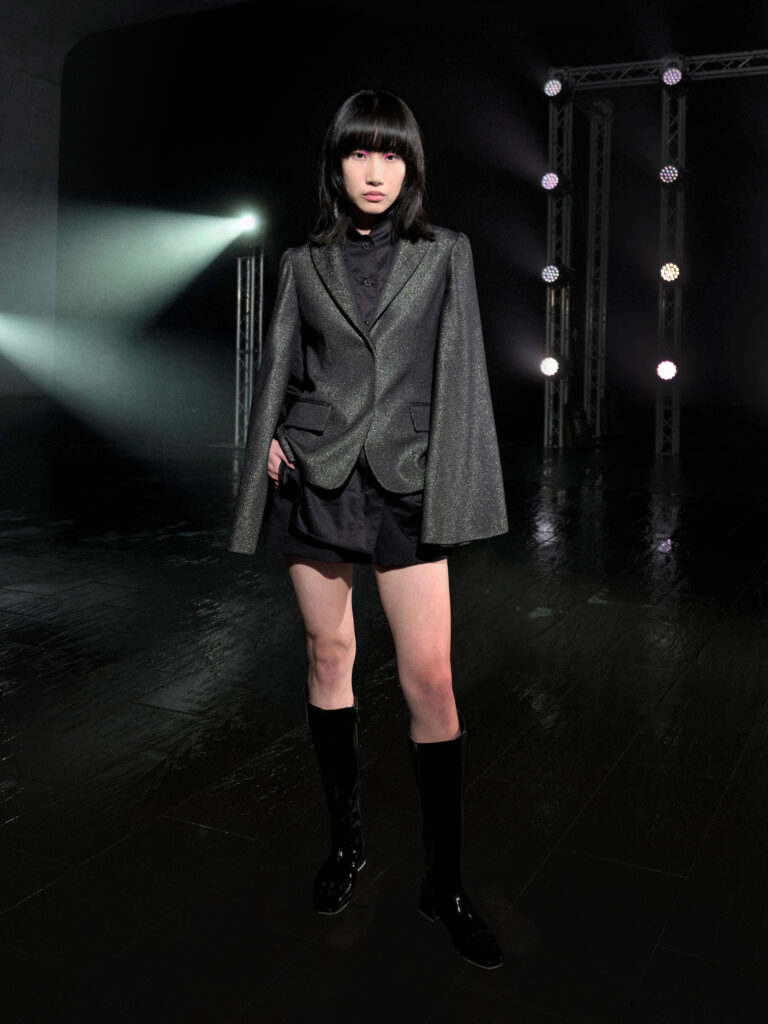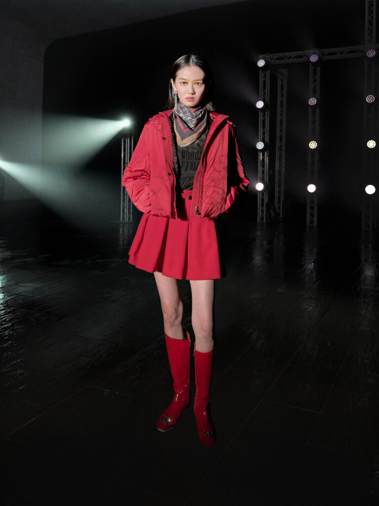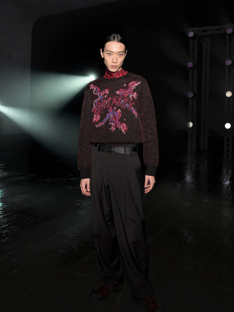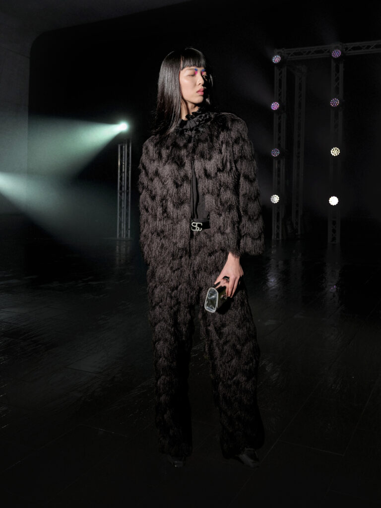 Que ce soit le passé ou la lumière, les deux sont conçus de manière abstraite dans nos esprits, mais ils sont ressentis profondément dans nos cœurs. Cette idée-là, nous la transposons de manière poétique dans les vêtements. Nous nous basons sur cet esprit d’esthétique orientale harmonieuse qui allie opposition et persévération pour exprimer concrètement des contours soignés, élancés, tout autant abondants que magnifiques, et ce, tout d’abord avec des hauts à col côtelé moulants et d’allure sportive selon la tendance de ces dernières années, accompagnés de pantalons longs et amples fuselés à franges. C’est par cet accord entre le décontracté et le gracieux que cette collection commence. Ensuite viennent des manteaux à capuche en jacquard à fil métallique ornés de motifs uniques de la maison, ainsi que des robes en ligne-H, constituant la torche qui s’enflamme au cœur de l’obscurité. Puis, avec des blousons rembourrés à losanges cousus avec du fil métallique, avec des blousons et des jupes courtes en cuir luisant et des hauts en tissu d’organza transparent ornés de motifs, une apparence fugitive et transitoire est par là même invoquée, symbolisant la lumière et le feu. Enfin, le noir et le blanc, en tant que couleurs principales, sont abondamment utilisés sur différents tissus, tels que de la mousseline sur laquelle des motifs de feux d’artifice sont spécialement imprimés en relief, du jacquard à fil métallique, de la mousseline et de la dentelle, auxquels s’ajoutent des paillettes en relief et des plumes, afin d’exprimer le tournoiement de la lumière dans la nuit noire. Au niveau de l’arrangement des couleurs, nous pouvons voir une abondance de rouges flamboyants, des robes fuselées à franges, de longs manteaux rouges brodés avec du rembourrage, des vestes à col montant brodées avec du satin rouge. Des enroulements de couleurs fluo délicates sont abondamment utilisés dans les longues jupes parapluie noires et blanches en mousseline, dans les longues jupes en tulle de soie brodée et dans les vestes en laine. Des vestes en laine de couleur violette claire, des manteaux roses en tricot avec motifs, des blousons et des jupes en cuir marron avec paillettes et manches en organza de couleur pêche font aussi jaillir une infinie vitalité saturée d’éclat. Enfin arrive un noir sans limite orné de paillettes de couleur verte paon, reflétant les rayons éclatants qui traversent l’obscurité. Les motifs utilisés dans cette collection prennent comme éléments d’inspiration la lumière du feu dans ses tous premiers instants, la fumée de poudre à canon, les étincelles de feu et les halos fluo, représentant ainsi d’une part leur propre splendeur et d’autre part ce qui est à l’origine même de cette splendeur, car les deux existent dans la même temporalité et ont la même importance.