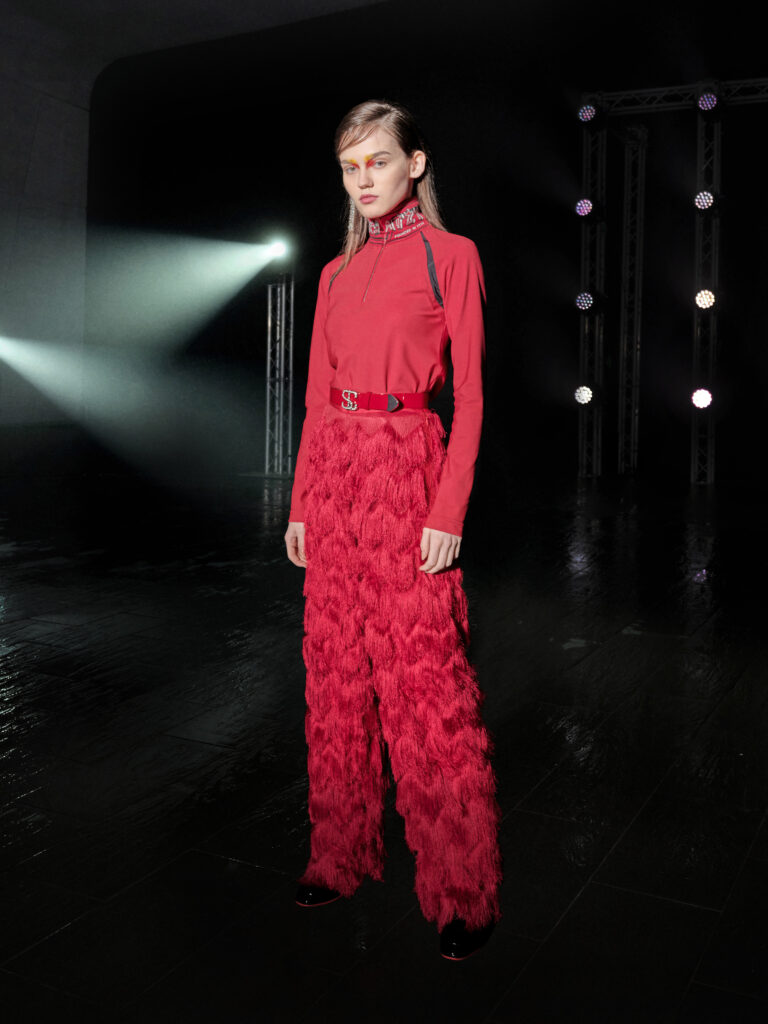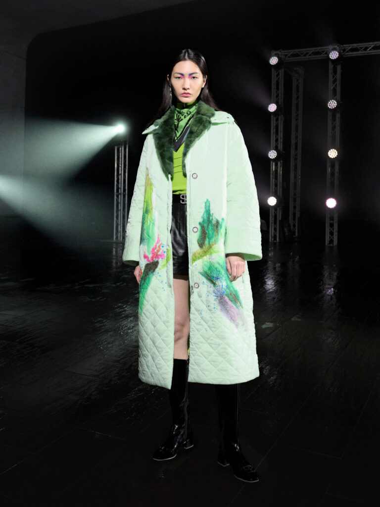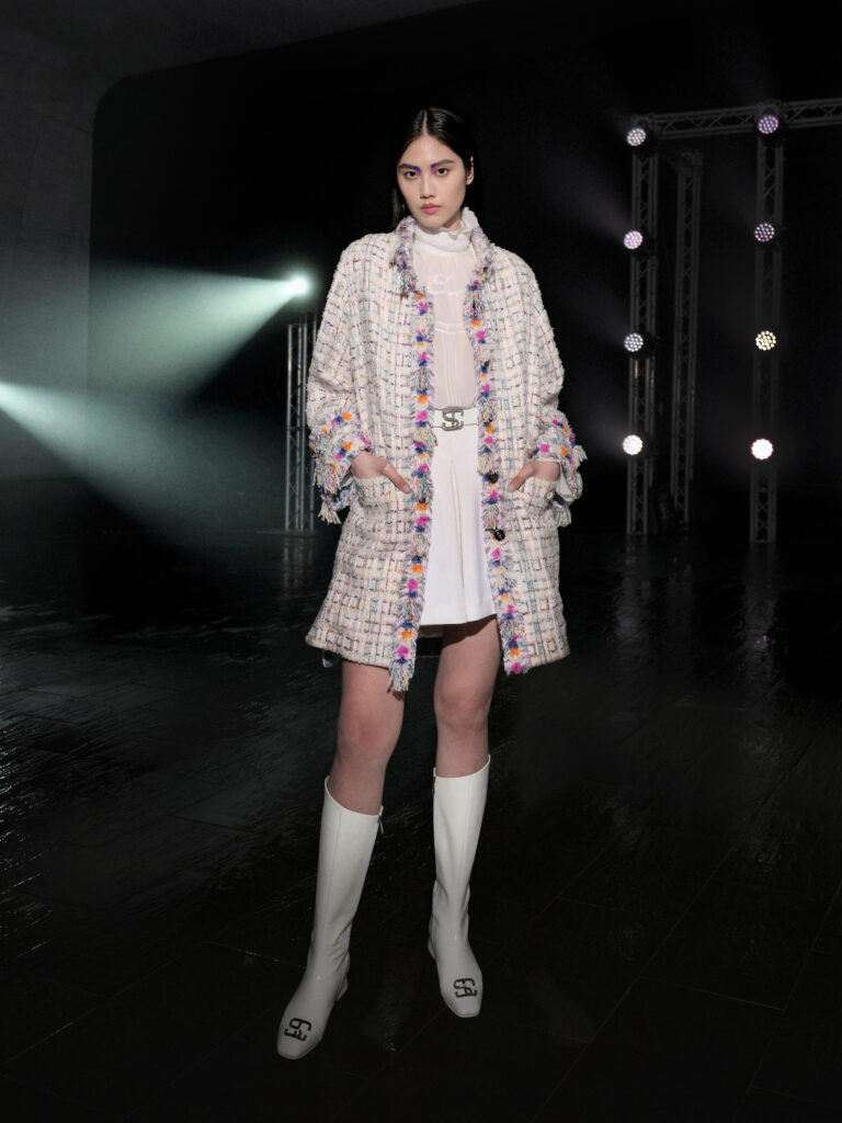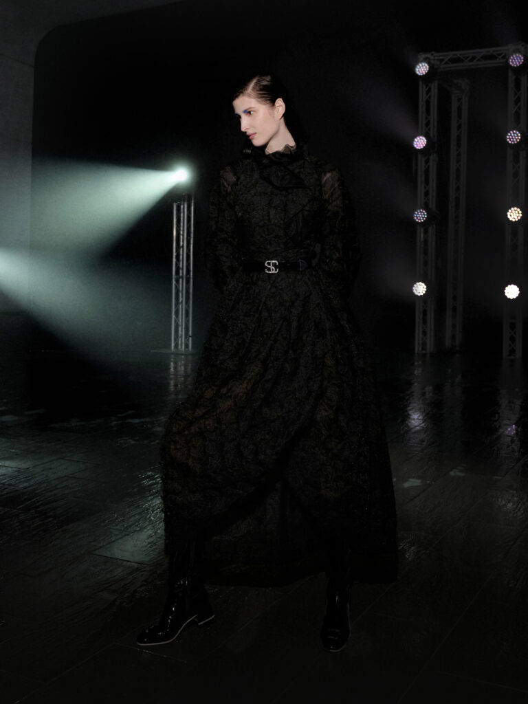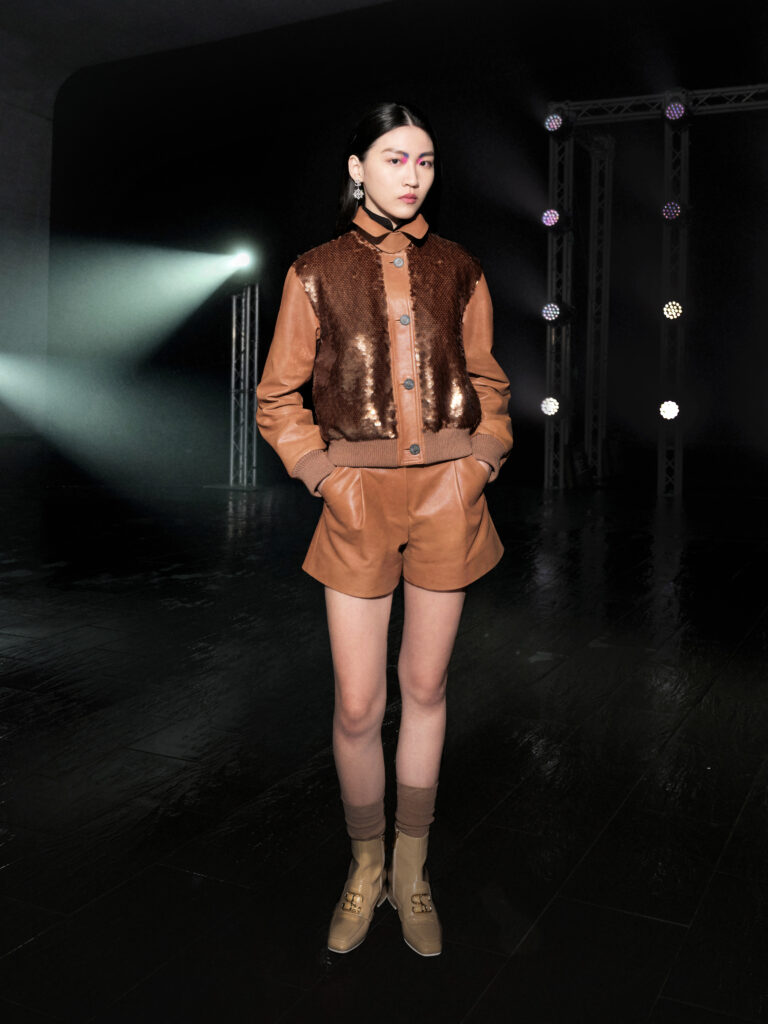 Que ce soit le passé ou la lumière, les deux sont conçus de manière abstraite dans nos esprits, mais ils sont ressentis profondément dans nos cœurs. Cette idée-là, nous la transposons de manière poétique dans les vêtements. Nous nous basons sur cet esprit d’esthétique orientale harmonieuse qui allie opposition et persévération pour exprimer concrètement des contours soignés, élancés, tout autant abondants que magnifiques, et ce, tout d’abord avec des hauts à col côtelé moulants et d’allure sportive selon la tendance de ces dernières années, accompagnés de pantalons longs et amples fuselés à franges. C’est par cet accord entre le décontracté et le gracieux que cette collection commence. Ensuite viennent des manteaux à capuche en jacquard à fil métallique ornés de motifs uniques de la maison, ainsi que des robes en ligne-H, constituant la torche qui s’enflamme au cœur de l’obscurité. Puis, avec des blousons rembourrés à losanges cousus avec du fil métallique, avec des blousons et des jupes courtes en cuir luisant et des hauts en tissu d’organza transparent ornés de motifs, une apparence fugitive et transitoire est par là même invoquée, symbolisant la lumière et le feu. Enfin, le noir et le blanc, en tant que couleurs principales, sont abondamment utilisés sur différents tissus, tels que de la mousseline sur laquelle des motifs de feux d’artifice sont spécialement imprimés en relief, du jacquard à fil métallique, de la mousseline et de la dentelle, auxquels s’ajoutent des paillettes en relief et des plumes, afin d’exprimer le tournoiement de la lumière dans la nuit noire. Au niveau de l’arrangement des couleurs, nous pouvons voir une abondance de rouges flamboyants, des robes fuselées à franges, de longs manteaux rouges brodés avec du rembourrage, des vestes à col montant brodées avec du satin rouge. Des enroulements de couleurs fluo délicates sont abondamment utilisés dans les longues jupes parapluie noires et blanches en mousseline, dans les longues jupes en tulle de soie brodée et dans les vestes en laine. Des vestes en laine de couleur violette claire, des manteaux roses en tricot avec motifs, des blousons et des jupes en cuir marron avec paillettes et manches en organza de couleur pêche font aussi jaillir une infinie vitalité saturée d’éclat. Enfin arrive un noir sans limite orné de paillettes de couleur verte paon, reflétant les rayons éclatants qui traversent l’obscurité. Les motifs utilisés dans cette collection prennent comme éléments d’inspiration la lumière du feu dans ses tous premiers instants, la fumée de poudre à canon, les étincelles de feu et les halos fluo, représentant ainsi d’une part leur propre splendeur et d’autre part ce qui est à l’origine même de cette splendeur, car les deux existent dans la même temporalité et ont la même importance.