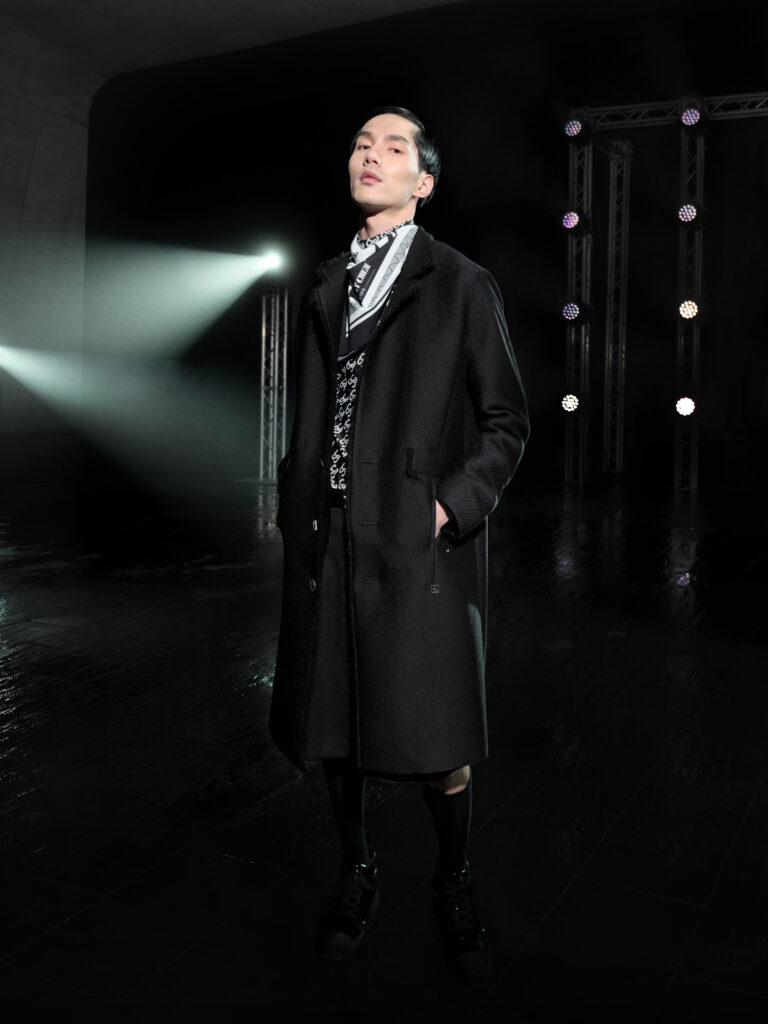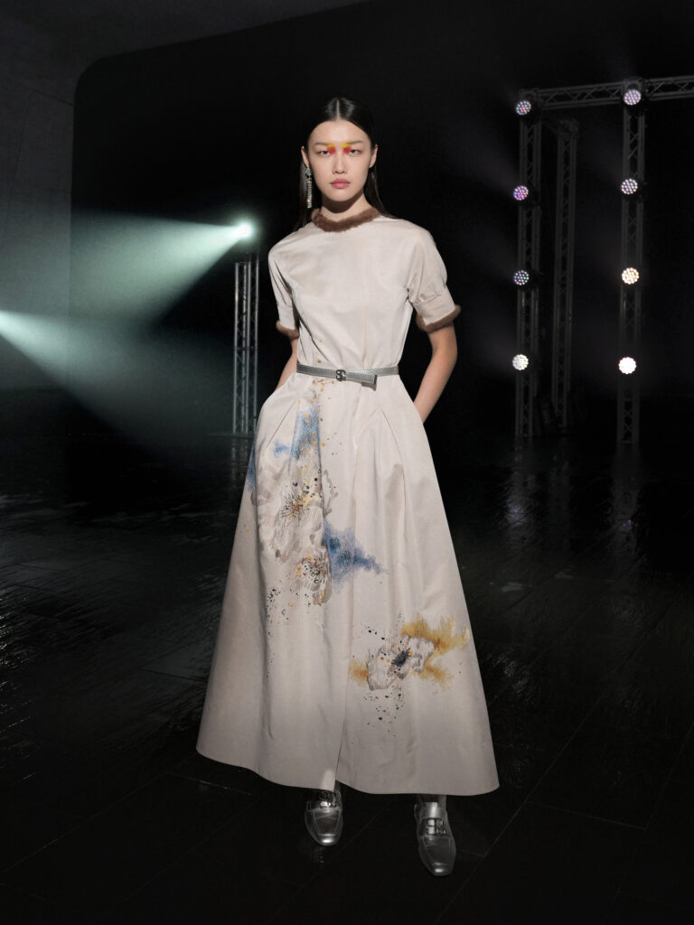 Le tournage du défilé prend comme source d’inspiration l’idée de création originelle. En partant de l’imagerie du feu et de la lumière, le défilé transmet dans nos cœurs un enthousiasme et une inspiration inépuisables et, qui plus est, apporte du symbolisme à travers le nom anglais de la collection, à savoir « GENESIS ». Dans un champ d’obscurité, un puissant faisceau de lumière rayonne à travers une fente, ouvrant un monde encore plus vaste que ce que les yeux peuvent apercevoir. Dans cette scène, de minuscules particules de poussières flottent et le son du craquement d’allumette se produit, nous ne pouvons pas nous empêcher de fixer notre attention sur cette allumette qui s’enflamme. C’est ainsi que commence ce spectacle entremêlant lumières et vêtements.
