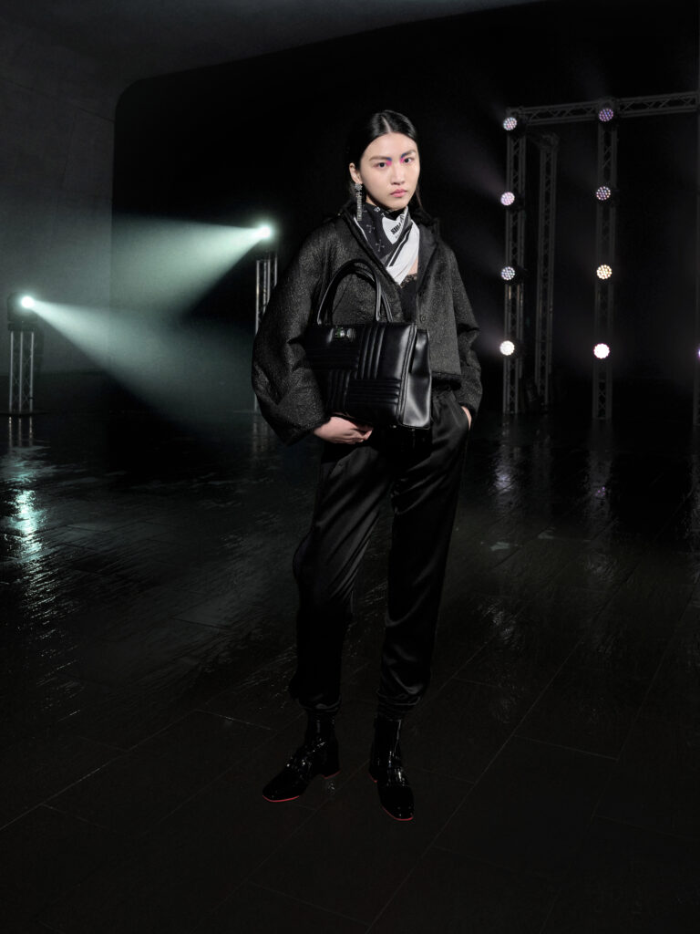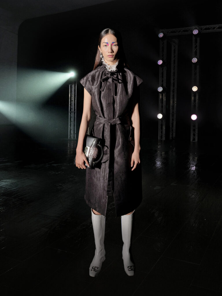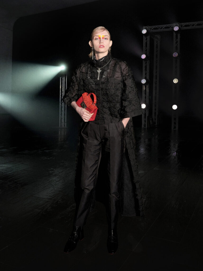 La lumière, qui est le plus rapide des voyageurs, traduit cette inspiration à travers différents assortiments. Plusieurs vêtements pour homme utilisent des hauts à col roulé moulants et décontractés avec des impressions accompagnés d’éléments plus formels tels qu’une chemise et une veste, donnant par là même une nouvelle image orientale. De splendides accessoires en laine d’un rouge flamboyant sont également ajoutés aux longs manteaux pour homme à col montant, redéfinissant ainsi la notion de luxe oriental. De plus, cette collection utilise beaucoup de foulards avec des motifs imprimés, devenant le nouvel attirail clé utilisé en commun par les femmes et les hommes, et qui, accompagnant les vestes en cuir et les jupes courtes, font penser au look rétro des années 80. Les robes à paniers, si représentatives de l’époque rococo, avec leurs cerceaux horizontaux, permettent de dessiner la quintessence des contours de la lumière, faisant ainsi la déclaration d’une puissance féminine. Les accessoires s’inspirent de l’idée selon laquelle la lumière se déploie de manière équitable. Les boucles d’oreilles en cristal de forme radiale symétrique, les colliers, telles des cascades, à franges scintillantes, nous emmènent sur le chemin d’un avenir radieux. Les chaussures, quant à elles, héritent du concept de floraison, les bottines et les bottes sont toutes conçues avec un cuir verni reflétant la lumière, les ornant ainsi discrètement de lumière. De même, les sacs, avec leurs poignées classiques de couleur jade et les mini sacoches sont un trait distinctif de cette collection et, en accompagnant les vêtements, permettent d’afficher un style moderne neutre et soigné.