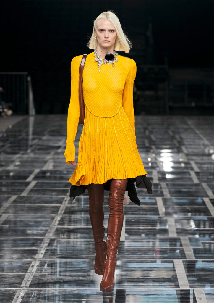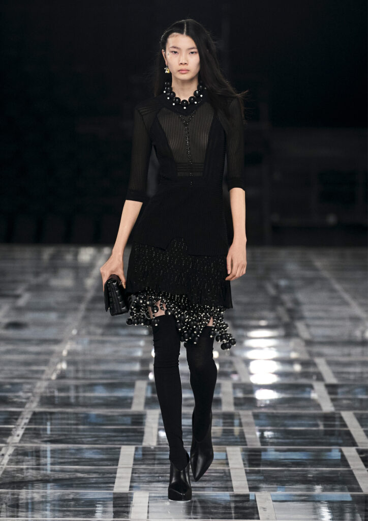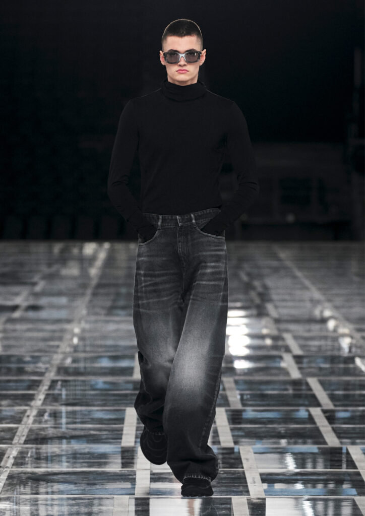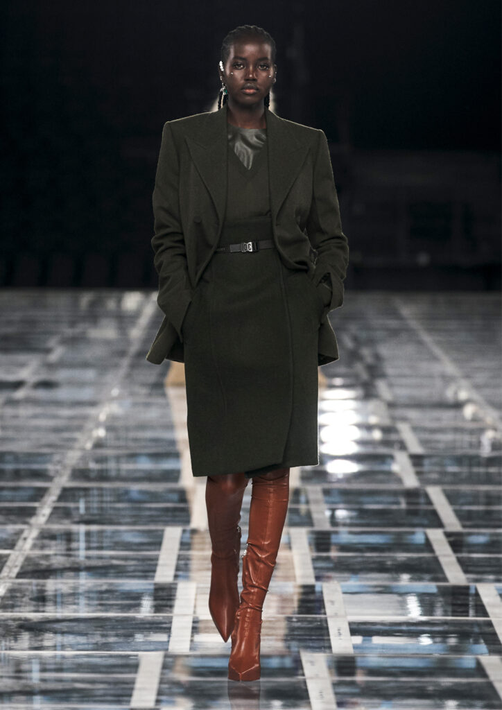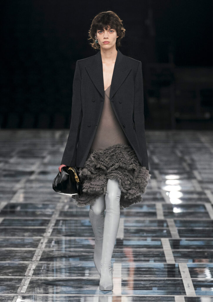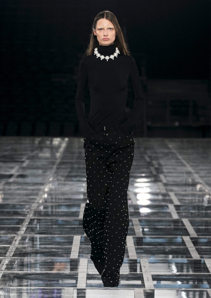 Sharp, tailored femininity takes pride of place, in a taut silhouette that’s both formal and informal, pure and audacious. Nothing is overly precious, even when the materials are: worn denim welcomes spectacular sequins and pearls in homage to Hubert de Givenchy’s sense of practical ornamentality. Ruffled wool dresses fuse with sport through spectacular coloring and netting that elevate the everyday and bring ease to evening. It adapts to a graceful yet grounded amazon, its sweeping drama enhanced by flashes of bare skin.