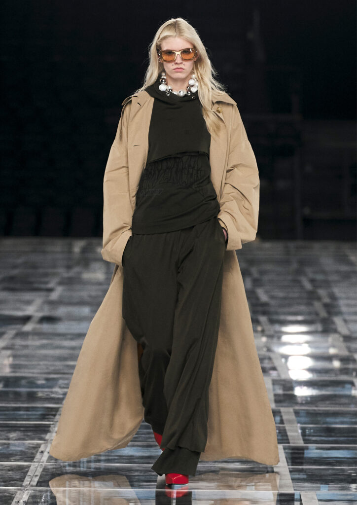 Taking cues from outerwear — and encompassing a practical palette of rich browns, greens, greys and blacks — the designer’s color sensibility is unconventionally applied to fluid, tailored silhouettes and transparent, delicately hand embroidered and disheveled ruffled dresses alike. Here, Givenchy classicism and radicalism are united in a play on layered volumes and textures. The day-to-day familiarity of washed jersey is explored with a new, intricate, layered rigor where an experiment in graphics and 4D print embroidery is brought to the fore. At the same time, this attitude is contrasted with classical tailoring, structured single- and double-breasted forms are explored, yet still with ease and lightness in wools and flannels. Wide tailored trousers and voluminous overcoats work in contrast. While denim is worn, experimented with and treated with equal weight to the duchesse satins that are also found in the collection. All is united by silhouette, either long line and sweeping or short and taut yet still with cascading qualities in intricate ruffles, hand-smocking and pleats, each emphasizing movement, ease and a place in the real life of the wearer.