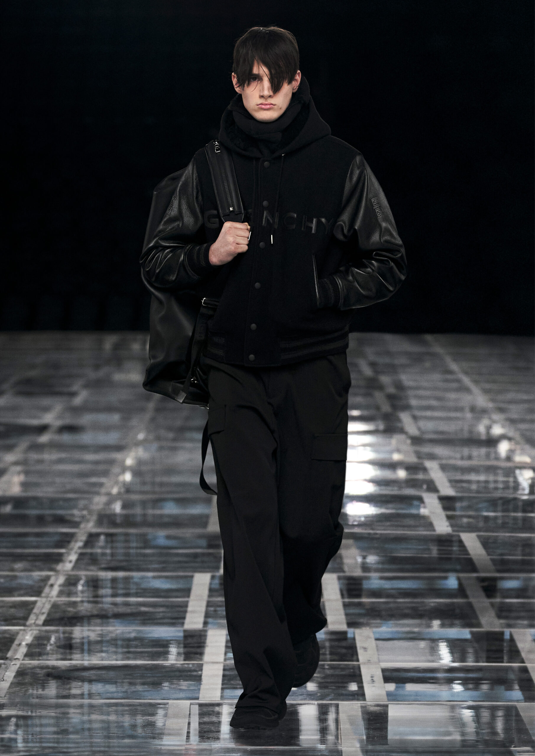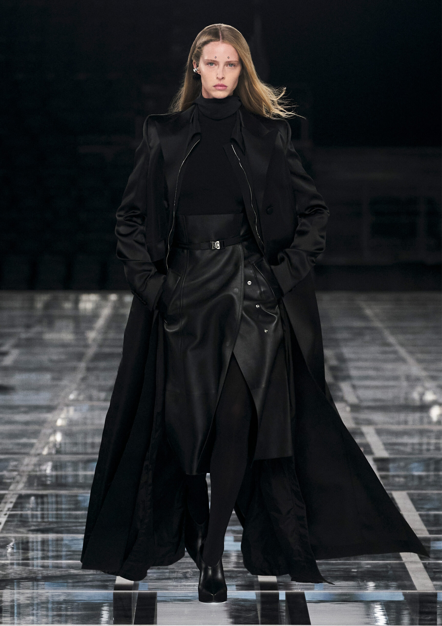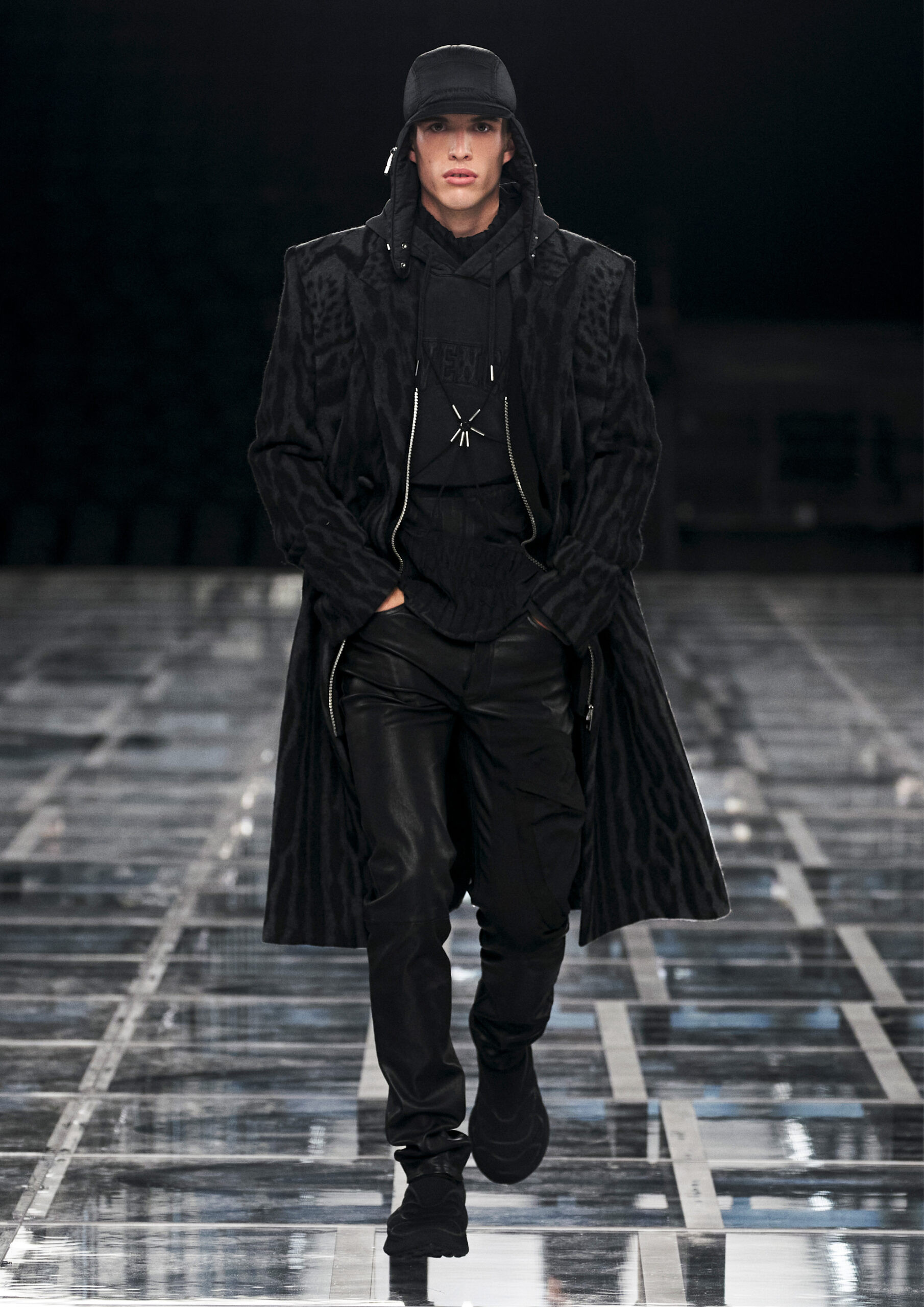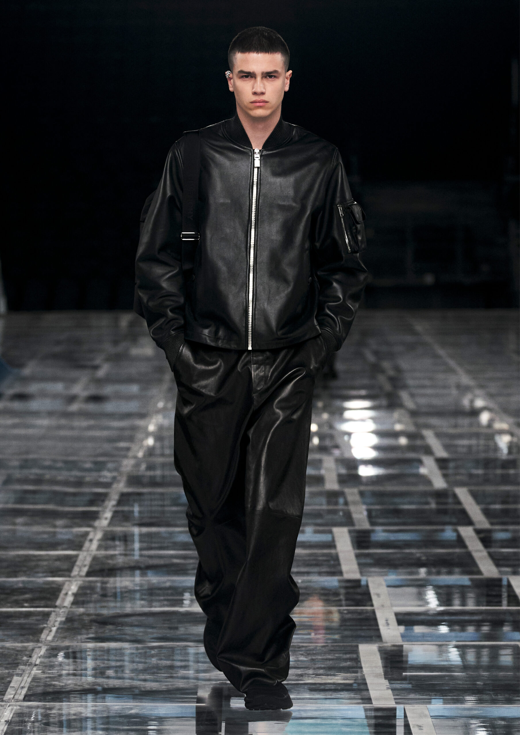 Leather accessories give a guiding structure to the collection, whether used in luxurious utilitarian outerwear, trousers or skirts or as a sleek second skin under clothing, such as in the signature Givenchy stretch boots, which, quite literally, elevate the silhouette and the wearer. The new bags embrace a softer and more yielding construction, whether this is the New Hobo with the signature Lock or the latest iterations of the Kenny and the softly quilted 4G bags that also experiment with new proportions. On the Kenny bag, extraordinary finishes elevate the everyday in a different way.