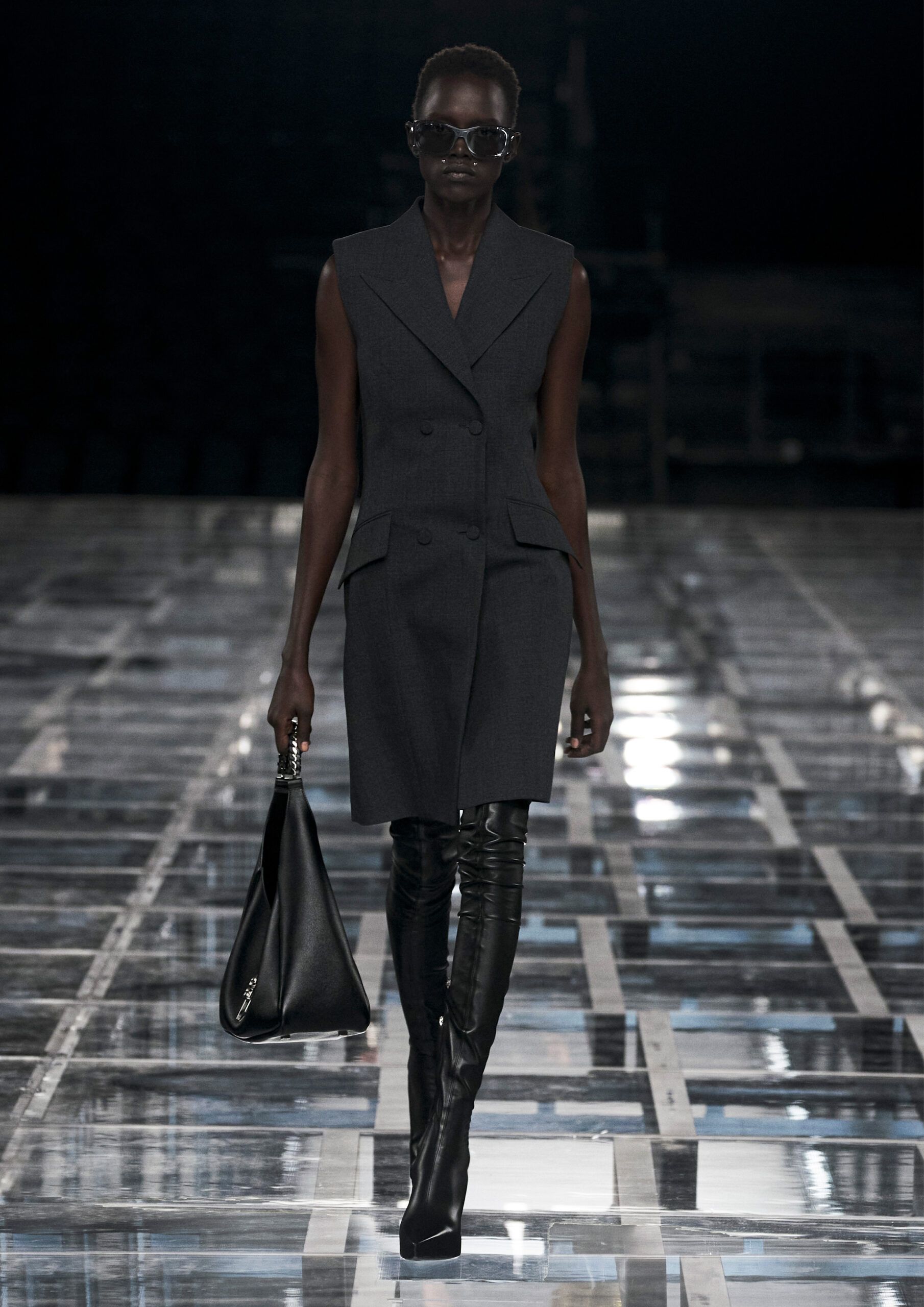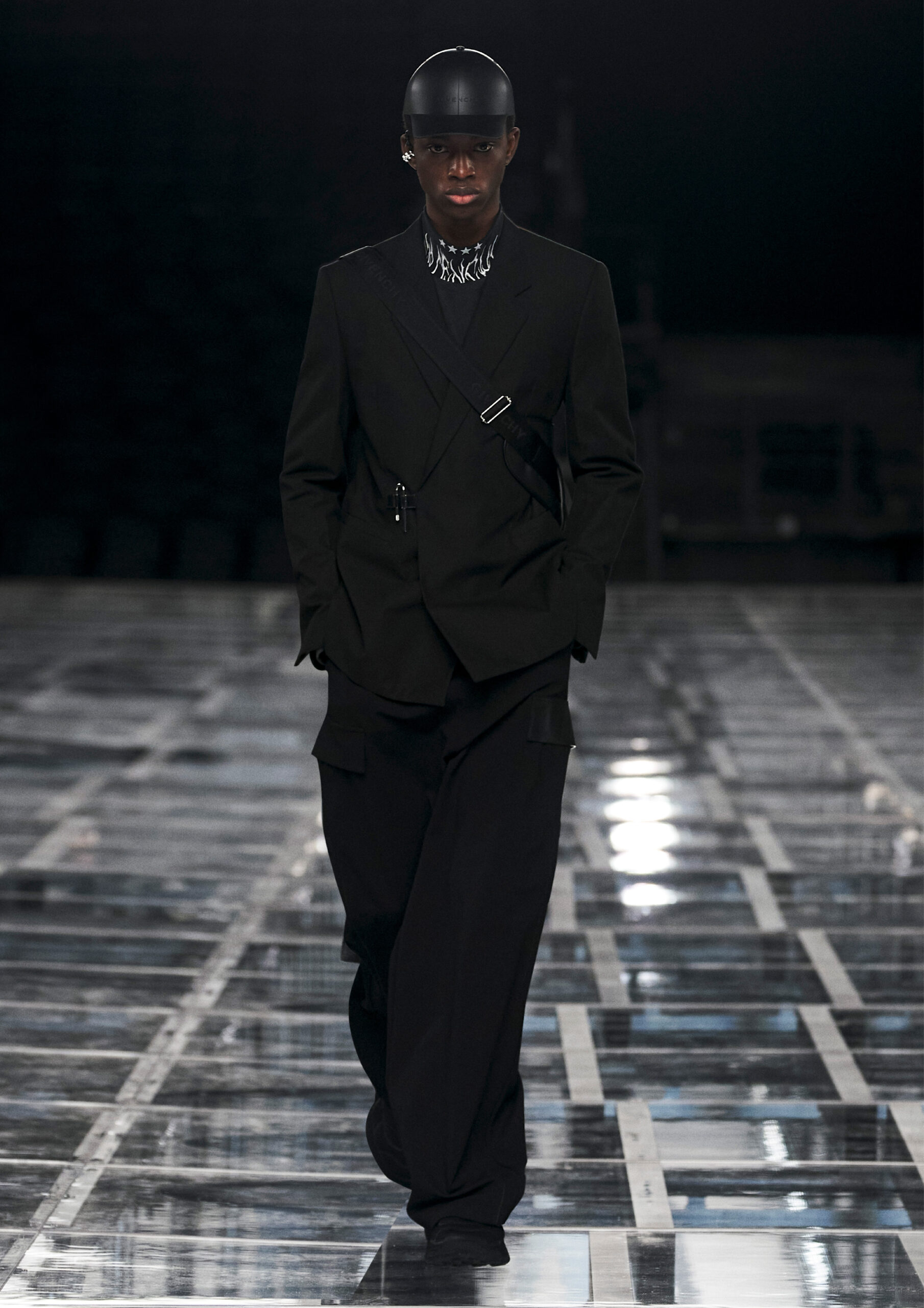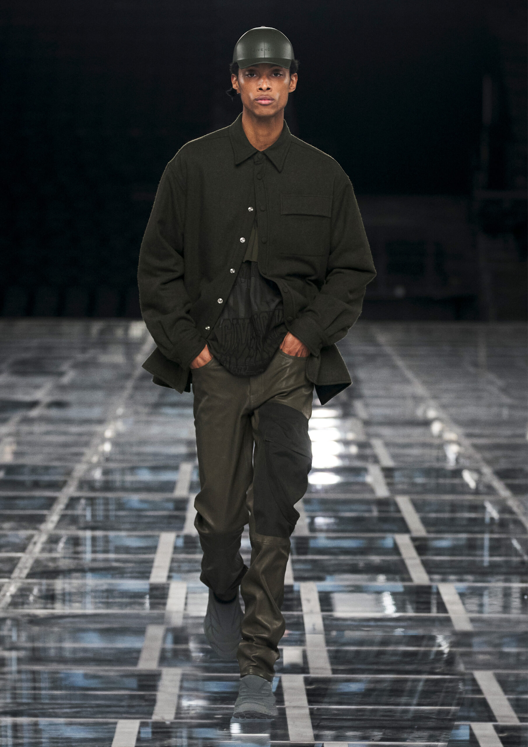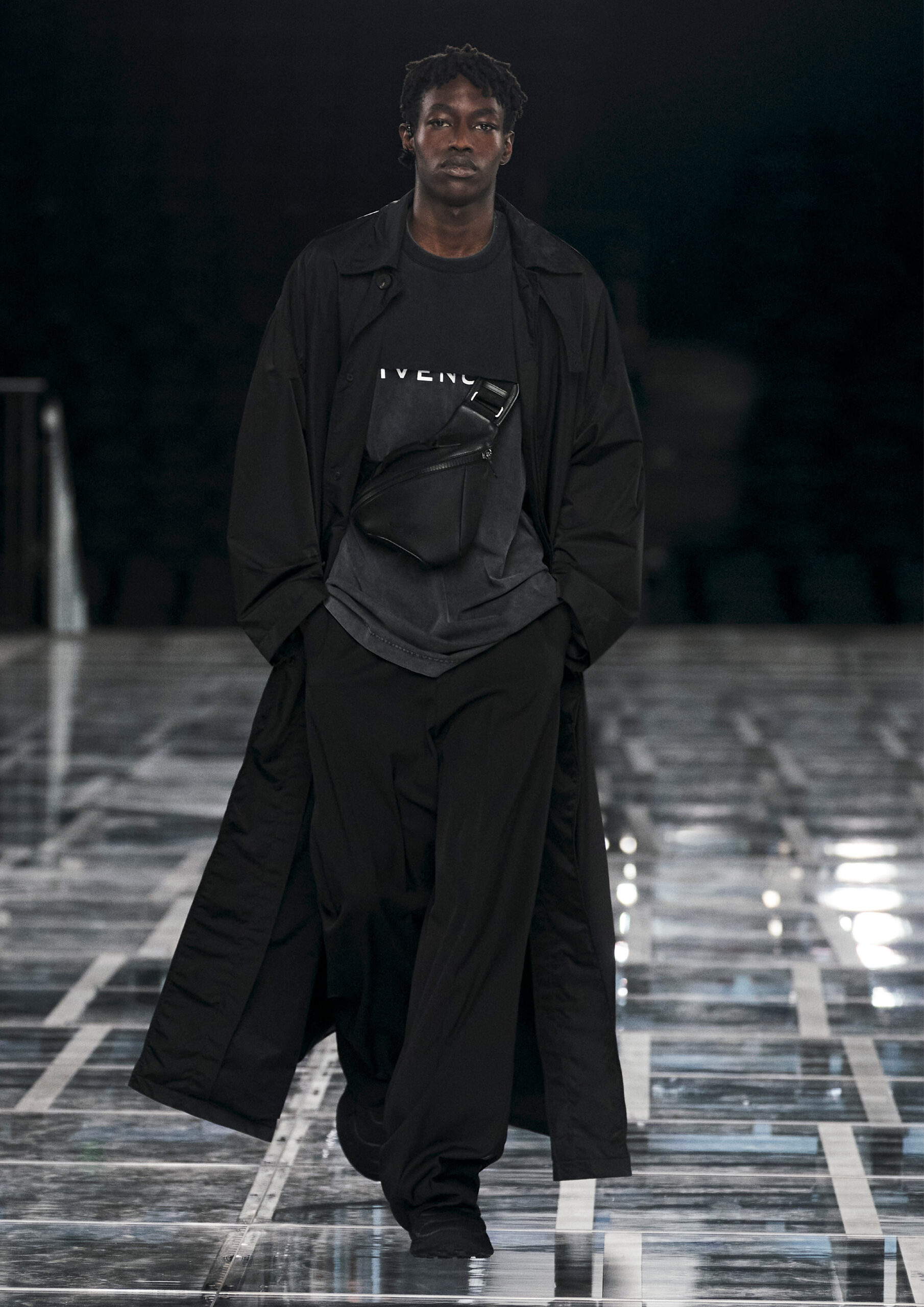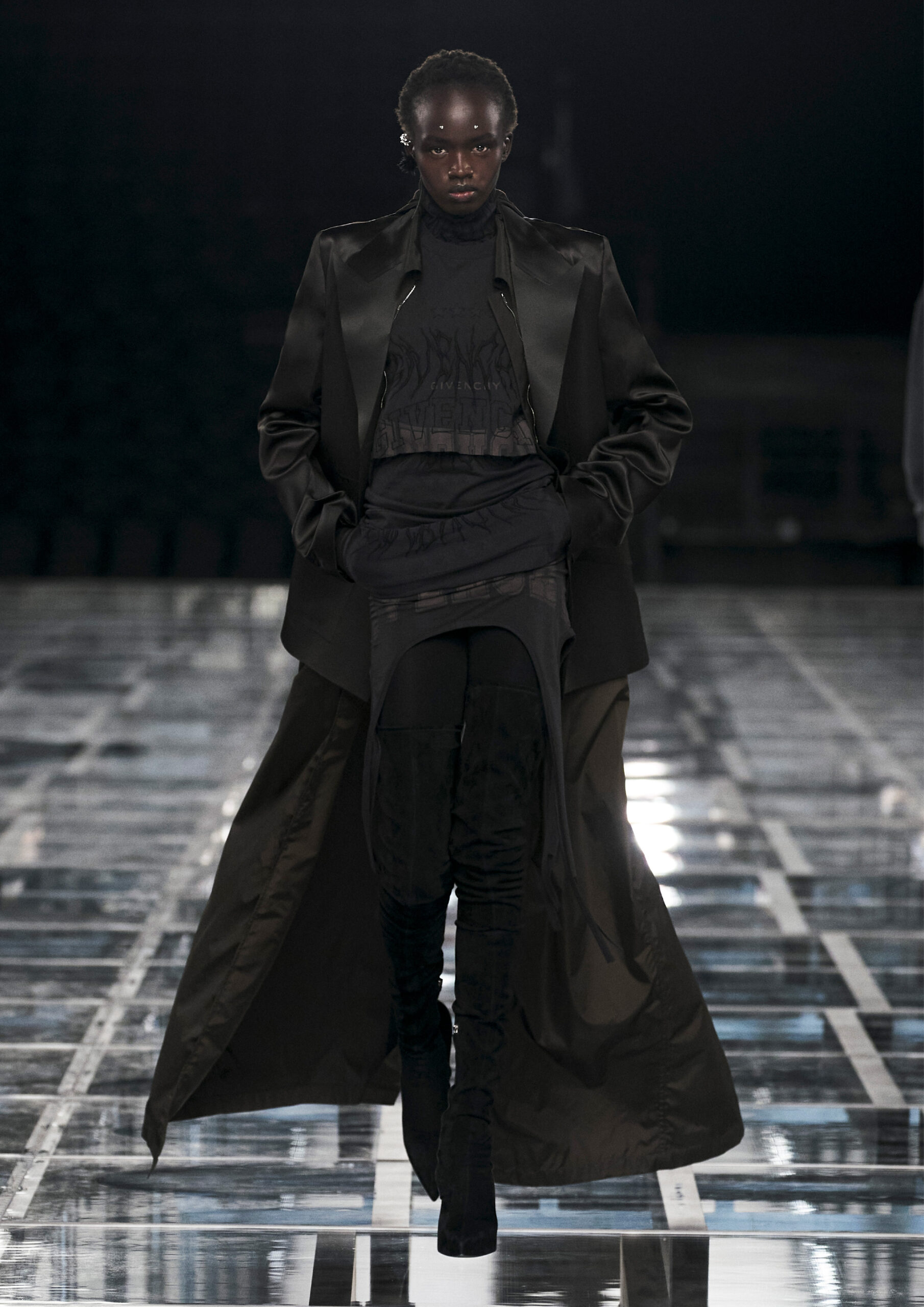 Leather accessories give a guiding structure to the collection, whether used in luxurious utilitarian outerwear, trousers or skirts or as a sleek second skin under clothing, such as in the signature Givenchy stretch boots, which, quite literally, elevate the silhouette and the wearer. The new bags embrace a softer and more yielding construction, whether this is the New Hobo with the signature Lock or the latest iterations of the Kenny and the softly quilted 4G bags that also experiment with new proportions. On the Kenny bag, extraordinary finishes elevate the everyday in a different way.