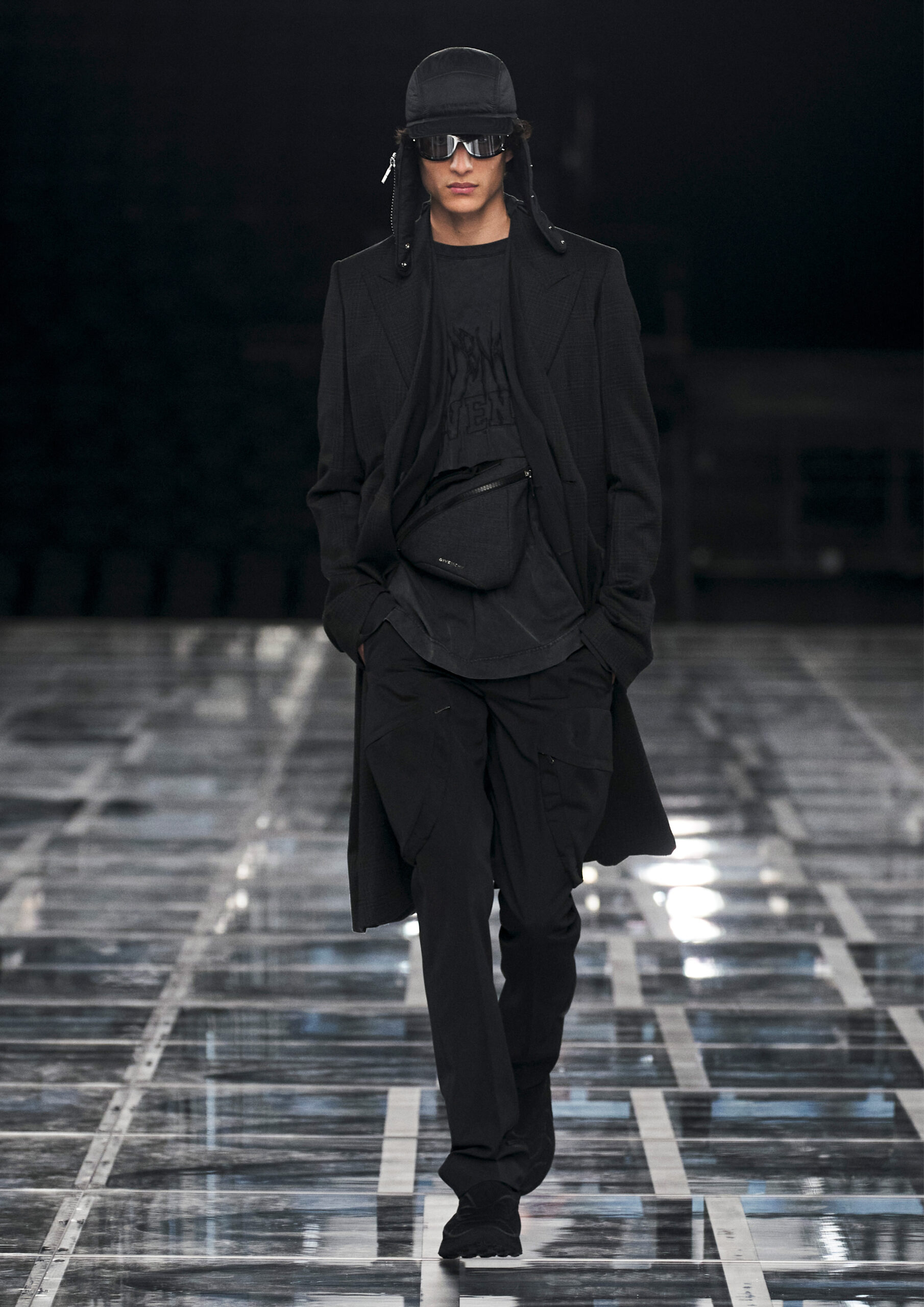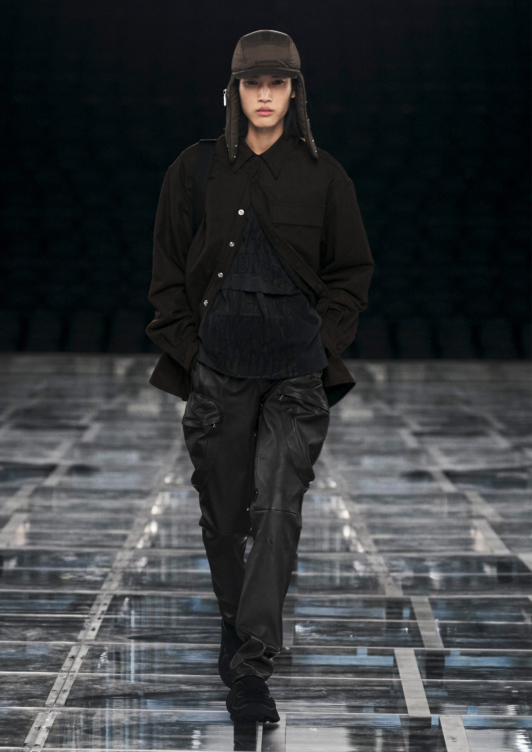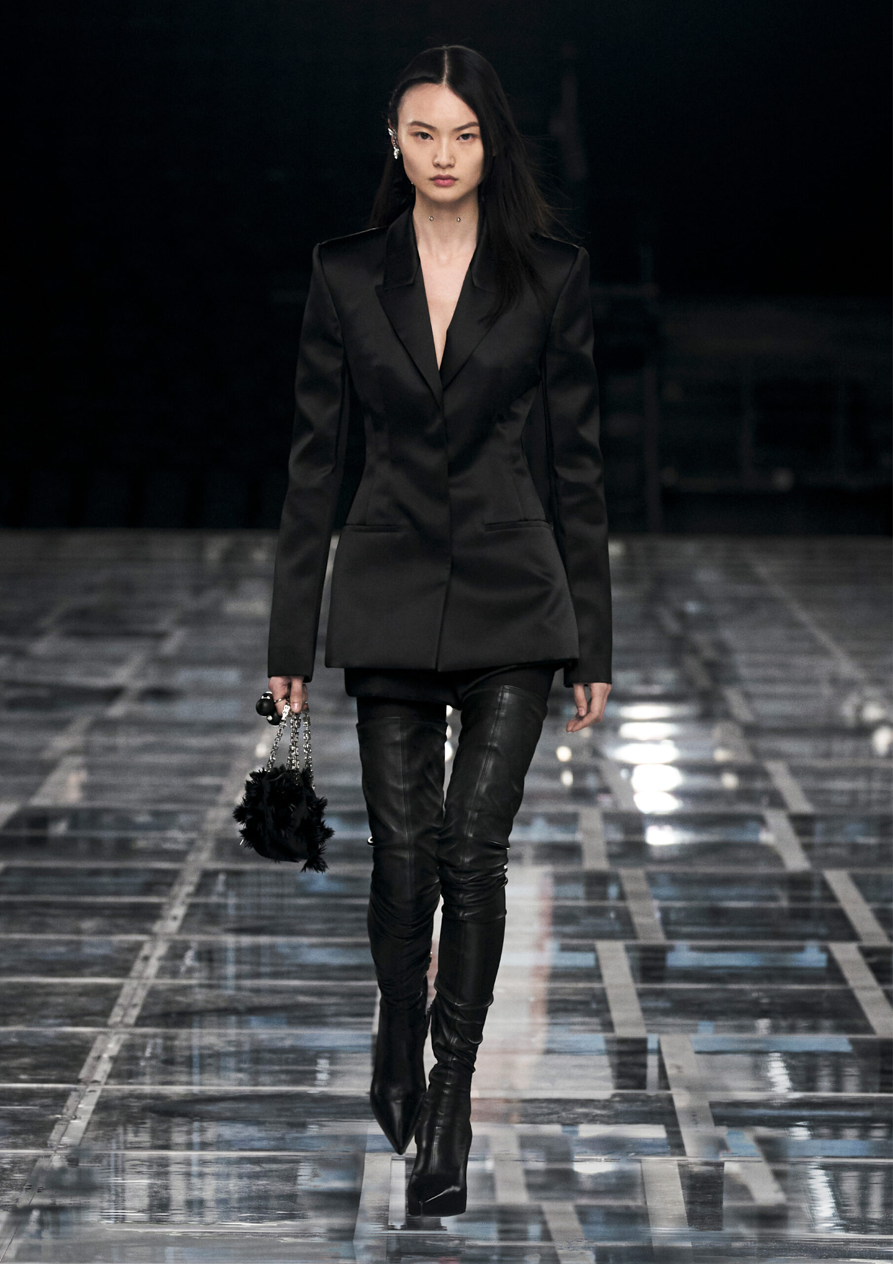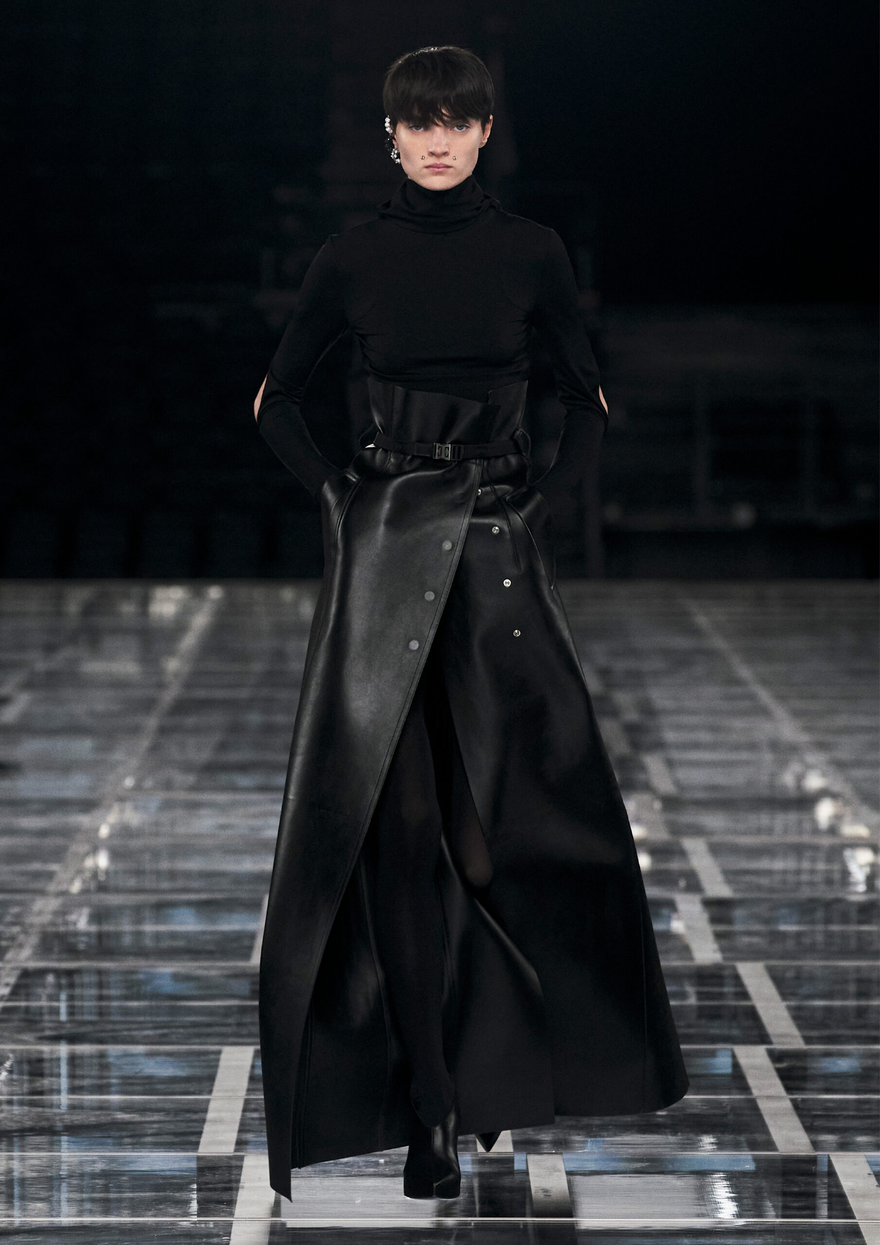 Leather accessories give a guiding structure to the collection, whether used in luxurious utilitarian outerwear, trousers or skirts or as a sleek second skin under clothing, such as in the signature Givenchy stretch boots, which, quite literally, elevate the silhouette and the wearer. The new bags embrace a softer and more yielding construction, whether this is the New Hobo with the signature Lock or the latest iterations of the Kenny and the softly quilted 4G bags that also experiment with new proportions. On the Kenny bag, extraordinary finishes elevate the everyday in a different way.