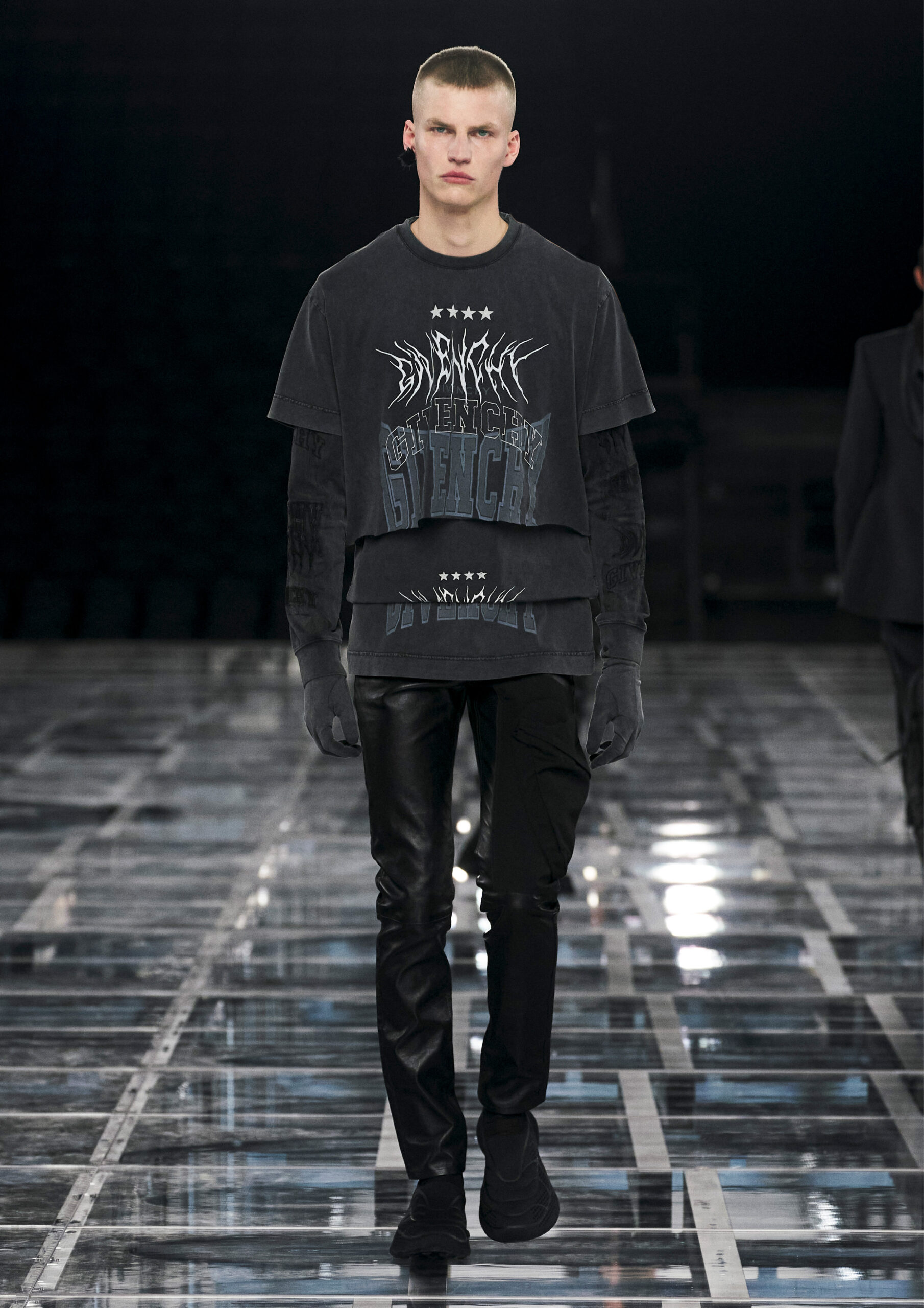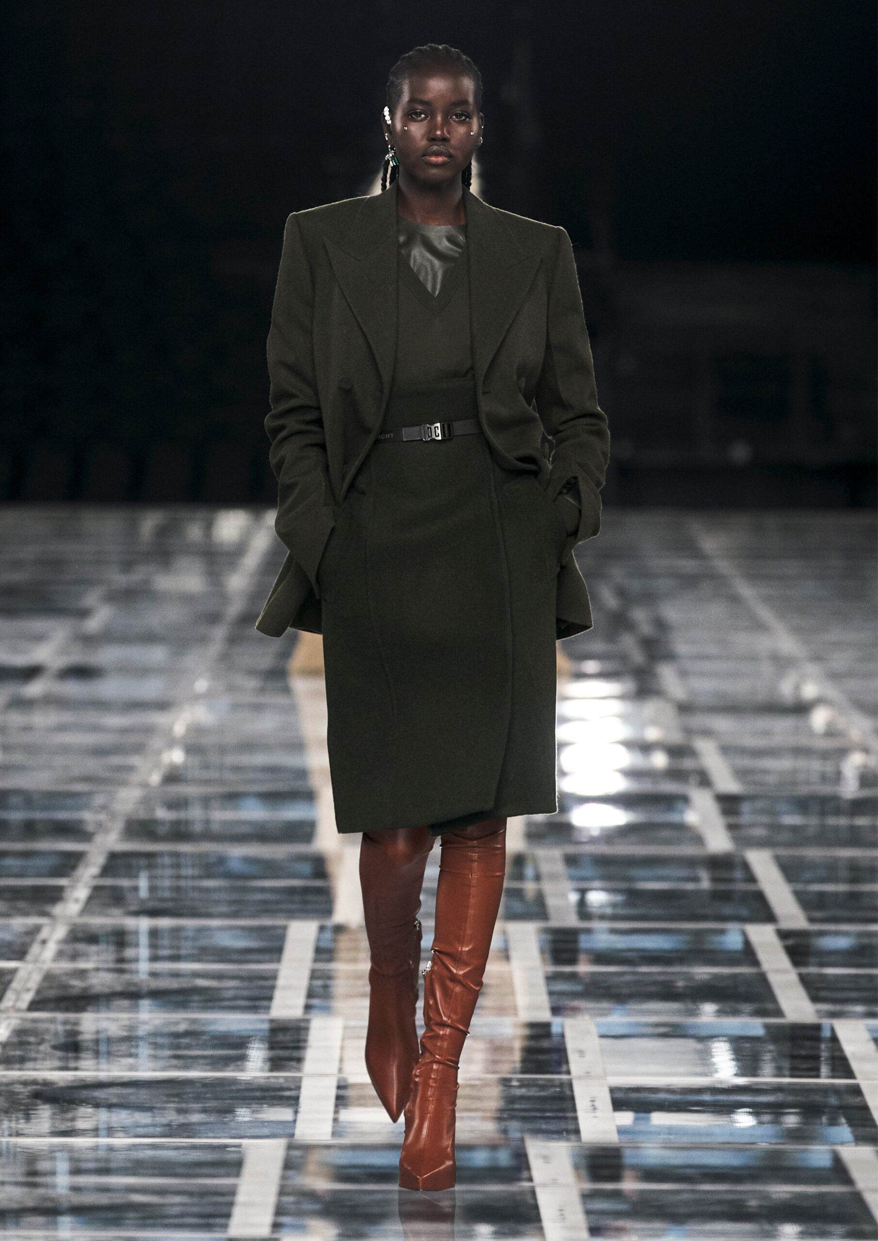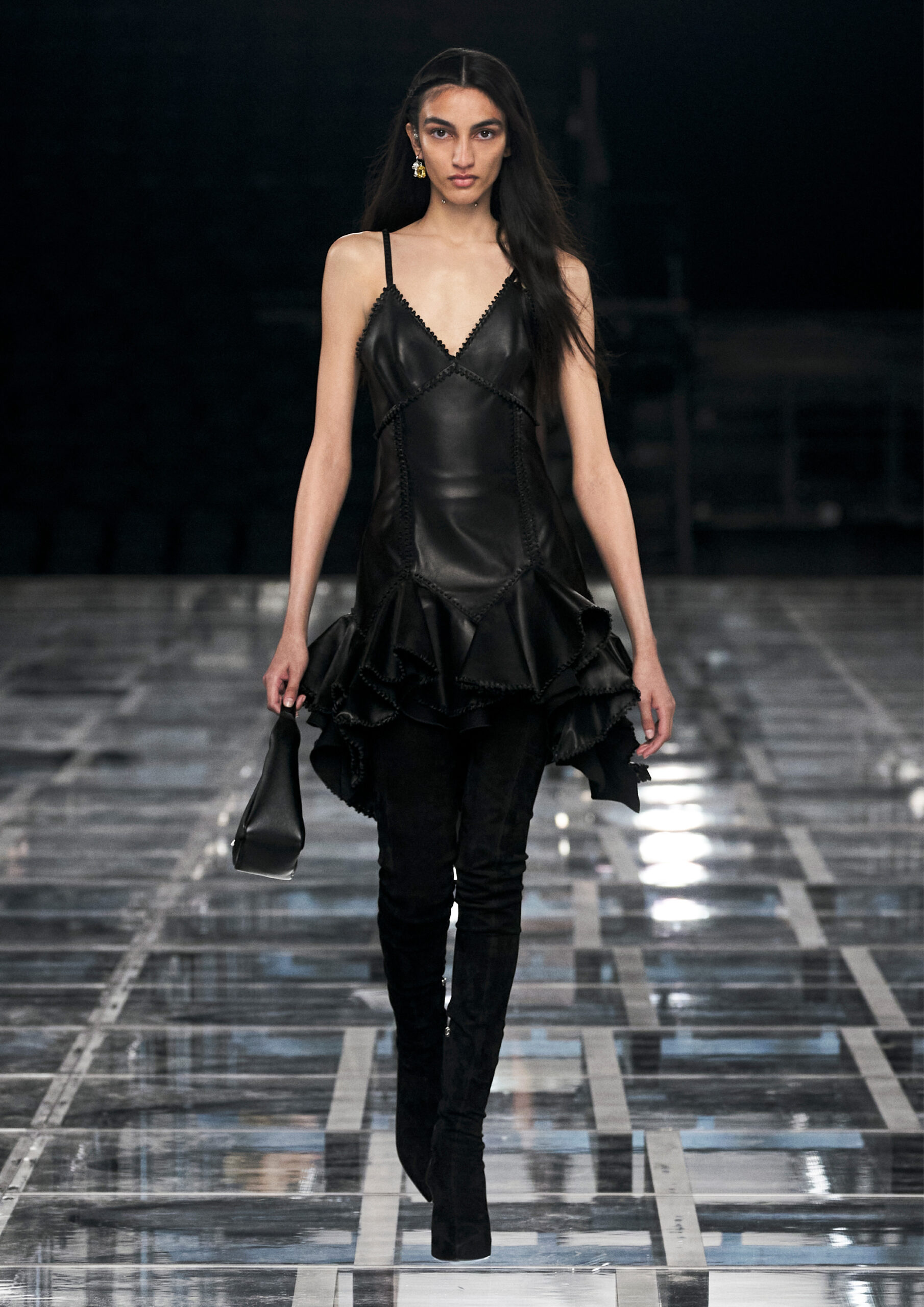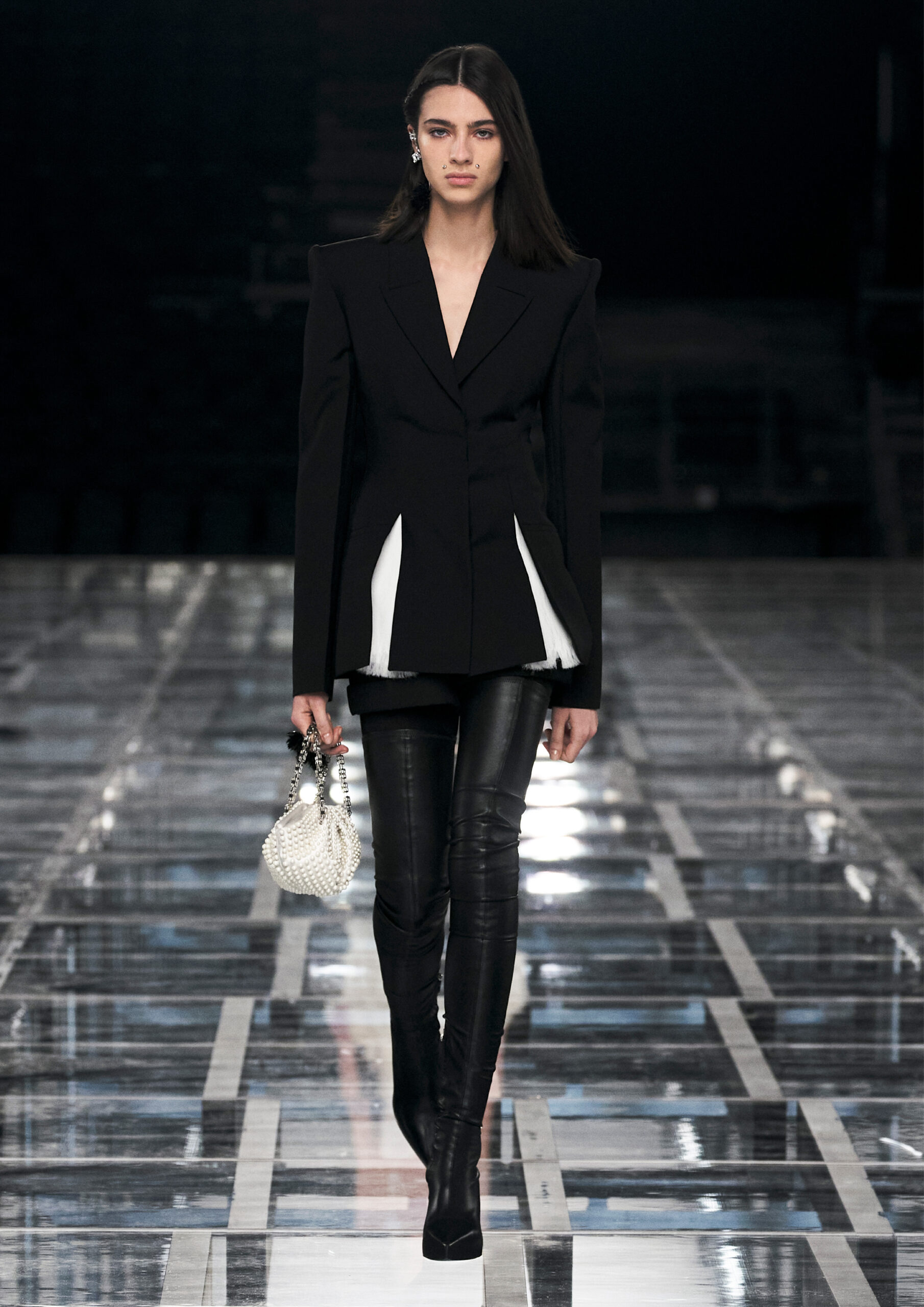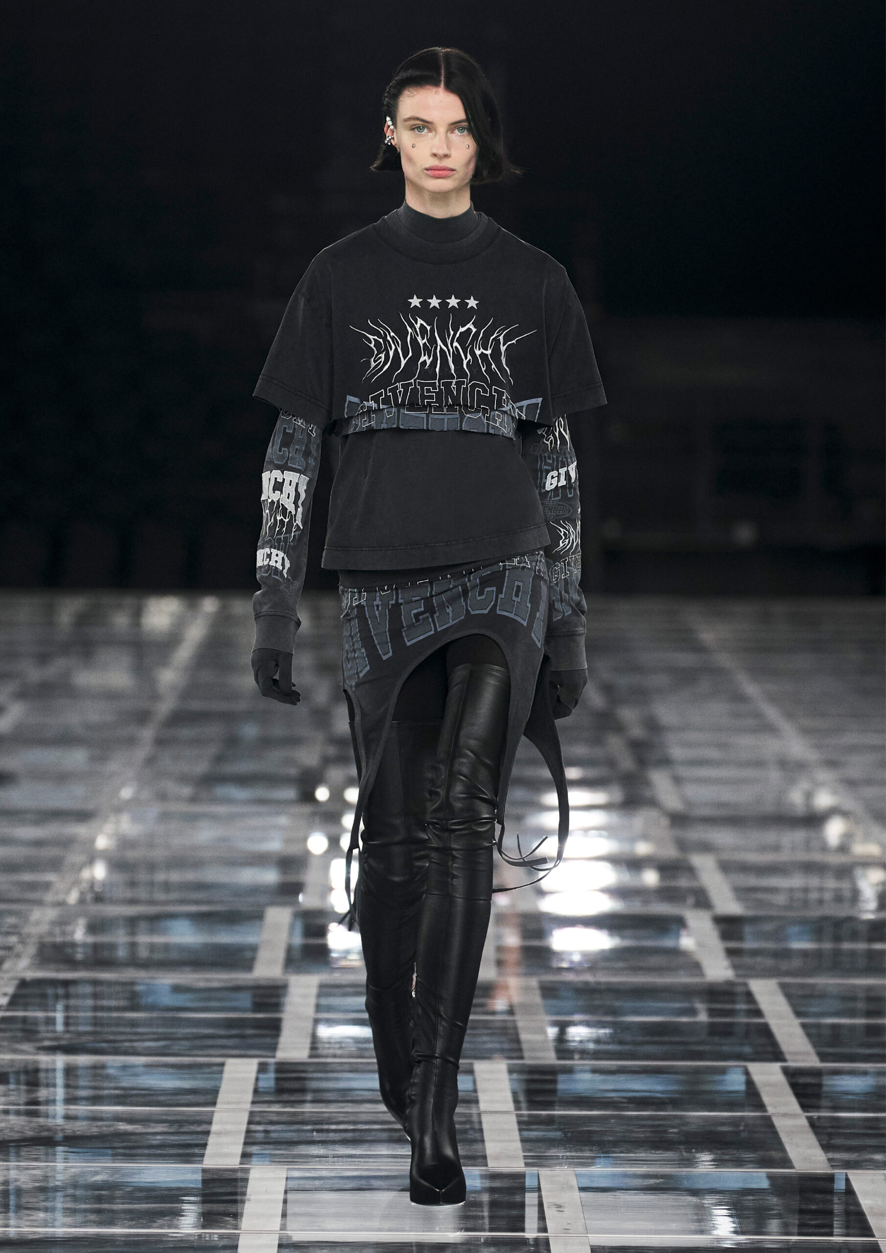 Leather accessories give a guiding structure to the collection, whether used in luxurious utilitarian outerwear, trousers or skirts or as a sleek second skin under clothing, such as in the signature Givenchy stretch boots, which, quite literally, elevate the silhouette and the wearer. The new bags embrace a softer and more yielding construction, whether this is the New Hobo with the signature Lock or the latest iterations of the Kenny and the softly quilted 4G bags that also experiment with new proportions. On the Kenny bag, extraordinary finishes elevate the everyday in a different way.
