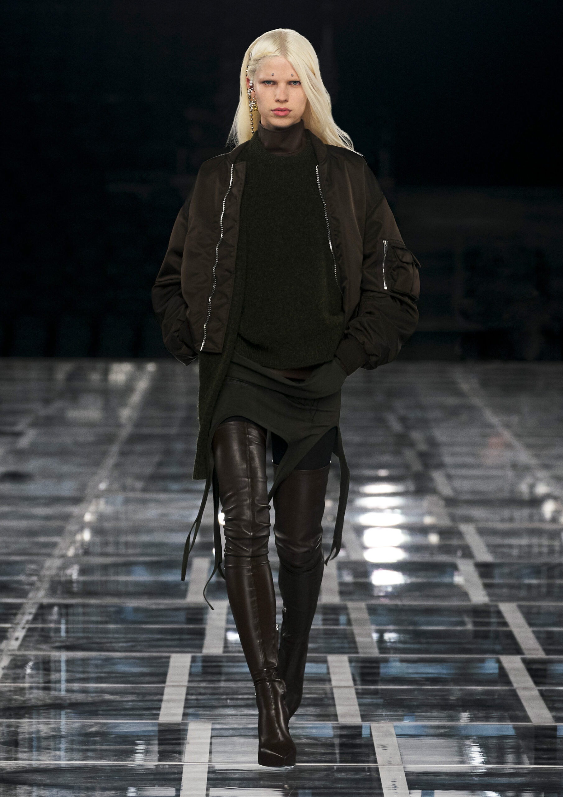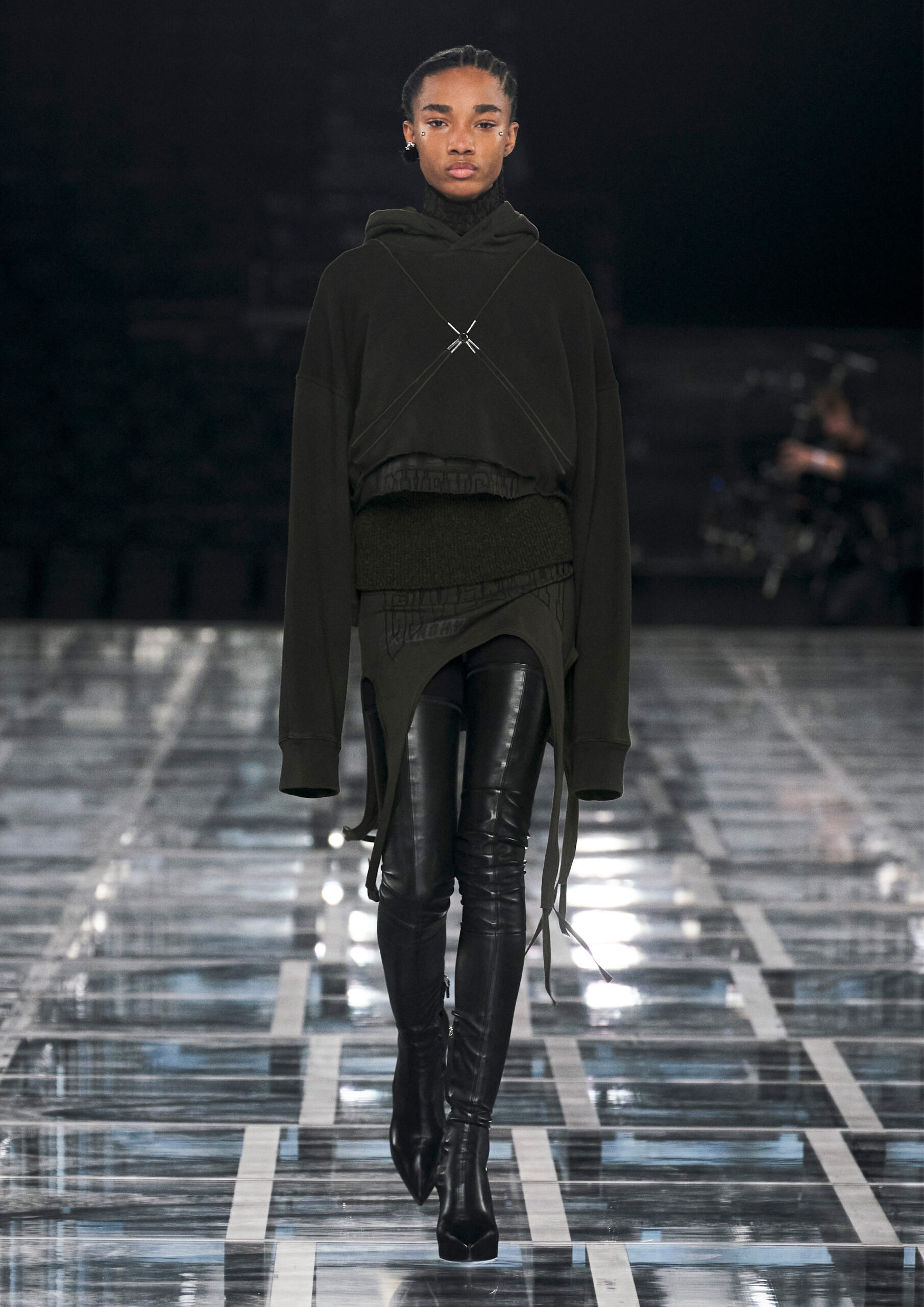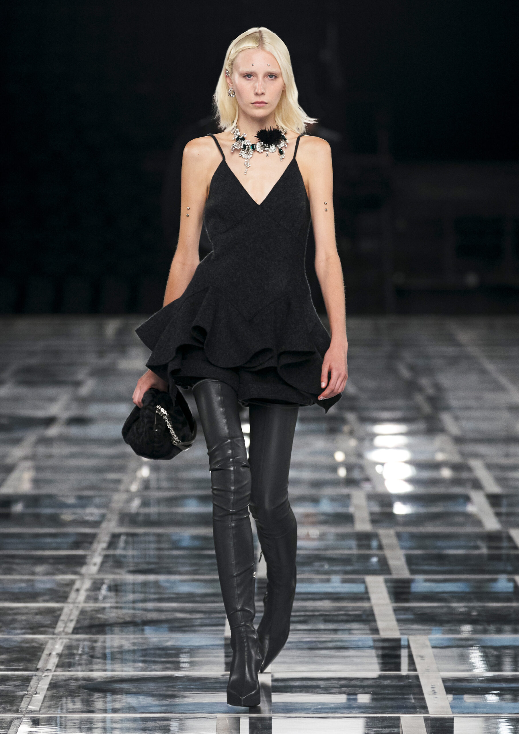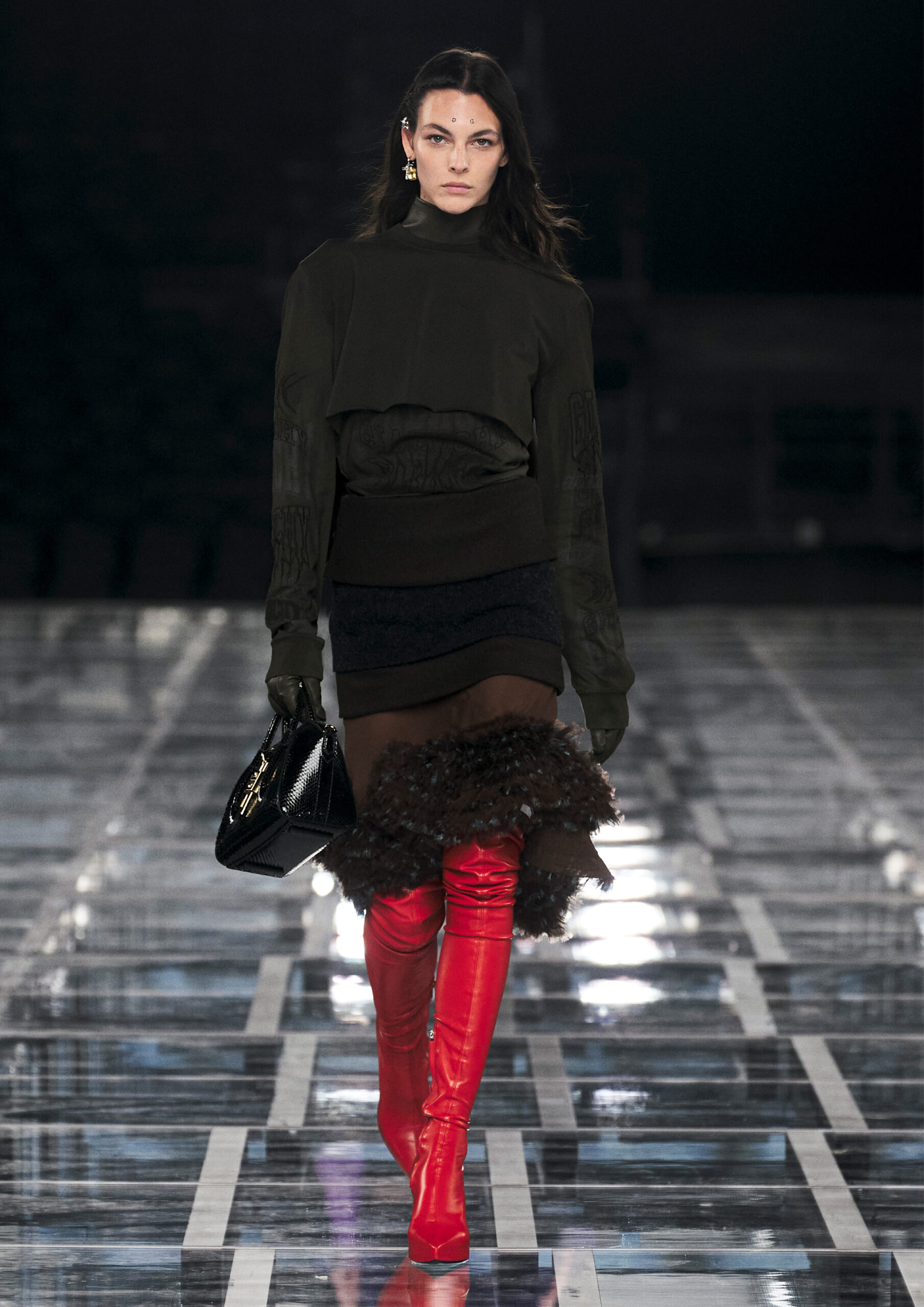 Leather accessories give a guiding structure to the collection, whether used in luxurious utilitarian outerwear, trousers or skirts or as a sleek second skin under clothing, such as in the signature Givenchy stretch boots, which, quite literally, elevate the silhouette and the wearer. The new bags embrace a softer and more yielding construction, whether this is the New Hobo with the signature Lock or the latest iterations of the Kenny and the softly quilted 4G bags that also experiment with new proportions. On the Kenny bag, extraordinary finishes elevate the everyday in a different way.