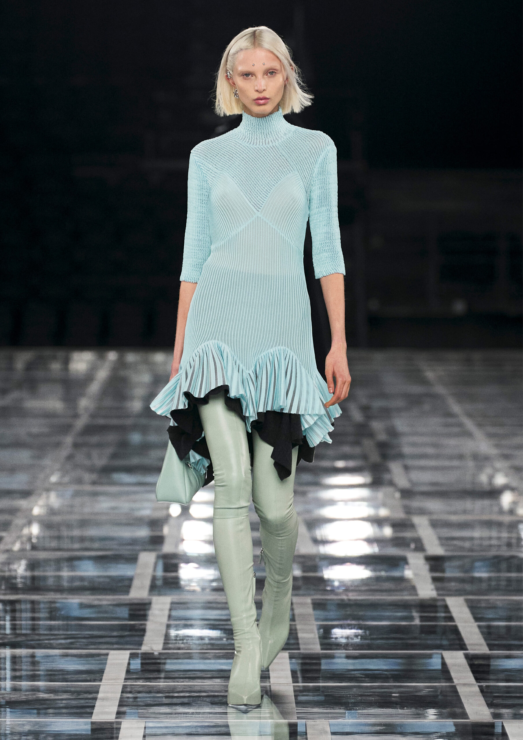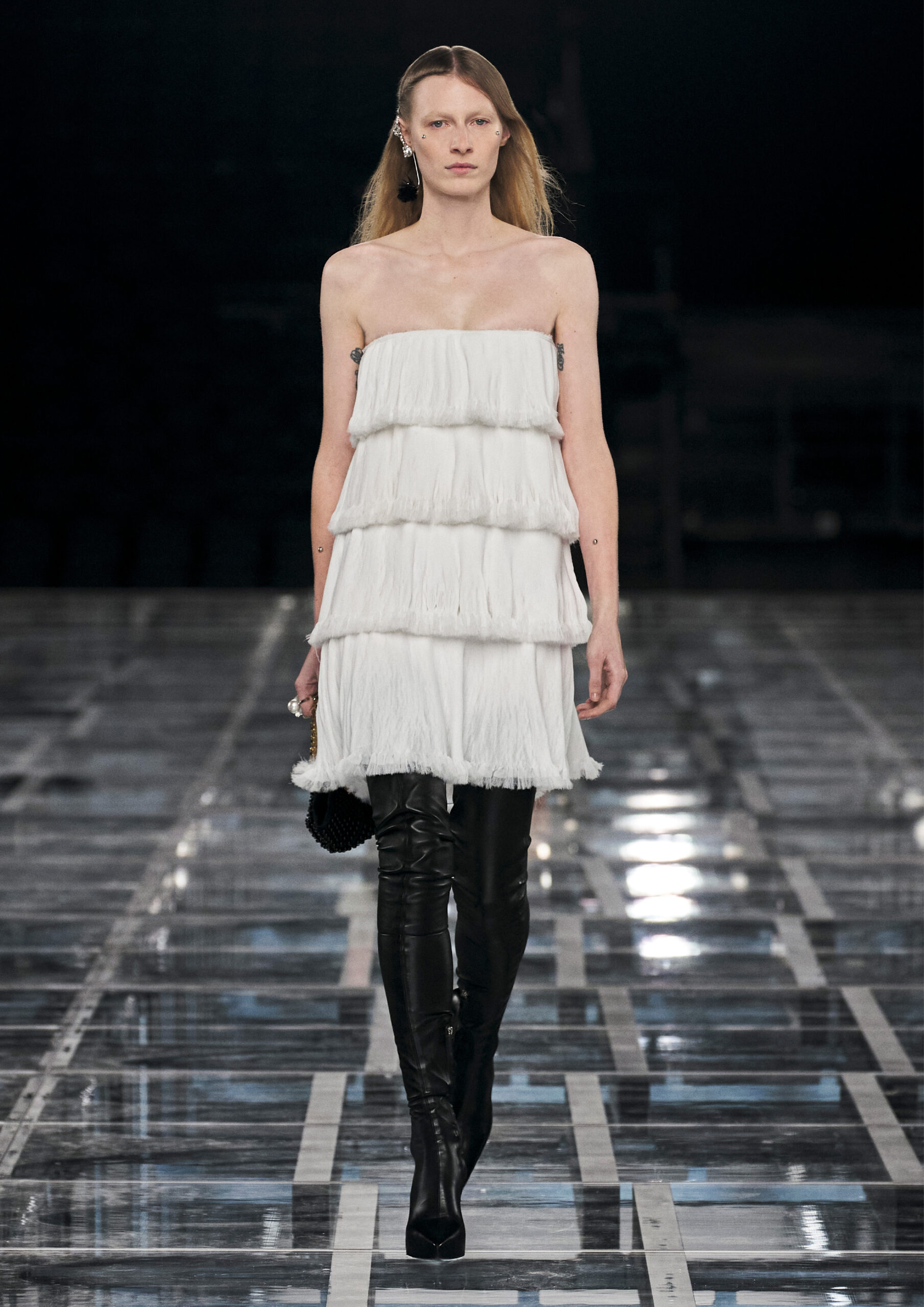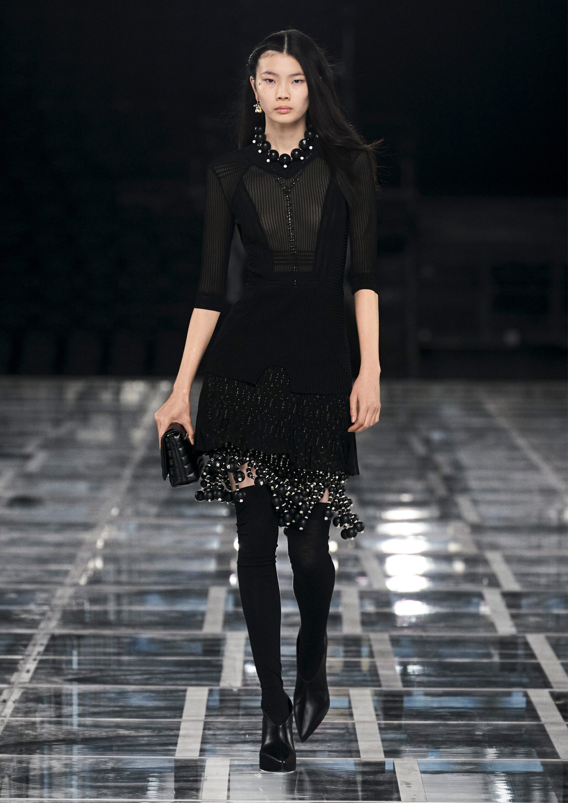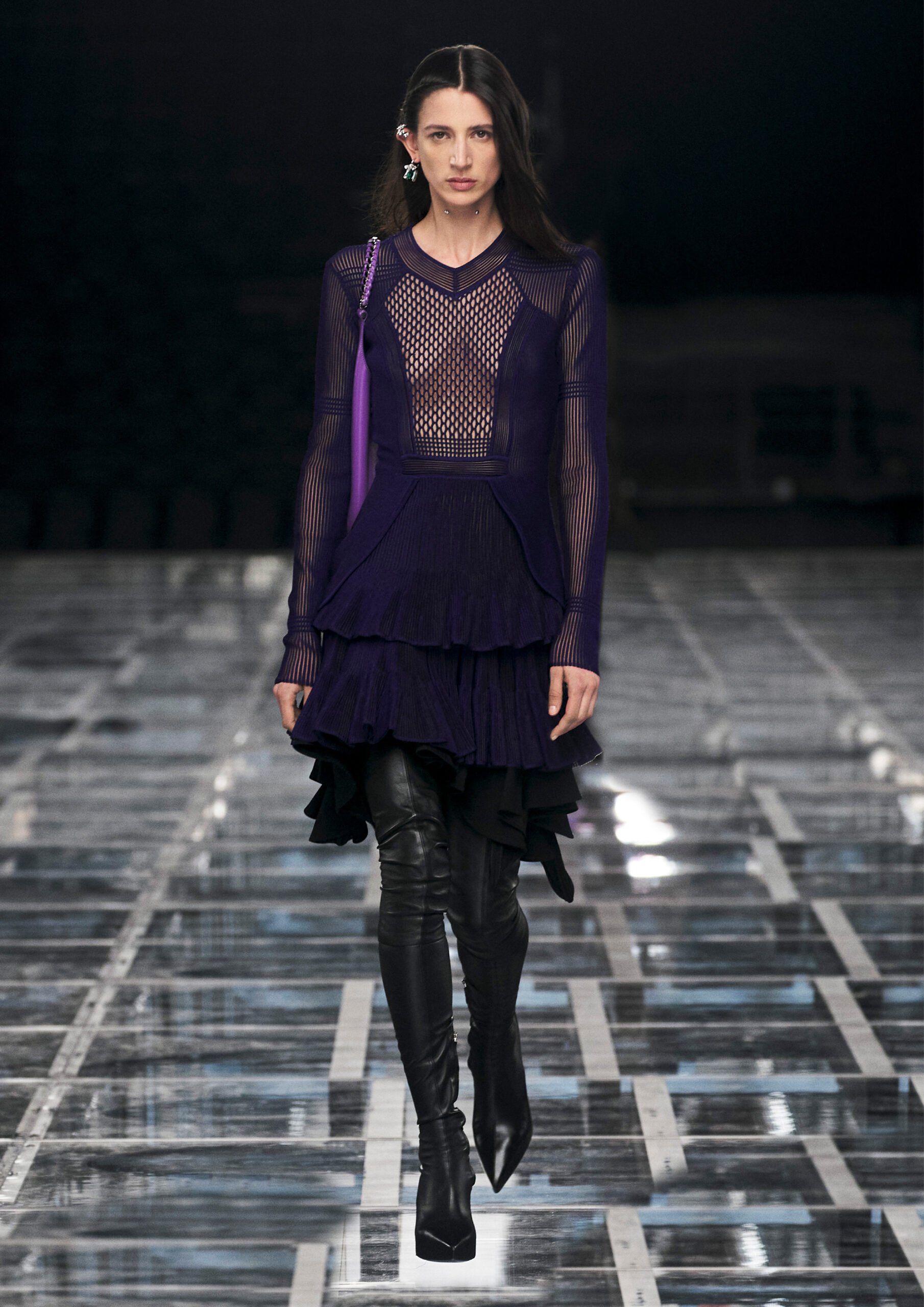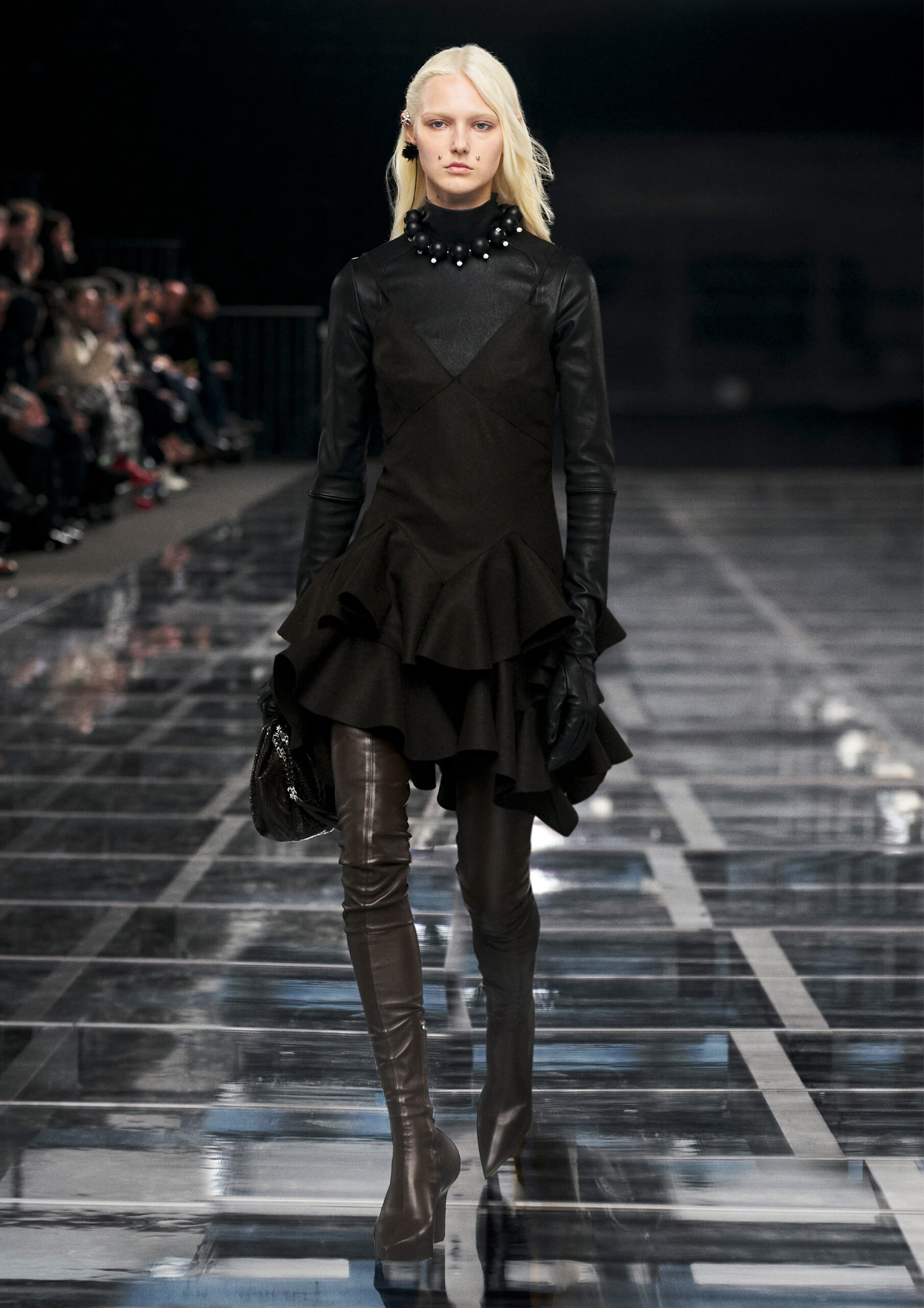 Leather accessories give a guiding structure to the collection, whether used in luxurious utilitarian outerwear, trousers or skirts or as a sleek second skin under clothing, such as in the signature Givenchy stretch boots, which, quite literally, elevate the silhouette and the wearer. The new bags embrace a softer and more yielding construction, whether this is the New Hobo with the signature Lock or the latest iterations of the Kenny and the softly quilted 4G bags that also experiment with new proportions. On the Kenny bag, extraordinary finishes elevate the everyday in a different way.