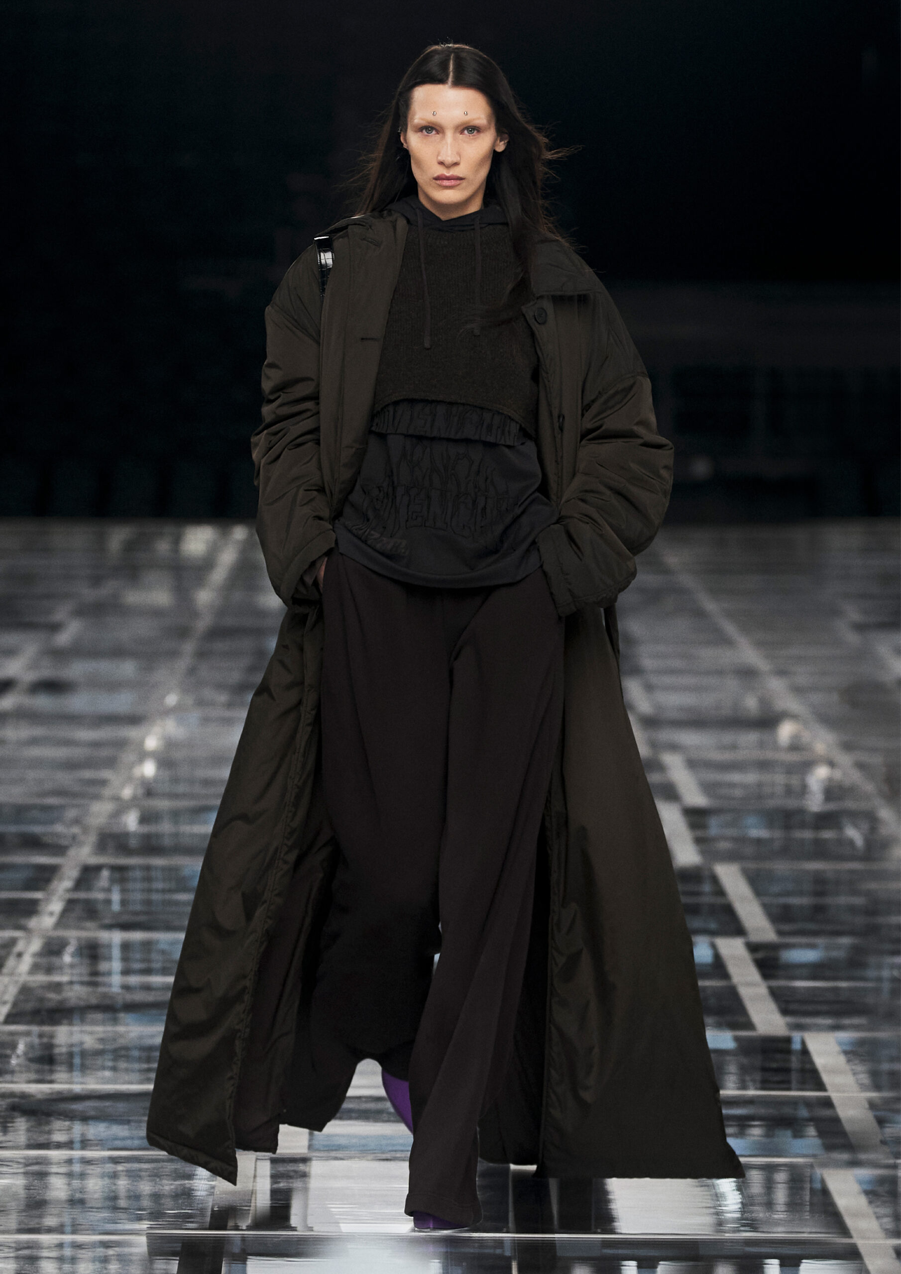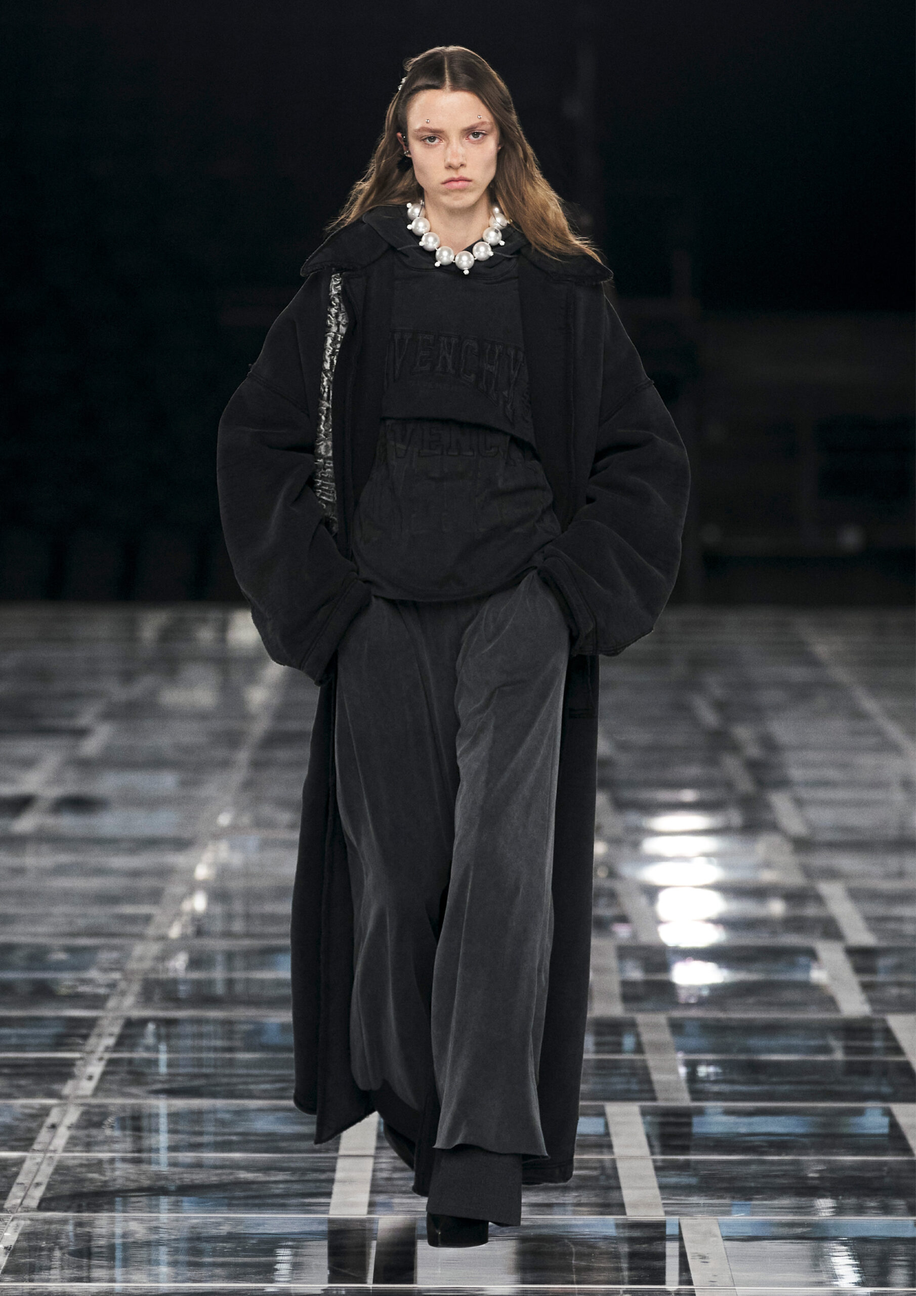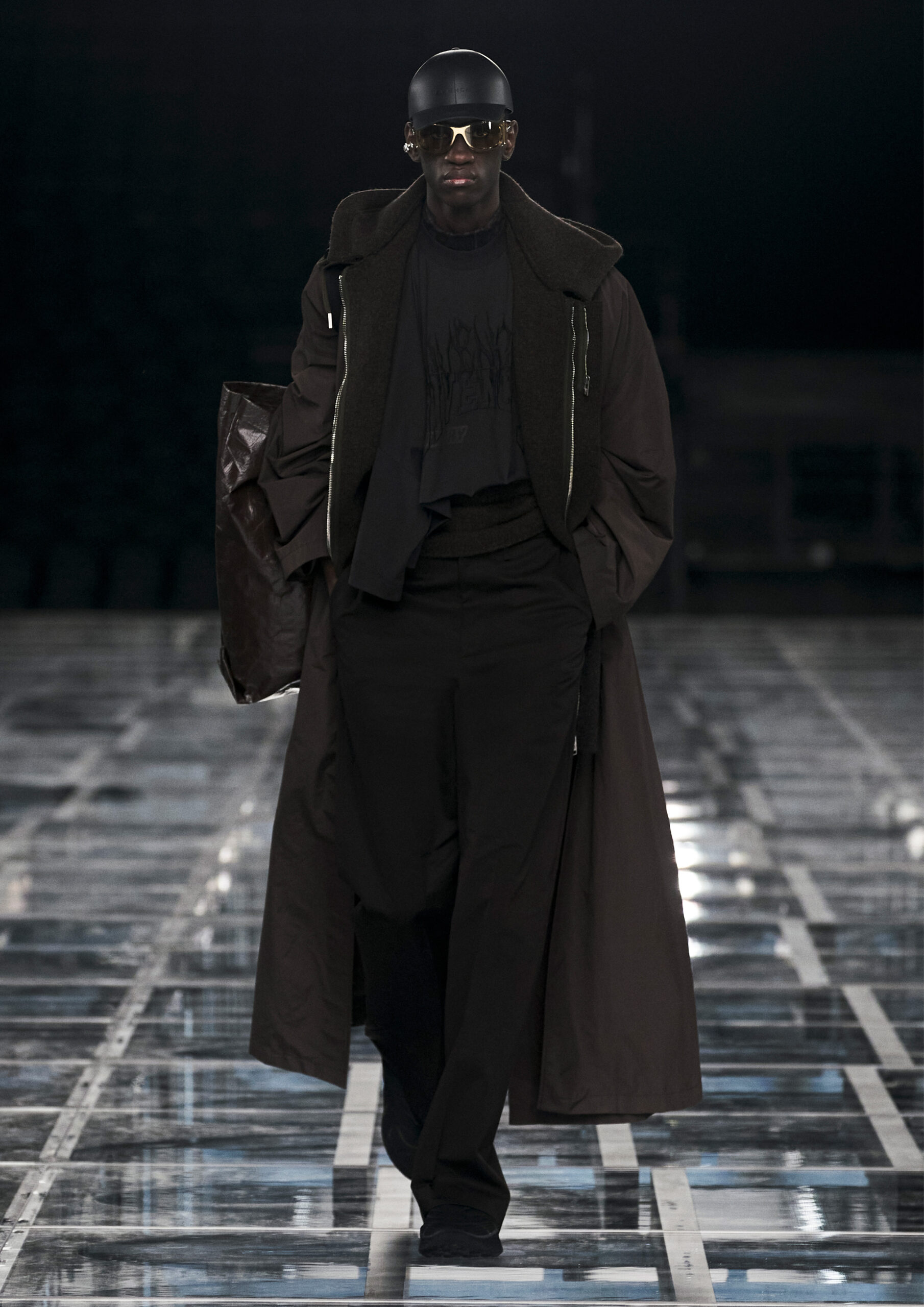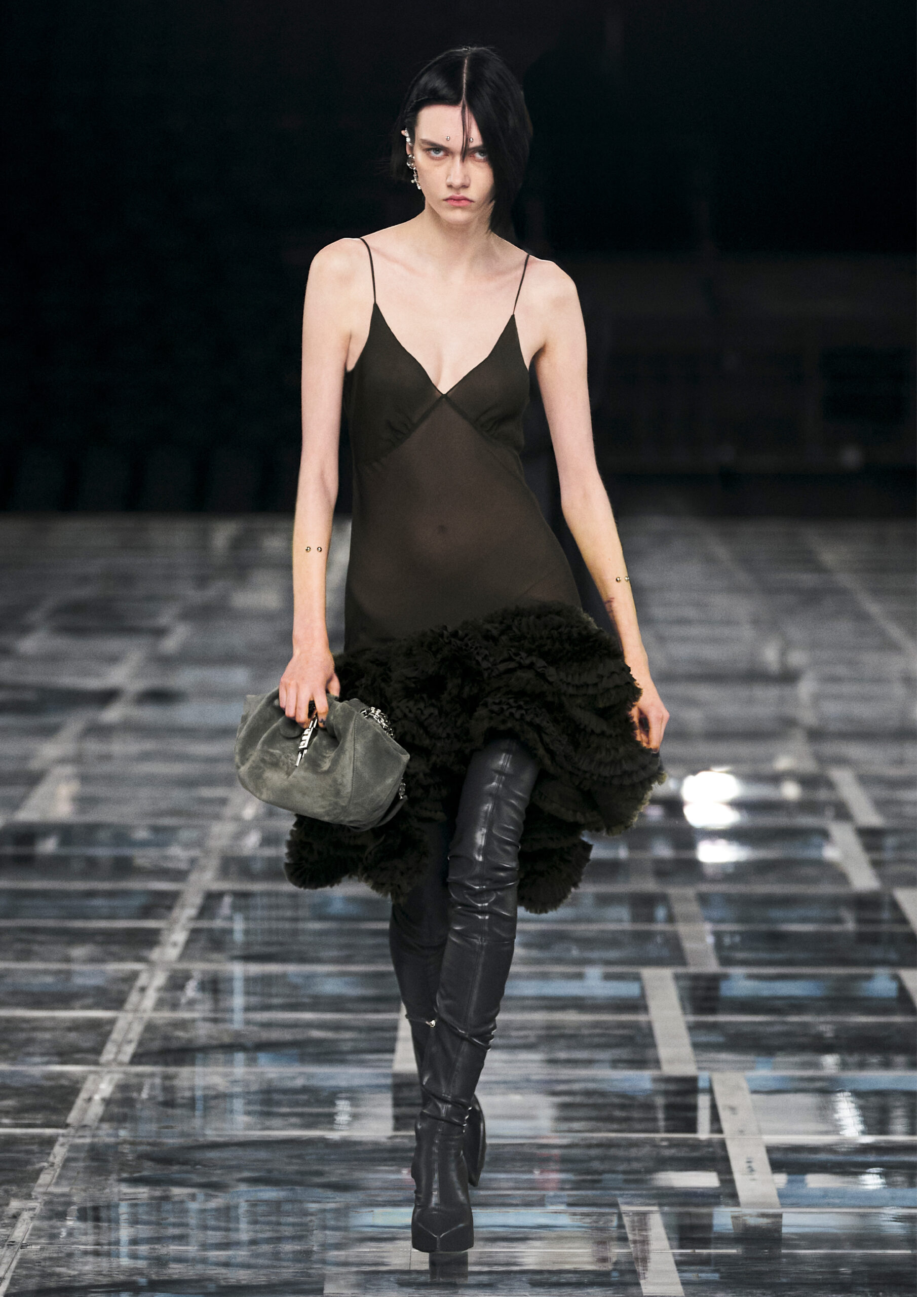 Taking cues from outerwear — and encompassing a practical palette of rich browns, greens, greys and blacks — the designer’s color sensibility is unconventionally applied to fluid, tailored silhouettes and transparent, delicately hand embroidered and disheveled ruffled dresses alike. Here, Givenchy classicism and radicalism are united in a play on layered volumes and textures. The day-to-day familiarity of washed jersey is explored with a new, intricate, layered rigor where an experiment in graphics and 4D print embroidery is brought to the fore. At the same time, this attitude is contrasted with classical tailoring, structured single- and double-breasted forms are explored, yet still with ease and lightness in wools and flannels. Wide tailored trousers and voluminous overcoats work in contrast. While denim is worn, experimented with and treated with equal weight to the duchesse satins that are also found in the collection. All is united by silhouette, either long line and sweeping or short and taut yet still with cascading qualities in intricate ruffles, hand-smocking and pleats, each emphasizing movement, ease and a place in the real life of the wearer.