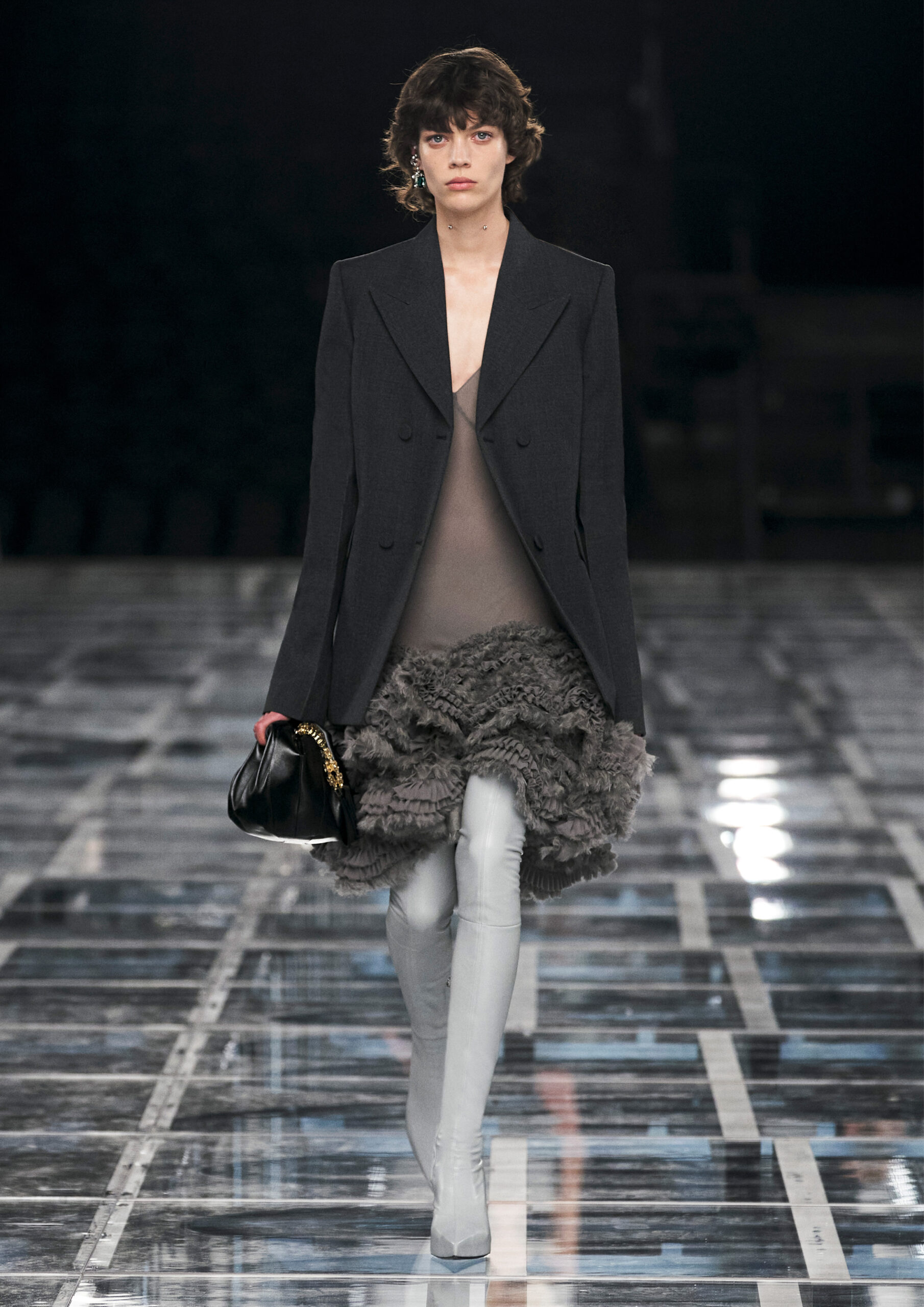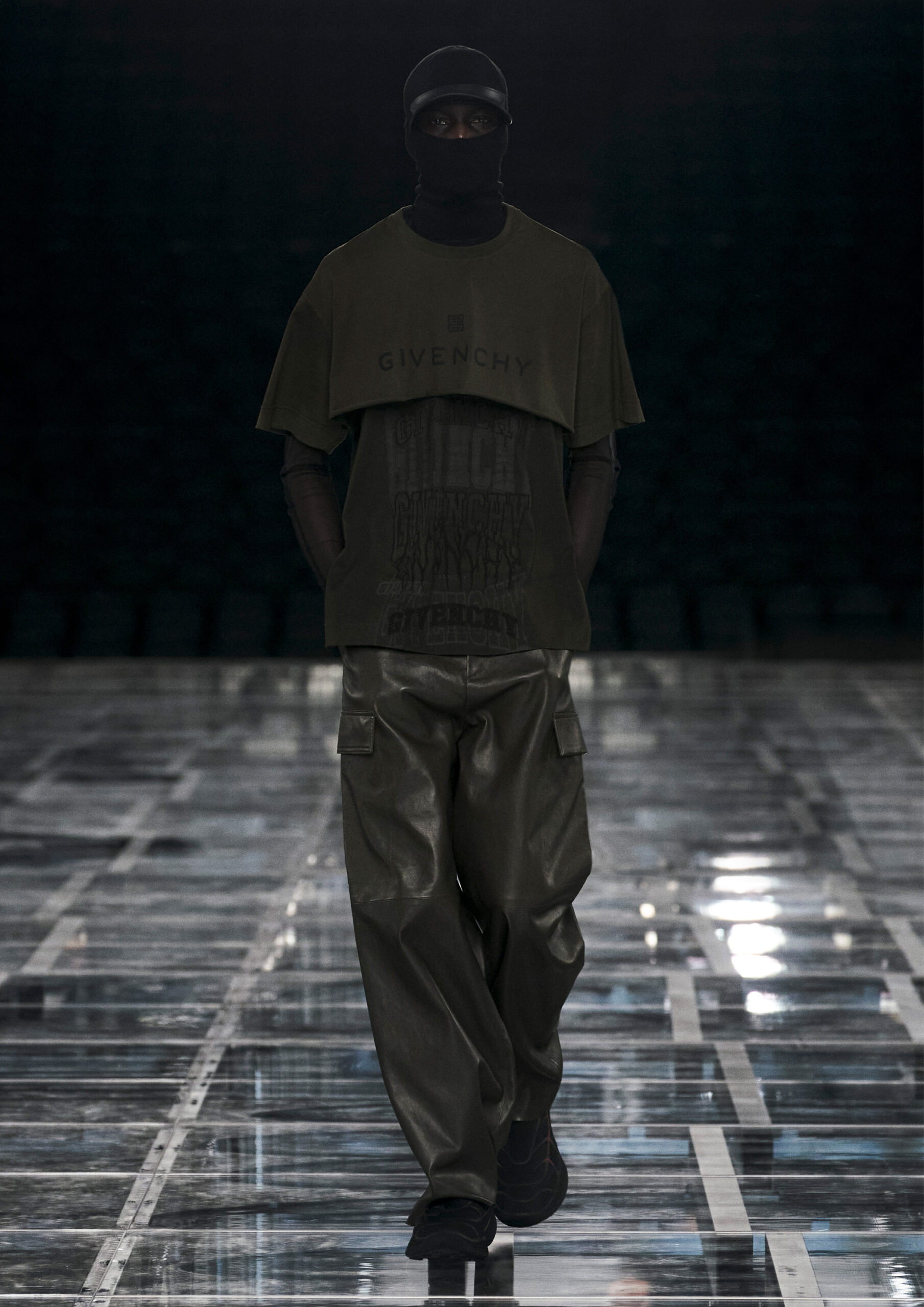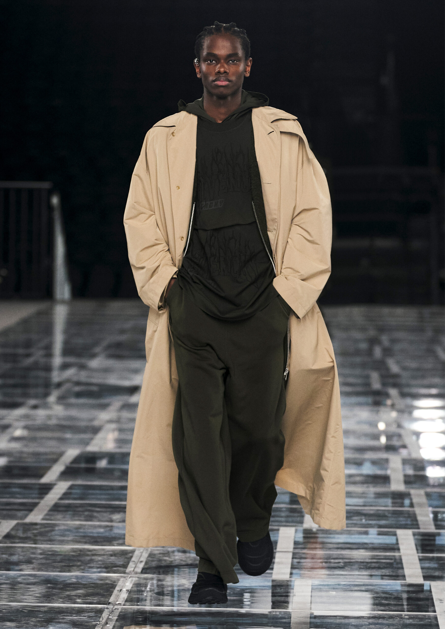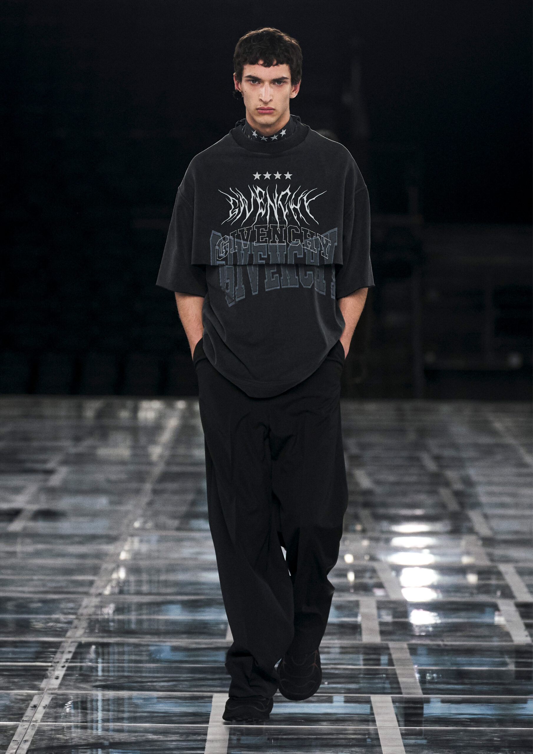 Taking cues from outerwear — and encompassing a practical palette of rich browns, greens, greys and blacks — the designer’s color sensibility is unconventionally applied to fluid, tailored silhouettes and transparent, delicately hand embroidered and disheveled ruffled dresses alike. Here, Givenchy classicism and radicalism are united in a play on layered volumes and textures. The day-to-day familiarity of washed jersey is explored with a new, intricate, layered rigor where an experiment in graphics and 4D print embroidery is brought to the fore. At the same time, this attitude is contrasted with classical tailoring, structured single- and double-breasted forms are explored, yet still with ease and lightness in wools and flannels. Wide tailored trousers and voluminous overcoats work in contrast. While denim is worn, experimented with and treated with equal weight to the duchesse satins that are also found in the collection. All is united by silhouette, either long line and sweeping or short and taut yet still with cascading qualities in intricate ruffles, hand-smocking and pleats, each emphasizing movement, ease and a place in the real life of the wearer.