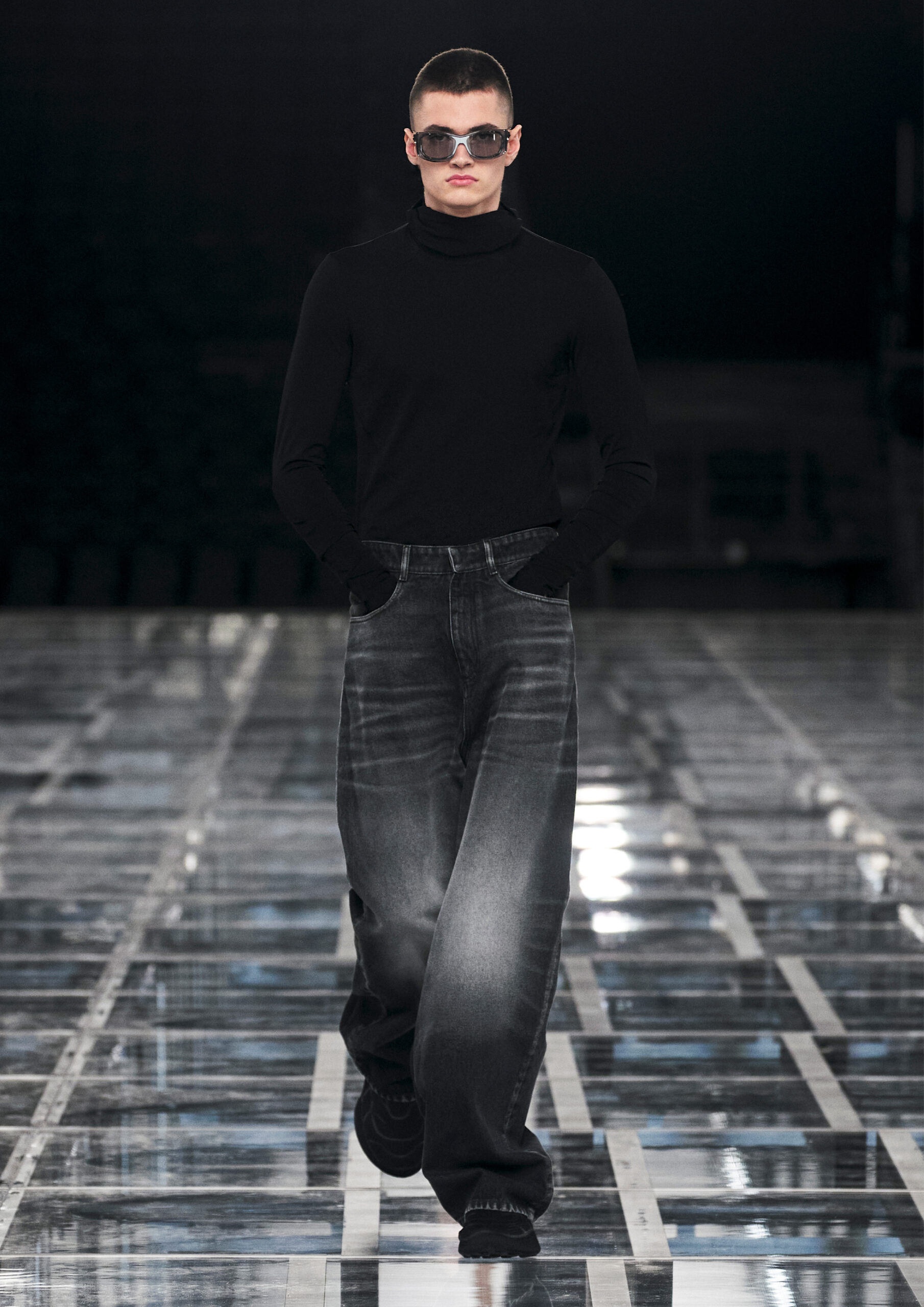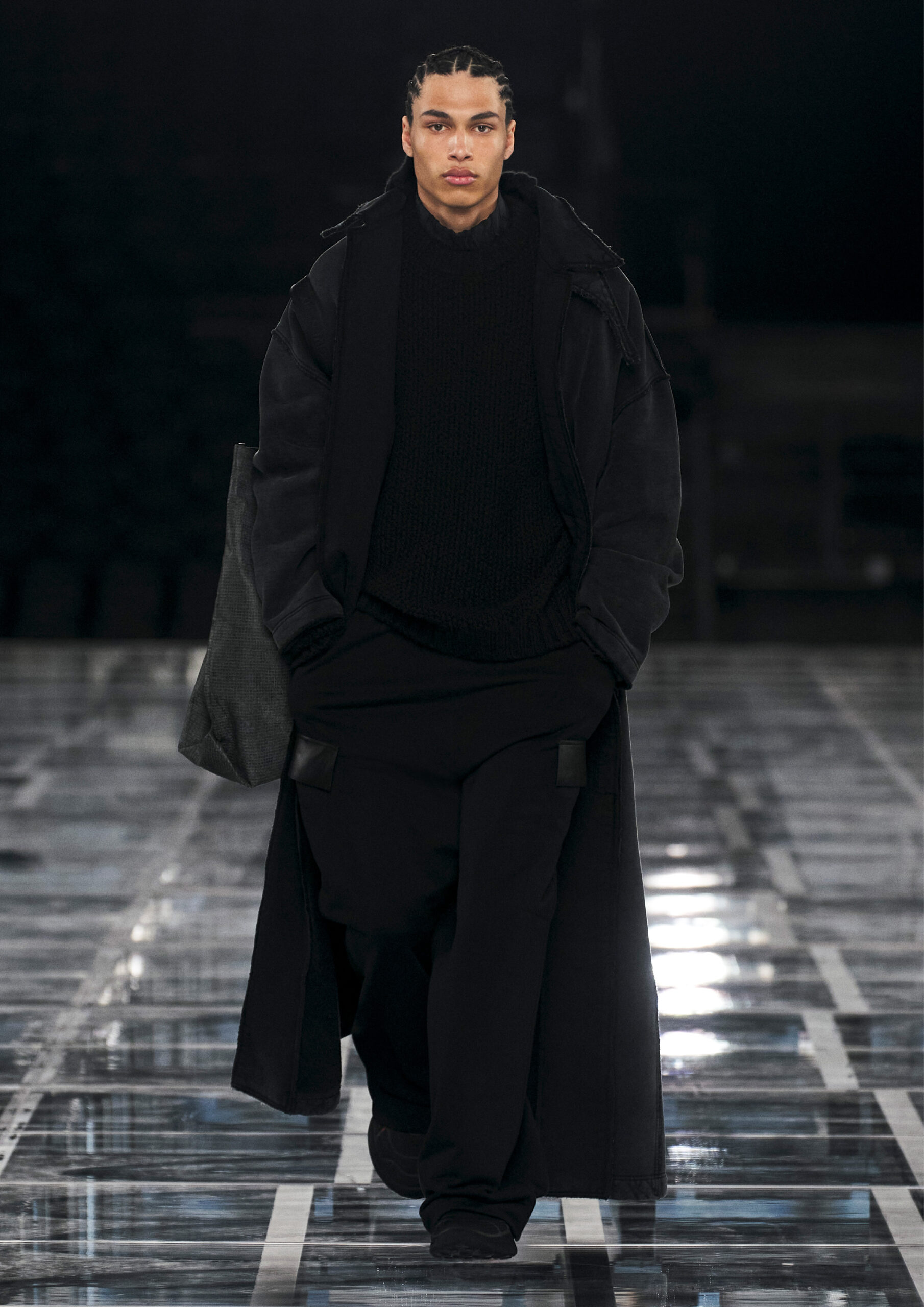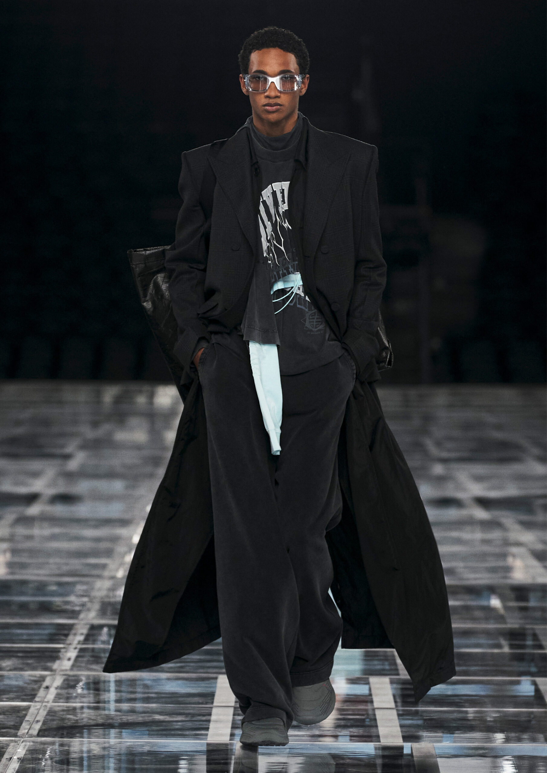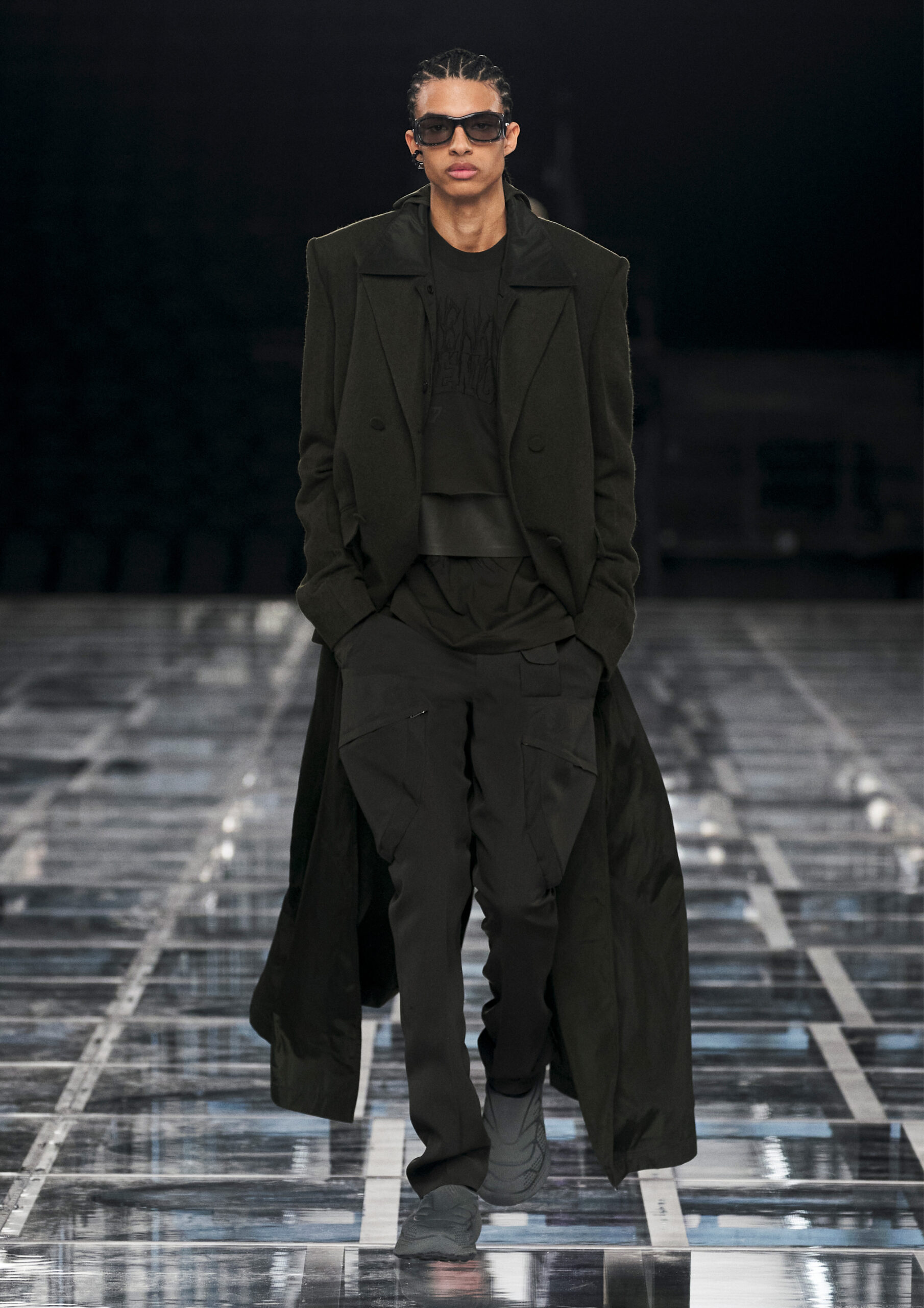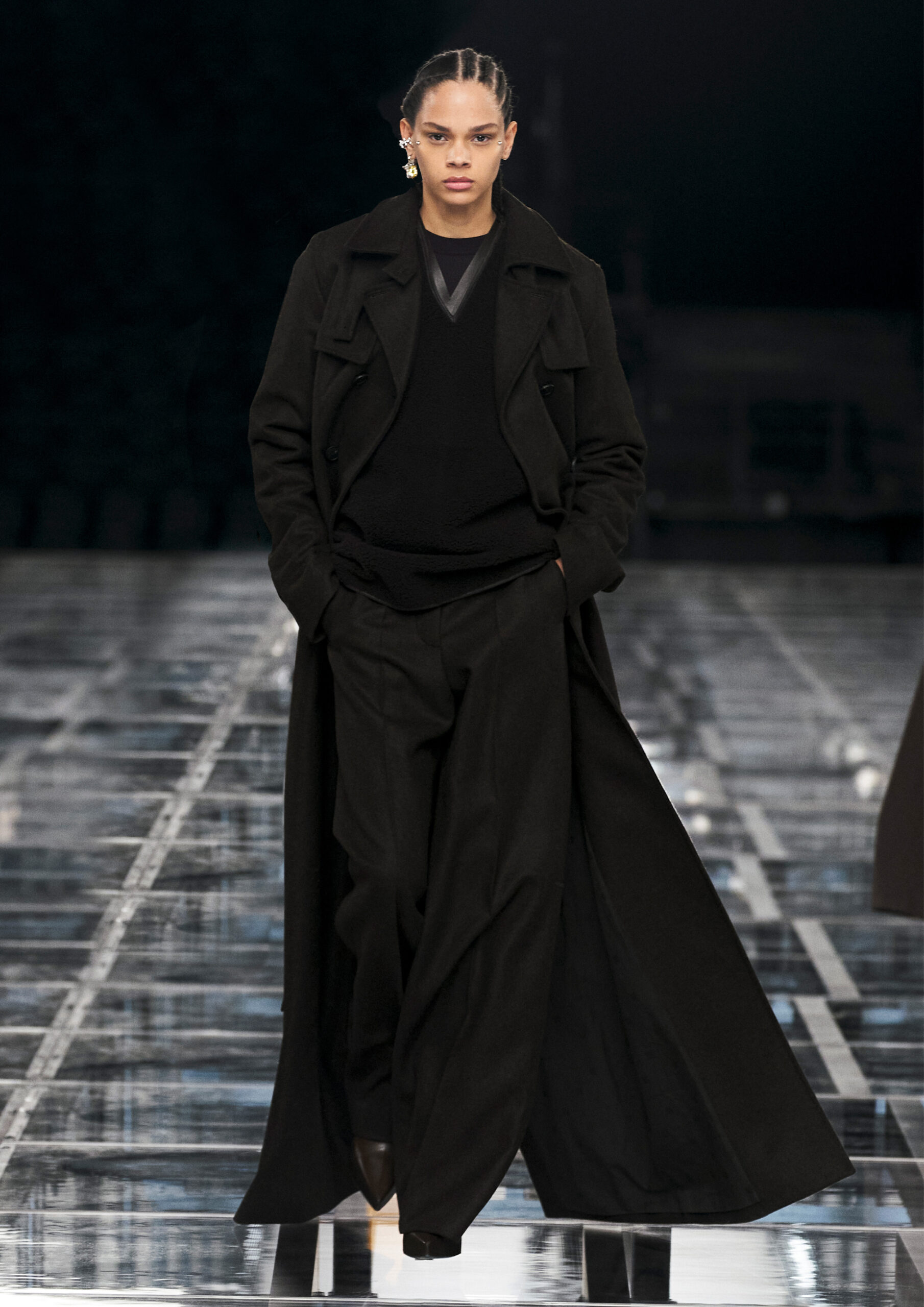 Taking cues from outerwear — and encompassing a practical palette of rich browns, greens, greys and blacks — the designer’s color sensibility is unconventionally applied to fluid, tailored silhouettes and transparent, delicately hand embroidered and disheveled ruffled dresses alike. Here, Givenchy classicism and radicalism are united in a play on layered volumes and textures. The day-to-day familiarity of washed jersey is explored with a new, intricate, layered rigor where an experiment in graphics and 4D print embroidery is brought to the fore. At the same time, this attitude is contrasted with classical tailoring, structured single- and double-breasted forms are explored, yet still with ease and lightness in wools and flannels. Wide tailored trousers and voluminous overcoats work in contrast. While denim is worn, experimented with and treated with equal weight to the duchesse satins that are also found in the collection. All is united by silhouette, either long line and sweeping or short and taut yet still with cascading qualities in intricate ruffles, hand-smocking and pleats, each emphasizing movement, ease and a place in the real life of the wearer.