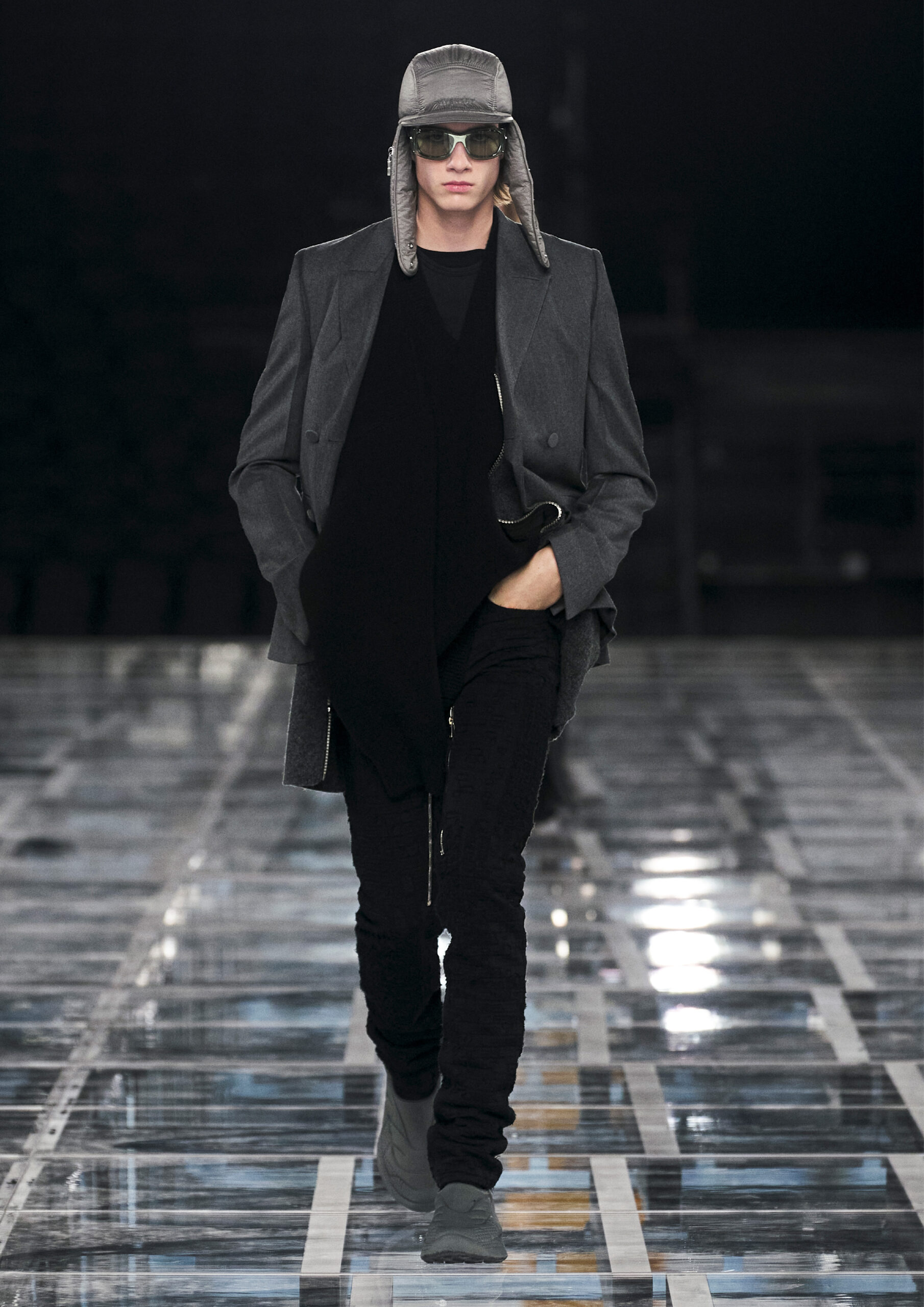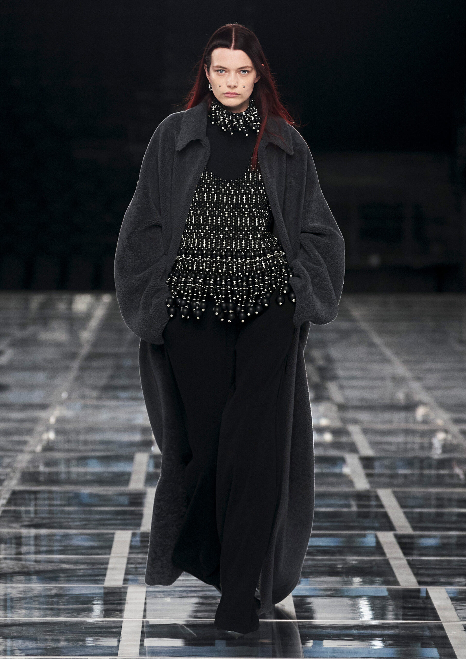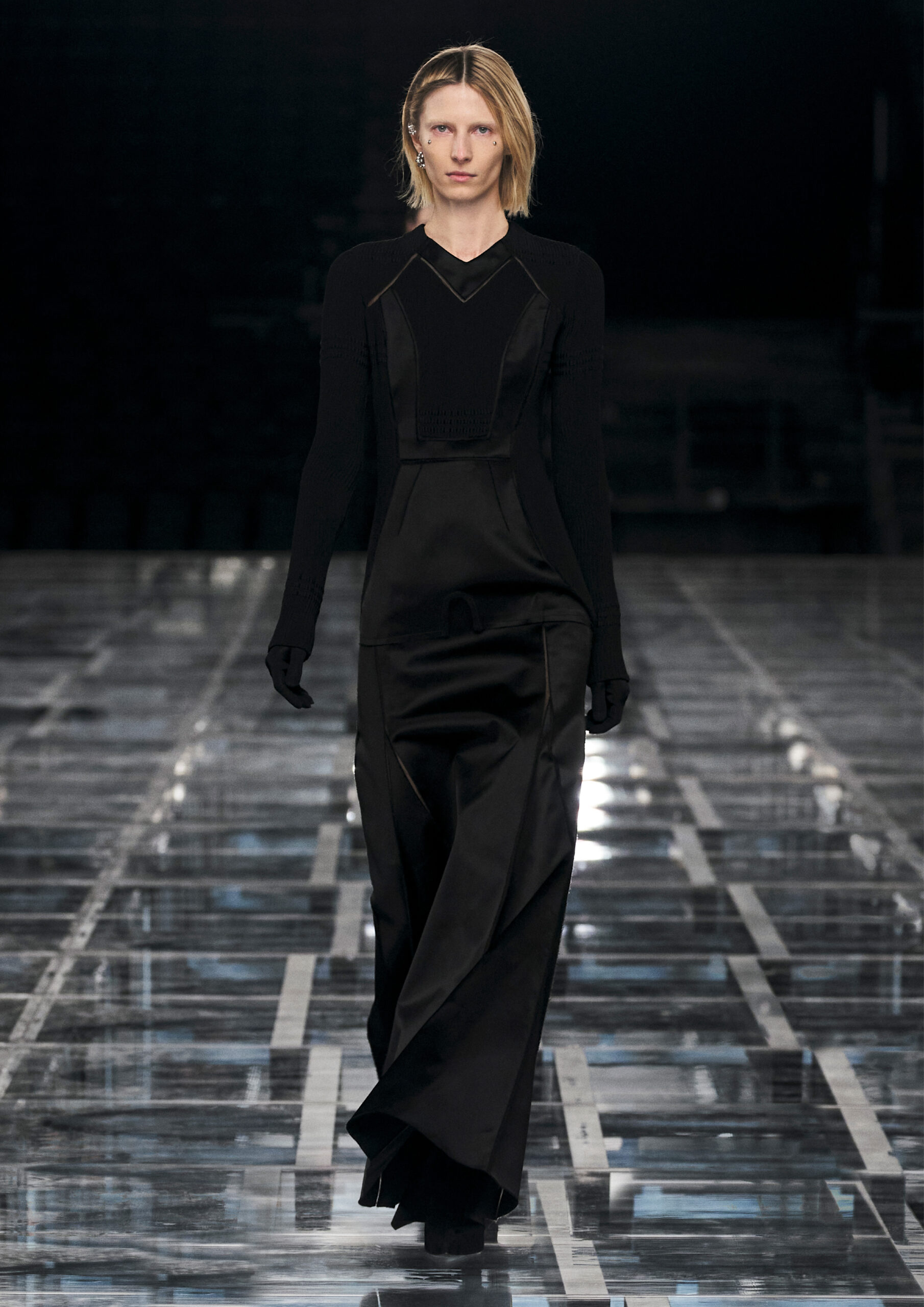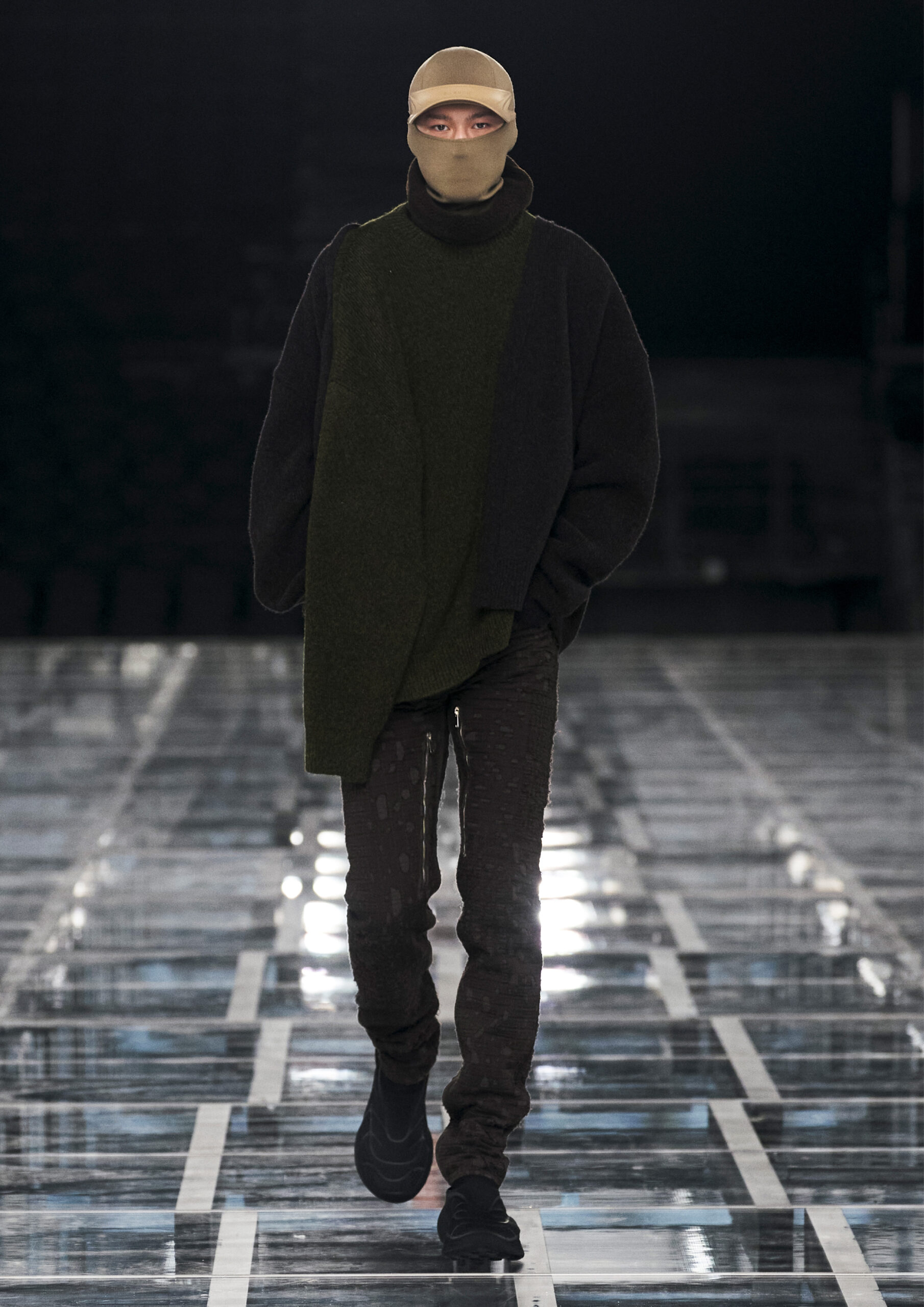 Taking cues from outerwear — and encompassing a practical palette of rich browns, greens, greys and blacks — the designer’s color sensibility is unconventionally applied to fluid, tailored silhouettes and transparent, delicately hand embroidered and disheveled ruffled dresses alike. Here, Givenchy classicism and radicalism are united in a play on layered volumes and textures. The day-to-day familiarity of washed jersey is explored with a new, intricate, layered rigor where an experiment in graphics and 4D print embroidery is brought to the fore. At the same time, this attitude is contrasted with classical tailoring, structured single- and double-breasted forms are explored, yet still with ease and lightness in wools and flannels. Wide tailored trousers and voluminous overcoats work in contrast. While denim is worn, experimented with and treated with equal weight to the duchesse satins that are also found in the collection. All is united by silhouette, either long line and sweeping or short and taut yet still with cascading qualities in intricate ruffles, hand-smocking and pleats, each emphasizing movement, ease and a place in the real life of the wearer.
