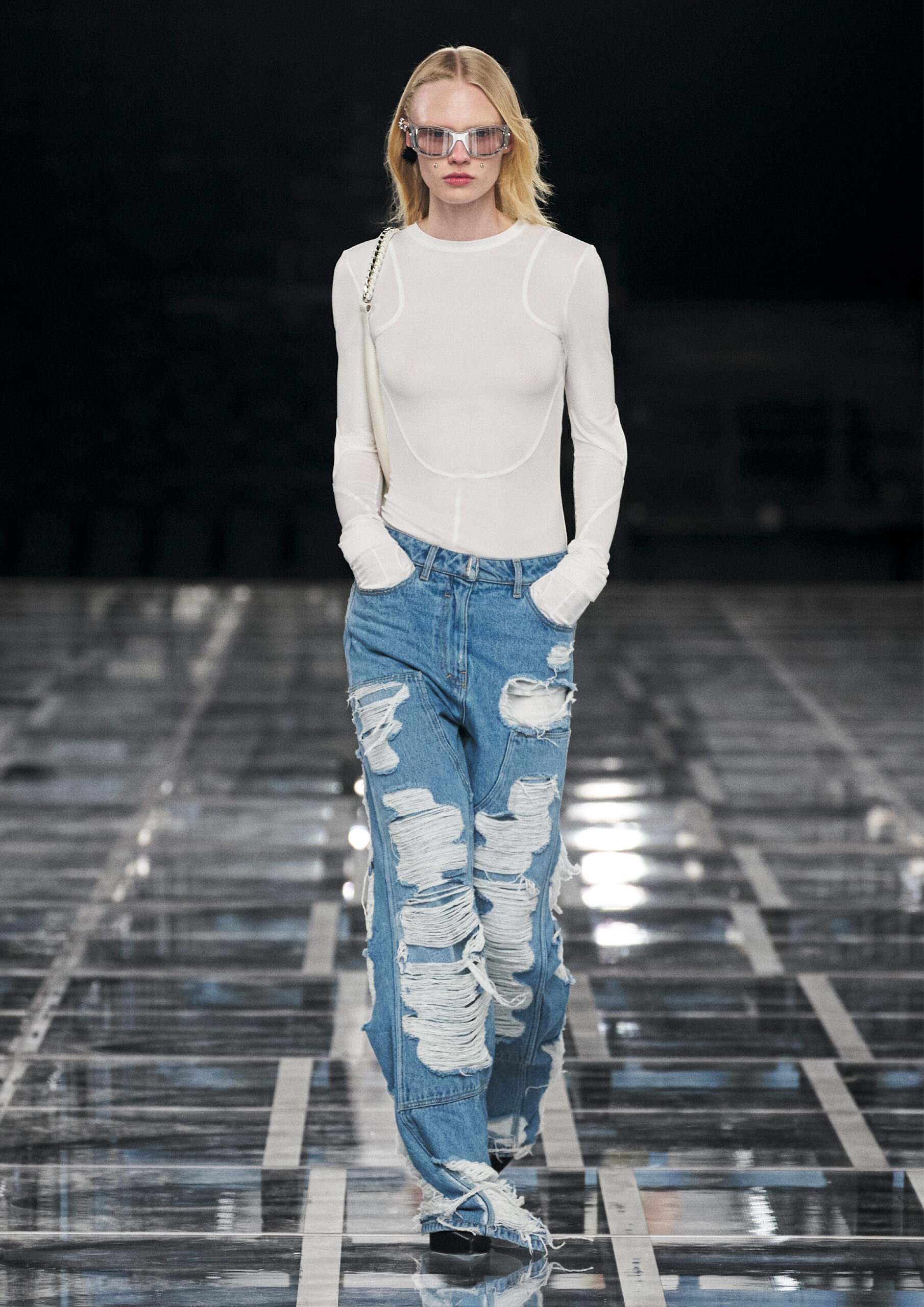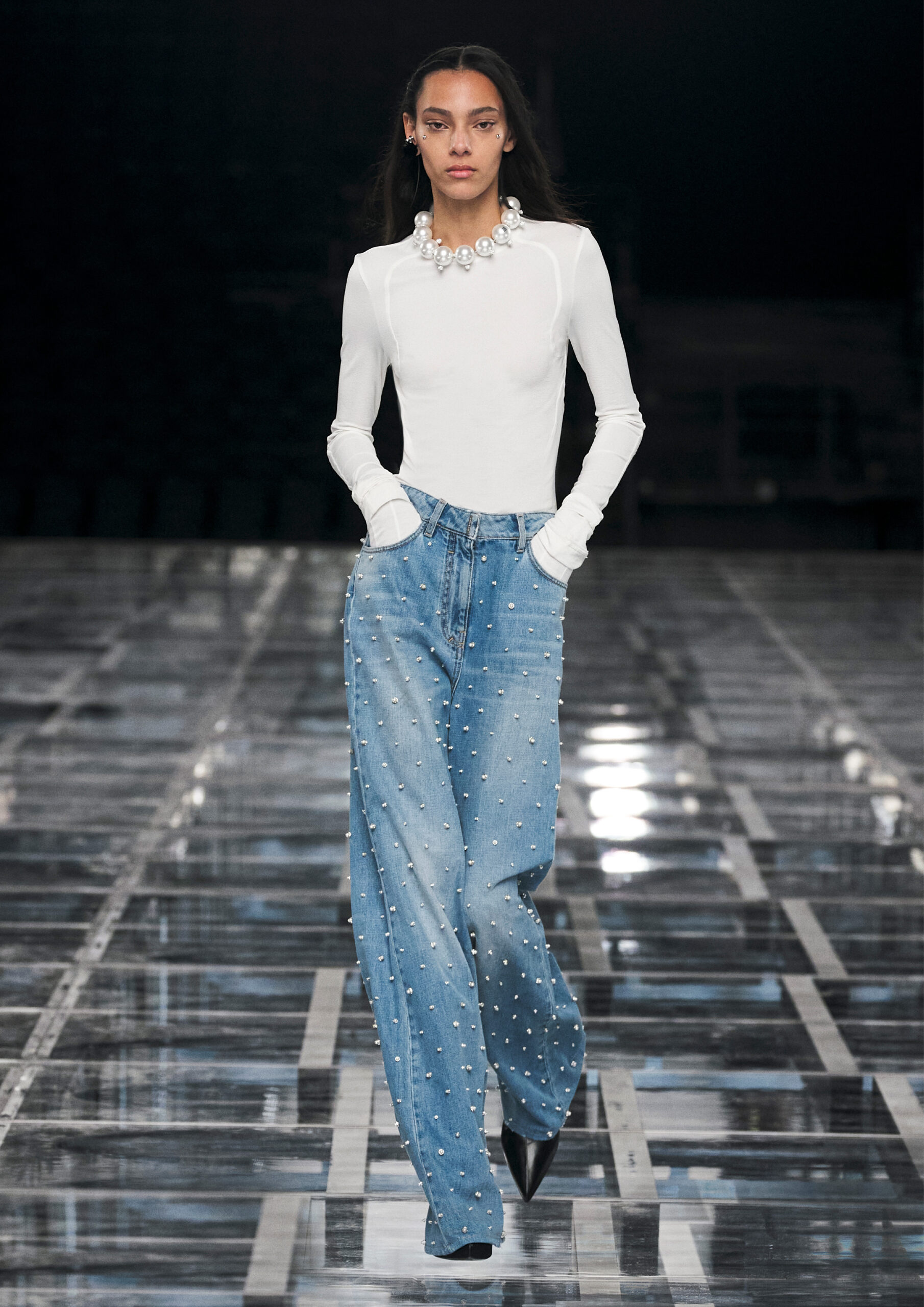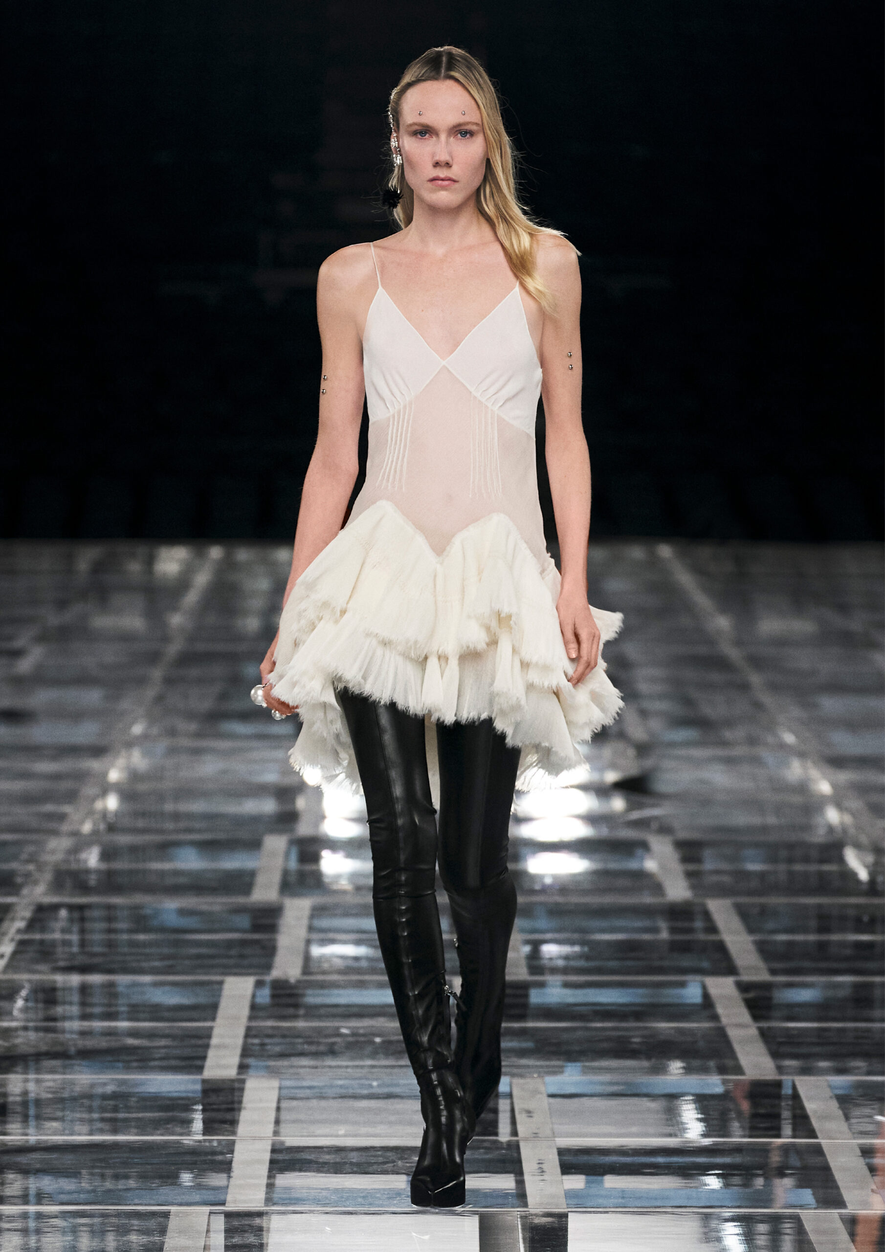Sharp, tailored femininity takes pride of place, in a taut silhouette that’s both formal and informal, pure and audacious. Nothing is overly precious, even when the materials are: worn denim welcomes spectacular sequins and pearls in homage to Hubert de Givenchy’s sense of practical ornamentality. Ruffled wool dresses fuse with sport through spectacular coloring and netting that elevate the everyday and bring ease to evening. It adapts to a graceful yet grounded amazon, its sweeping drama enhanced by flashes of bare skin.