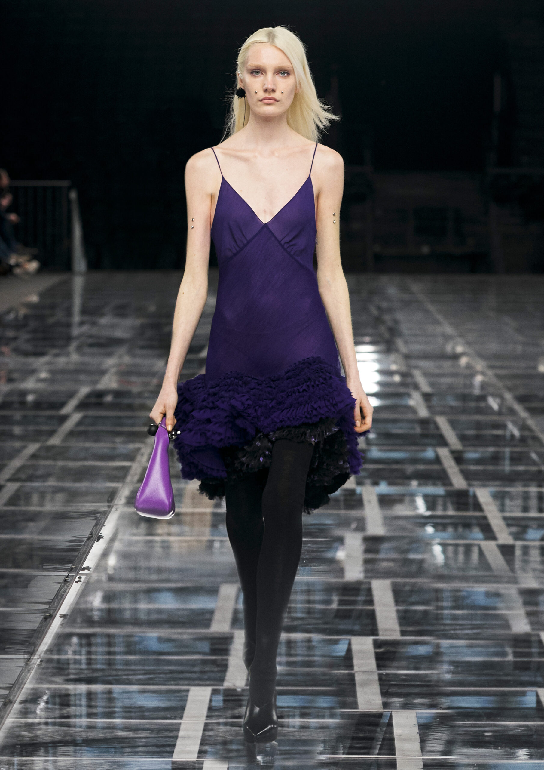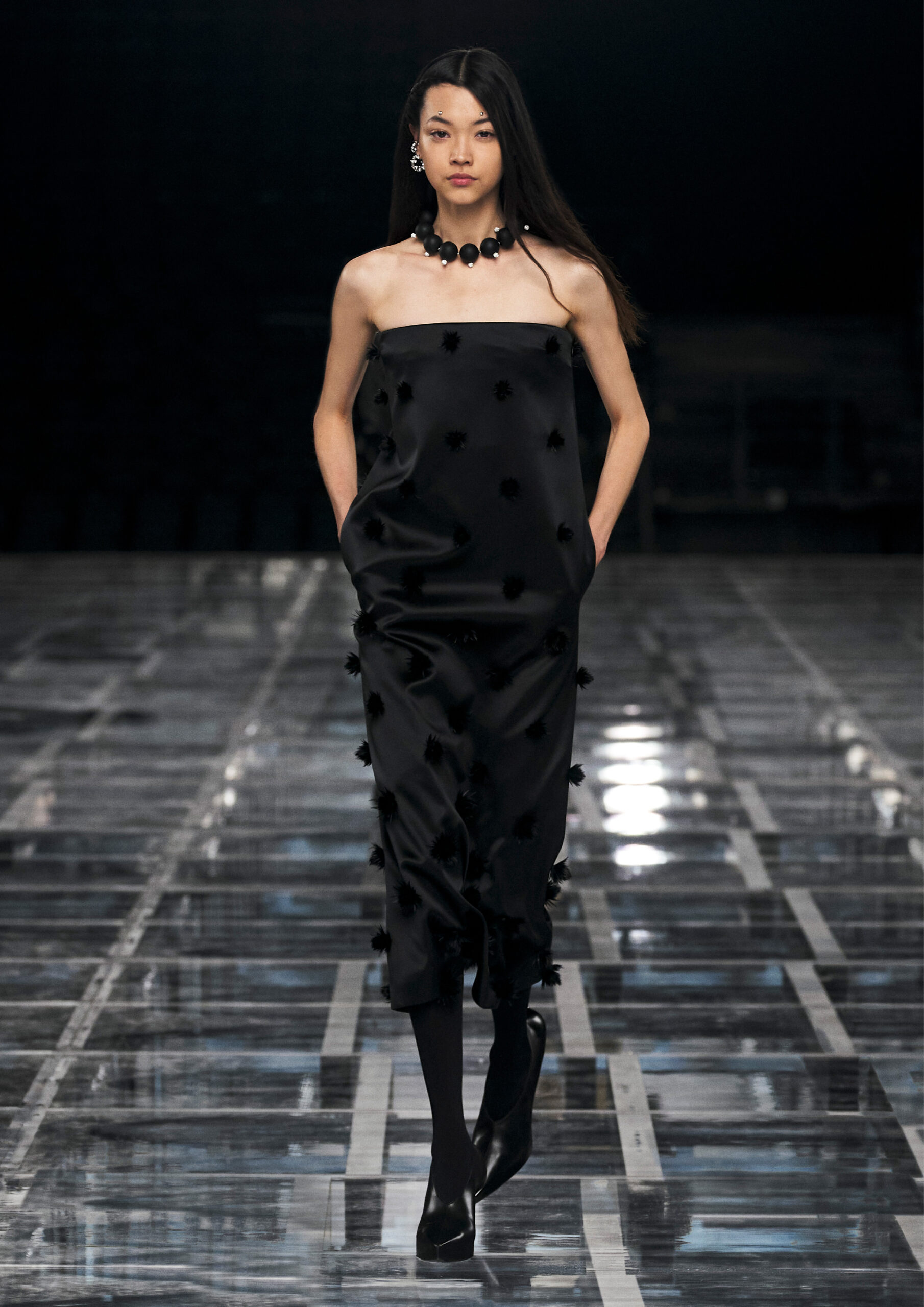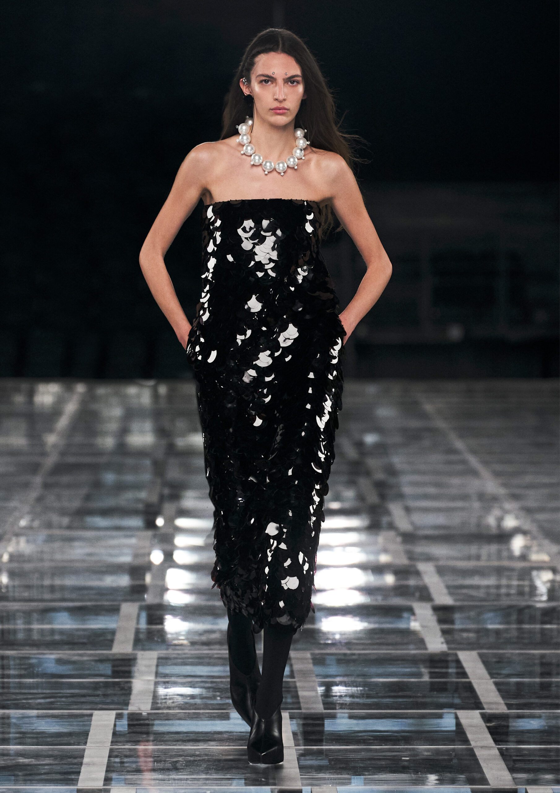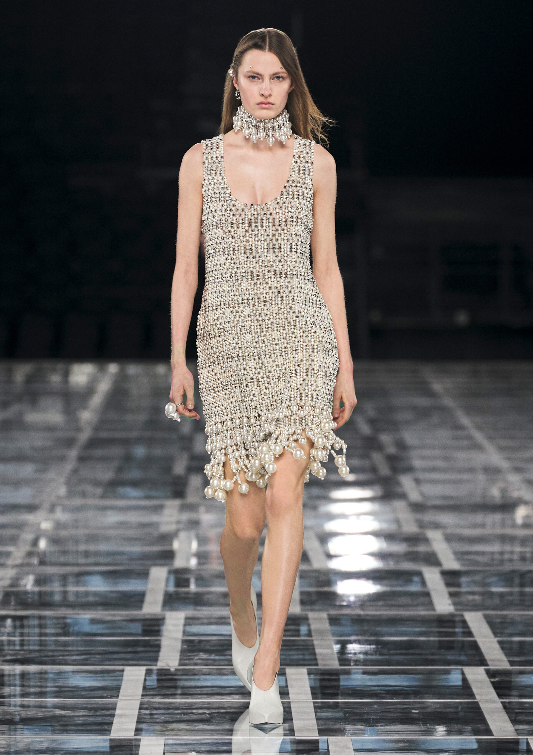 Sharp, tailored femininity takes pride of place, in a taut silhouette that’s both formal and informal, pure and audacious. Nothing is overly precious, even when the materials are: worn denim welcomes spectacular sequins and pearls in homage to Hubert de Givenchy’s sense of practical ornamentality. Ruffled wool dresses fuse with sport through spectacular coloring and netting that elevate the everyday and bring ease to evening. It adapts to a graceful yet grounded amazon, its sweeping drama enhanced by flashes of bare skin.