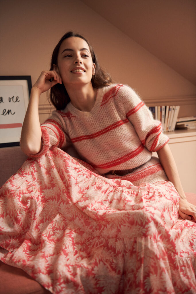 La deuxième escale est une évasion au Japon dans la région du Kansai. A l’aube du printemps, on célèbre la floraison des cerisiers sur Le Chemin de la Philosophie. Entre raffinement et romantisme, ce parcours inspire une initiation à l’Ikebana, l’art de la composition florale, retranscrit sur un Kimono, des blouses romantiques brodées ou une robe midi boutonnée veloutée qui évoque la délicatesse des Sakura.
