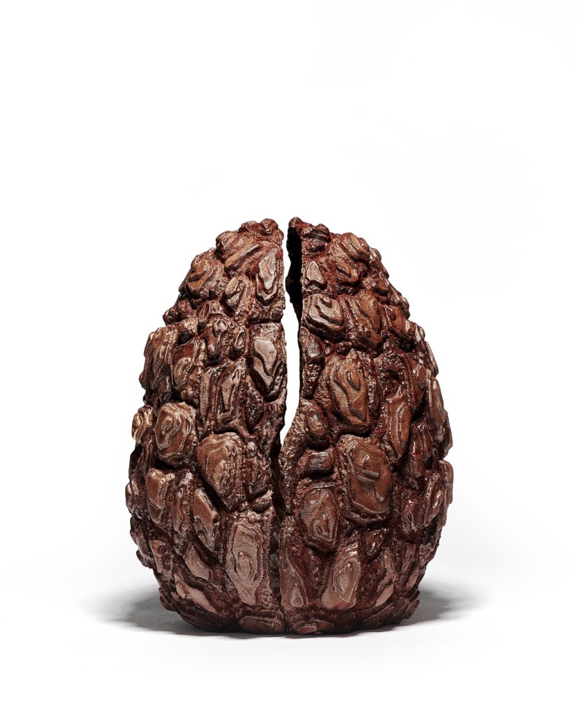 Des textures brutes soigneusement travaillées, des coques à effet trompe-l’oeil garnies d’un délicieux praliné pistache d’un côté, et d’un onctueux praliné noisette de l’autre, le tout ponctué de délicates touches de caramel vanillé… Véritable oeuf-objet mystérieux, il enferme en son coeur une petite tablette au riz soufflé qui garantit une explosion gustative.