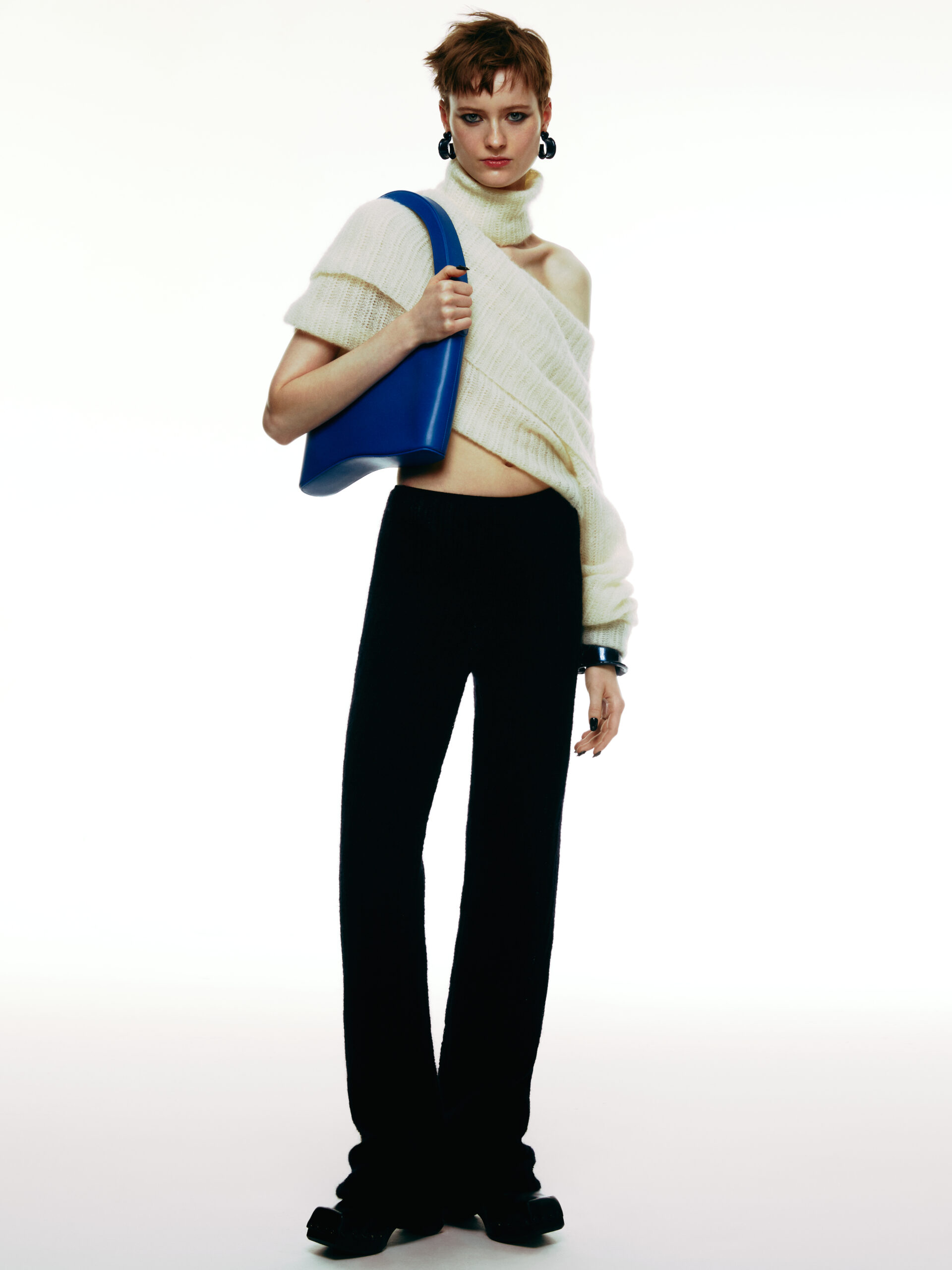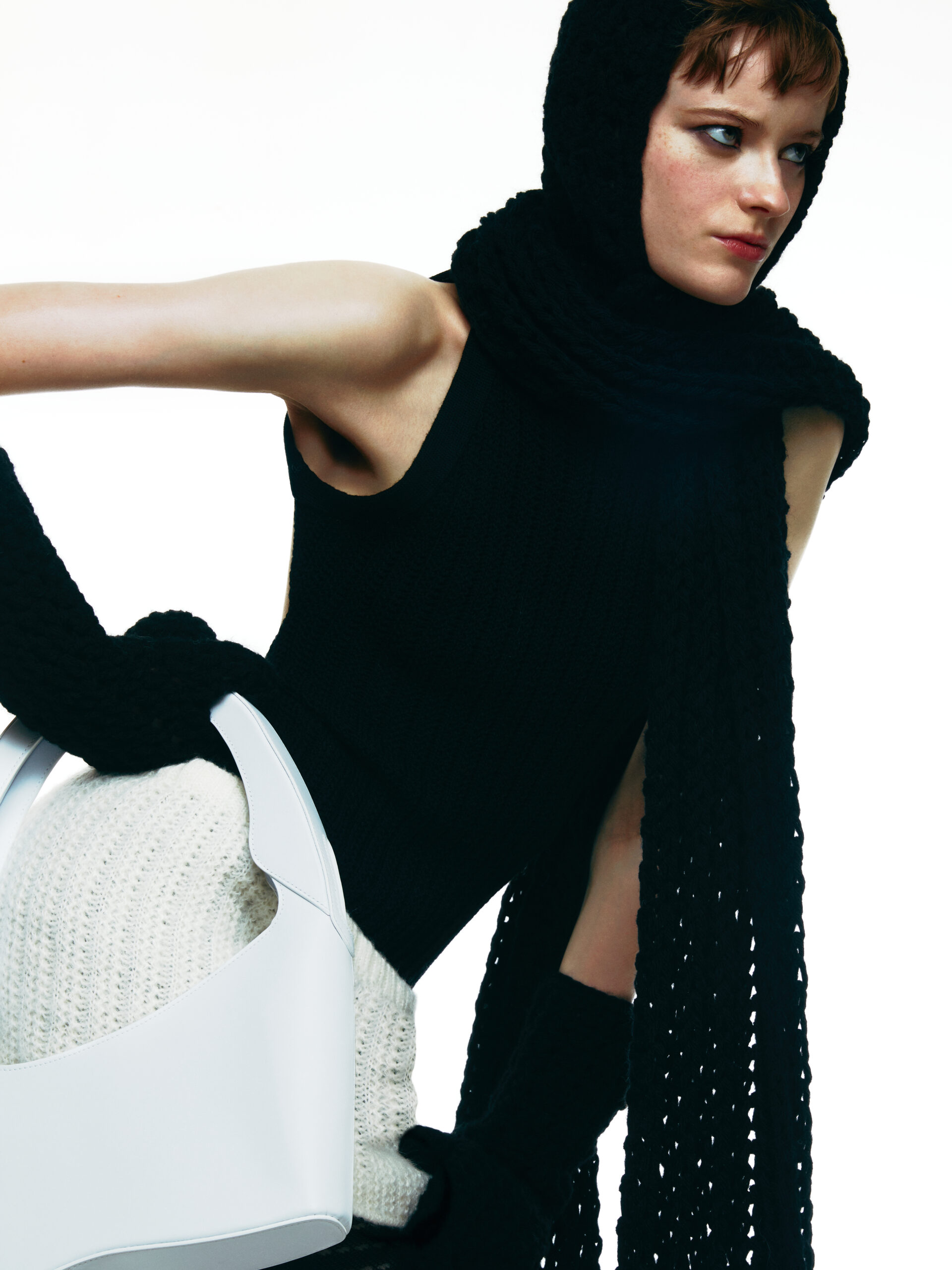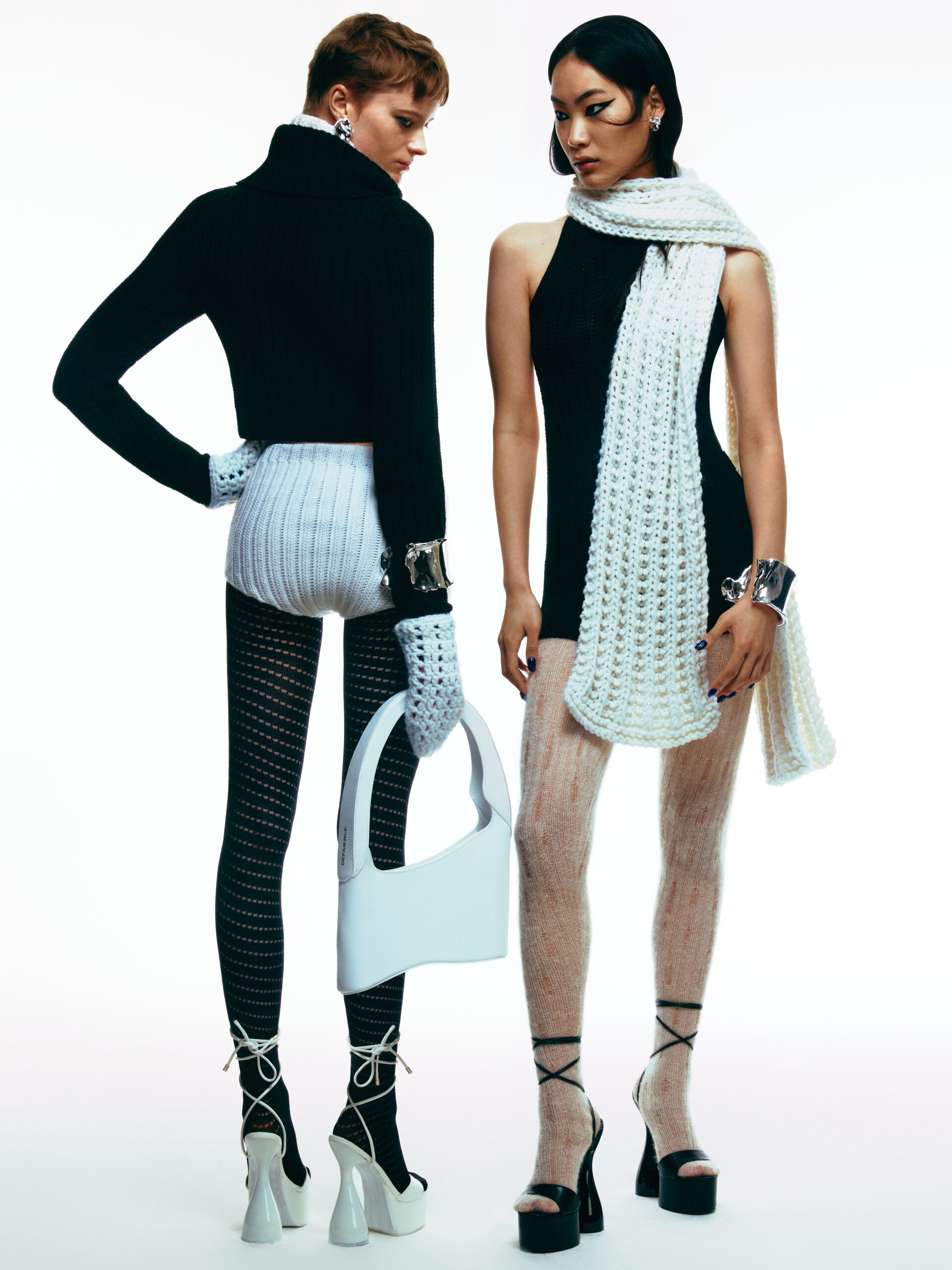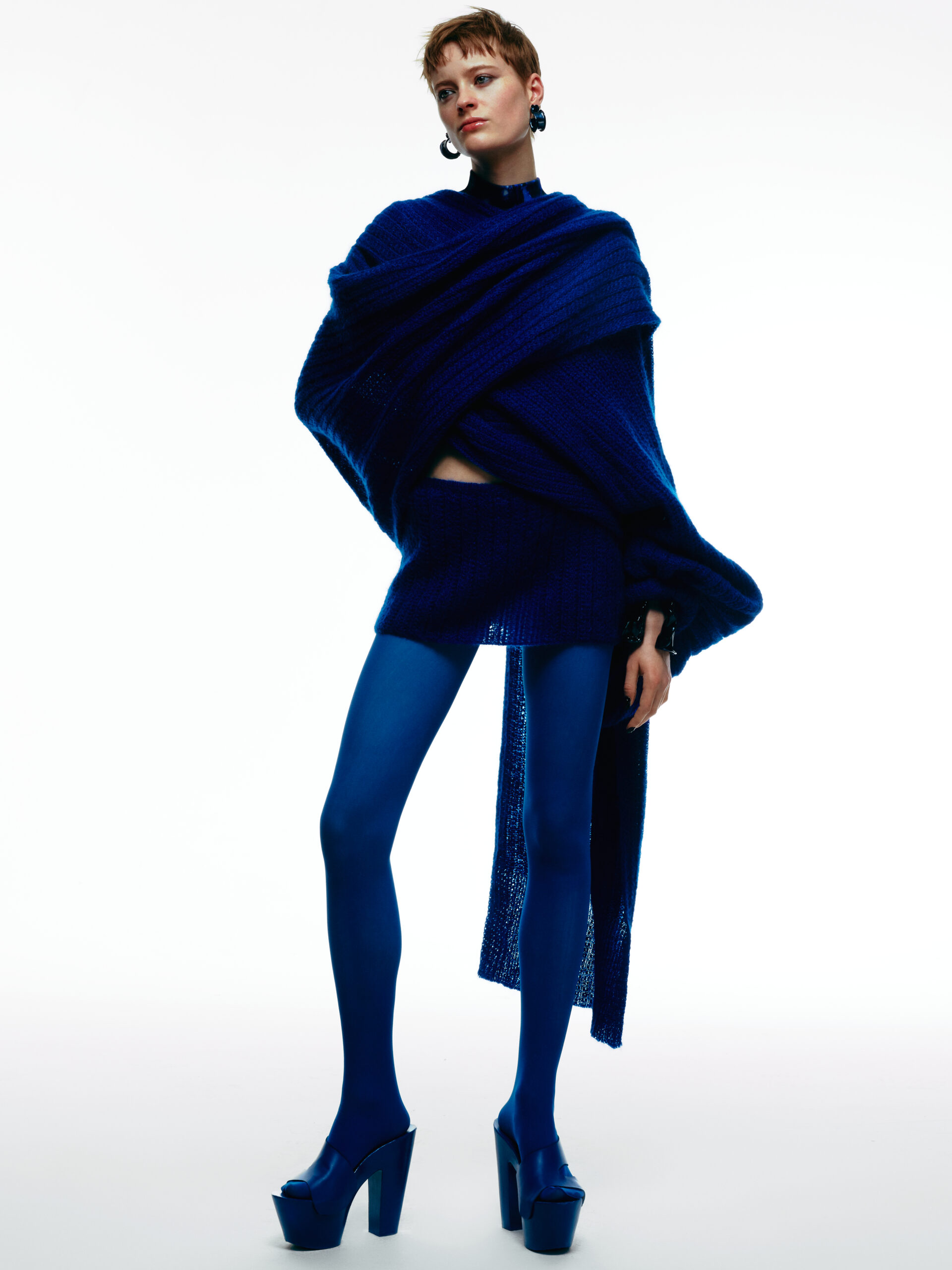 The project highlights the research work on materials, the result of innovative and sustainable choices, linked to a unique know-how that resides in the hands of the artisans in Faenza. The knitwear is made with virgin wool and mohair from Italian production. The structured garments are produced with regenerated wool yarns. The accessories – bracelets and earrings – are made with 3D printing technology that allows to transform ceramic sculptures into lightweight extruded ultra-light resin pieces.