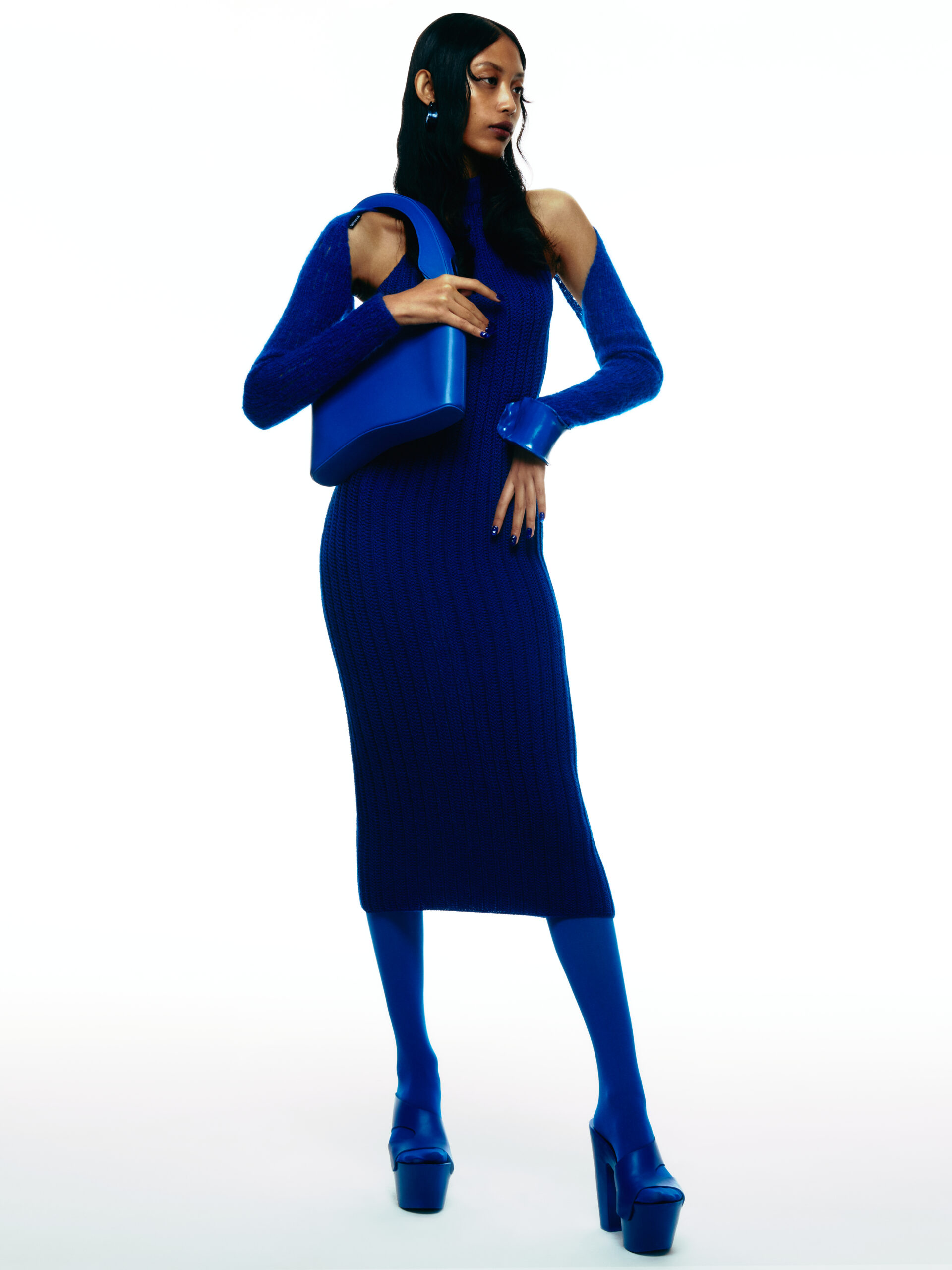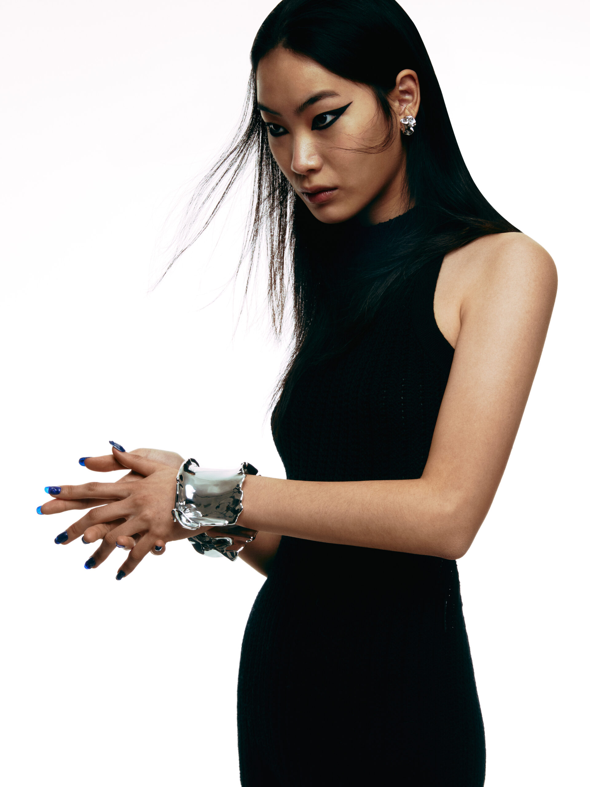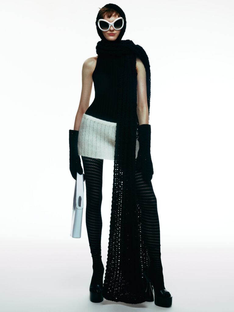 The project highlights the research work on materials, the result of innovative and sustainable choices, linked to a unique know-how that resides in the hands of the artisans in Faenza. The knitwear is made with virgin wool and mohair from Italian production. The structured garments are produced with regenerated wool yarns. The accessories – bracelets and earrings – are made with 3D printing technology that allows to transform ceramic sculptures into lightweight extruded ultra-light resin pieces.