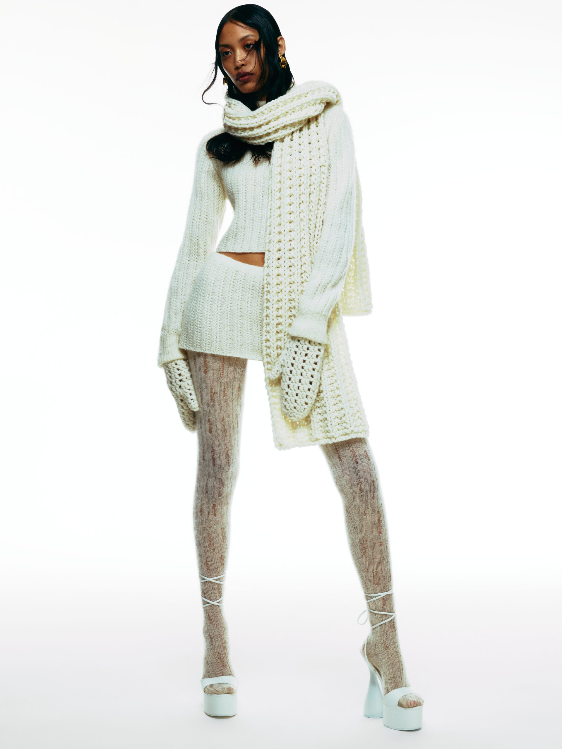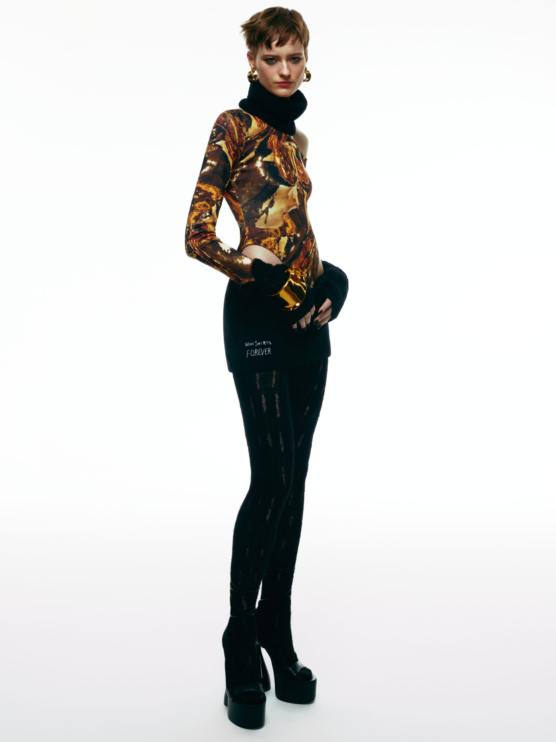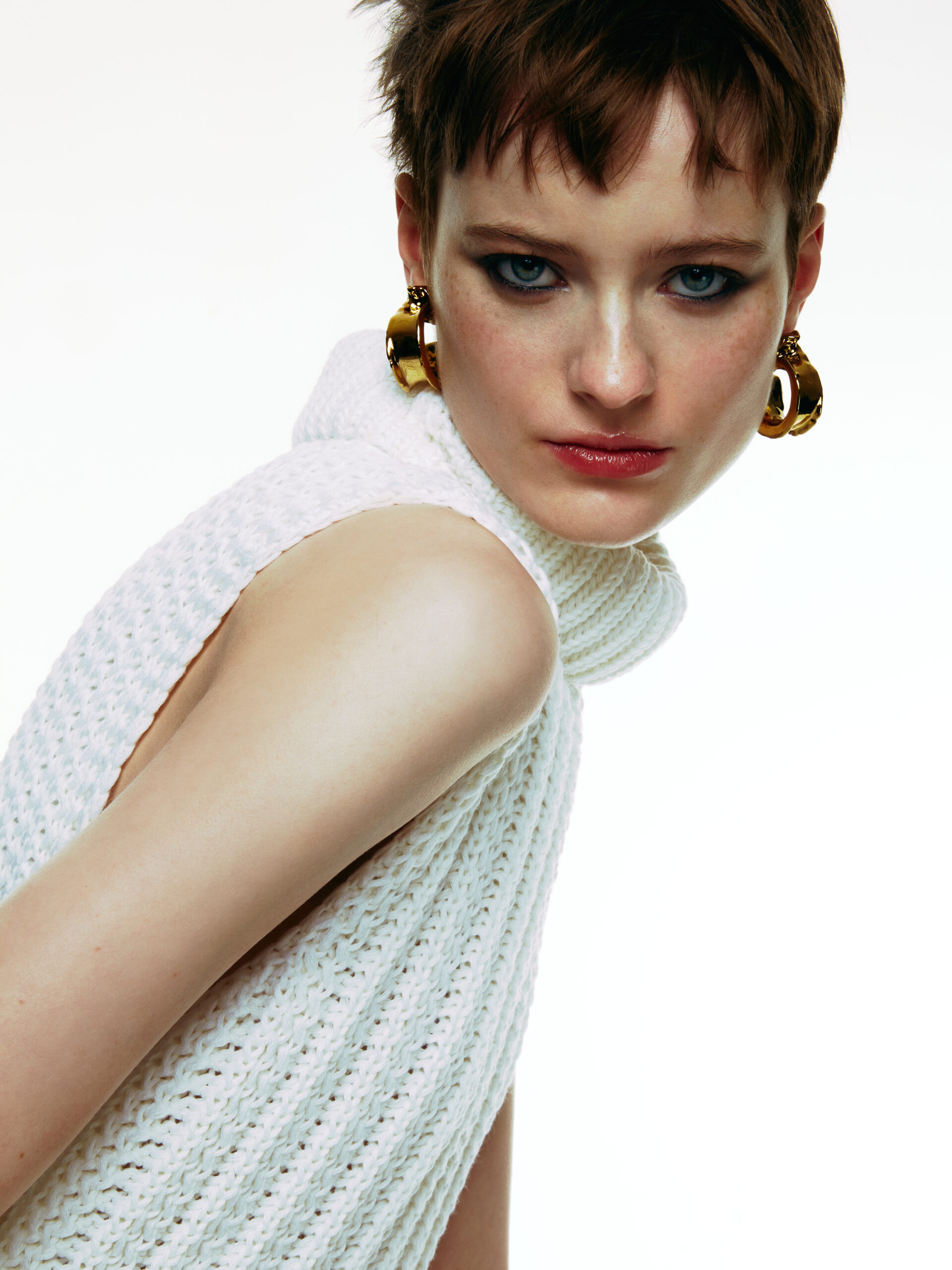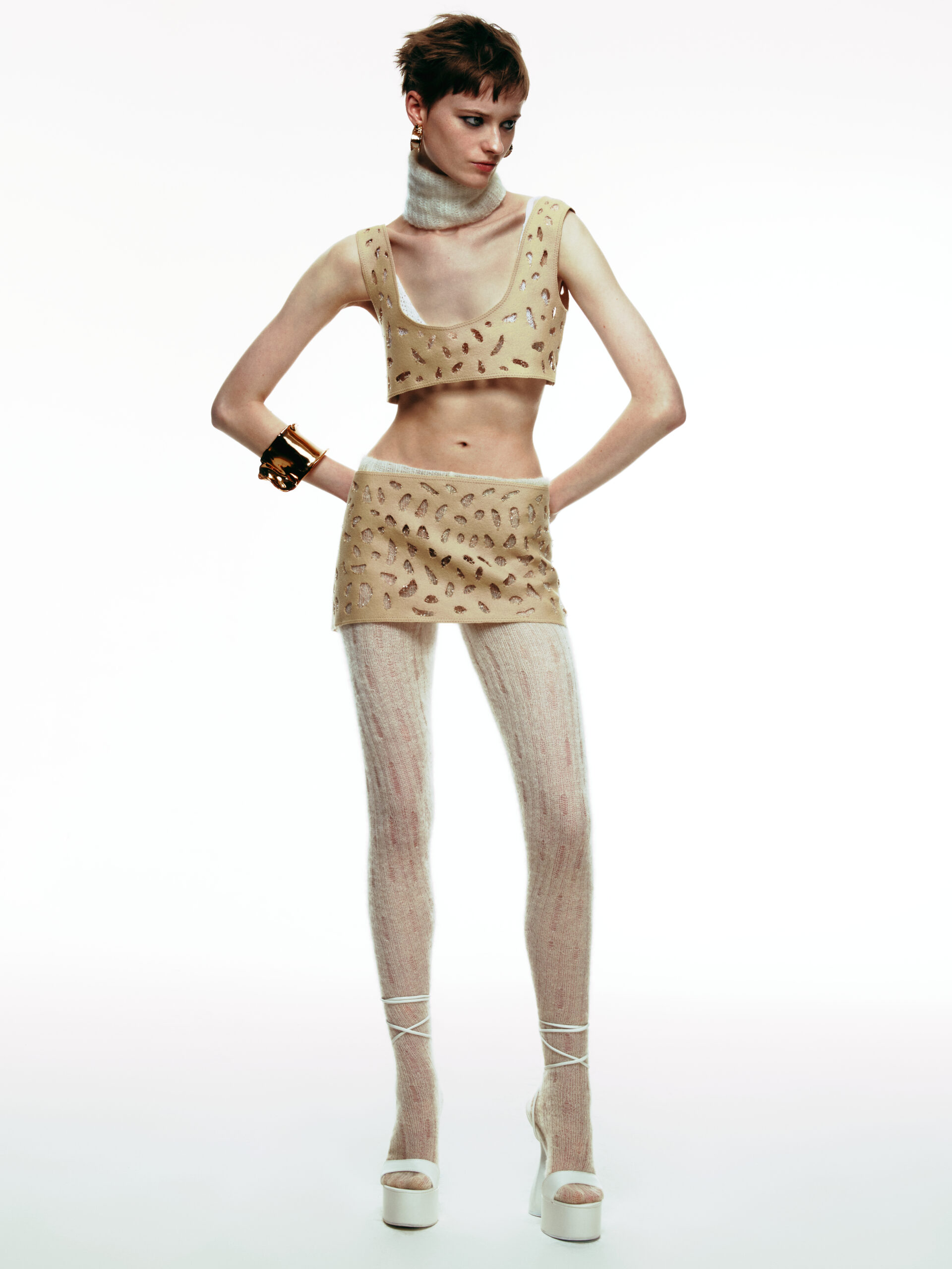 The project highlights the research work on materials, the result of innovative and sustainable choices, linked to a unique know-how that resides in the hands of the artisans in Faenza. The knitwear is made with virgin wool and mohair from Italian production. The structured garments are produced with regenerated wool yarns. The accessories – bracelets and earrings – are made with 3D printing technology that allows to transform ceramic sculptures into lightweight extruded ultra-light resin pieces.