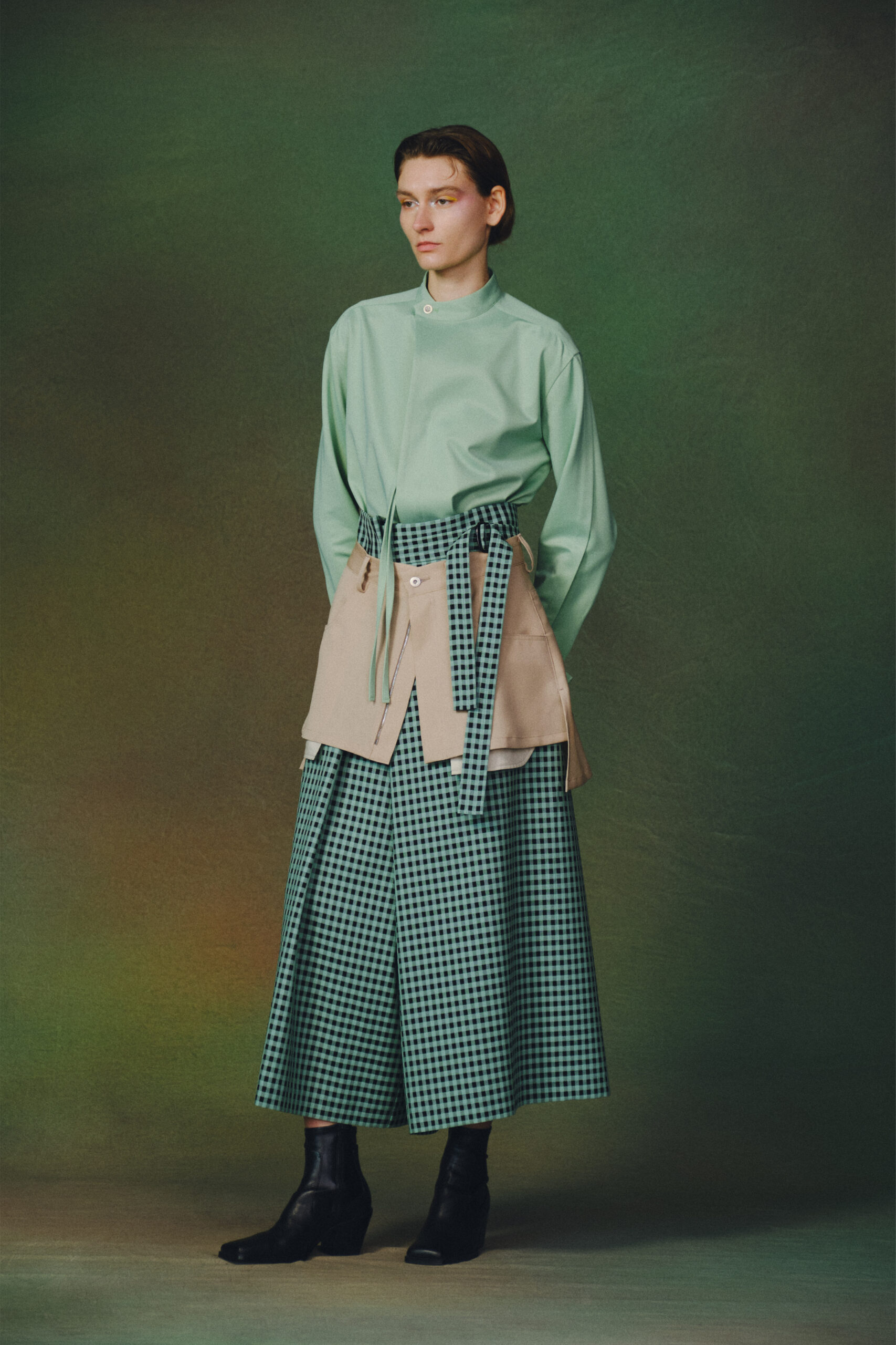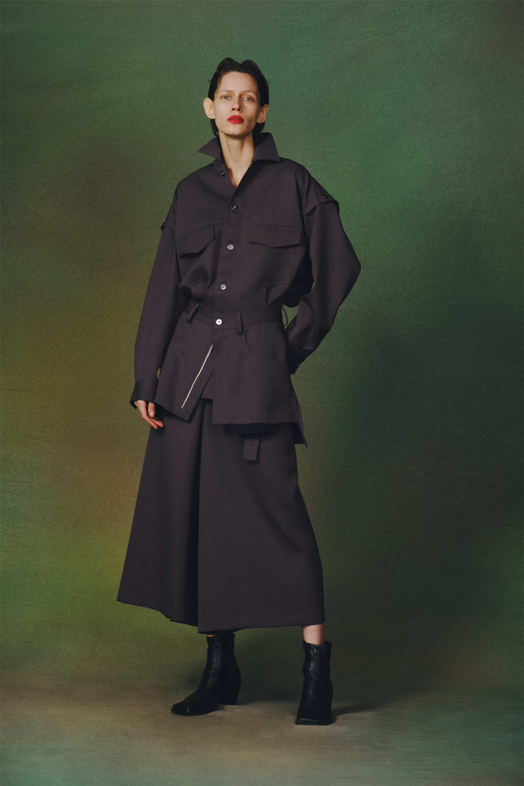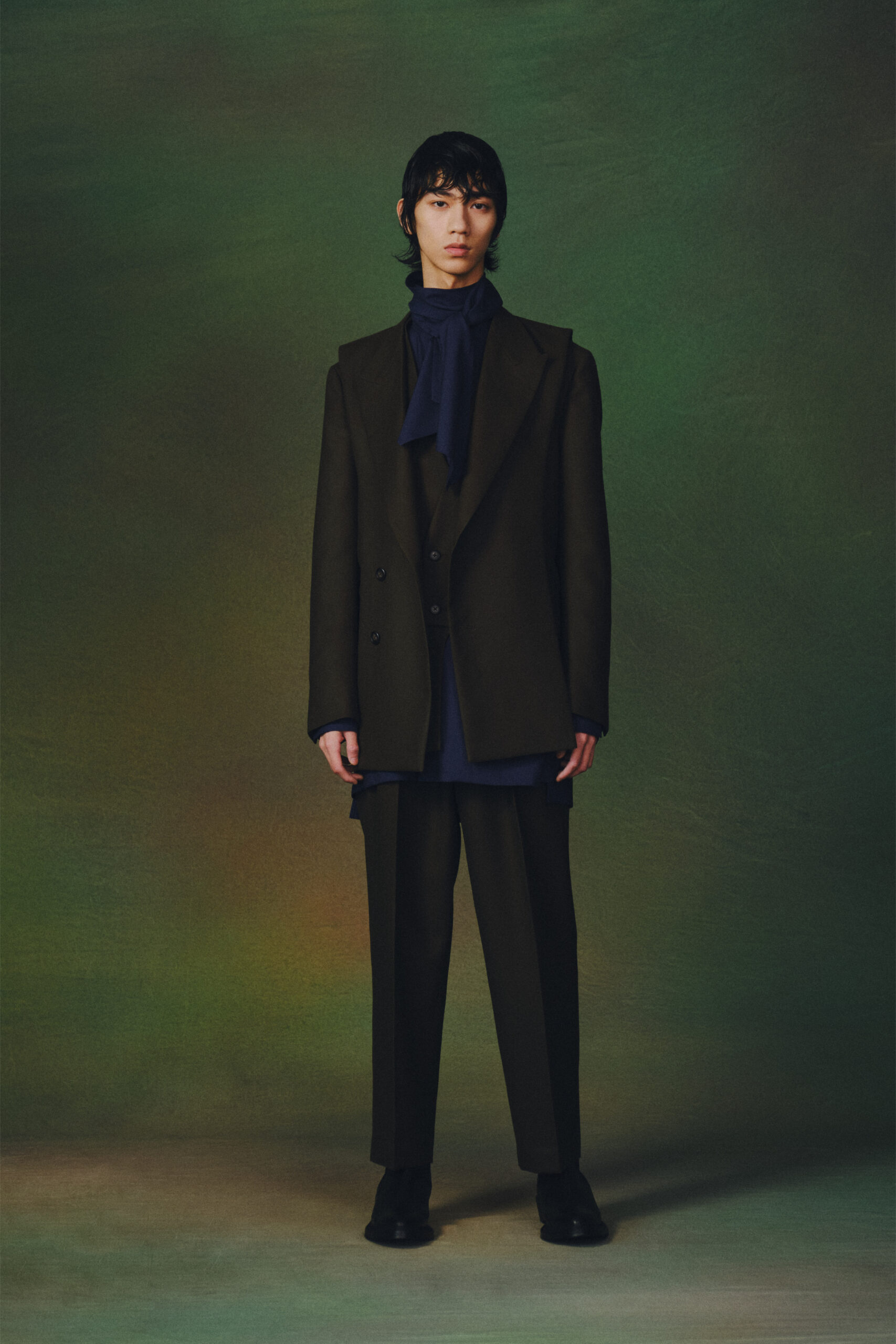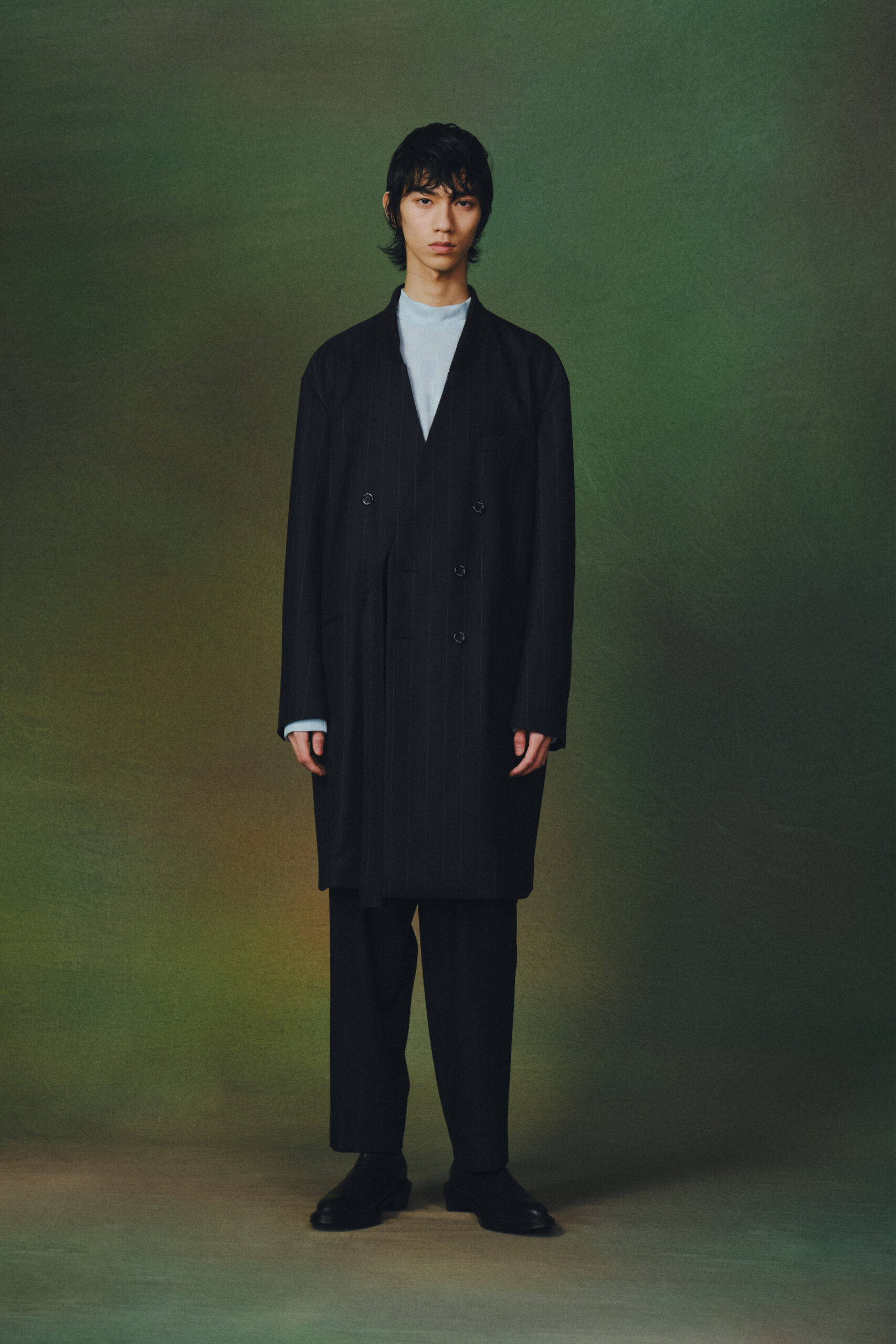 In the women’s collection, the addition of a sailor collar to a collarless jacket introduces a new approach to tailoring, while maintaining the jacket’s original function. A minimalist tie is added to the space created by cutting down on the design, which is the key for this season. Along with random skirts that look like miniskirts or long skirts, and denim-like wool nylon skirts, the collection brings out new styling and expands the possibilities of layering.
