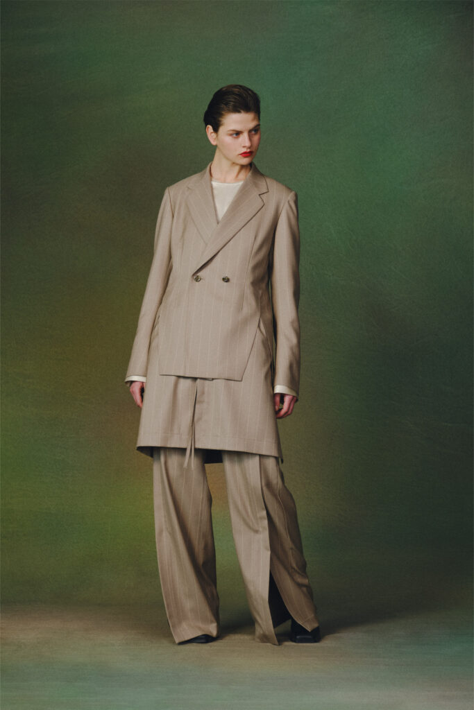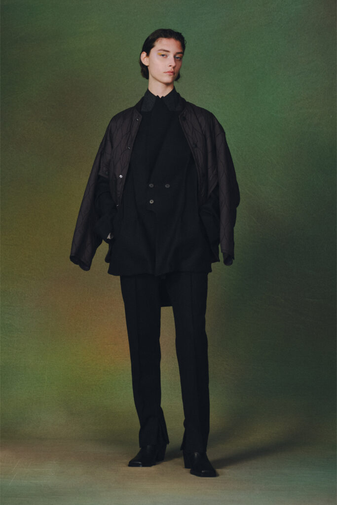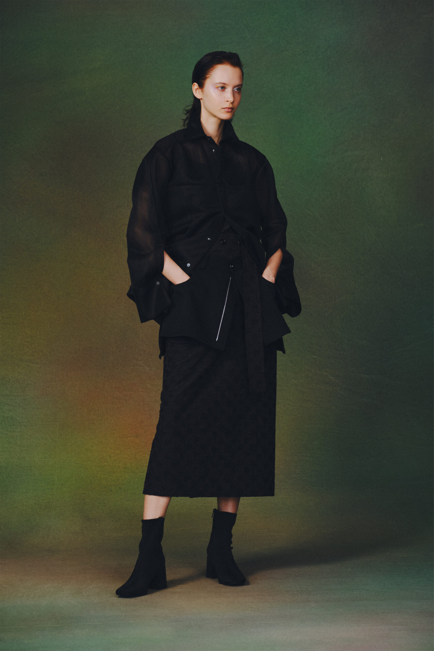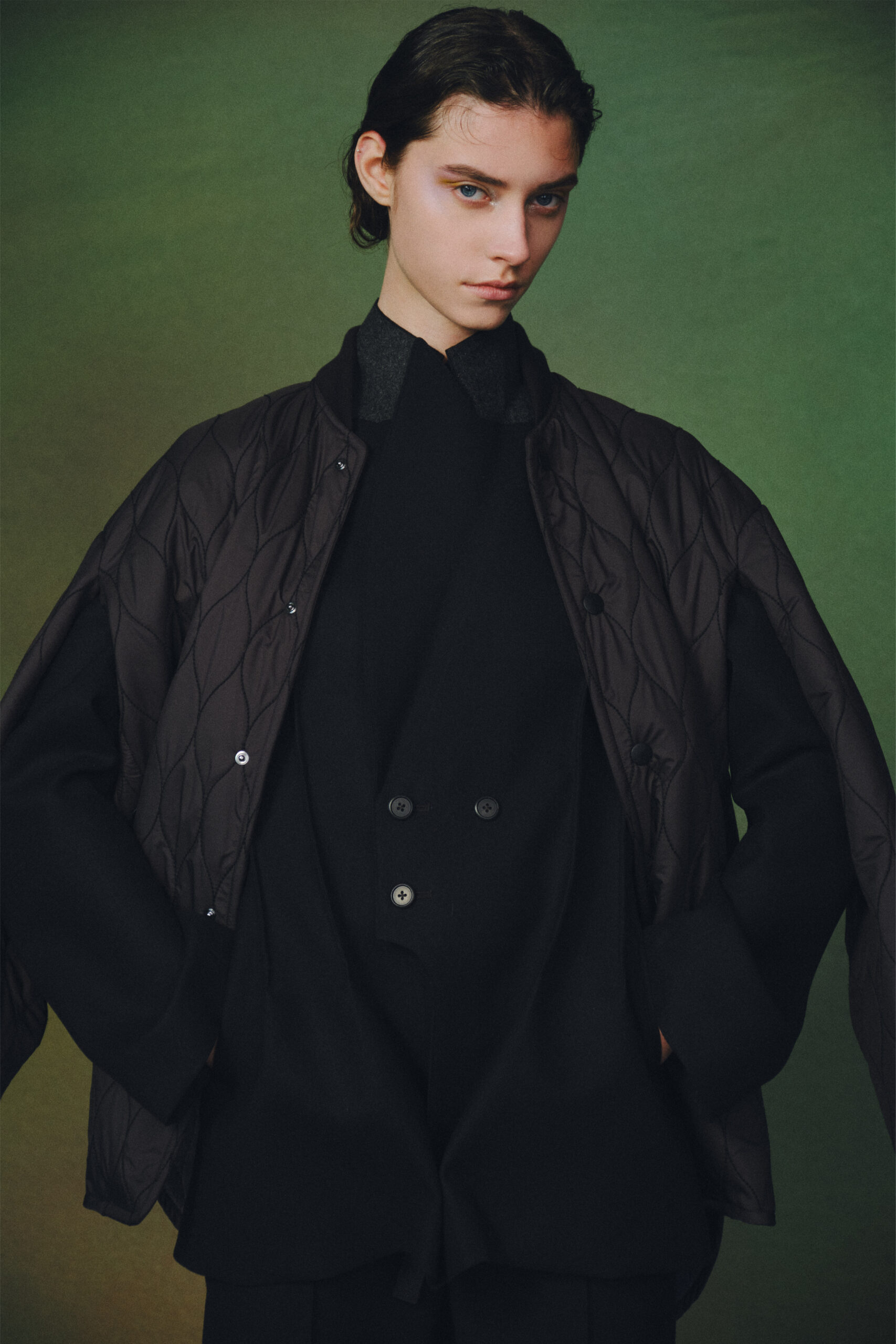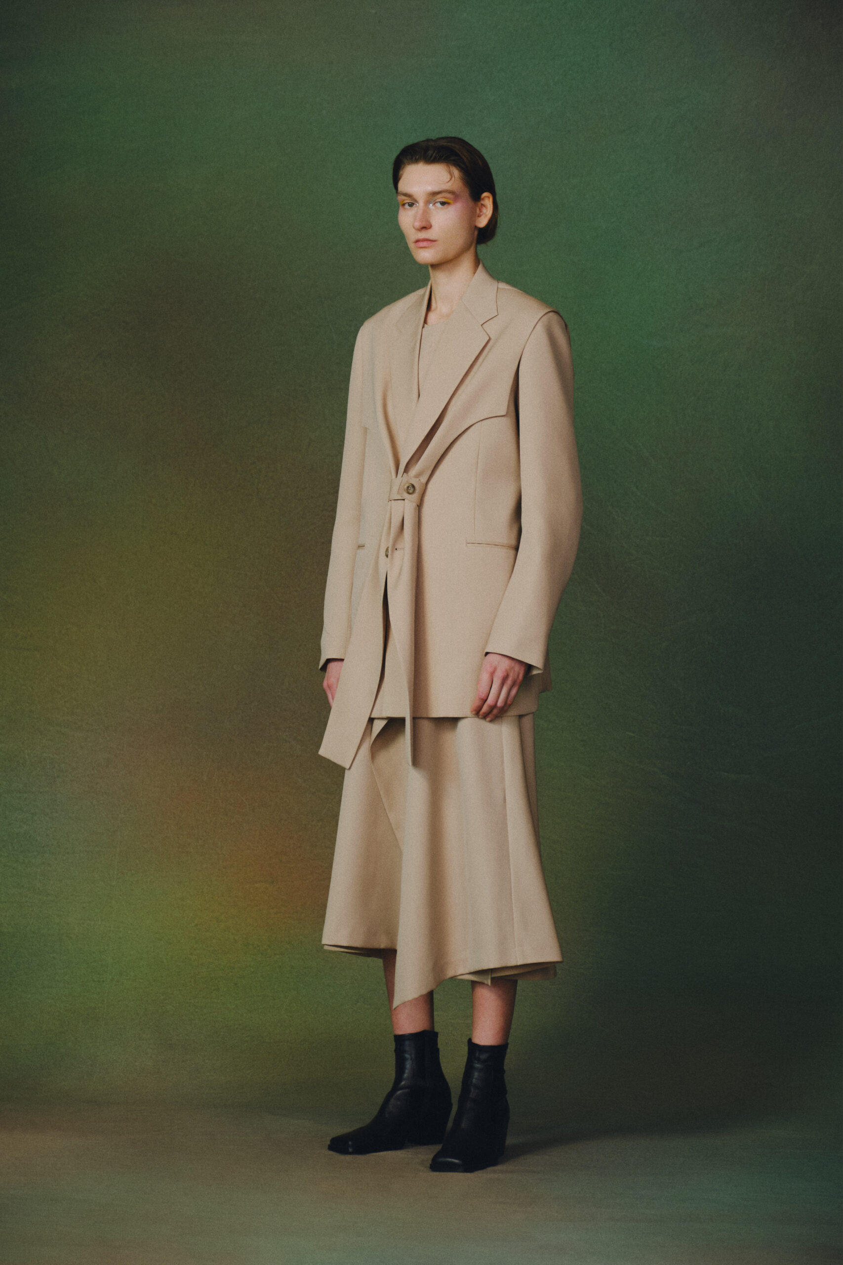 In the women’s collection, the addition of a sailor collar to a collarless jacket introduces a new approach to tailoring, while maintaining the jacket’s original function. A minimalist tie is added to the space created by cutting down on the design, which is the key for this season. Along with random skirts that look like miniskirts or long skirts, and denim-like wool nylon skirts, the collection brings out new styling and expands the possibilities of layering.