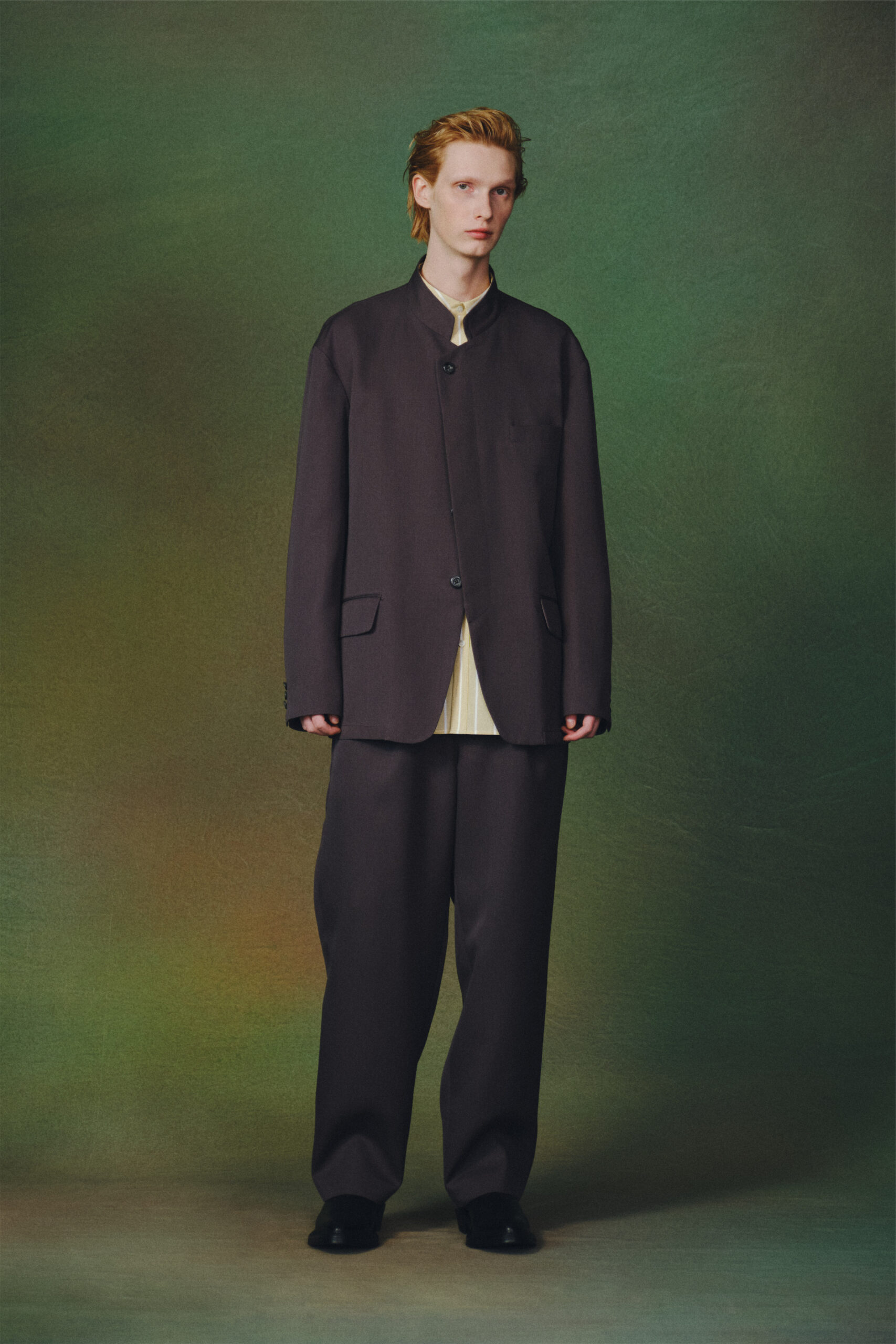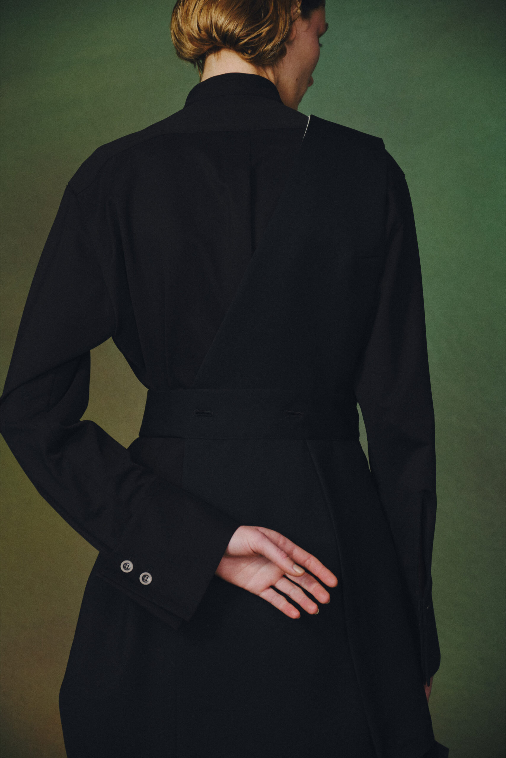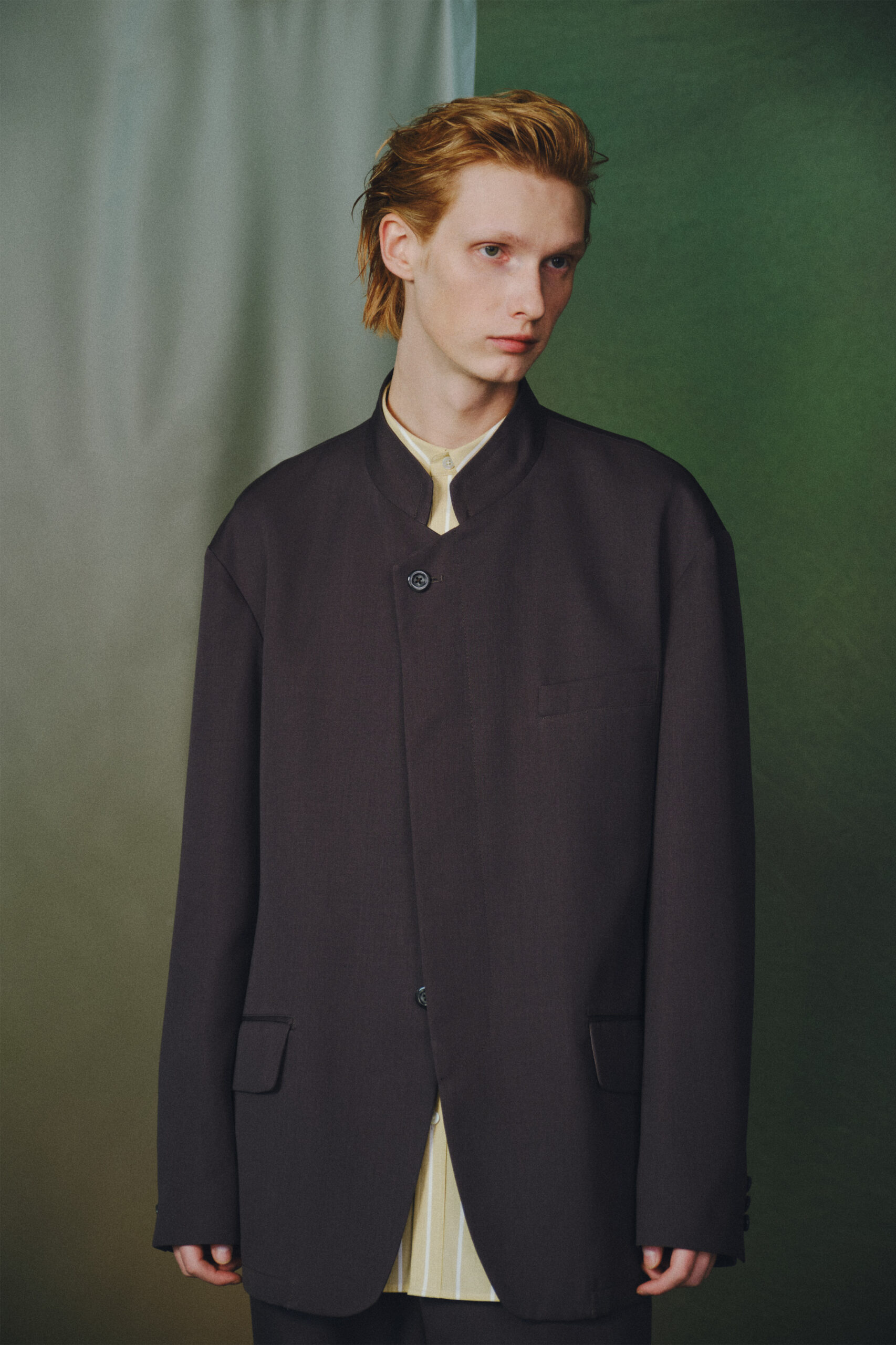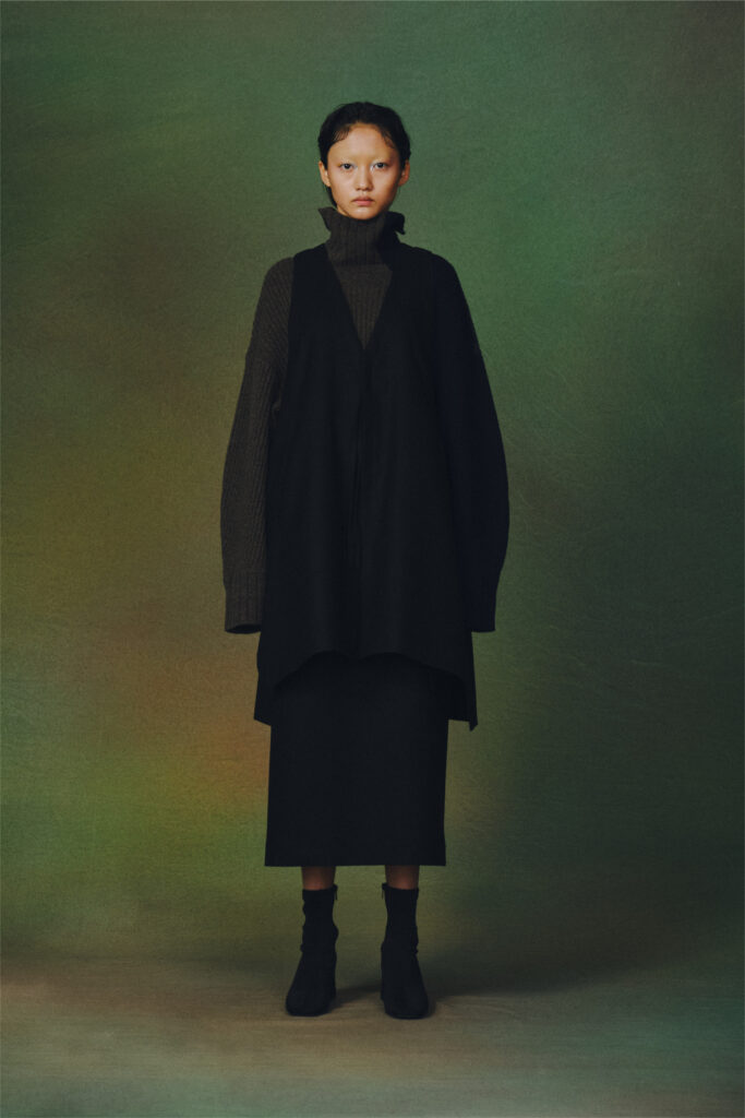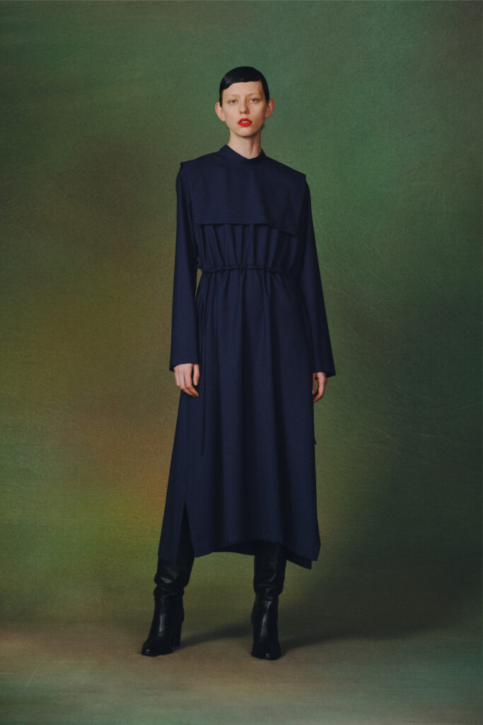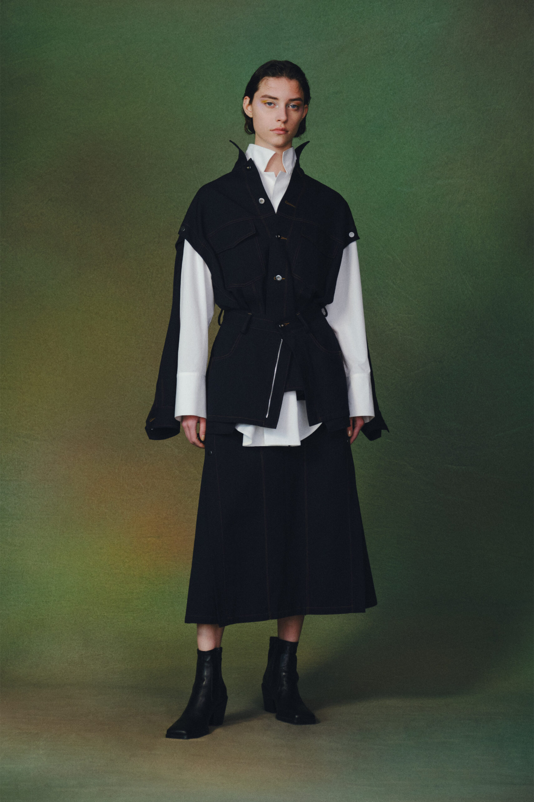 In the women’s collection, the addition of a sailor collar to a collarless jacket introduces a new approach to tailoring, while maintaining the jacket’s original function. A minimalist tie is added to the space created by cutting down on the design, which is the key for this season. Along with random skirts that look like miniskirts or long skirts, and denim-like wool nylon skirts, the collection brings out new styling and expands the possibilities of layering.