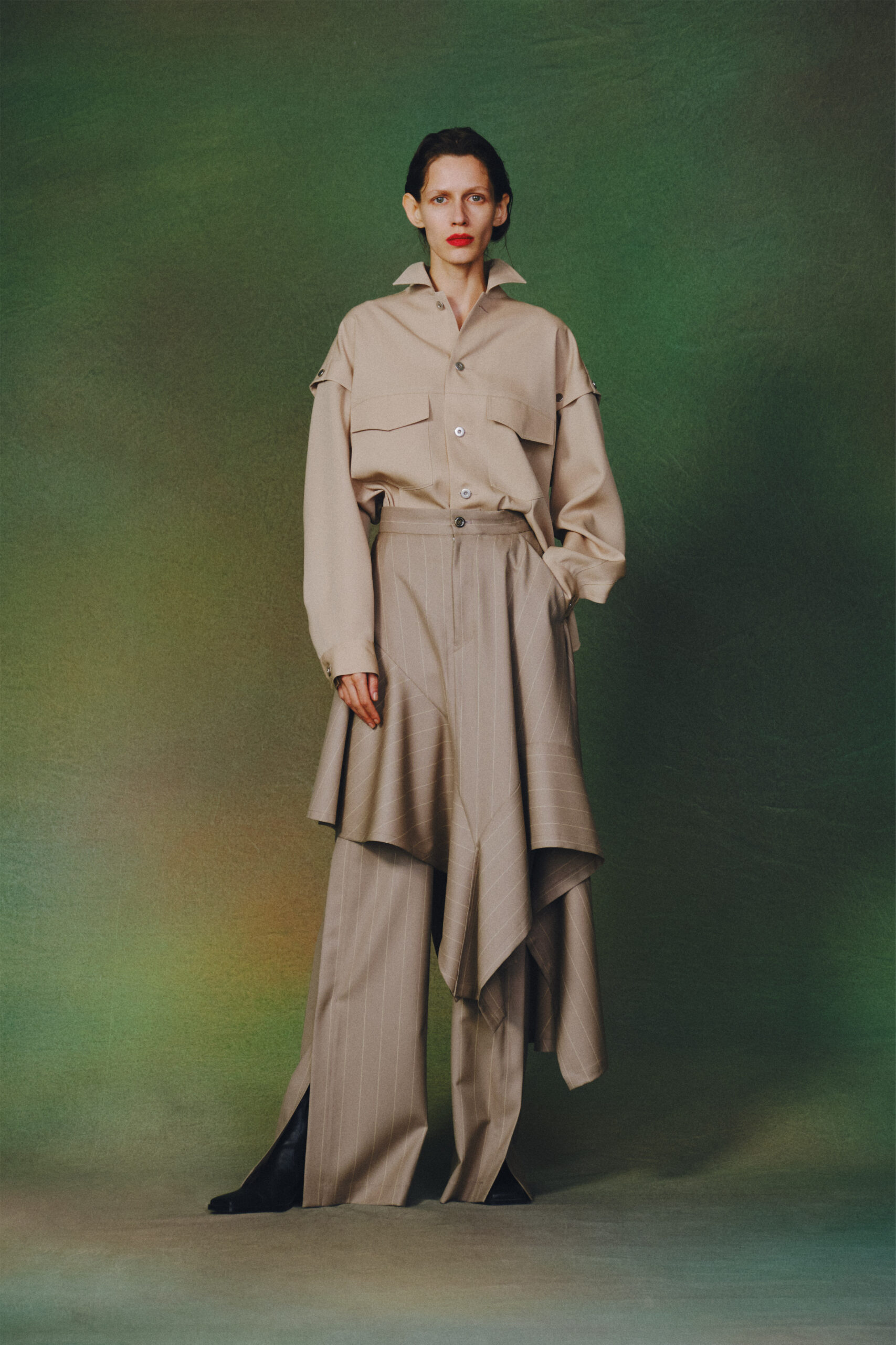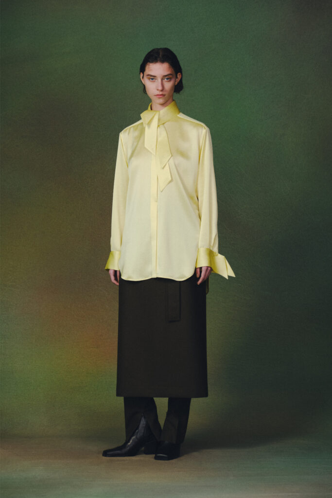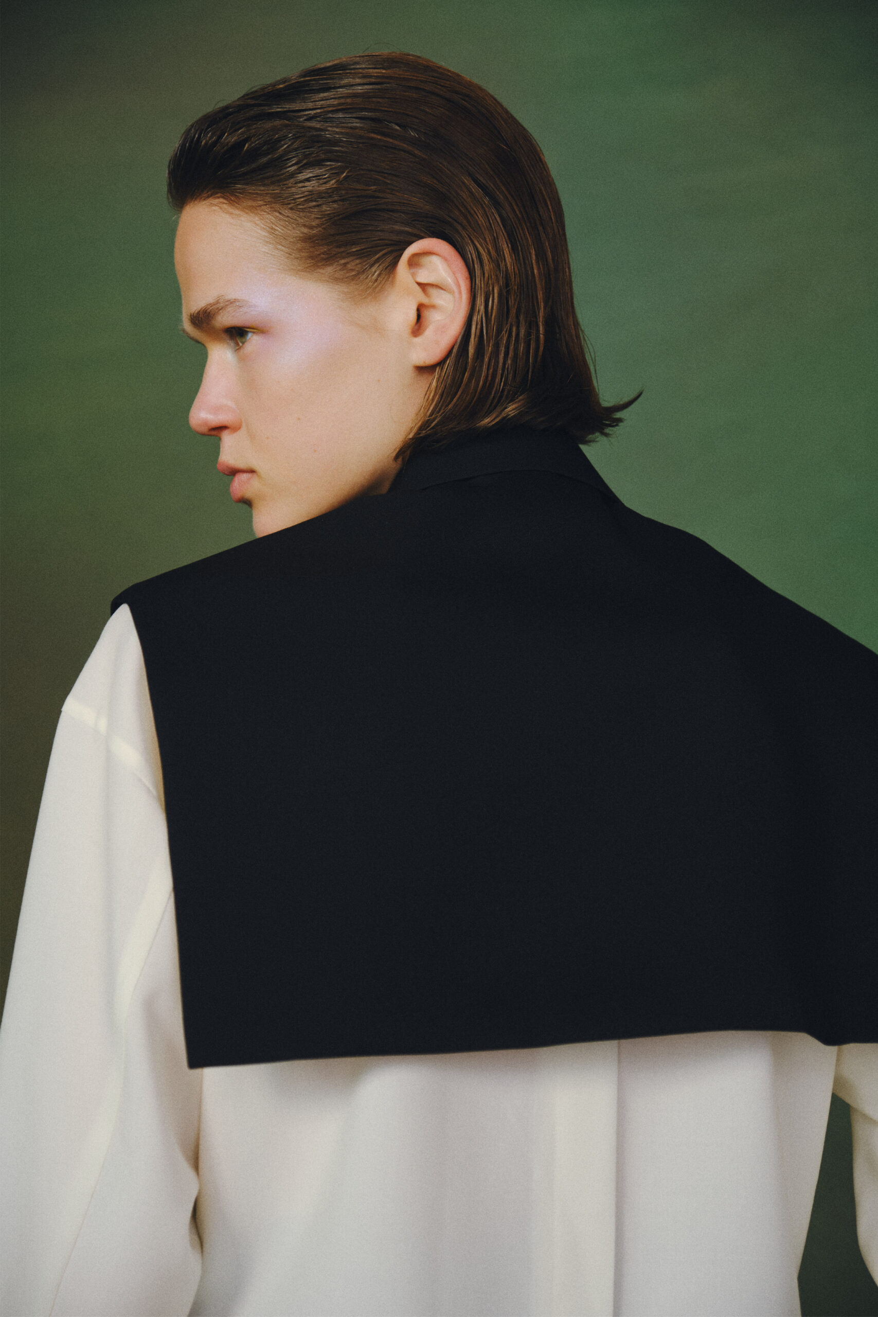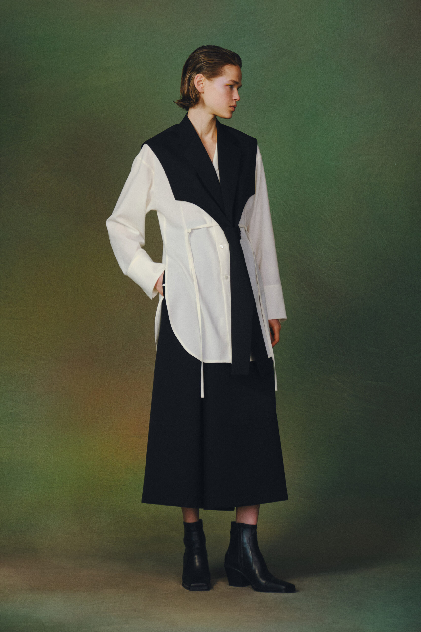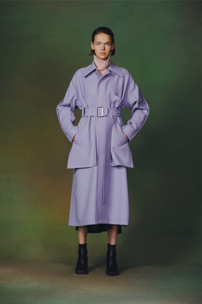 In the women’s collection, the addition of a sailor collar to a collarless jacket introduces a new approach to tailoring, while maintaining the jacket’s original function. A minimalist tie is added to the space created by cutting down on the design, which is the key for this season. Along with random skirts that look like miniskirts or long skirts, and denim-like wool nylon skirts, the collection brings out new styling and expands the possibilities of layering.