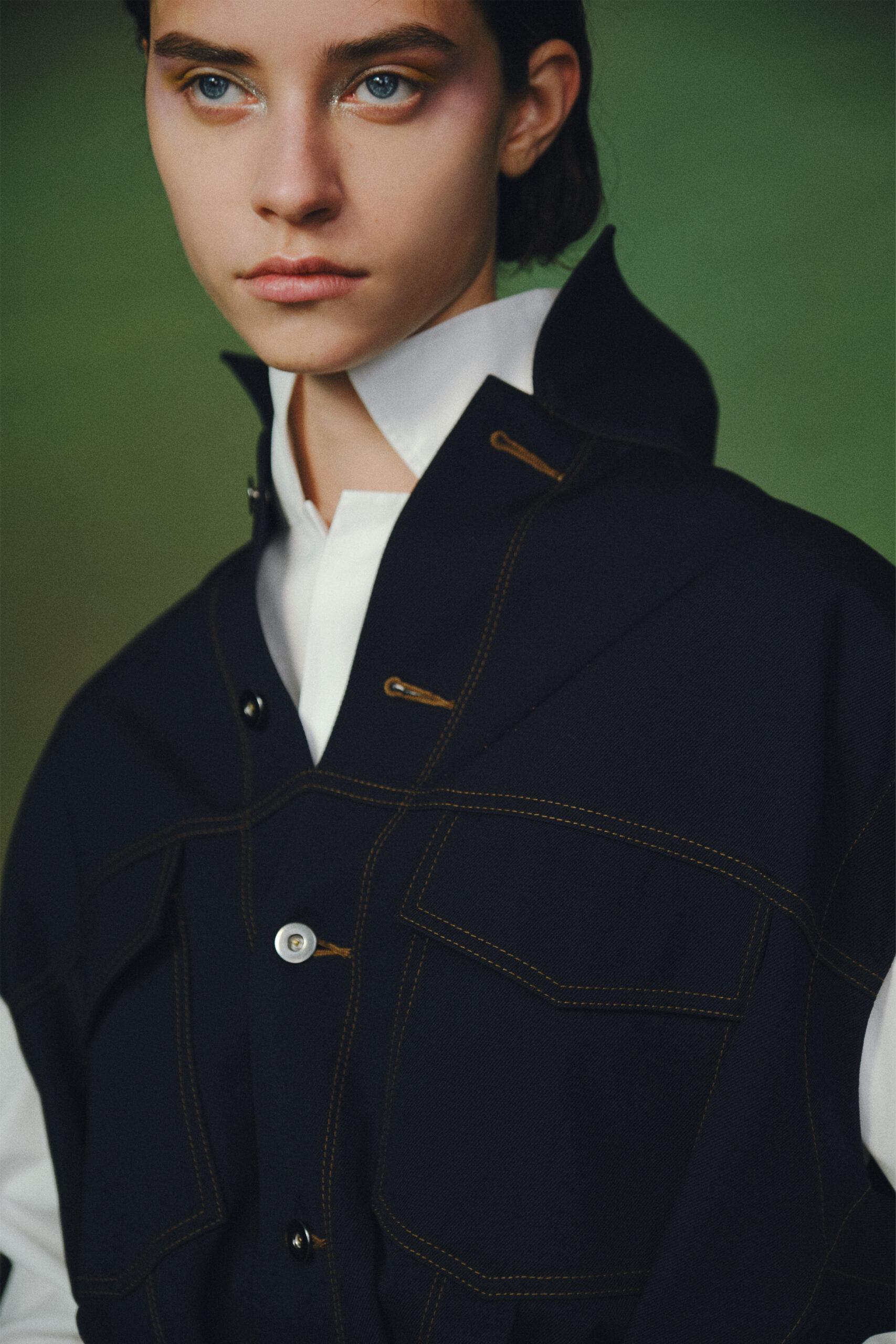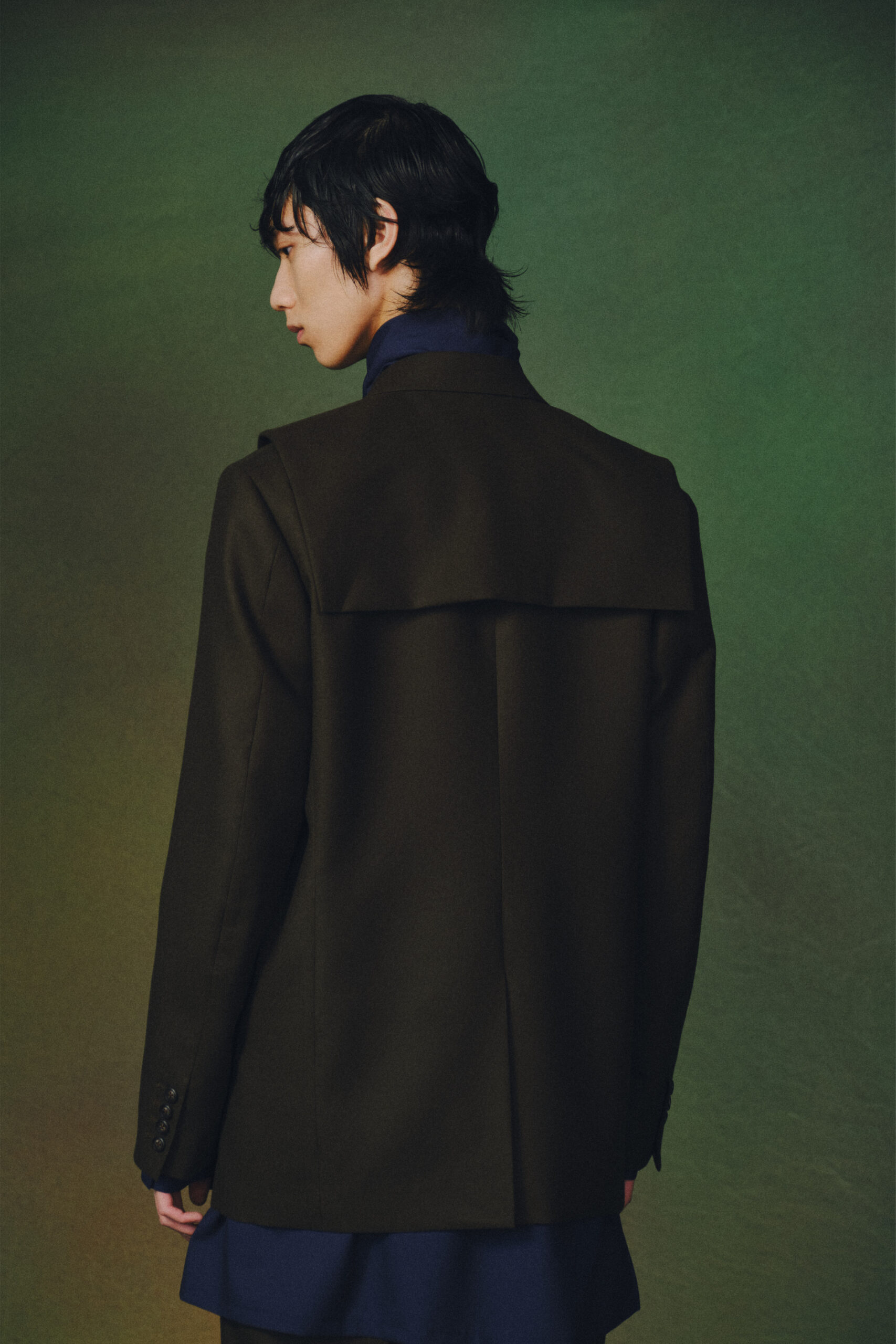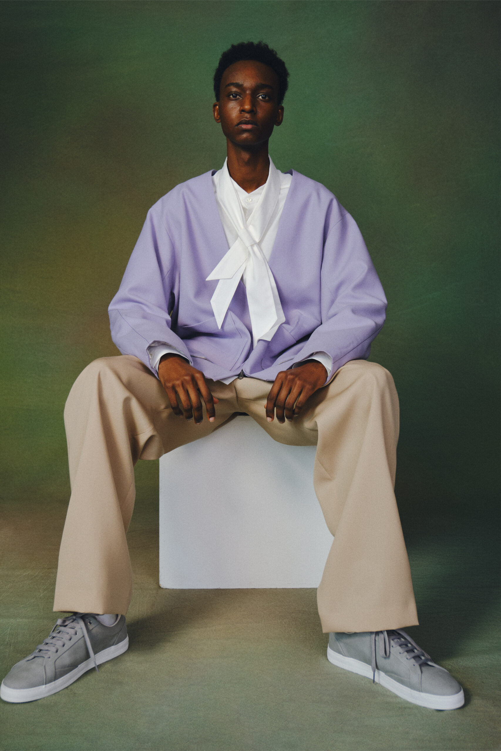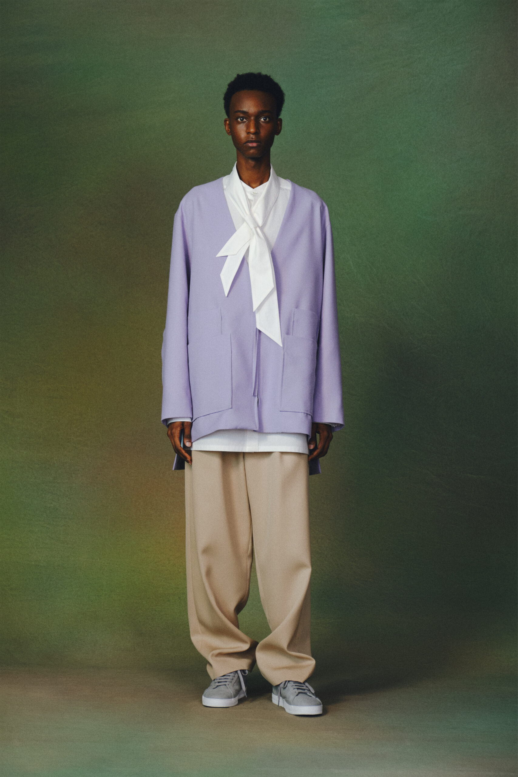 A playful touch of flexibility is also added to the men’s look. Sporty design elements and functionality are added, such as a jacket with a collar replaced by ribbed material. The sailor collar, also seen in the men’s look, is layered on the double-breasted jacket and shows various expressions depending on where the buttons are fastened.